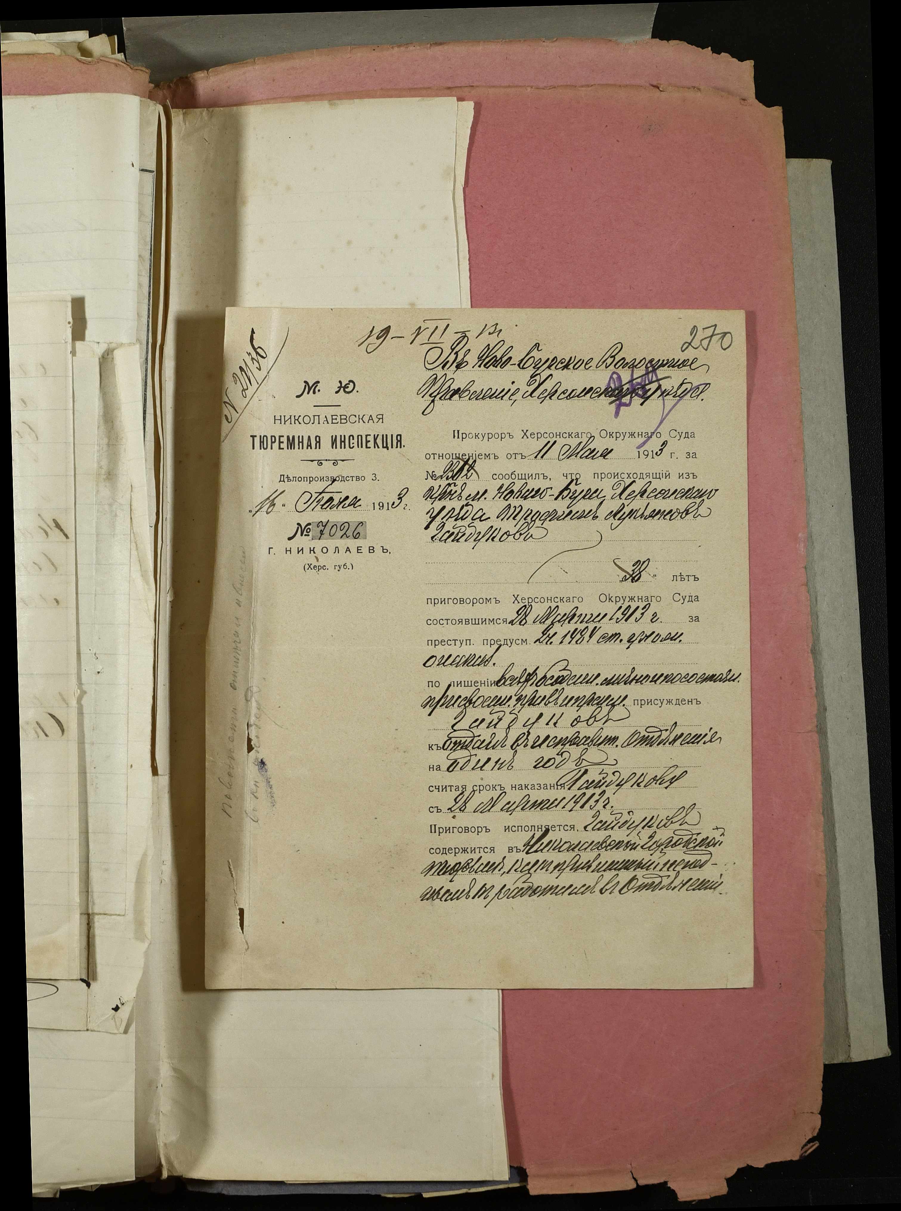 • • • • Справа № 139 “Припис Херсонського окружного суду та виконавчі листи, видані для виконання вироків, що набрали законної сили, посвідчення особи на засуджених селян, постанови станового пристава про арешти засуджених, статистичні відомості волосних судів про невиконані судові рішення та вироки”