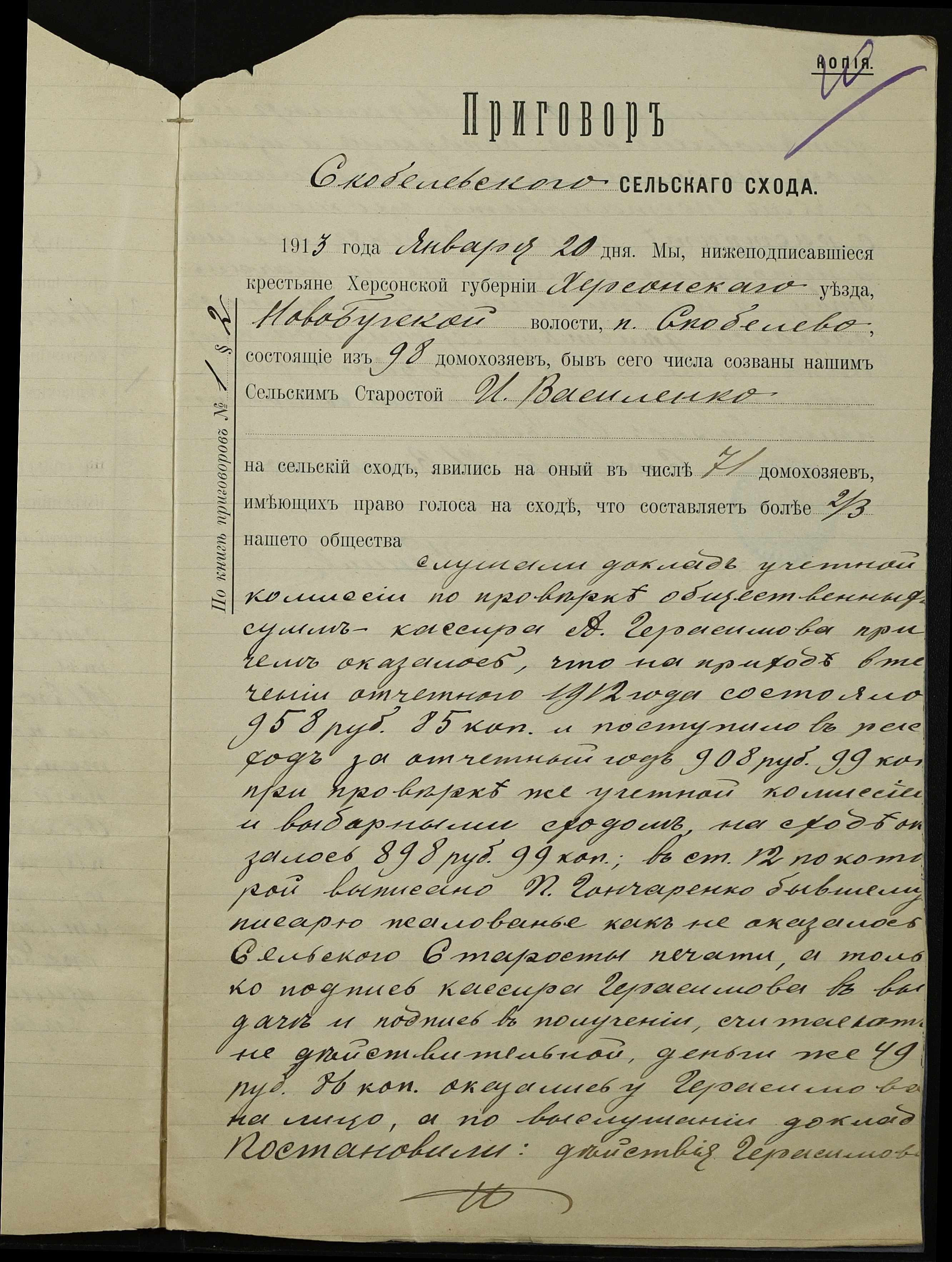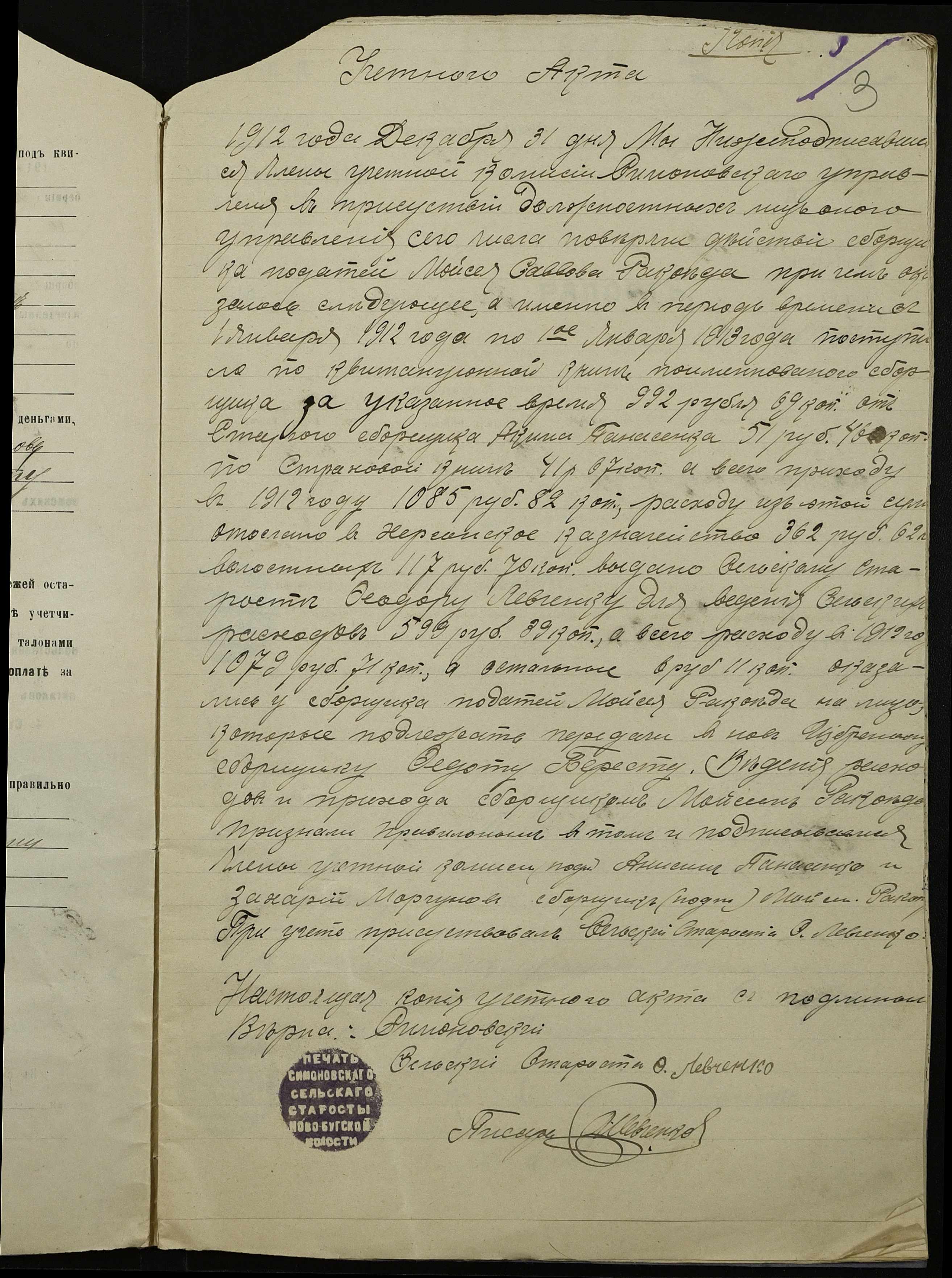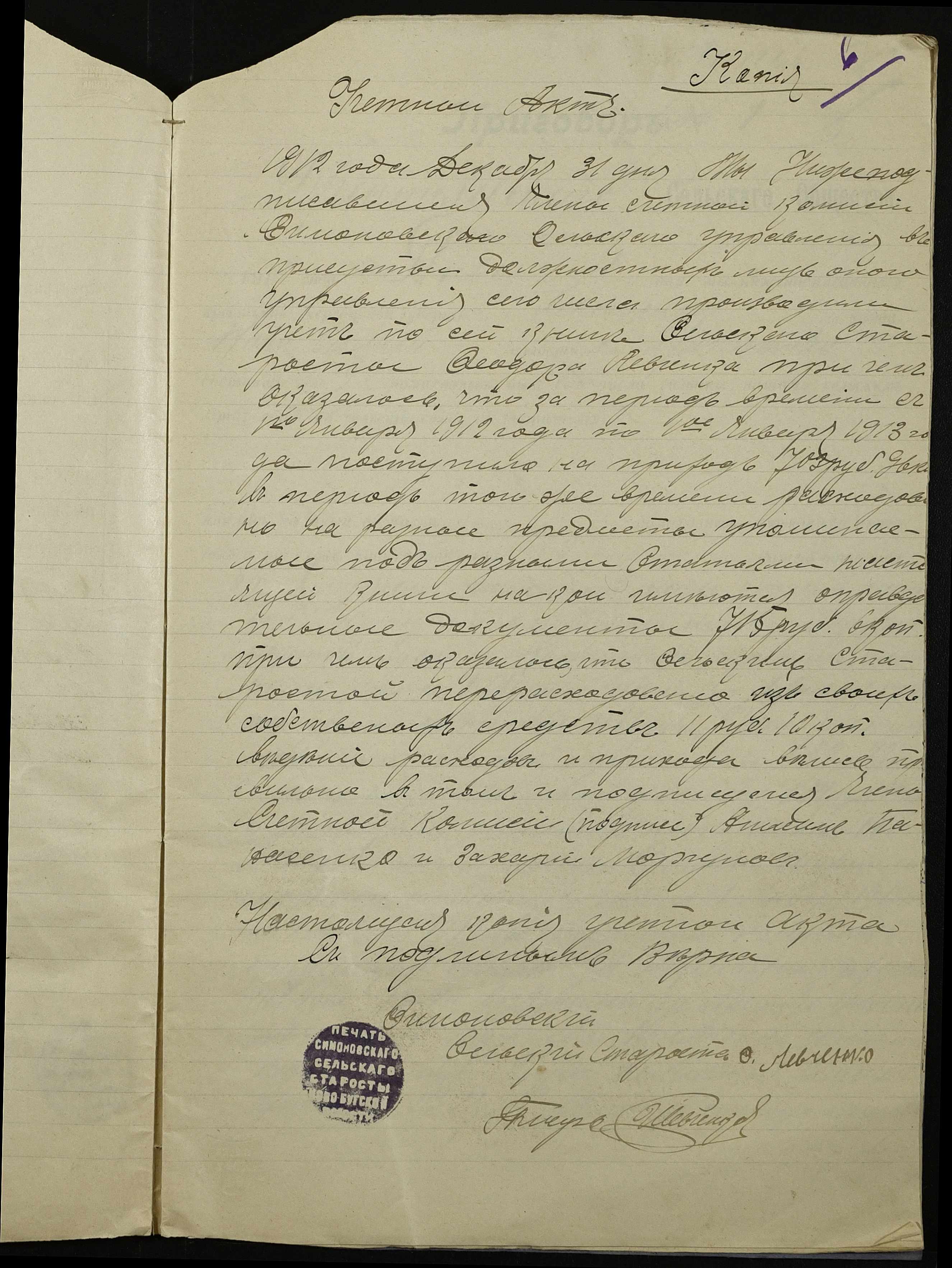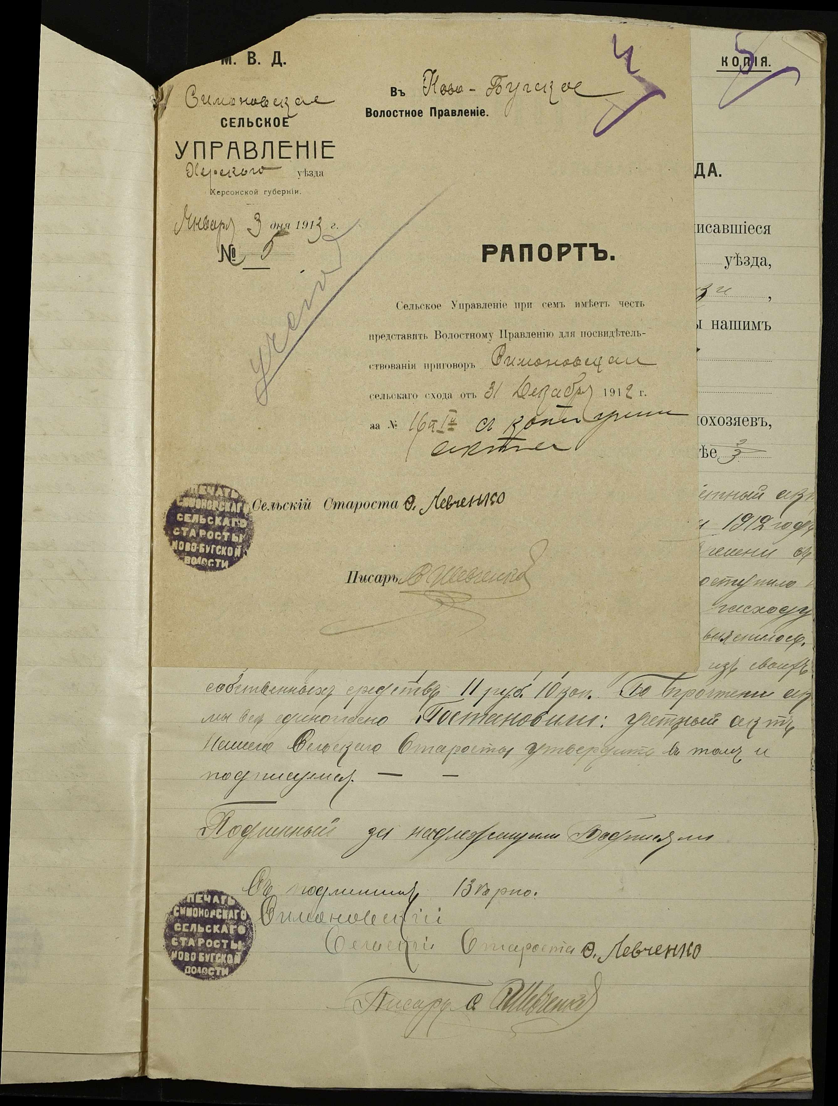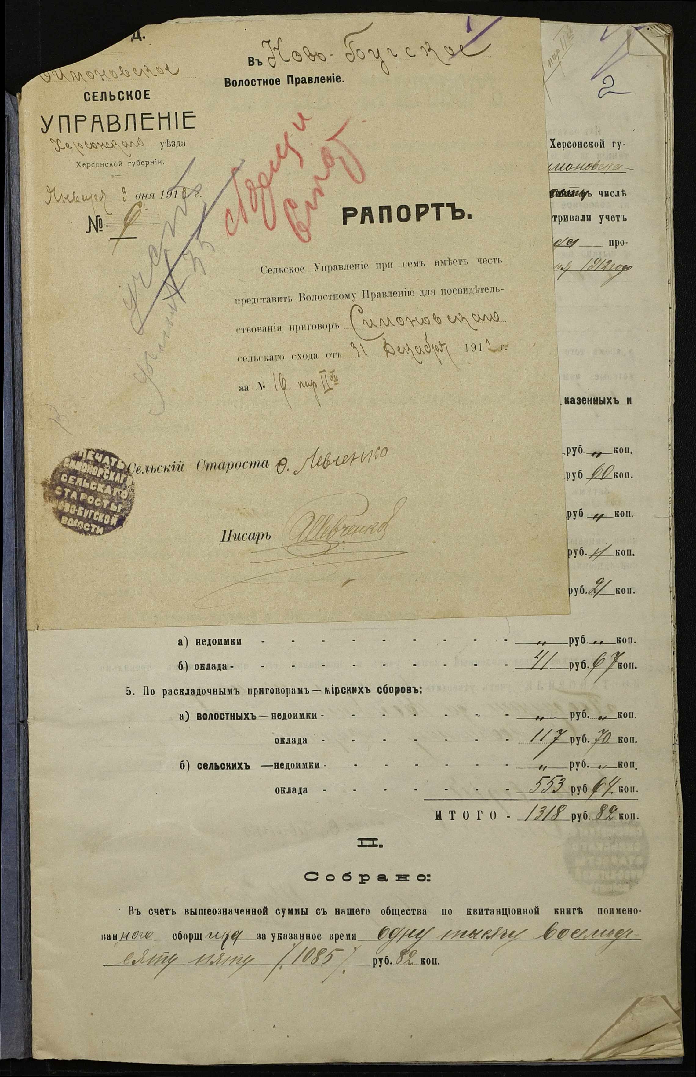 • • • • Справа № 147 “Облікові присуди сільських сходів та рапорти сільського старости про хід збору з селян сел. Симонівки податей та платежів за період з 01 січня 1912 року по 01 січня 1913 року”