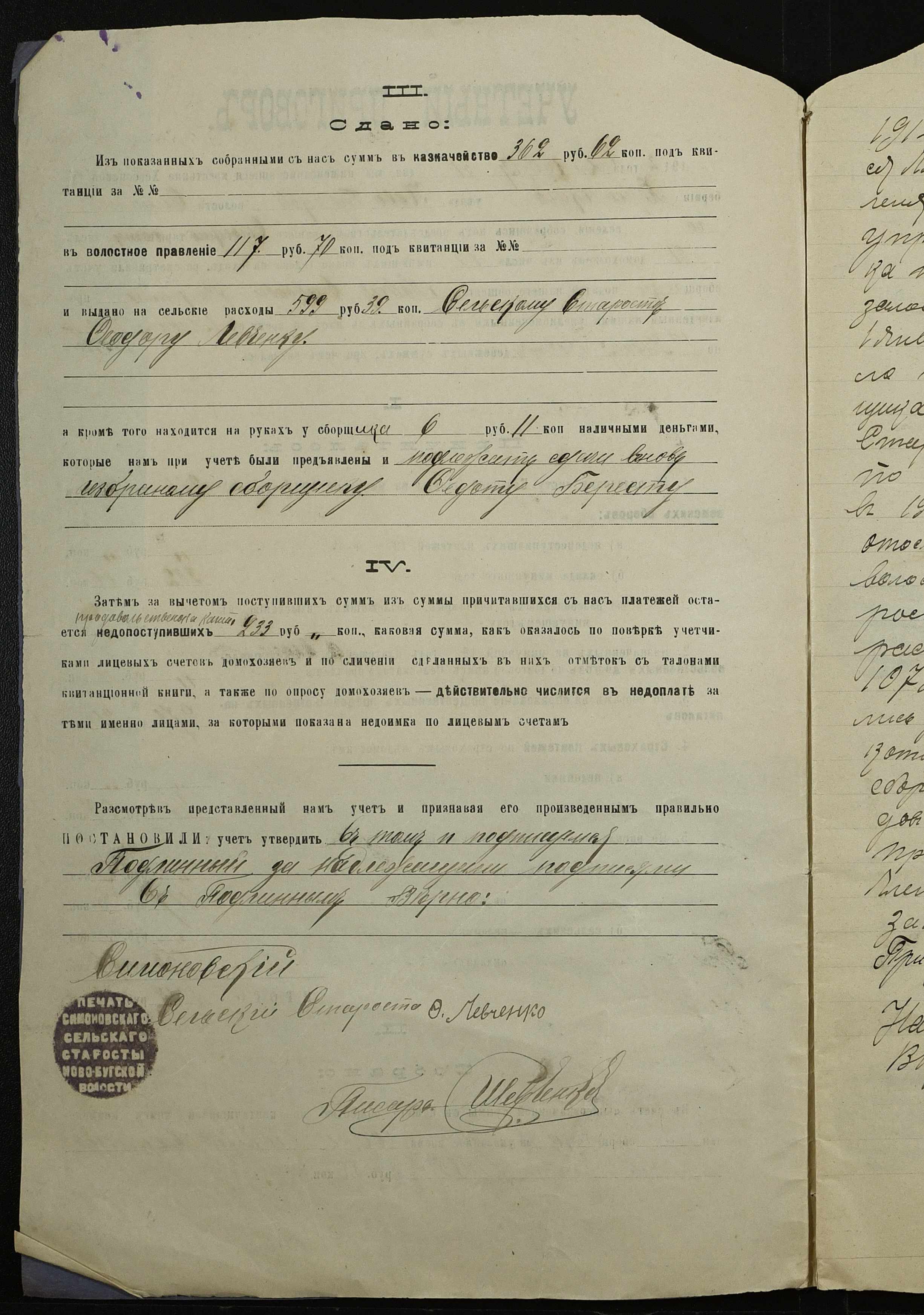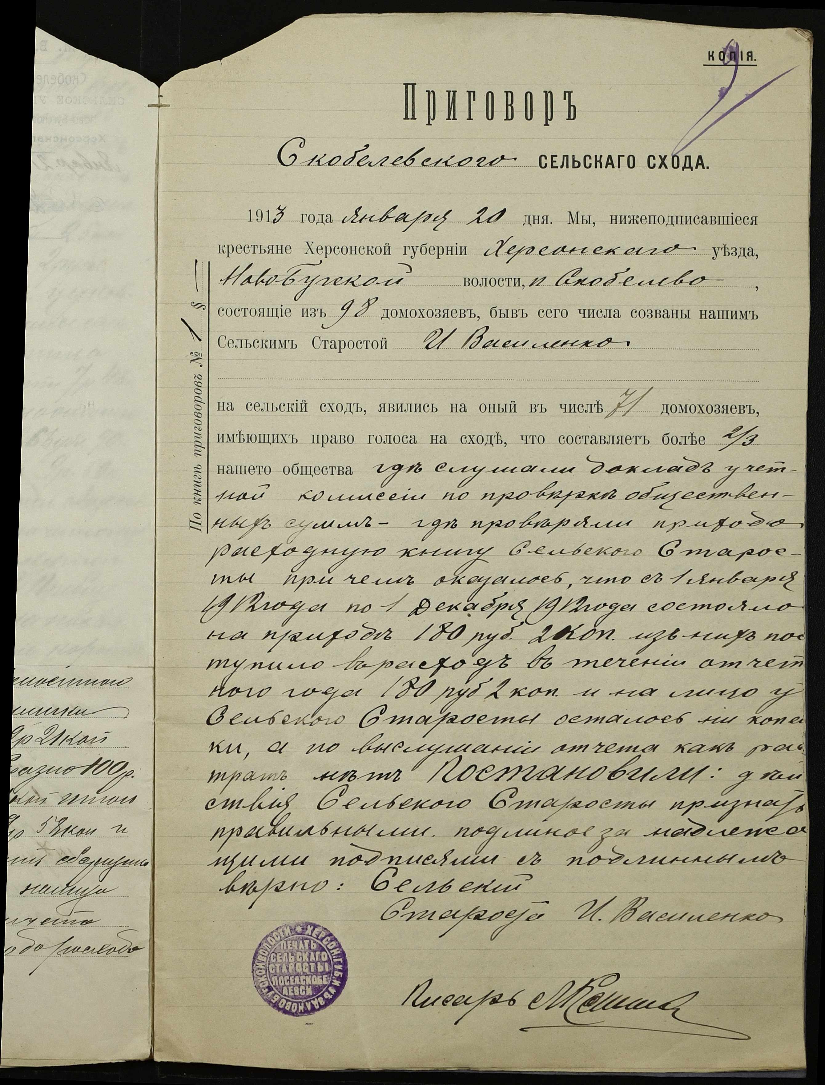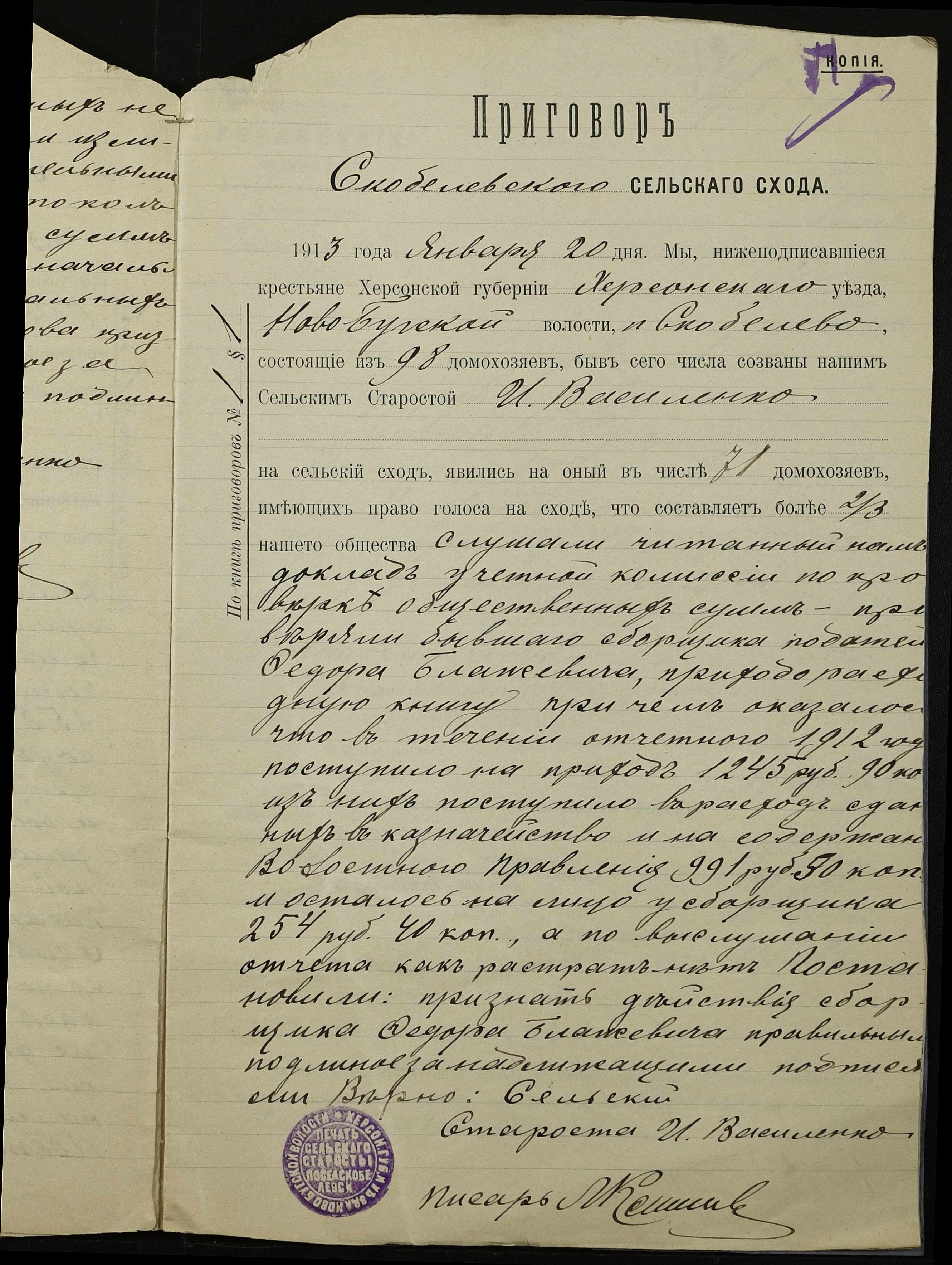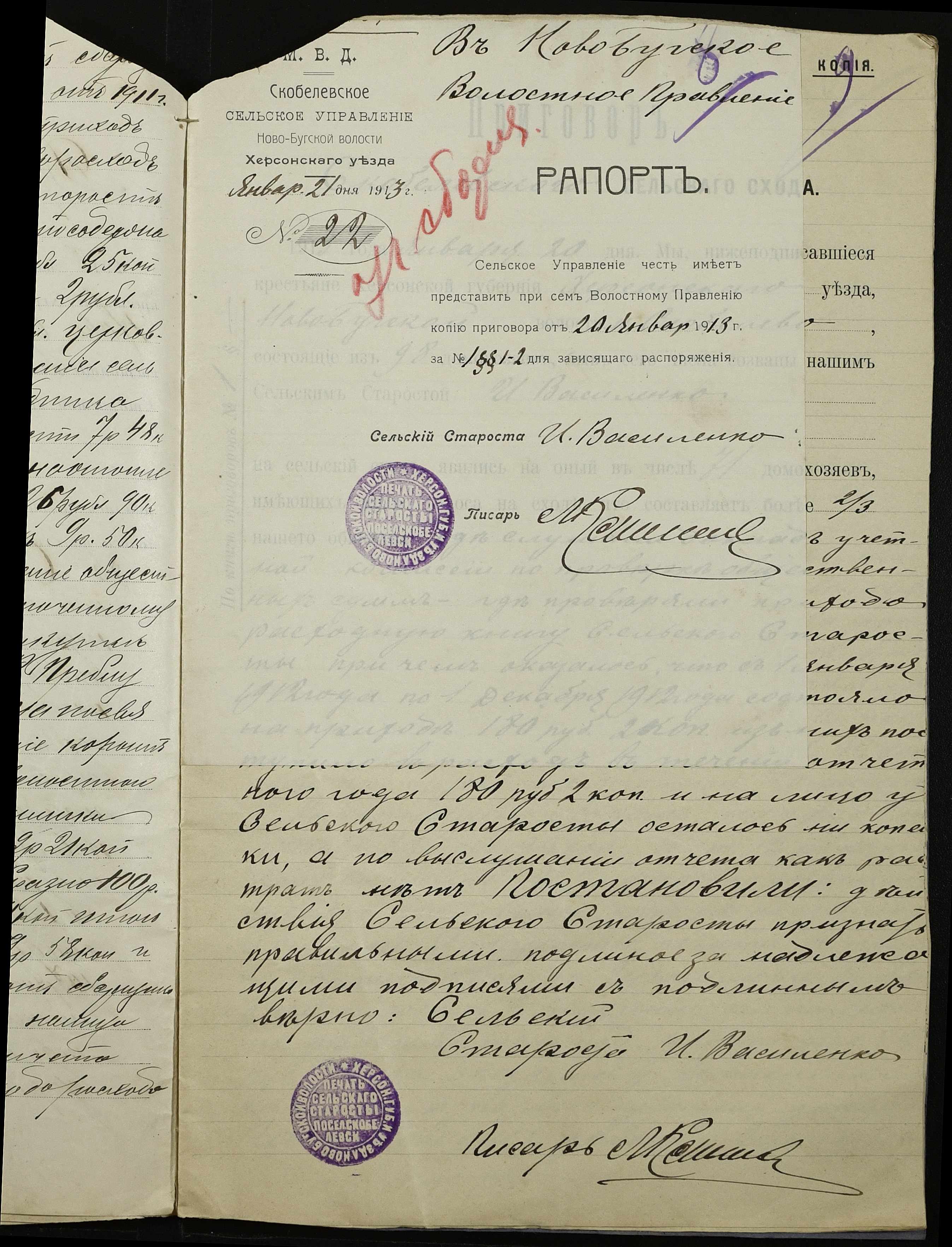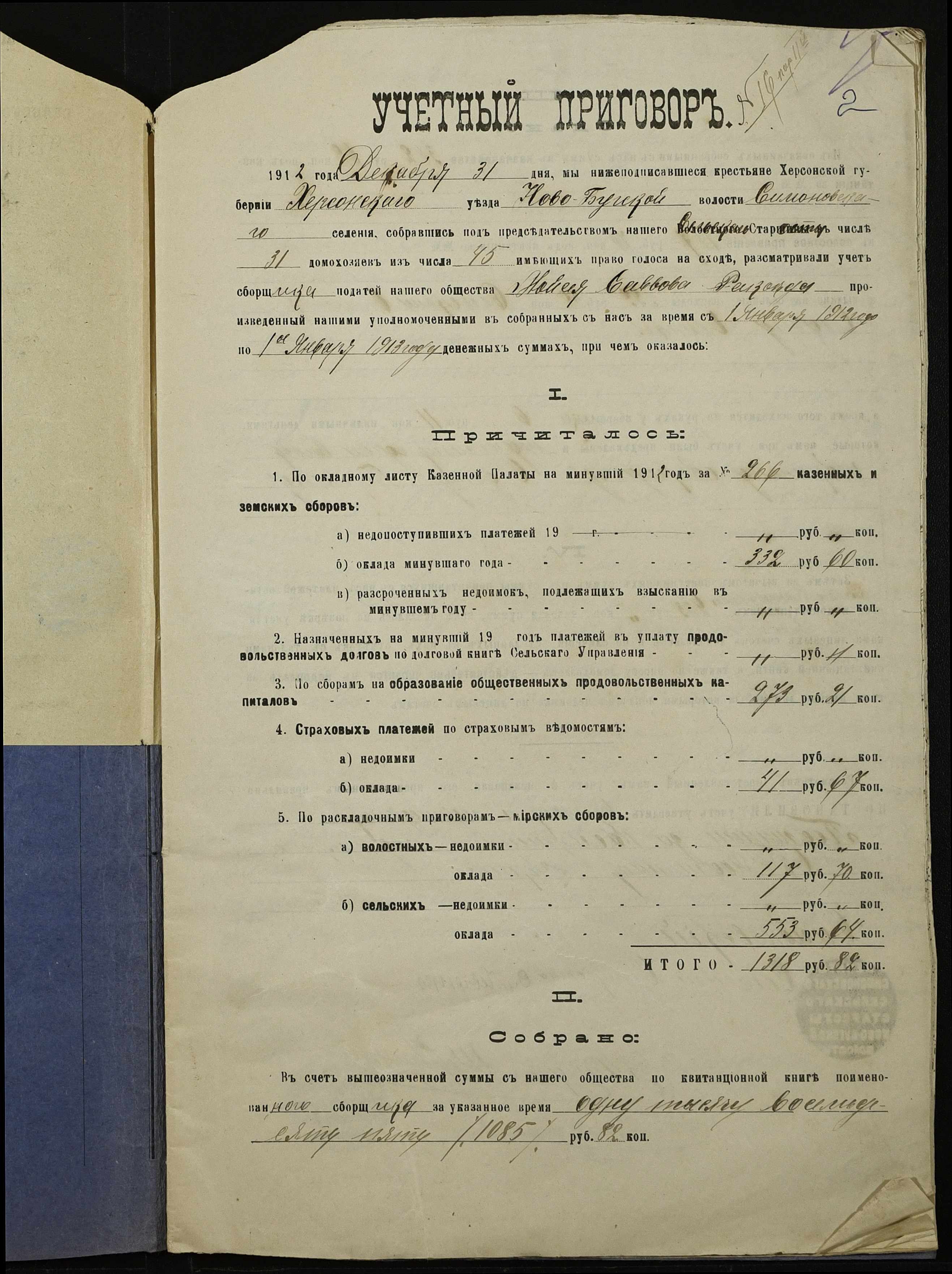 • • • • Справа № 147 “Облікові присуди сільських сходів та рапорти сільського старости про хід збору з селян сел. Симонівки податей та платежів за період з 01 січня 1912 року по 01 січня 1913 року”