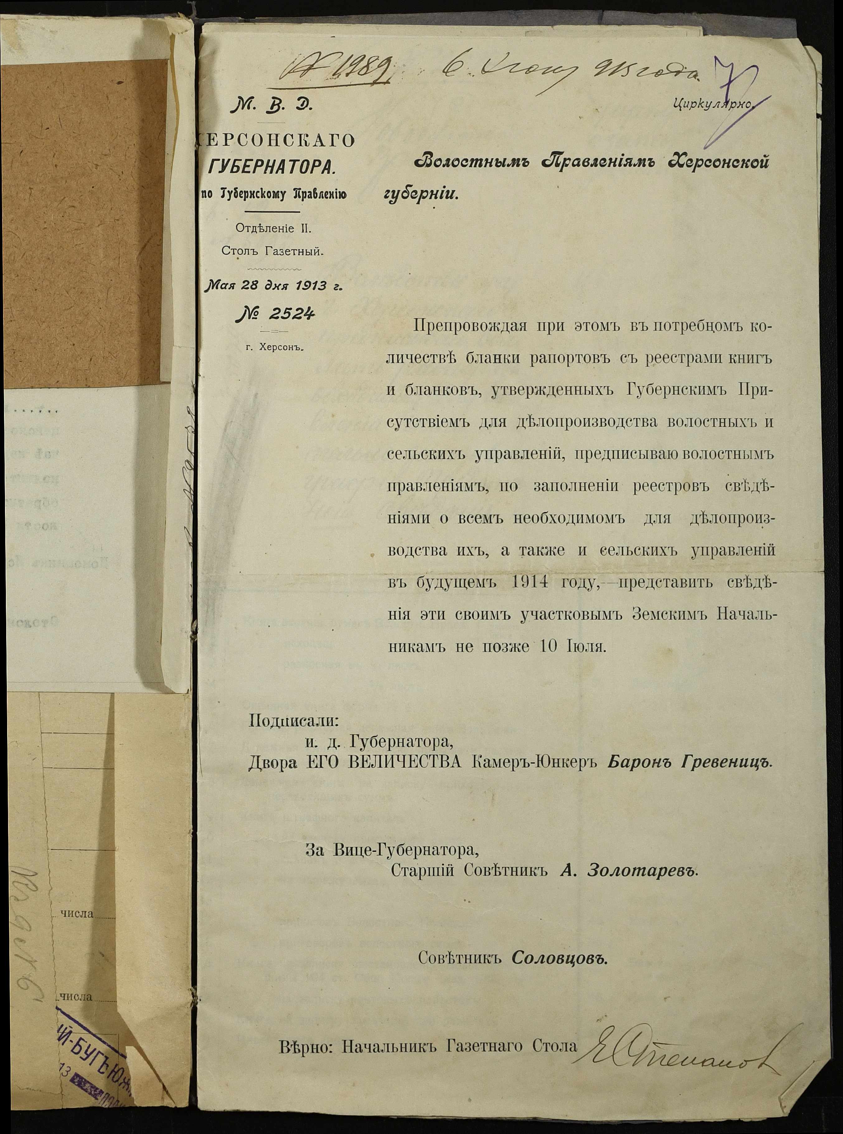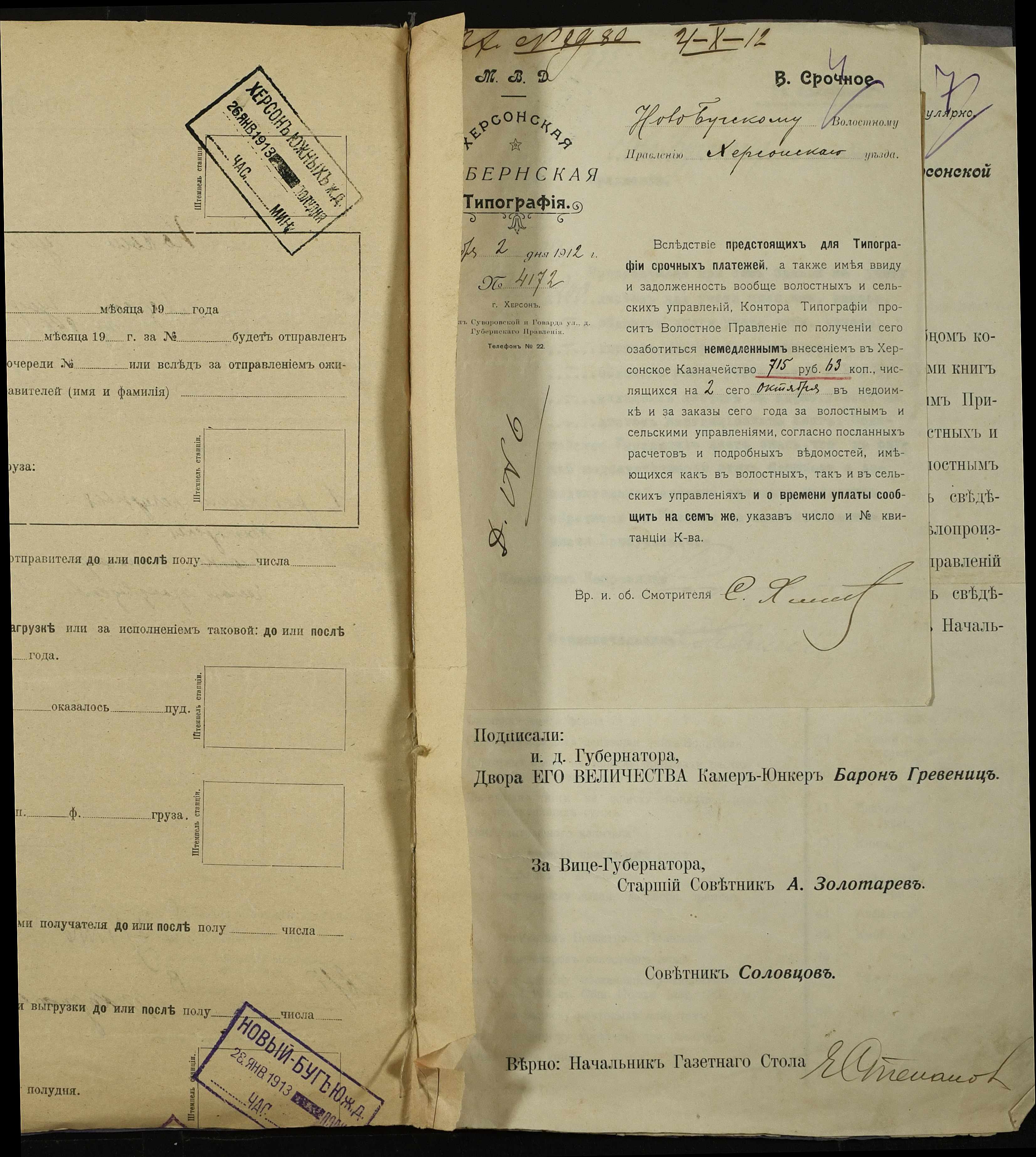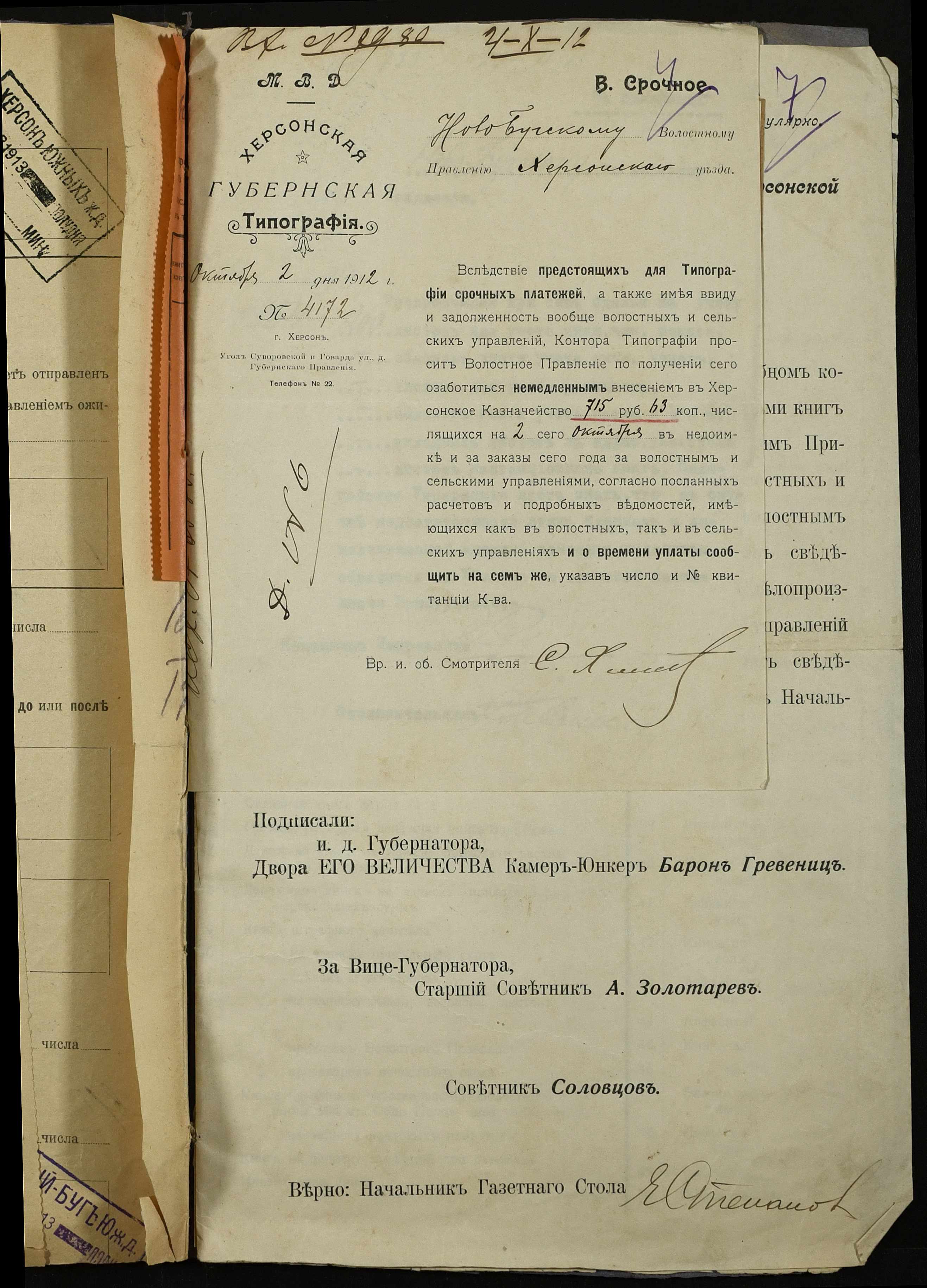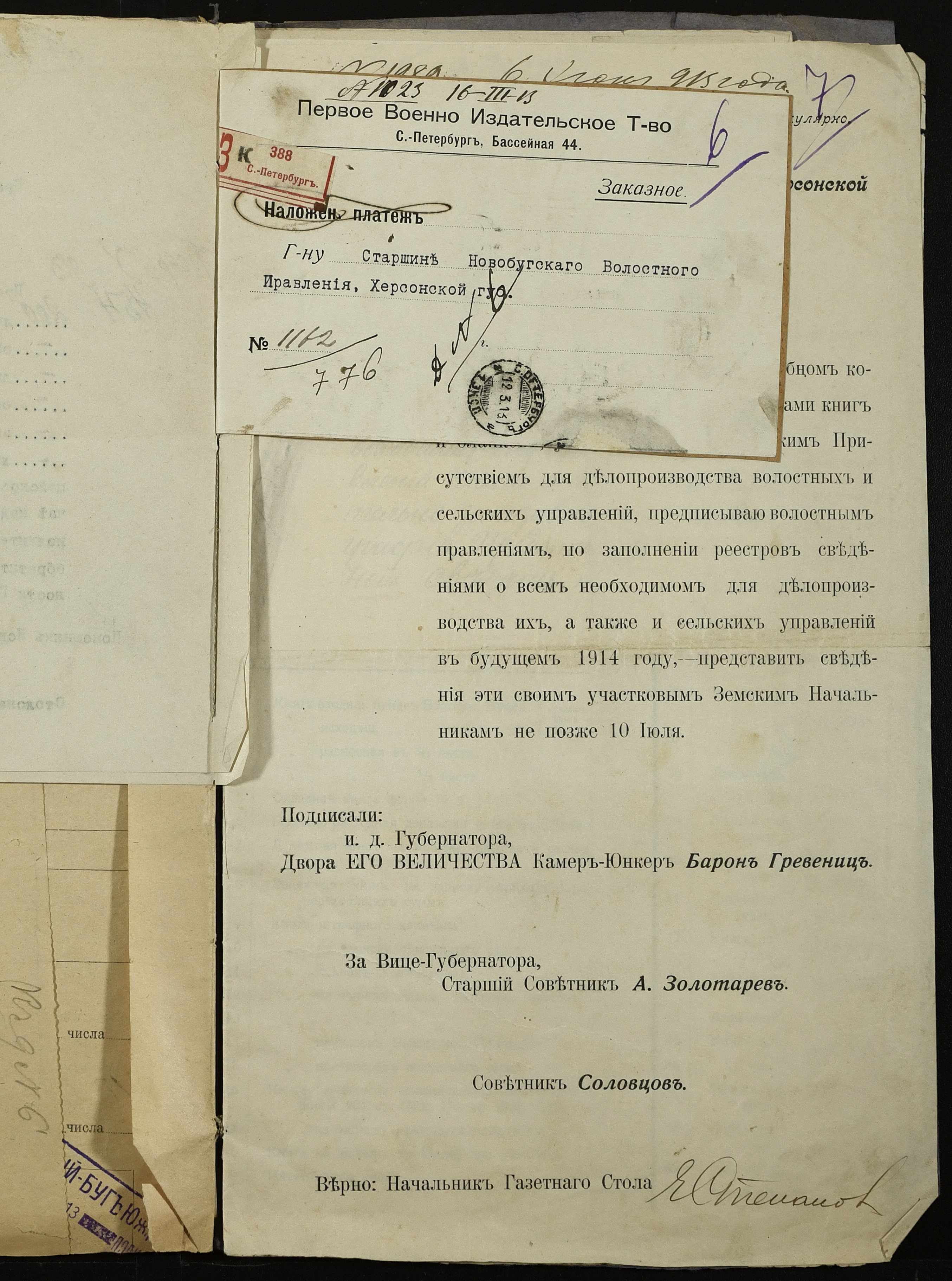 • • • • Справа № 148 “Листування з Херсонським земським начальником та губернською друкарнею про умови замовлення, строки друкування та пересилки конторських книг і бланків для волосного правління”