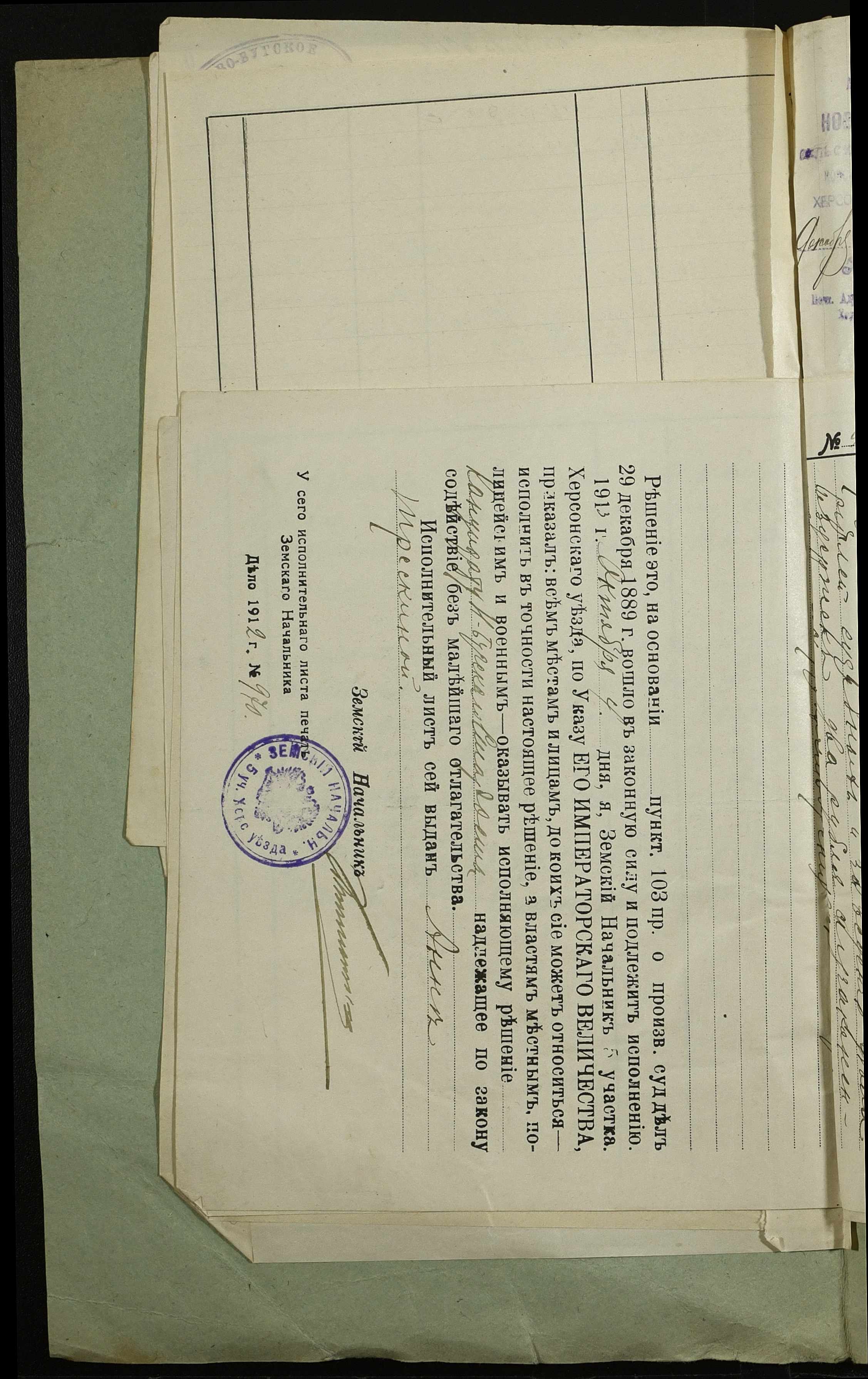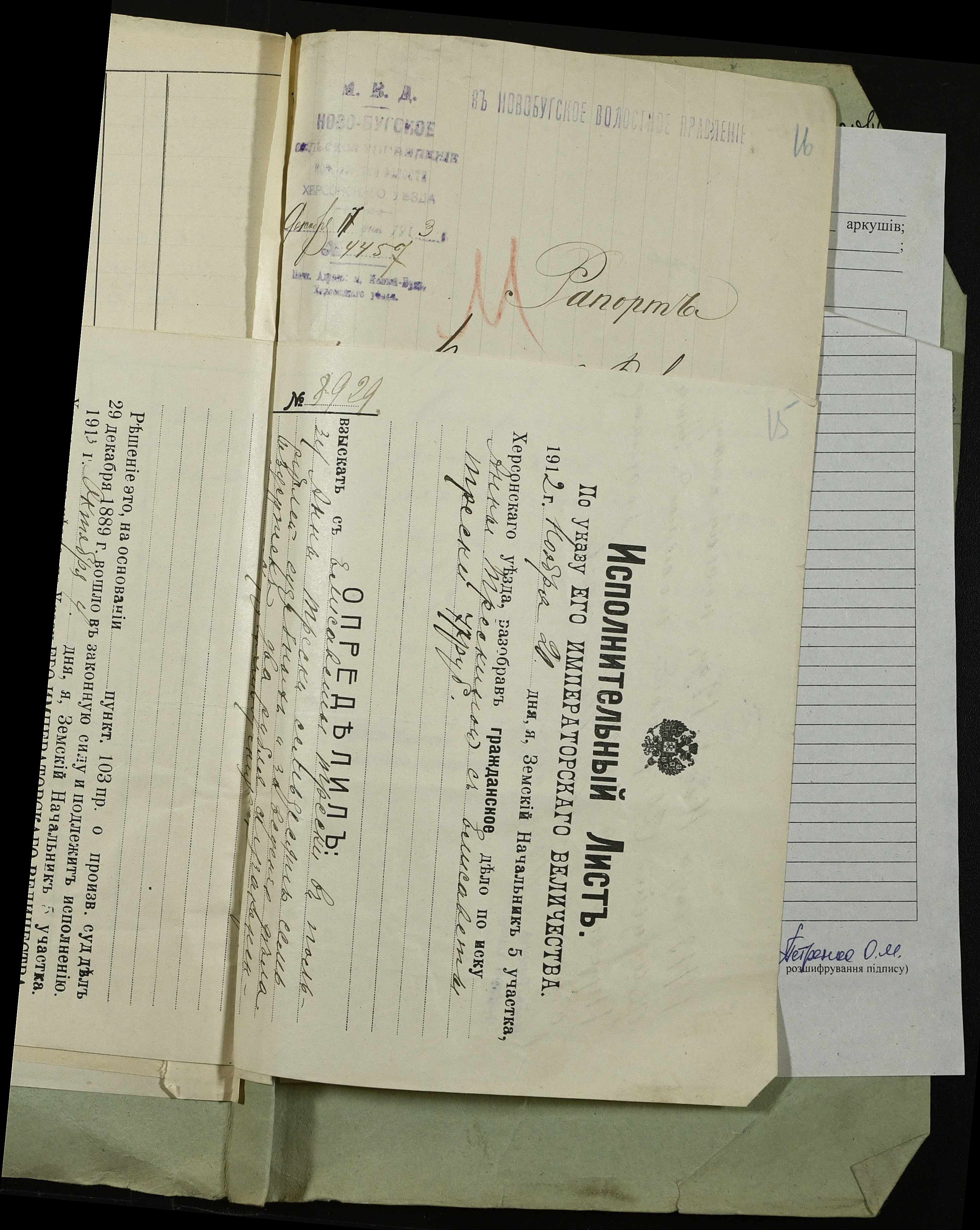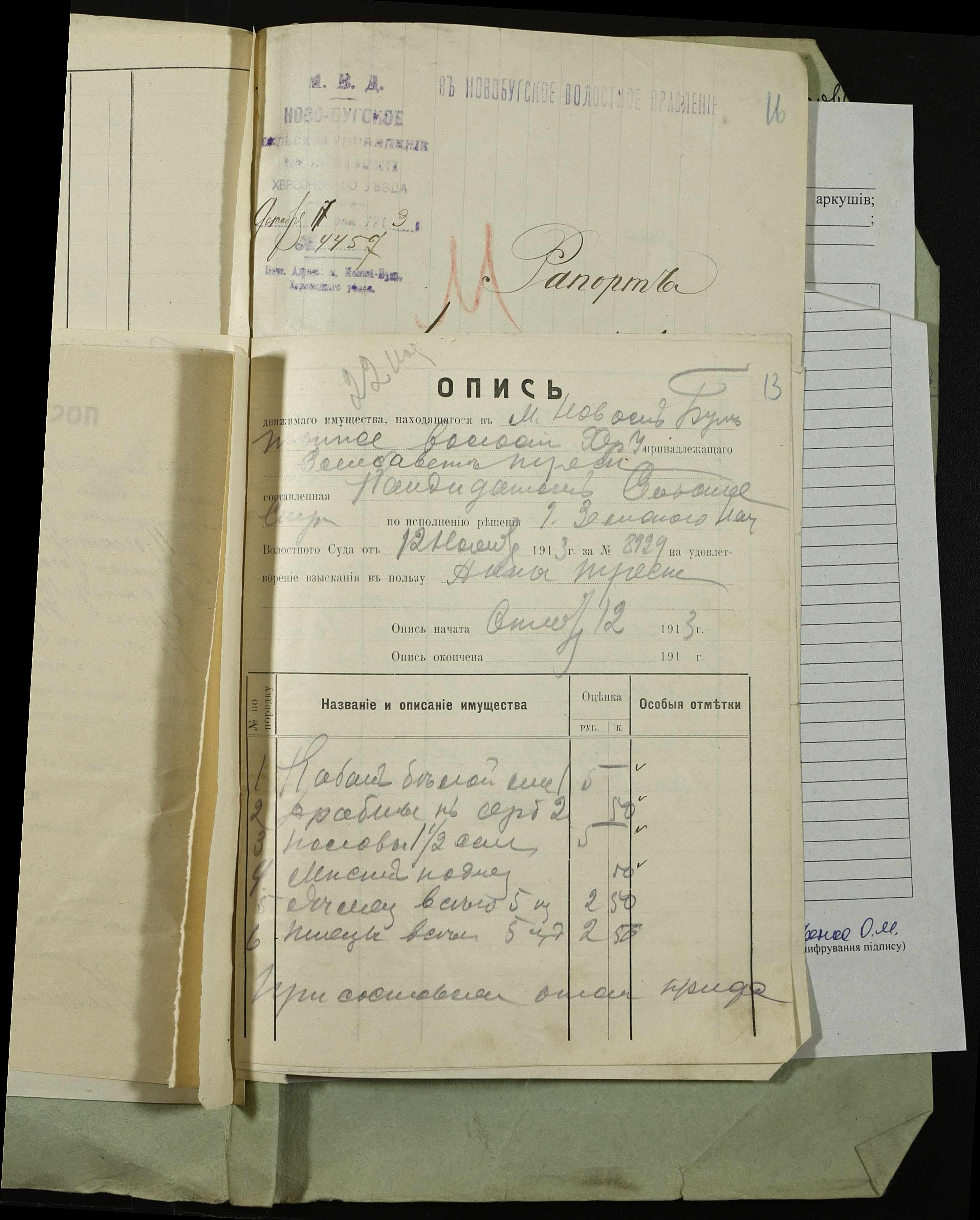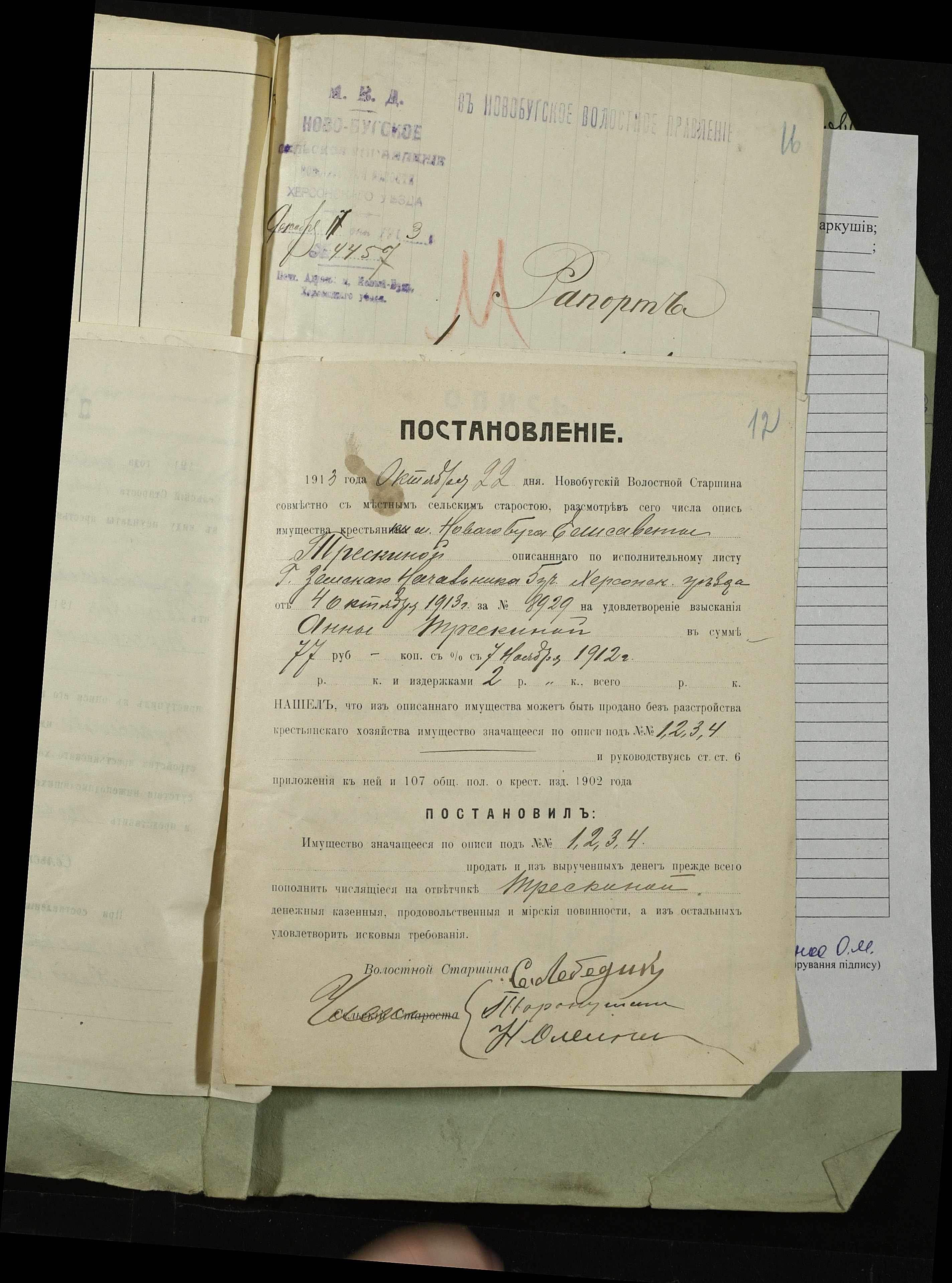 • • • • Справа № 155 “Витяг з рішення Херсонського окружного суду, виконавчі листи та рапорти сільського старости м. Новий Буг про проведення описування та розпродажу майна селян Дибривського А.Г. та Трєски Ганни за борги”