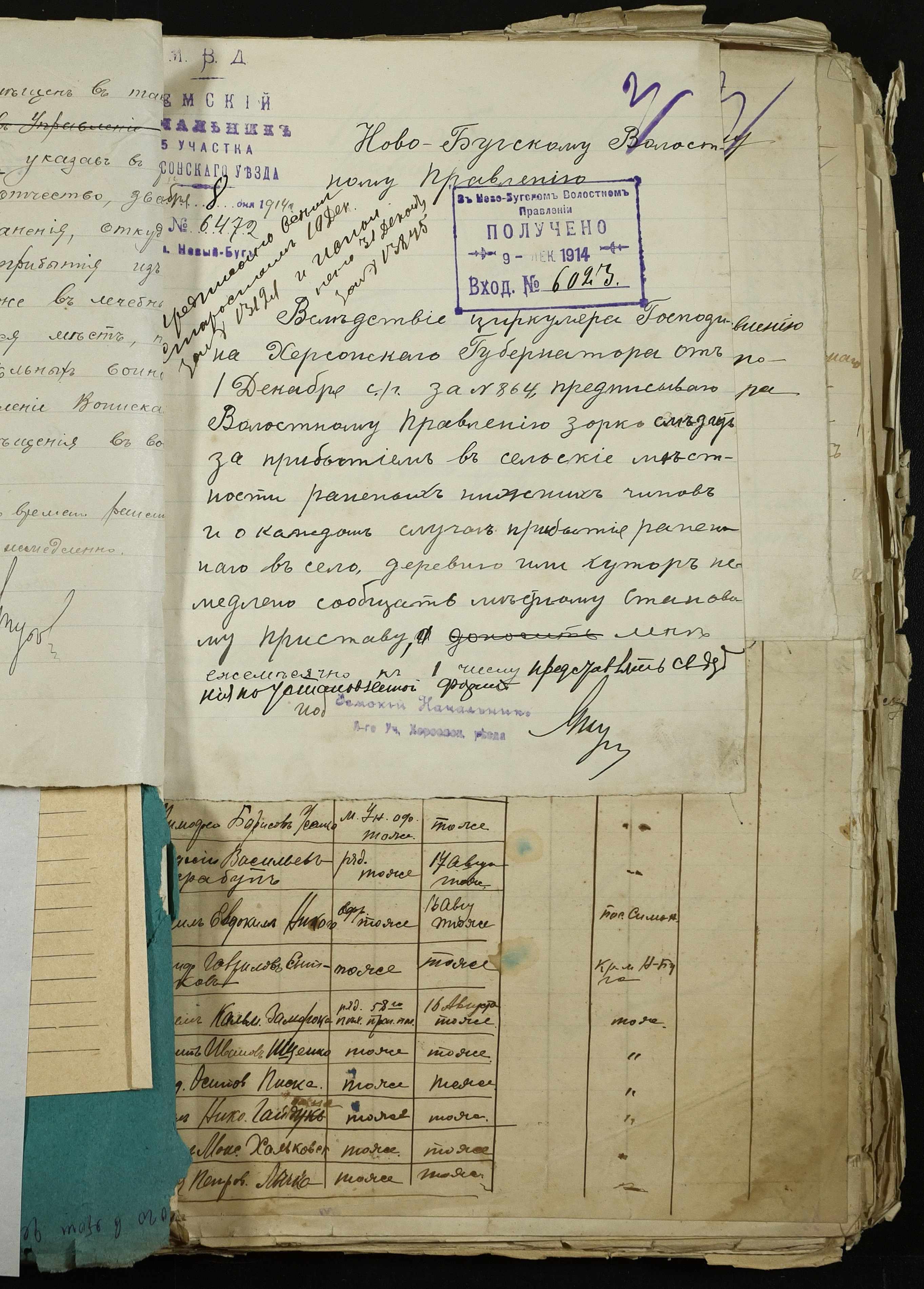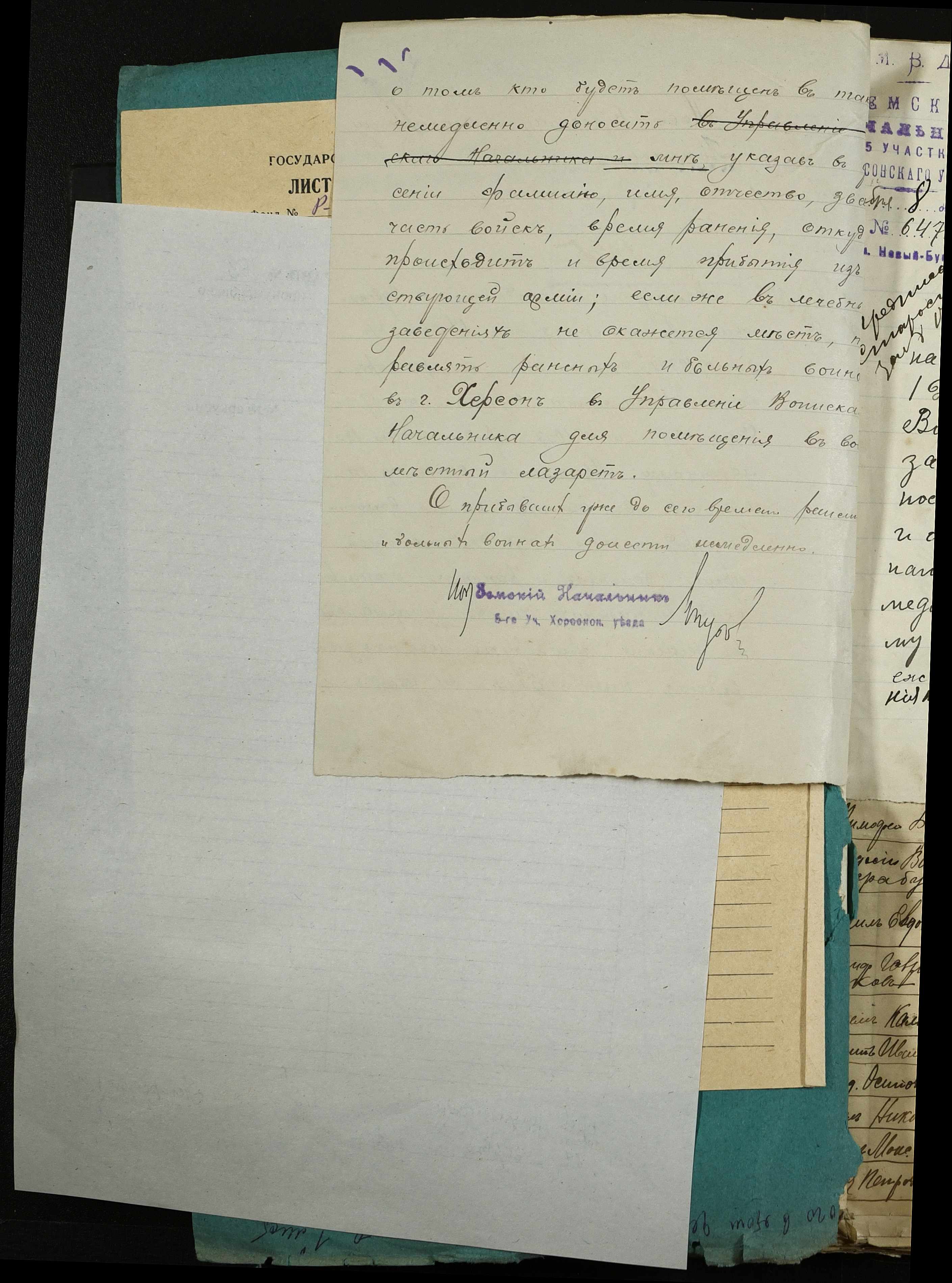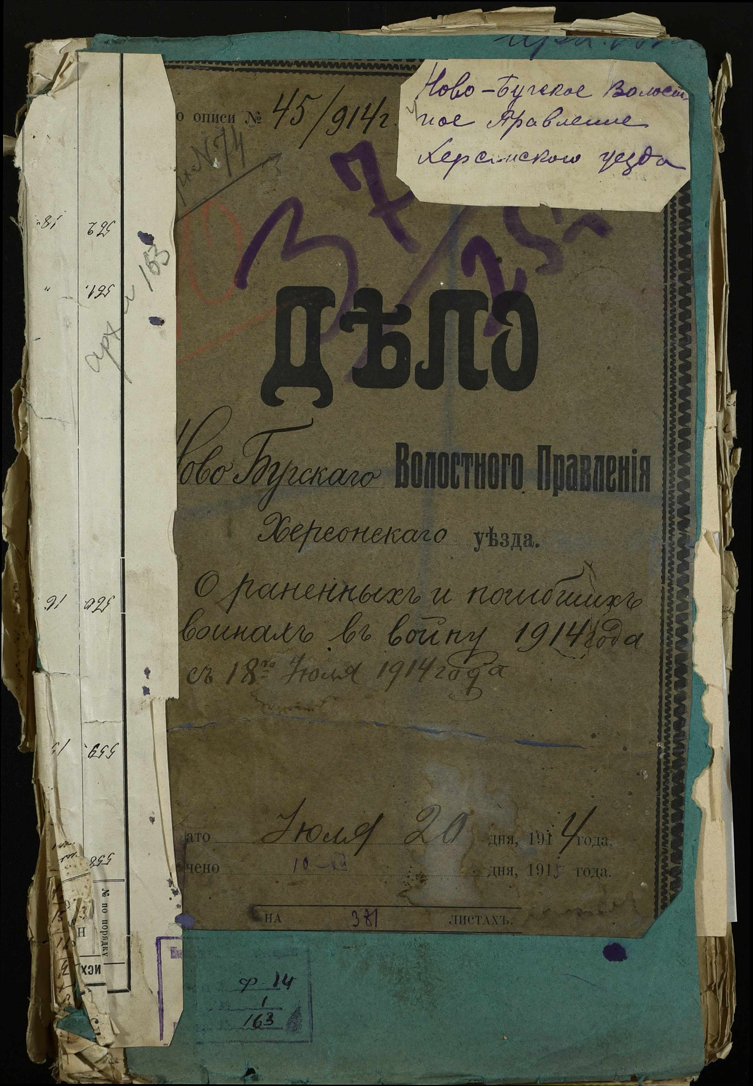• • • • Справа № 163 “Розпорядження дільничного земського начальника Херсонського повіту, листування з ним та сільськими старостами про порядок обліку та розміщення до лікувальних закладів поранених, що прибувають з фронту, відомості про поранених та повідомлення на вбитих воїнів, покликаних із волості”