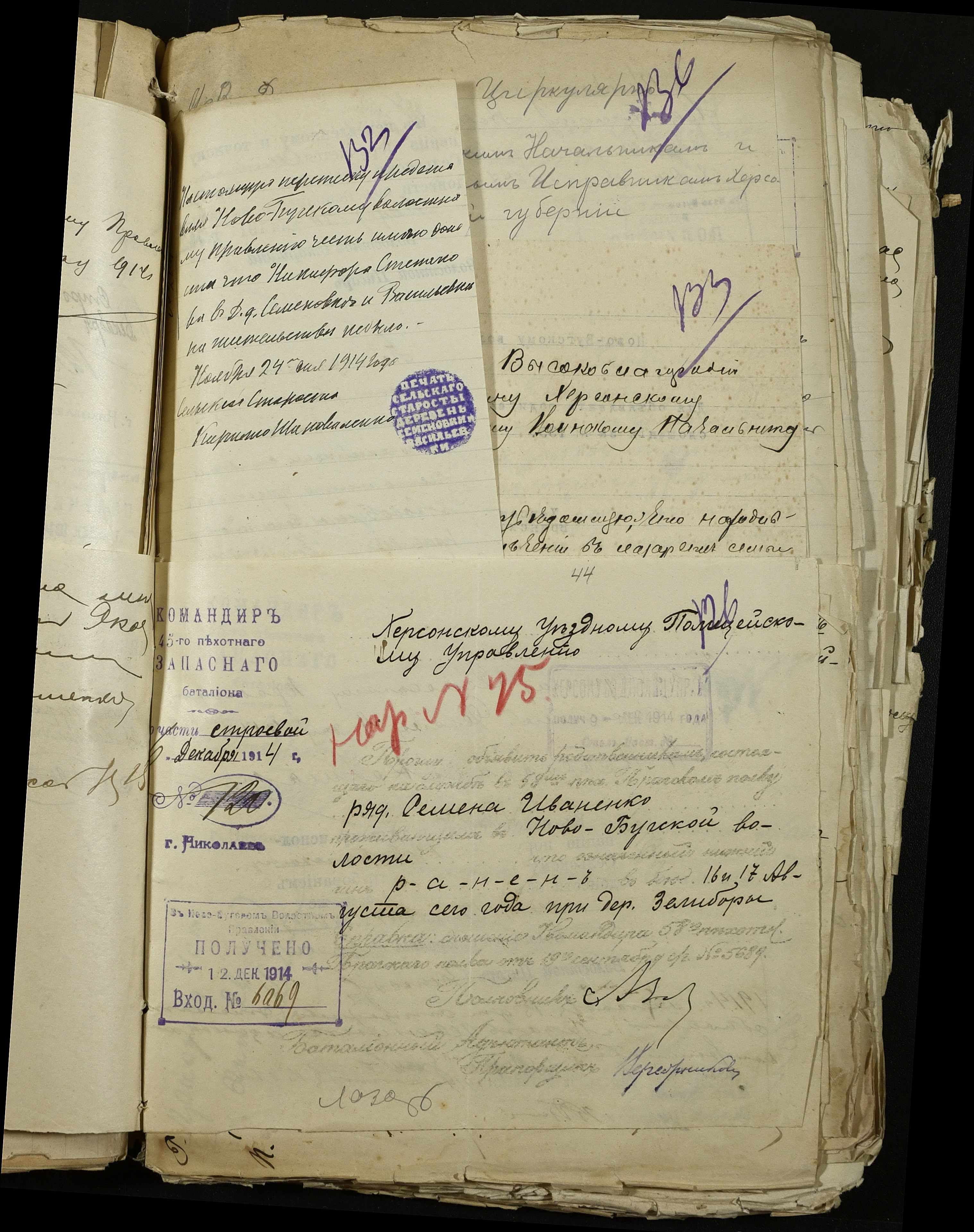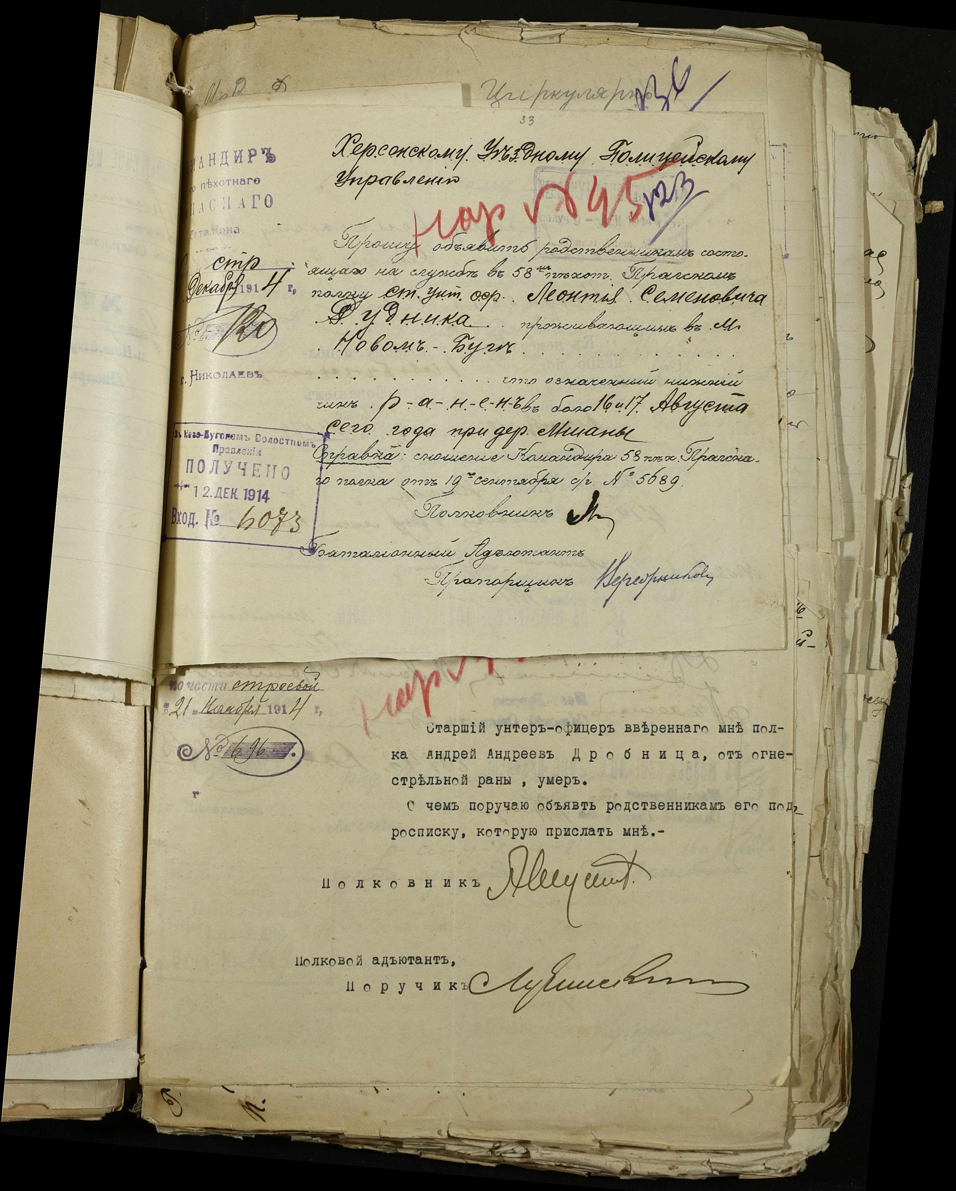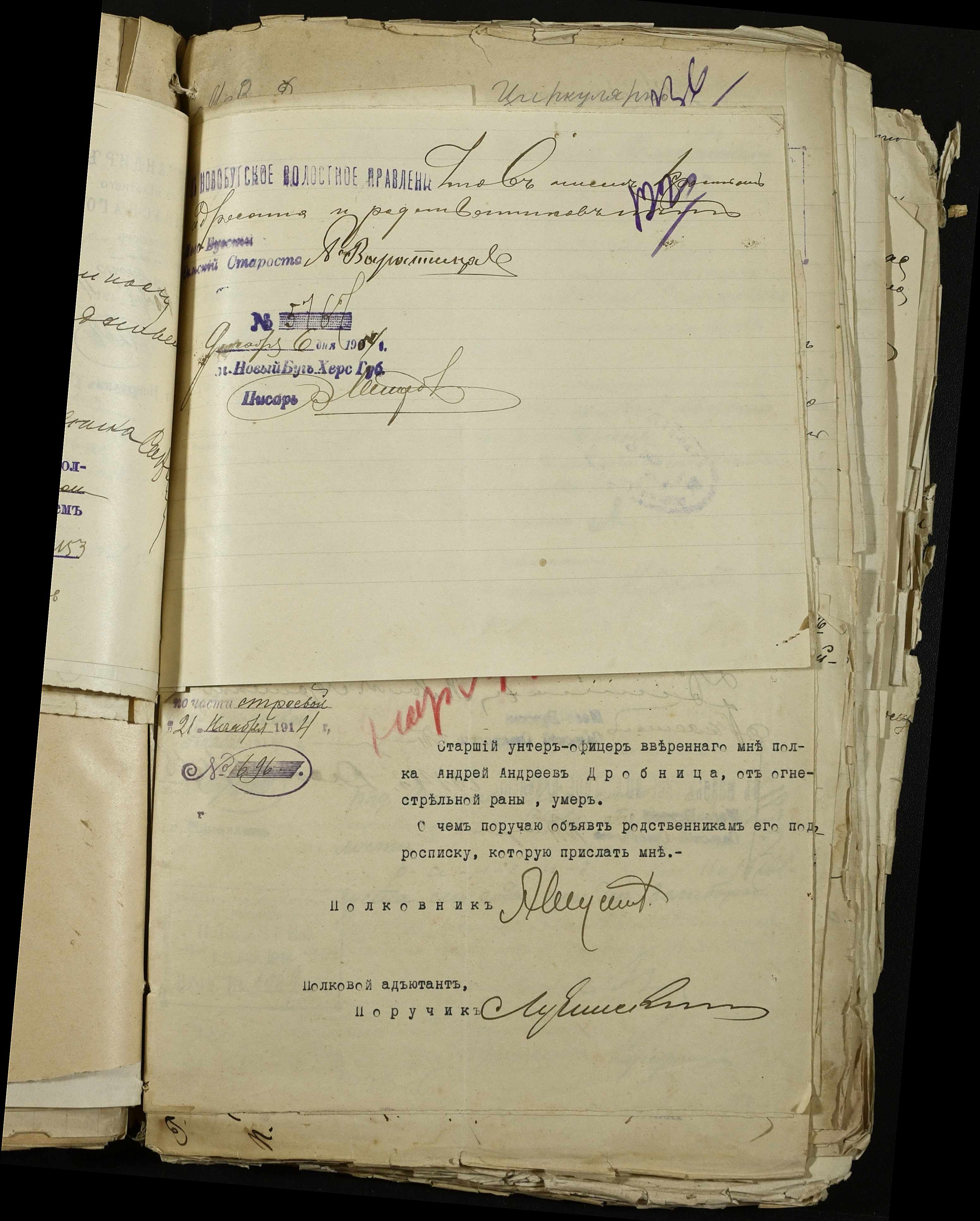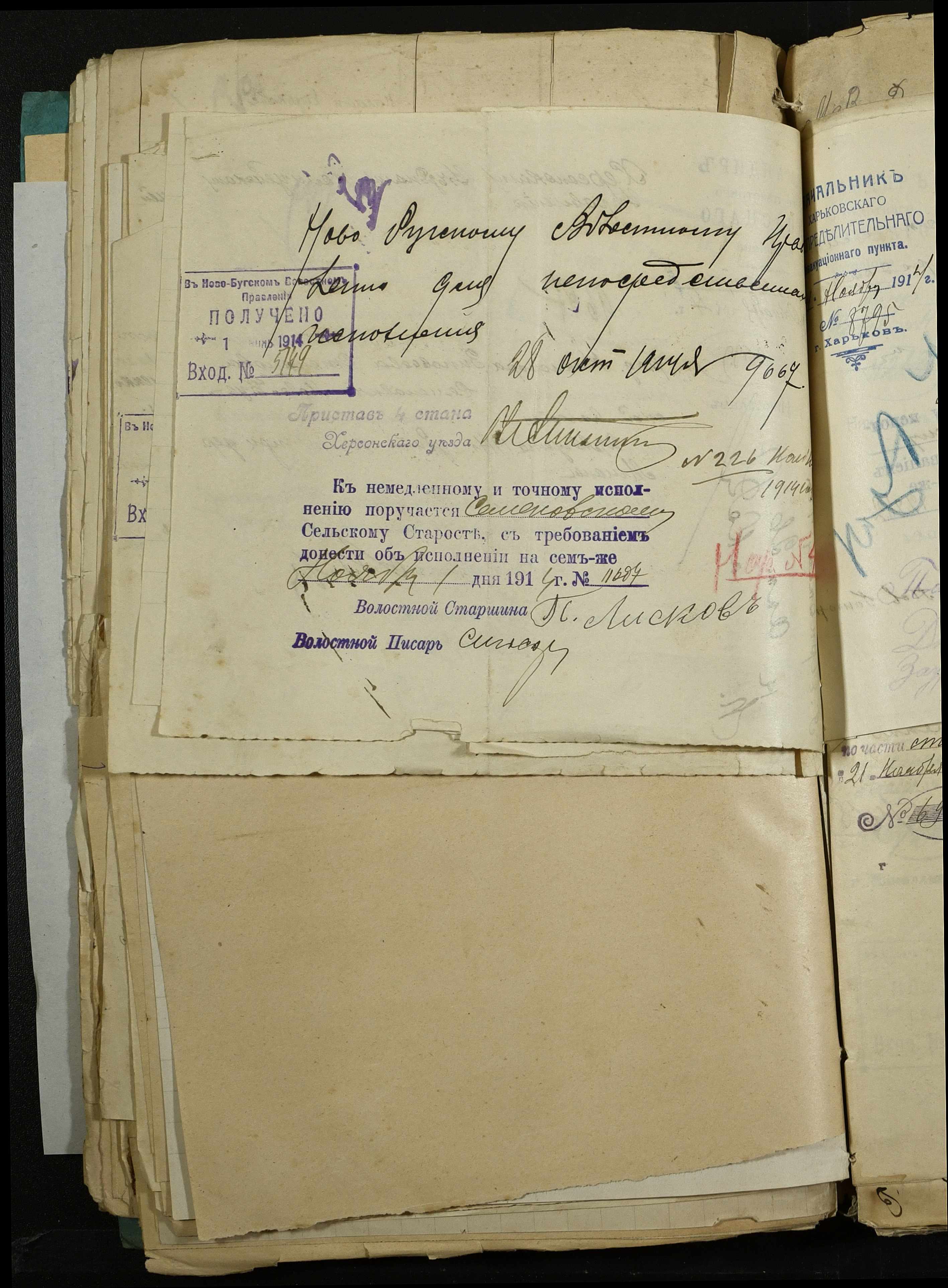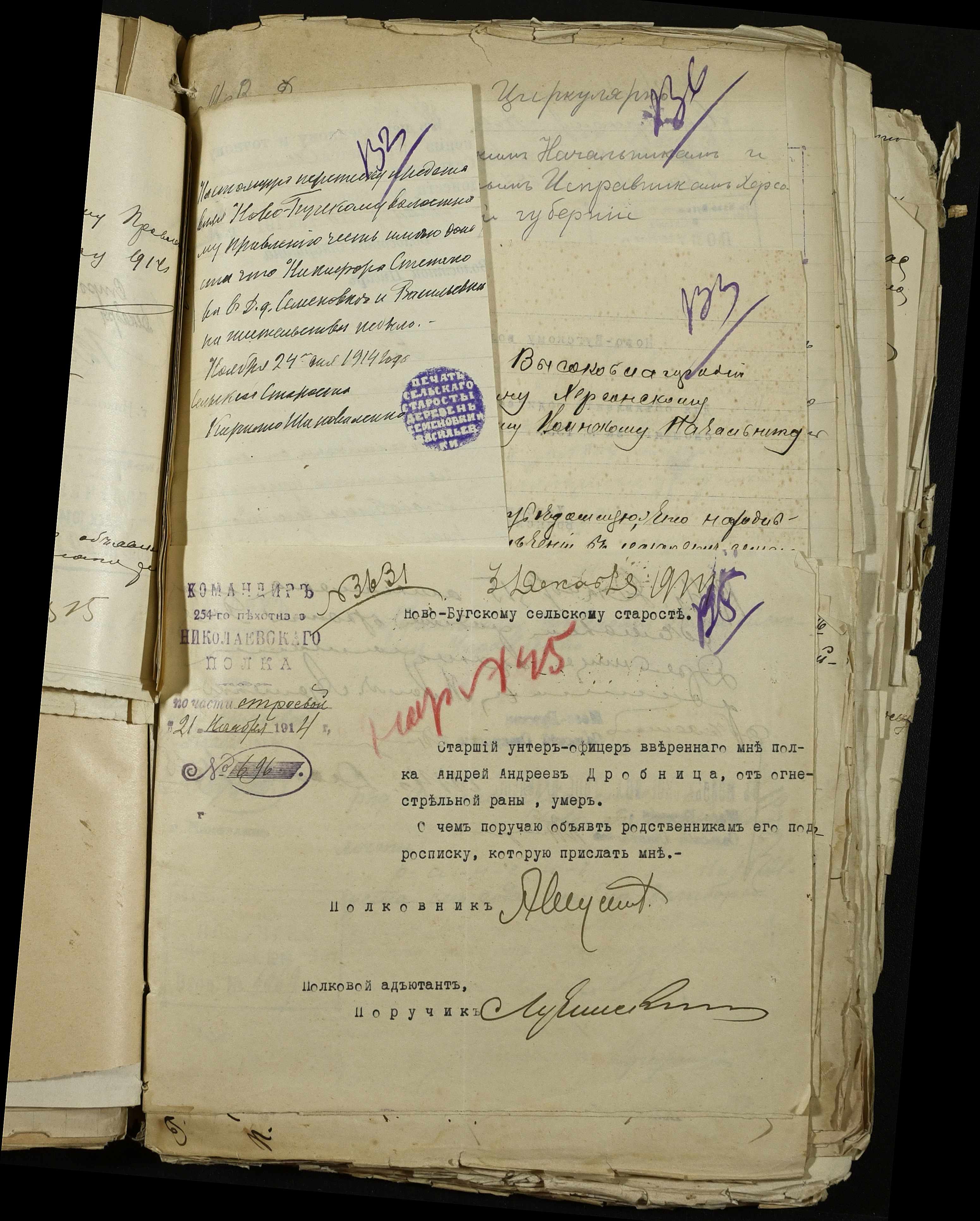 • • • • Справа № 163 “Розпорядження дільничного земського начальника Херсонського повіту, листування з ним та сільськими старостами про порядок обліку та розміщення до лікувальних закладів поранених, що прибувають з фронту, відомості про поранених та повідомлення на вбитих воїнів, покликаних із волості”