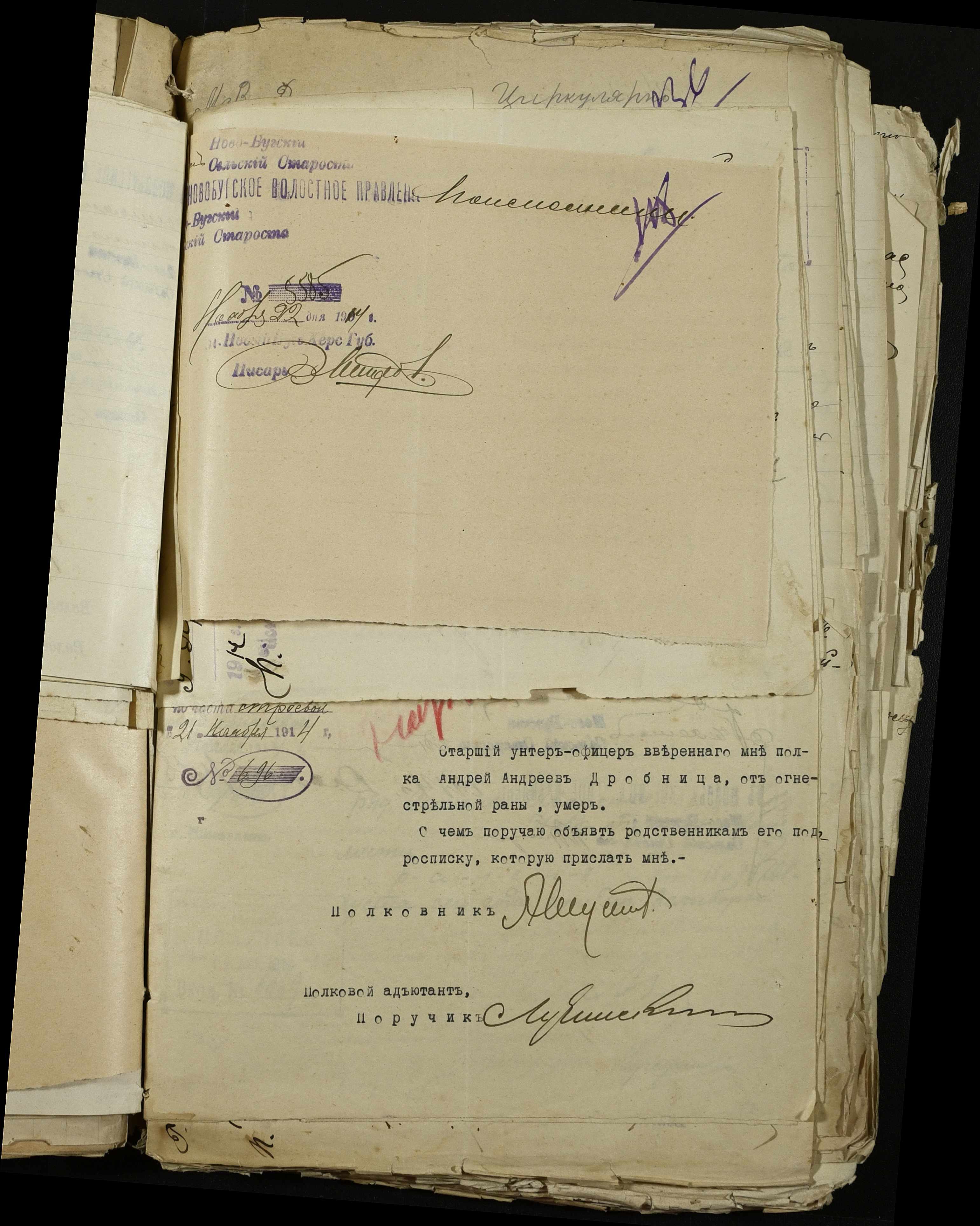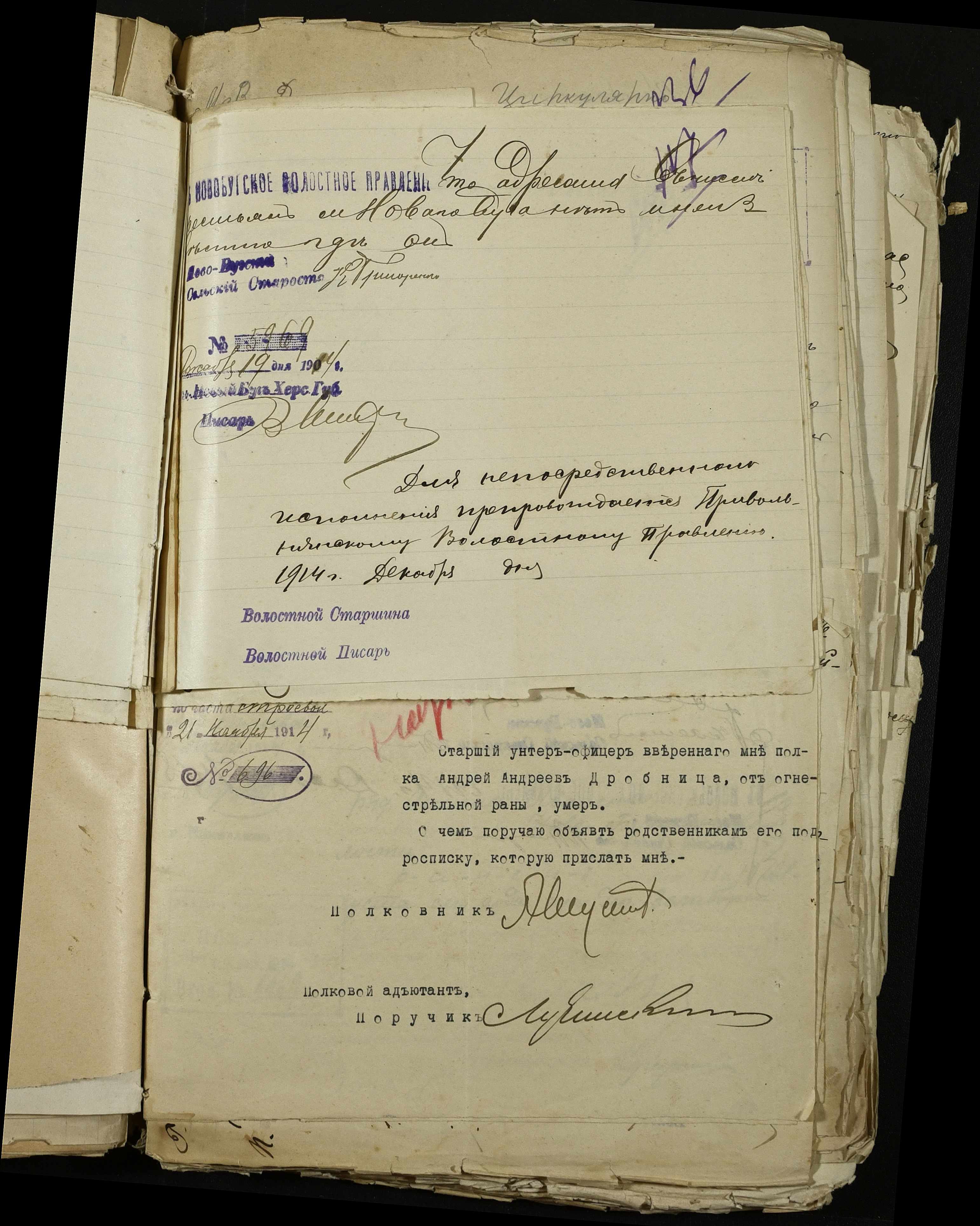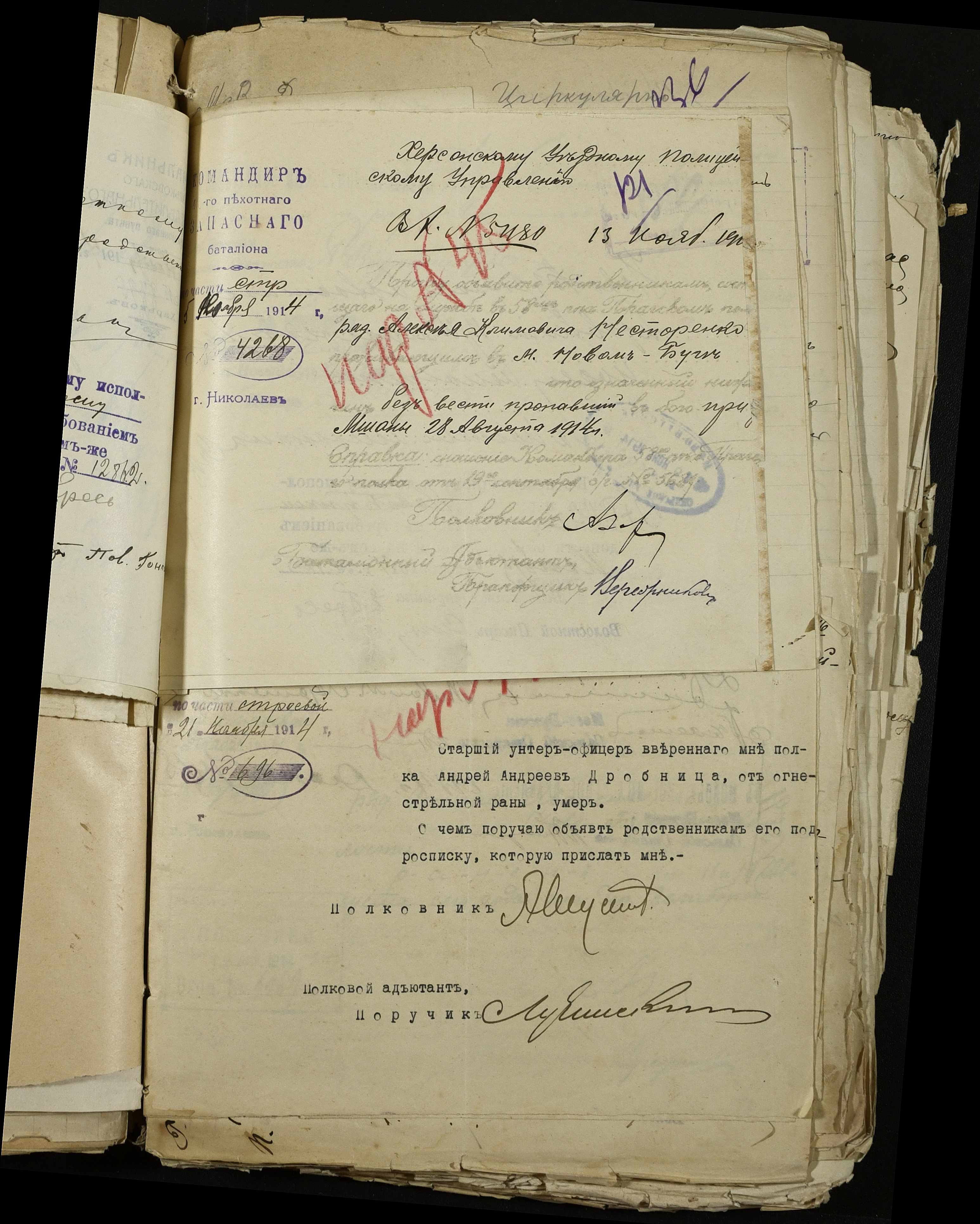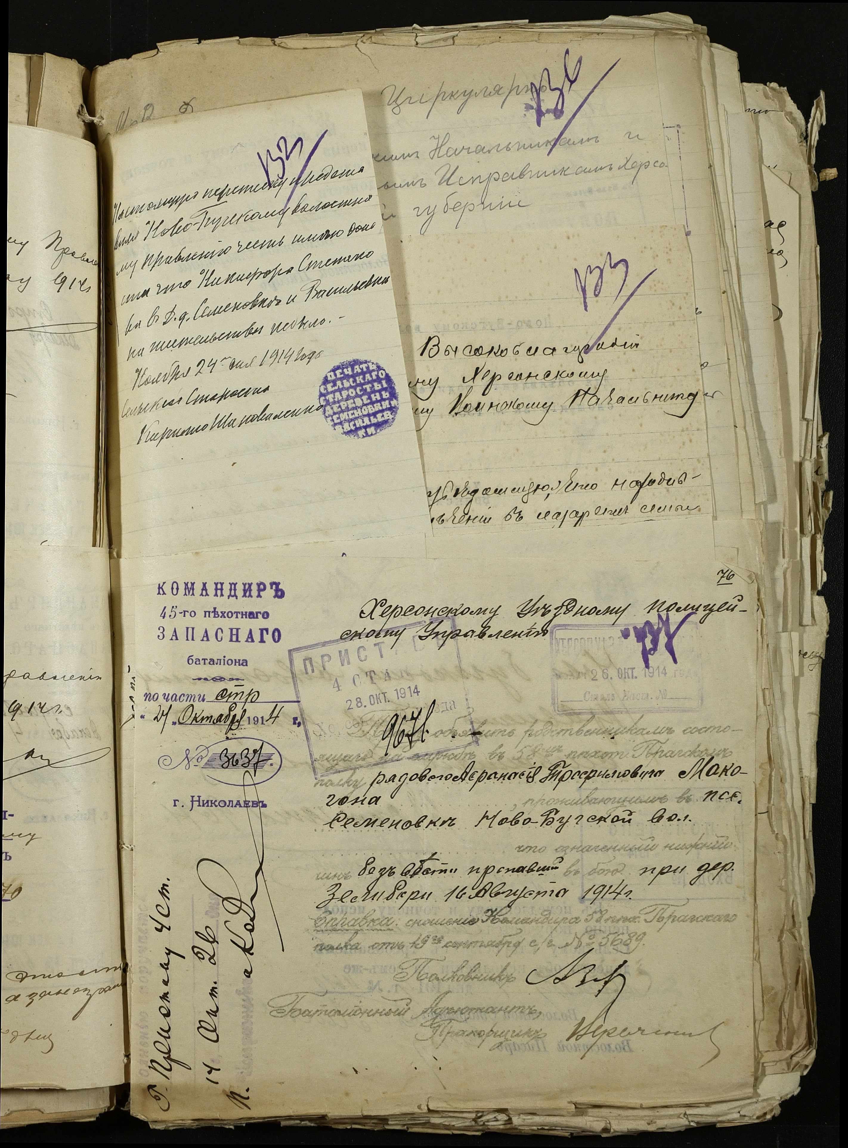 • • • • Справа № 163 “Розпорядження дільничного земського начальника Херсонського повіту, листування з ним та сільськими старостами про порядок обліку та розміщення до лікувальних закладів поранених, що прибувають з фронту, відомості про поранених та повідомлення на вбитих воїнів, покликаних із волості”
