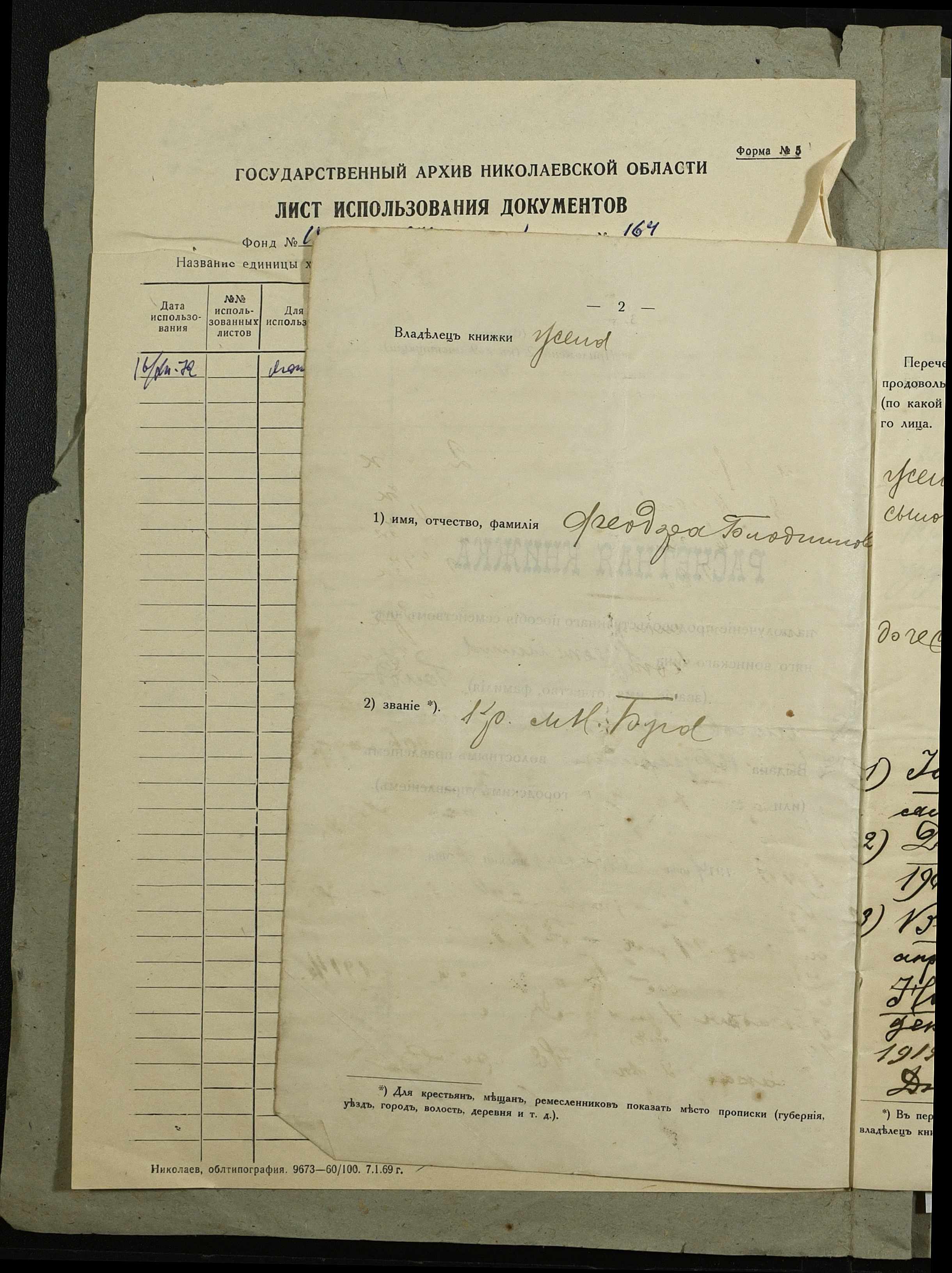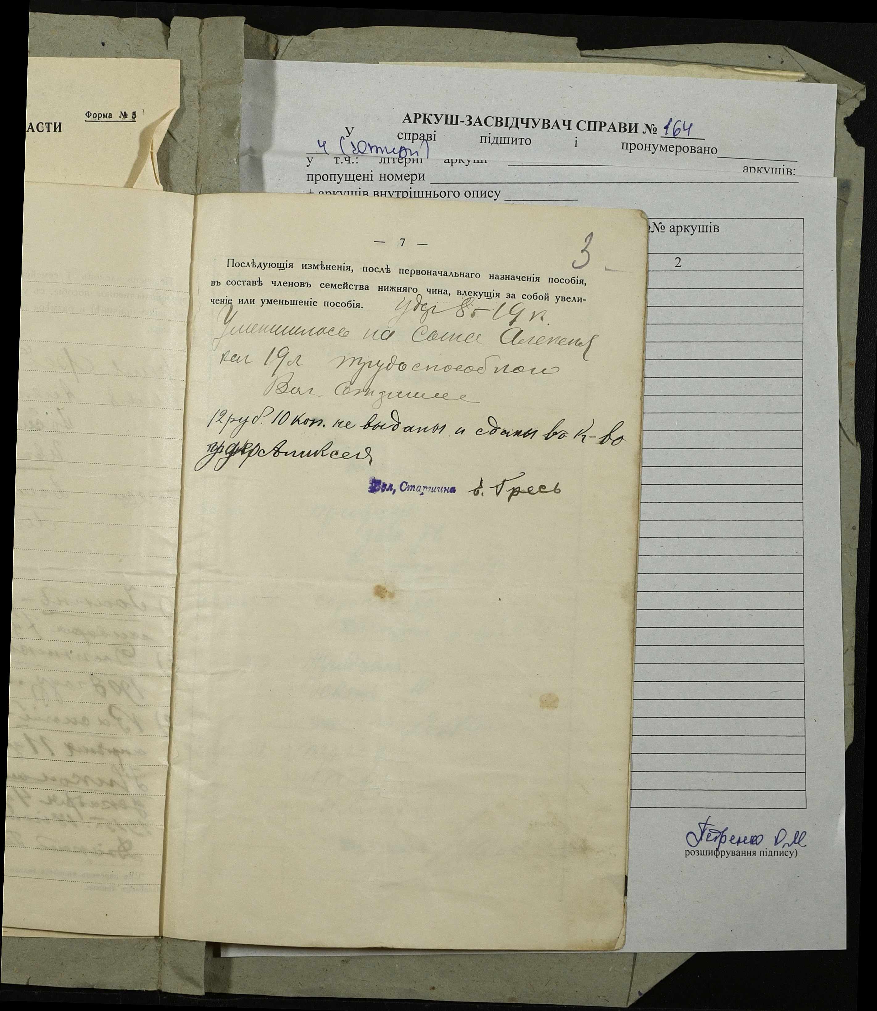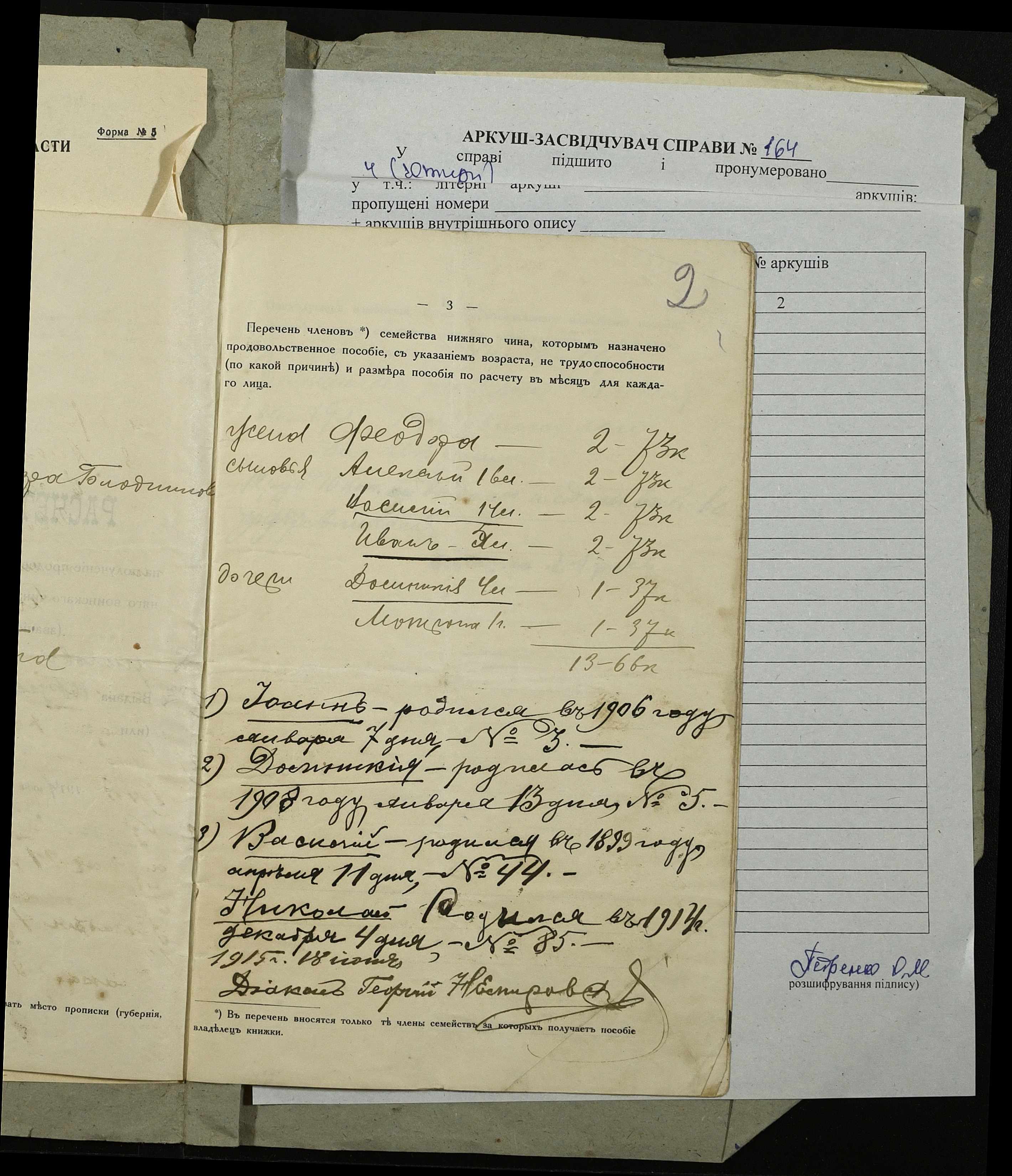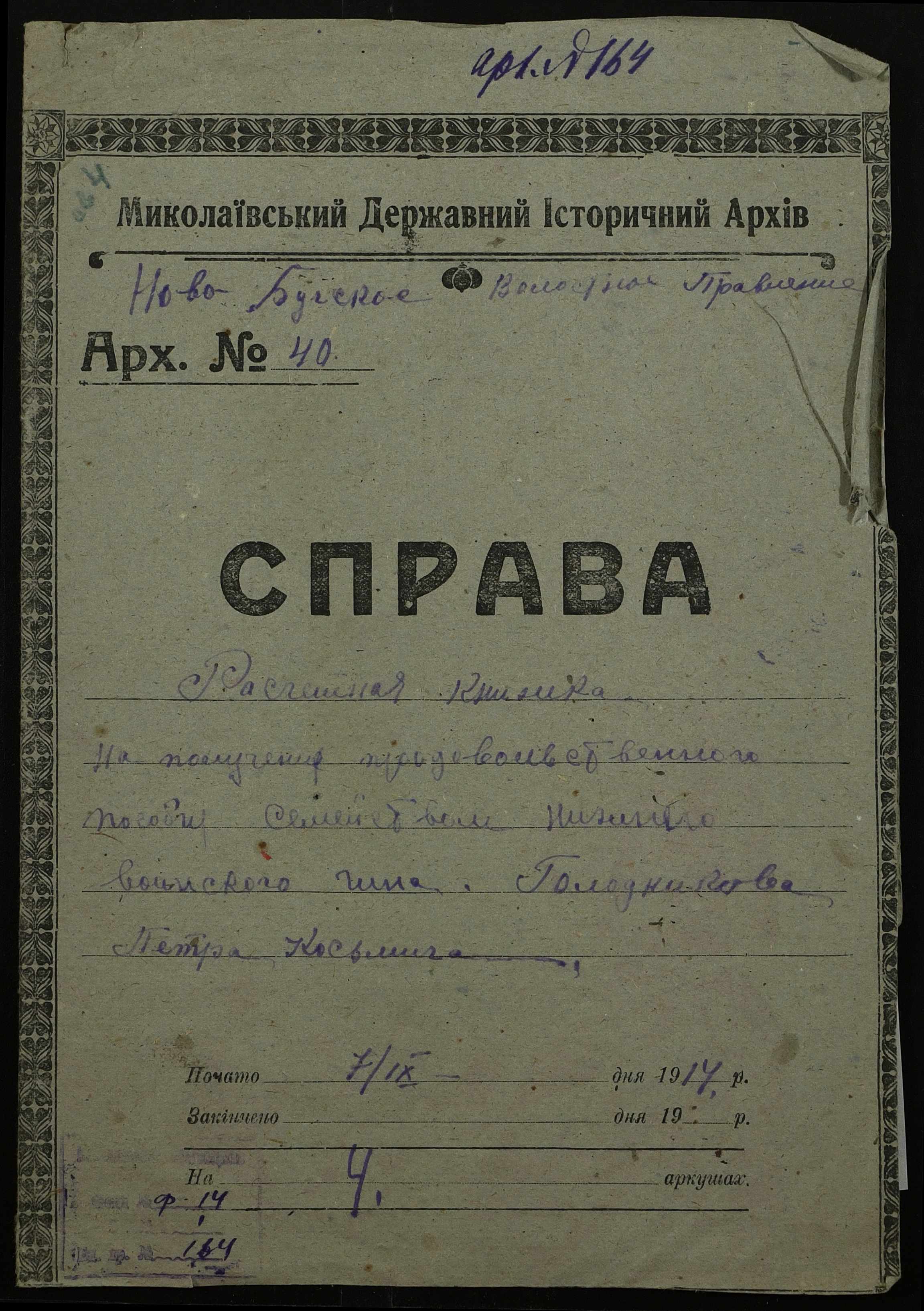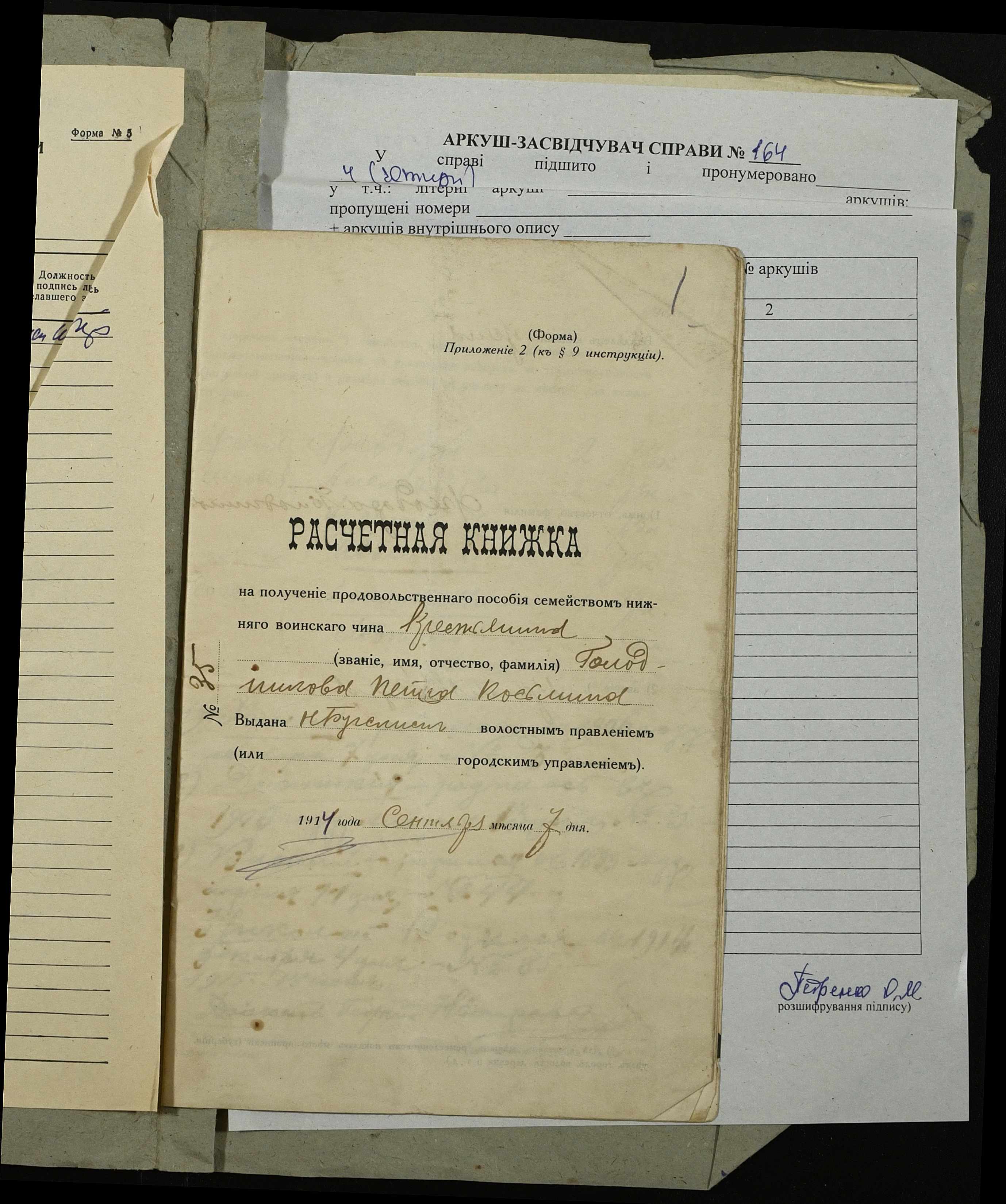 • • • • Справа № 164 “Розрахункова книжка на отримання продовольчої допомоги родиною нижнього військового чину, селянина Голодникова П.К.”