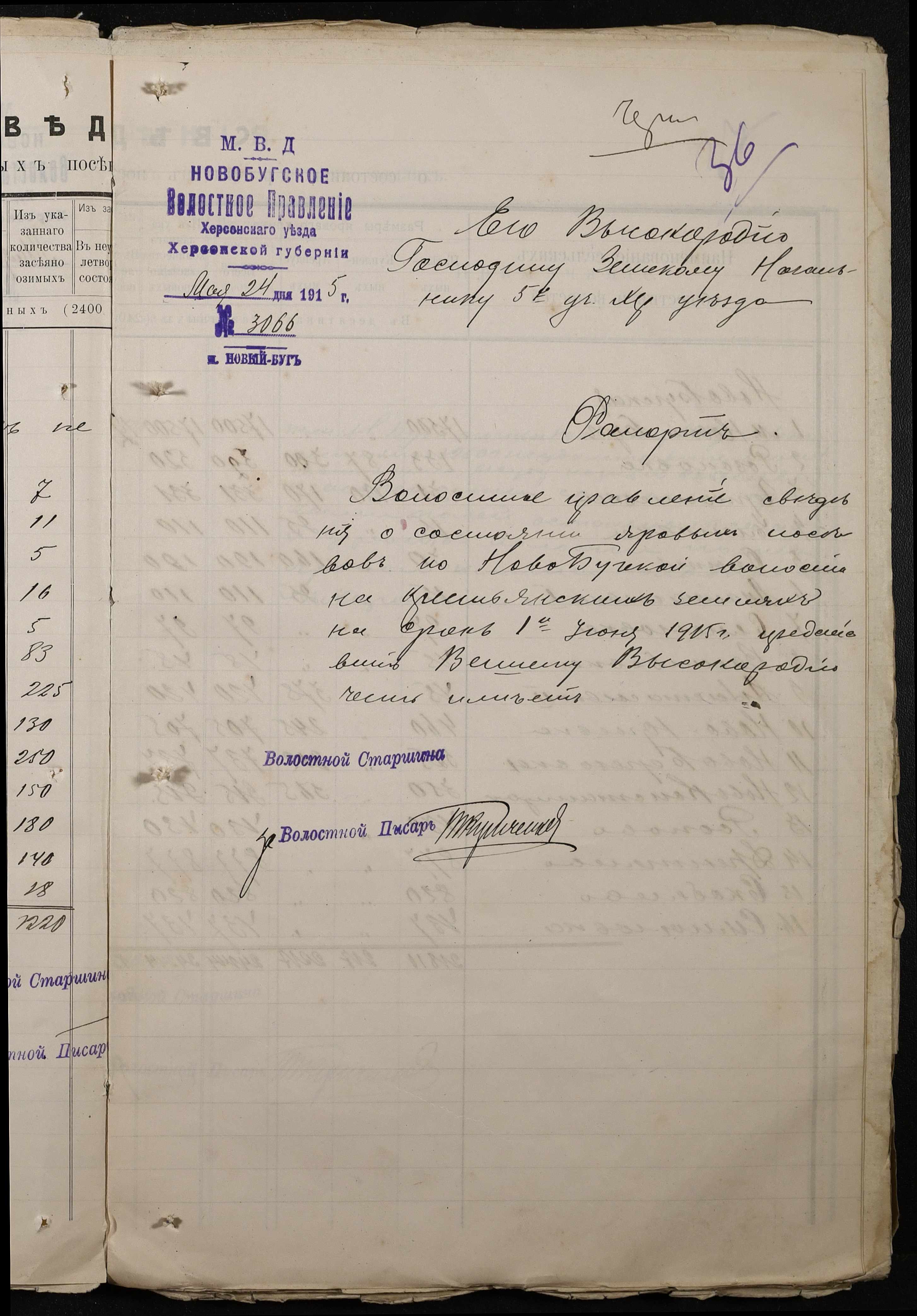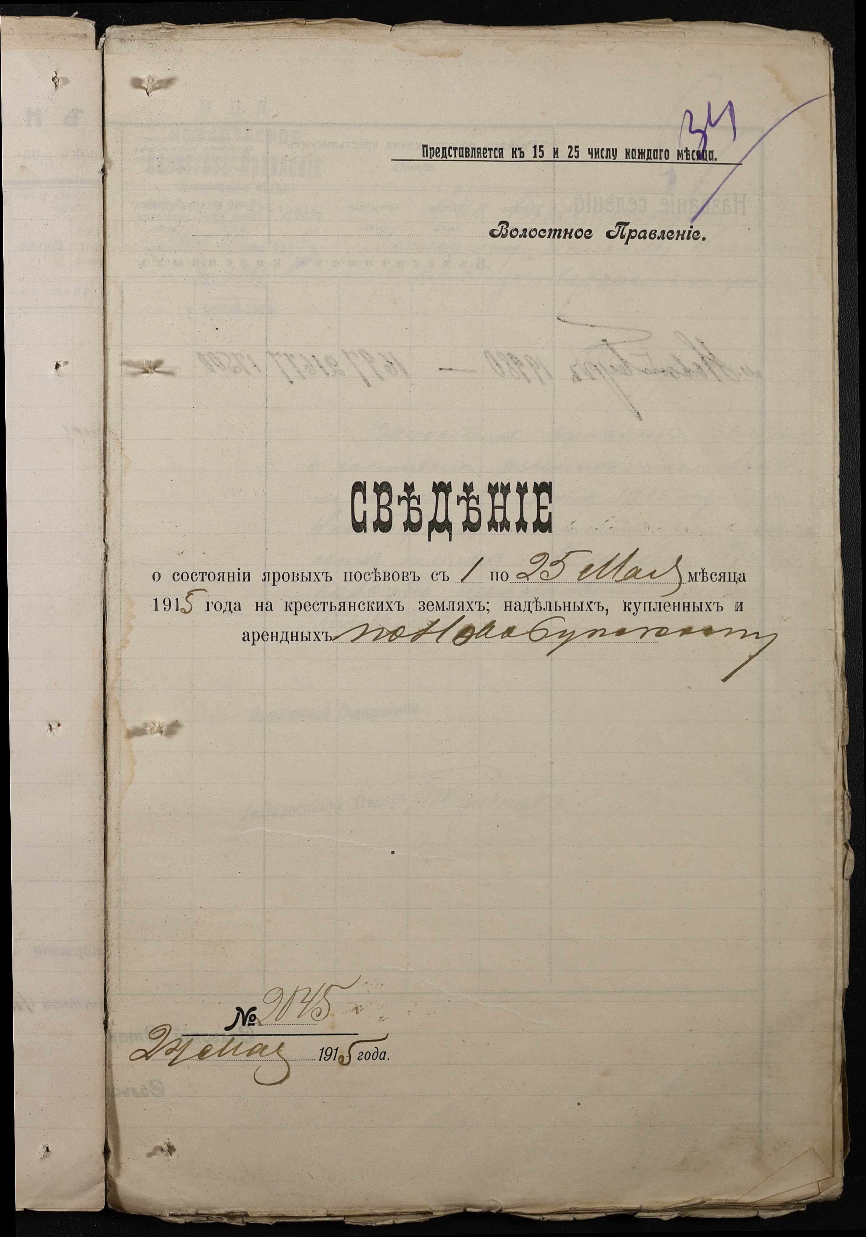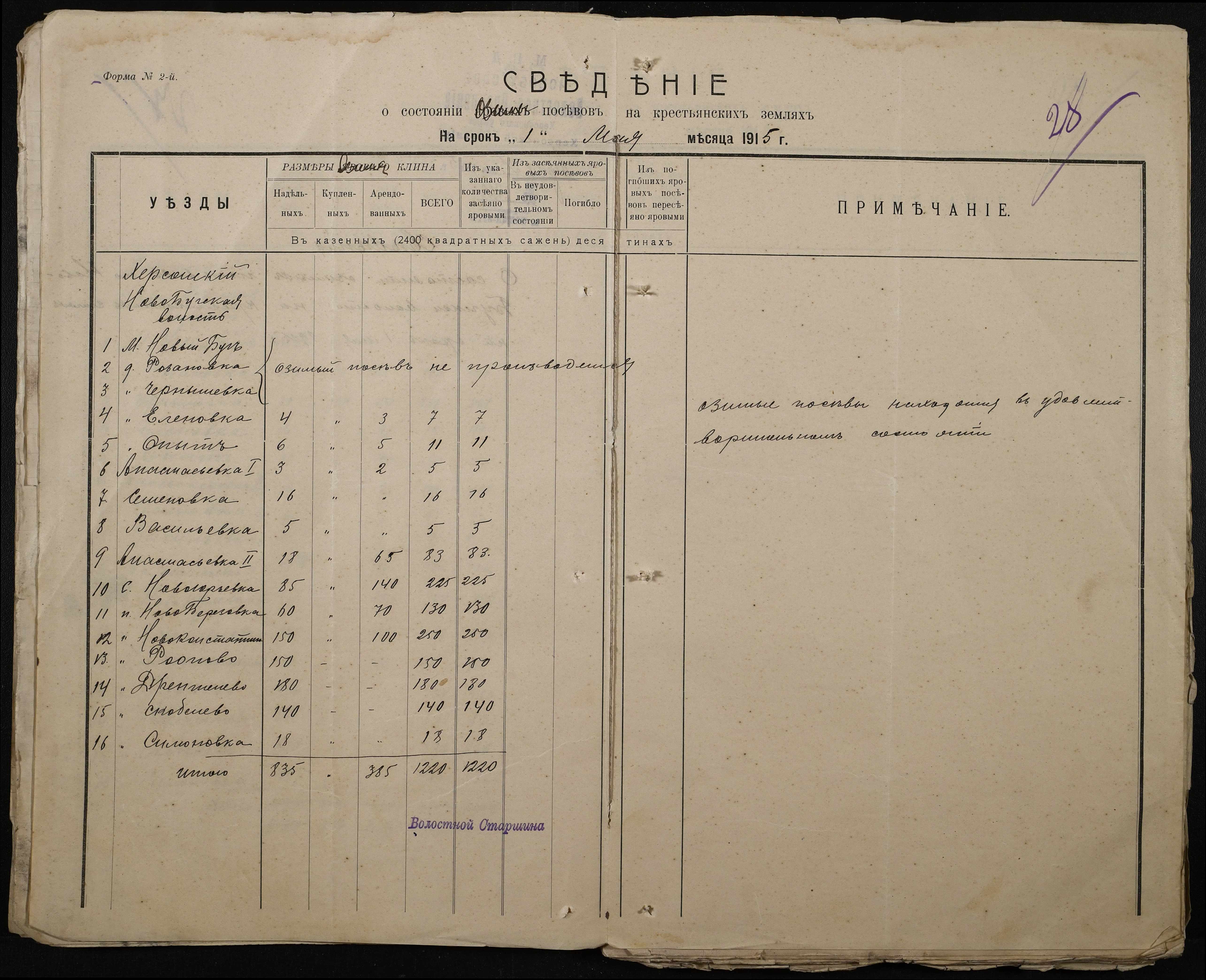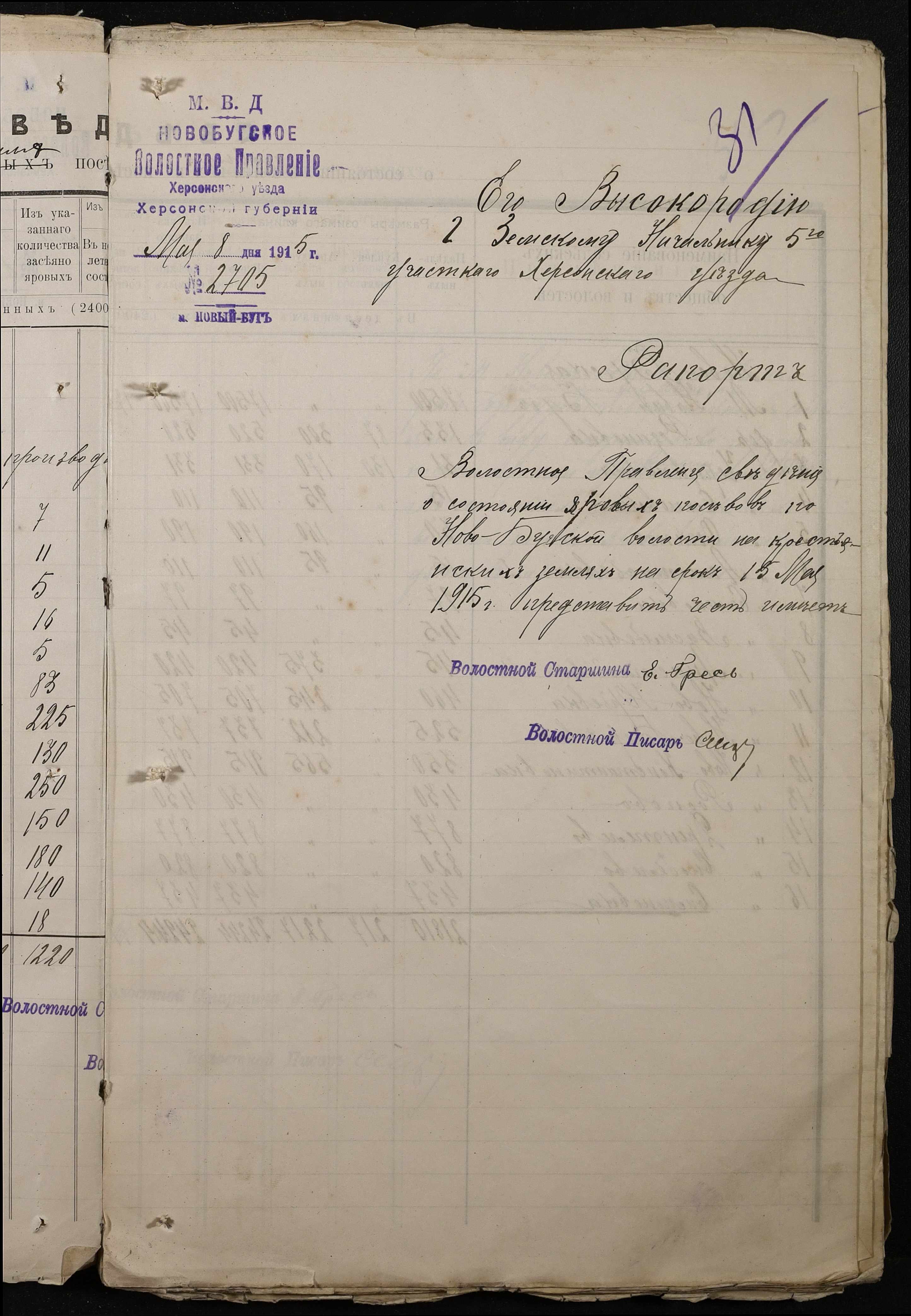 • • • • Справа № 220 “Розпорядження дільничного земського начальника Херсонського повіту та листування з ним про порядок та строки надання відомостей про стан землеробства у волості, відомості про стан селянських озимих та ярих культур, посівних трав у 1915 році”