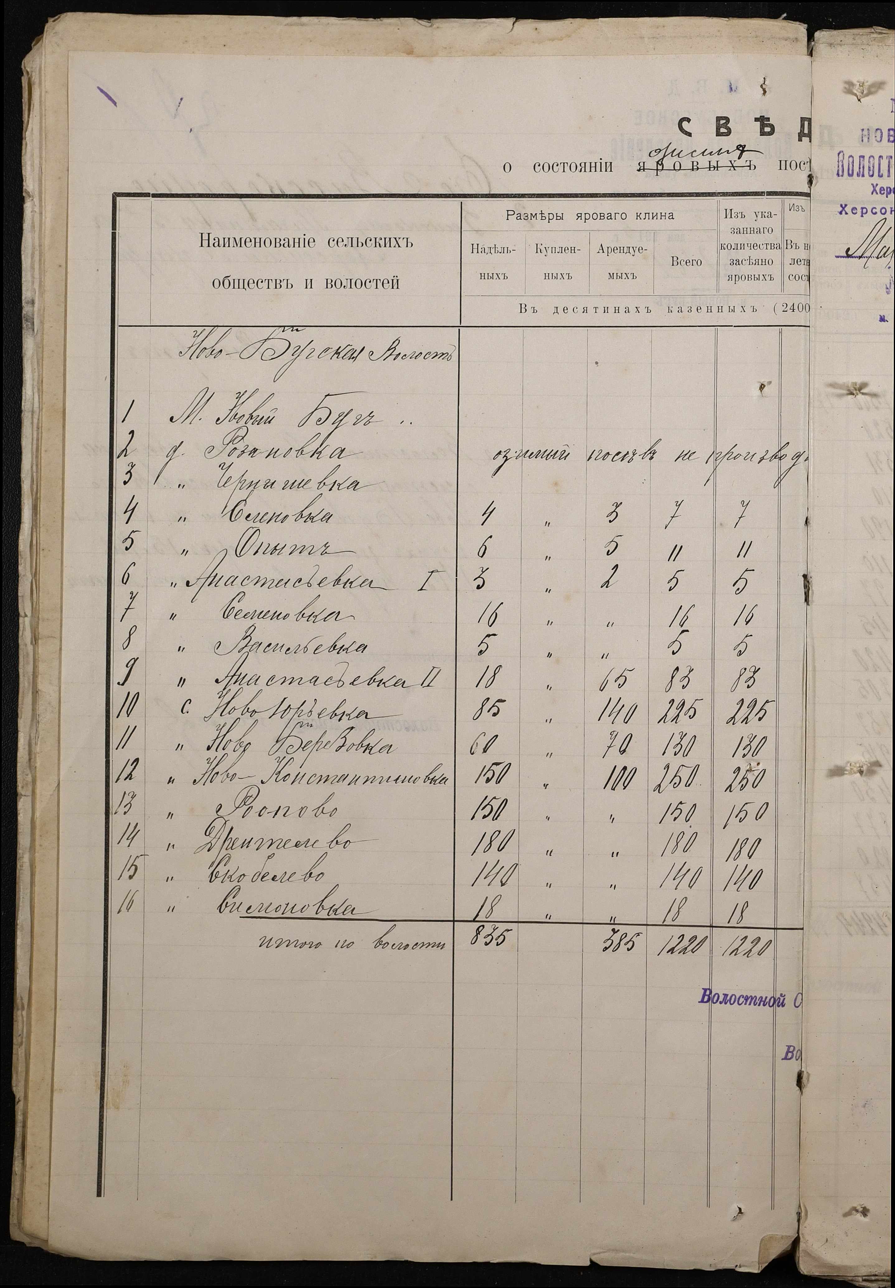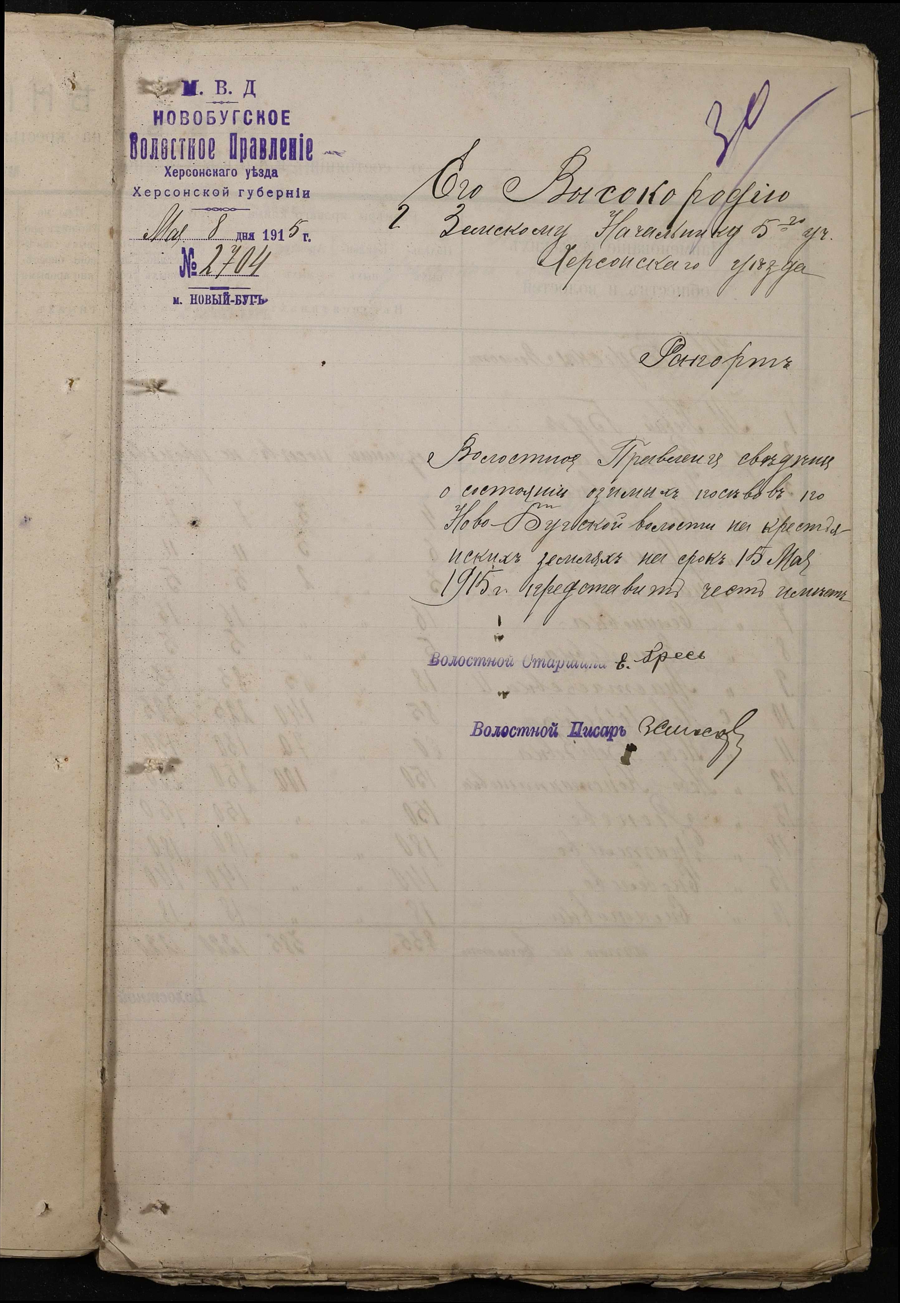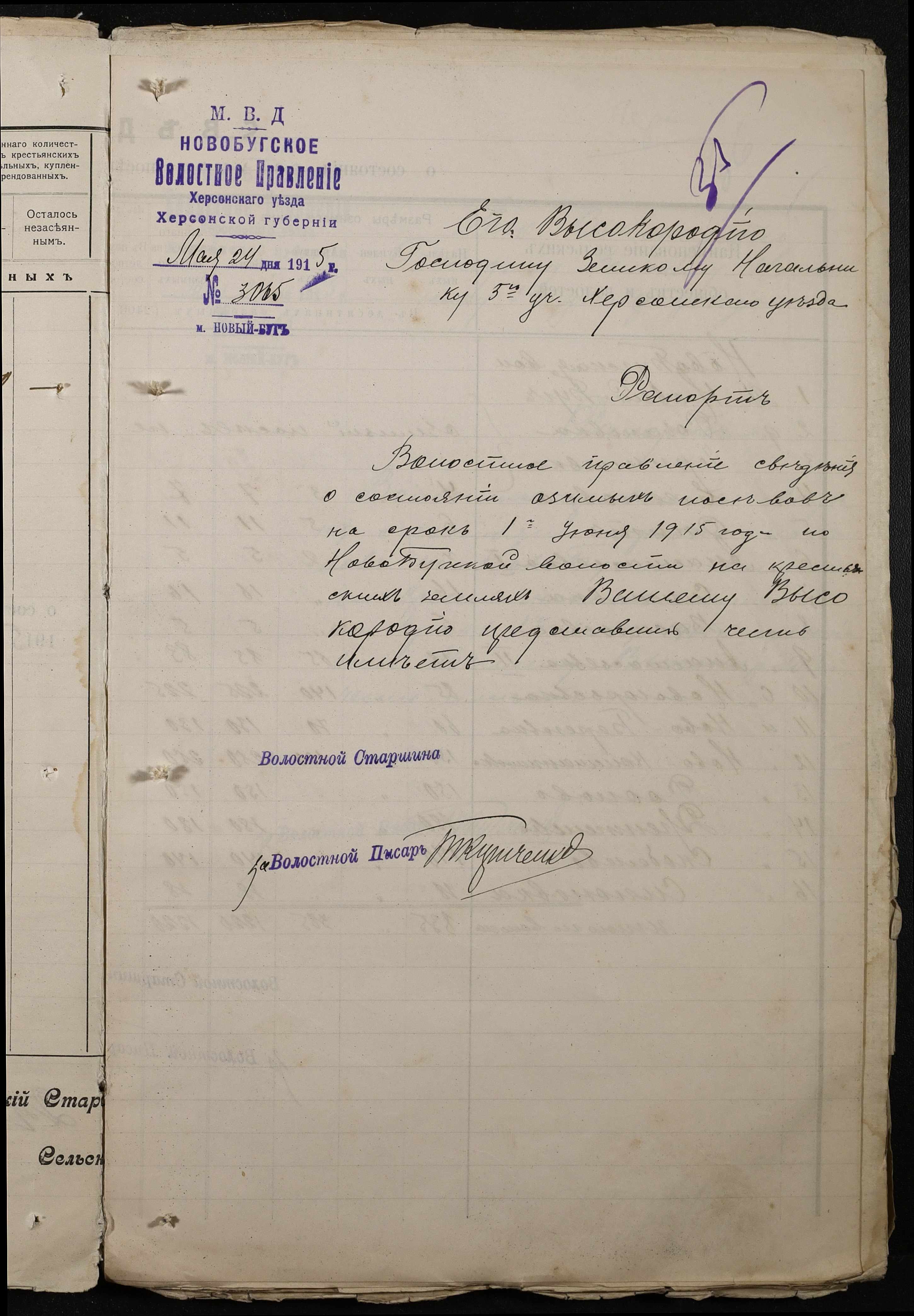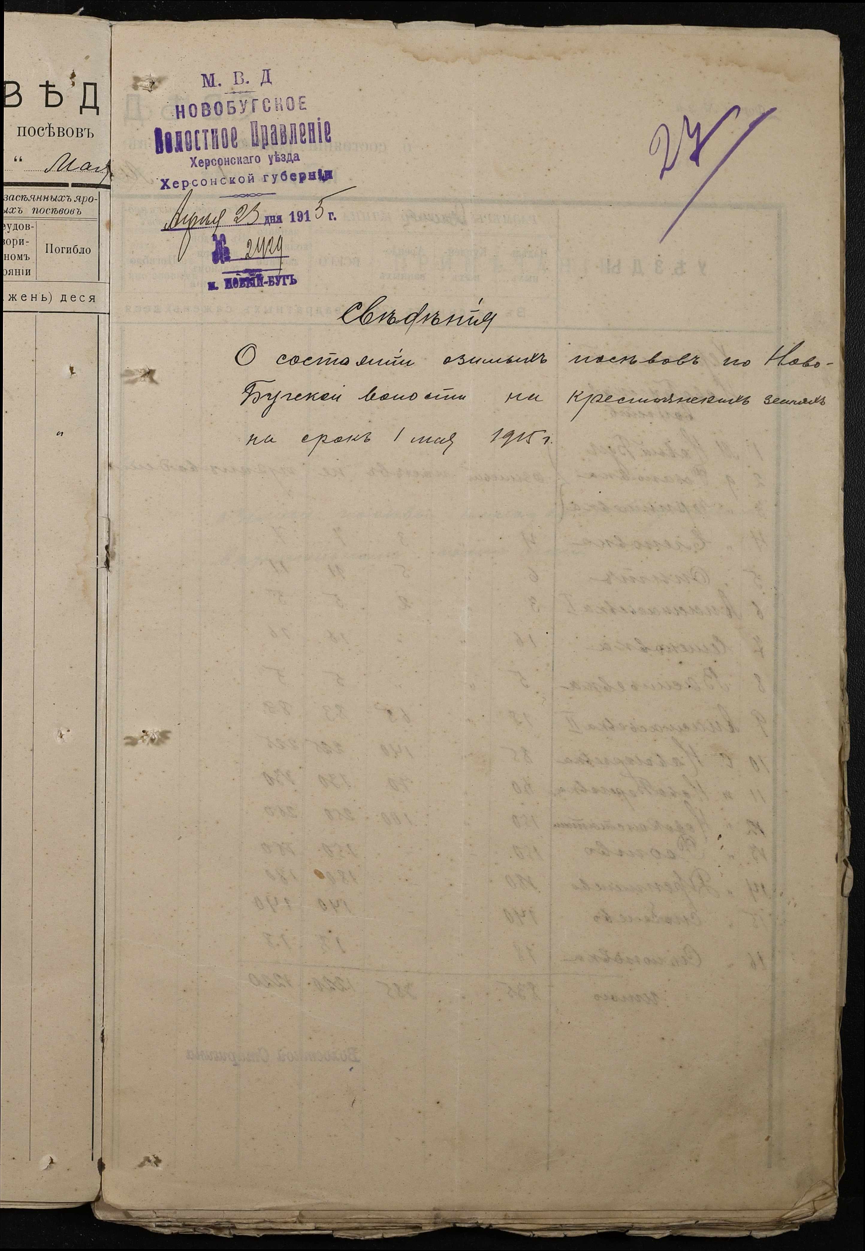 • • • • Справа № 220 “Розпорядження дільничного земського начальника Херсонського повіту та листування з ним про порядок та строки надання відомостей про стан землеробства у волості, відомості про стан селянських озимих та ярих культур, посівних трав у 1915 році”