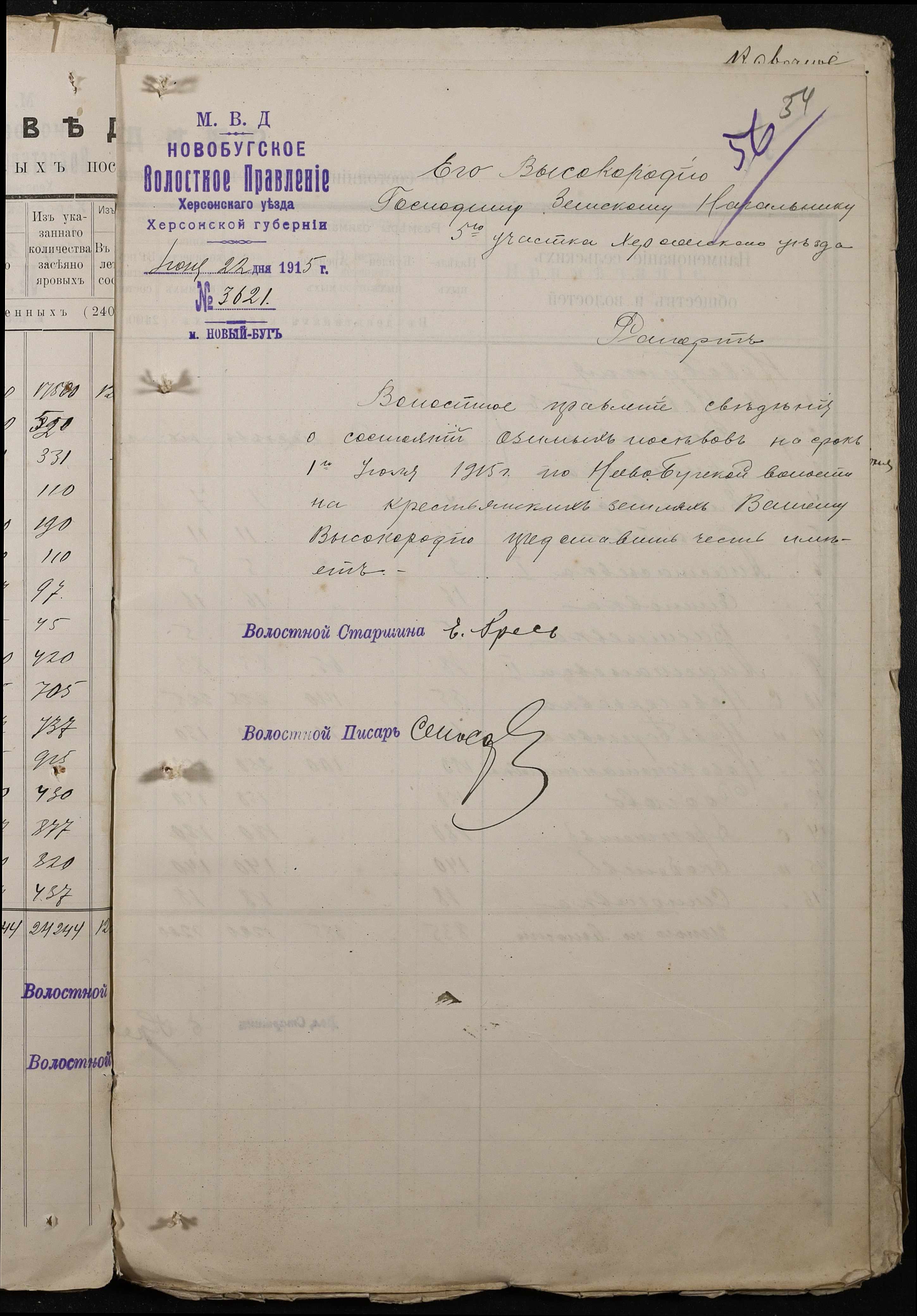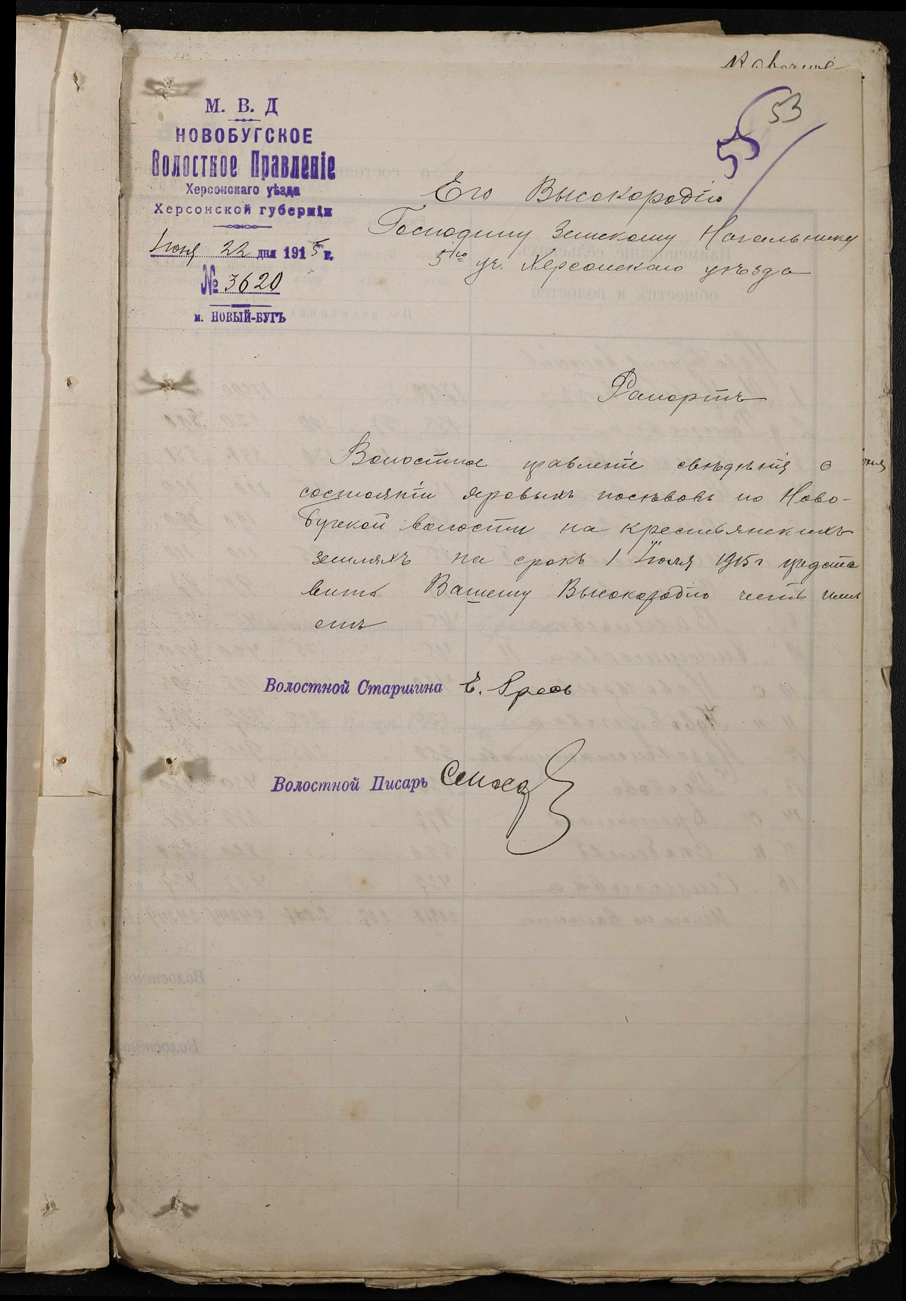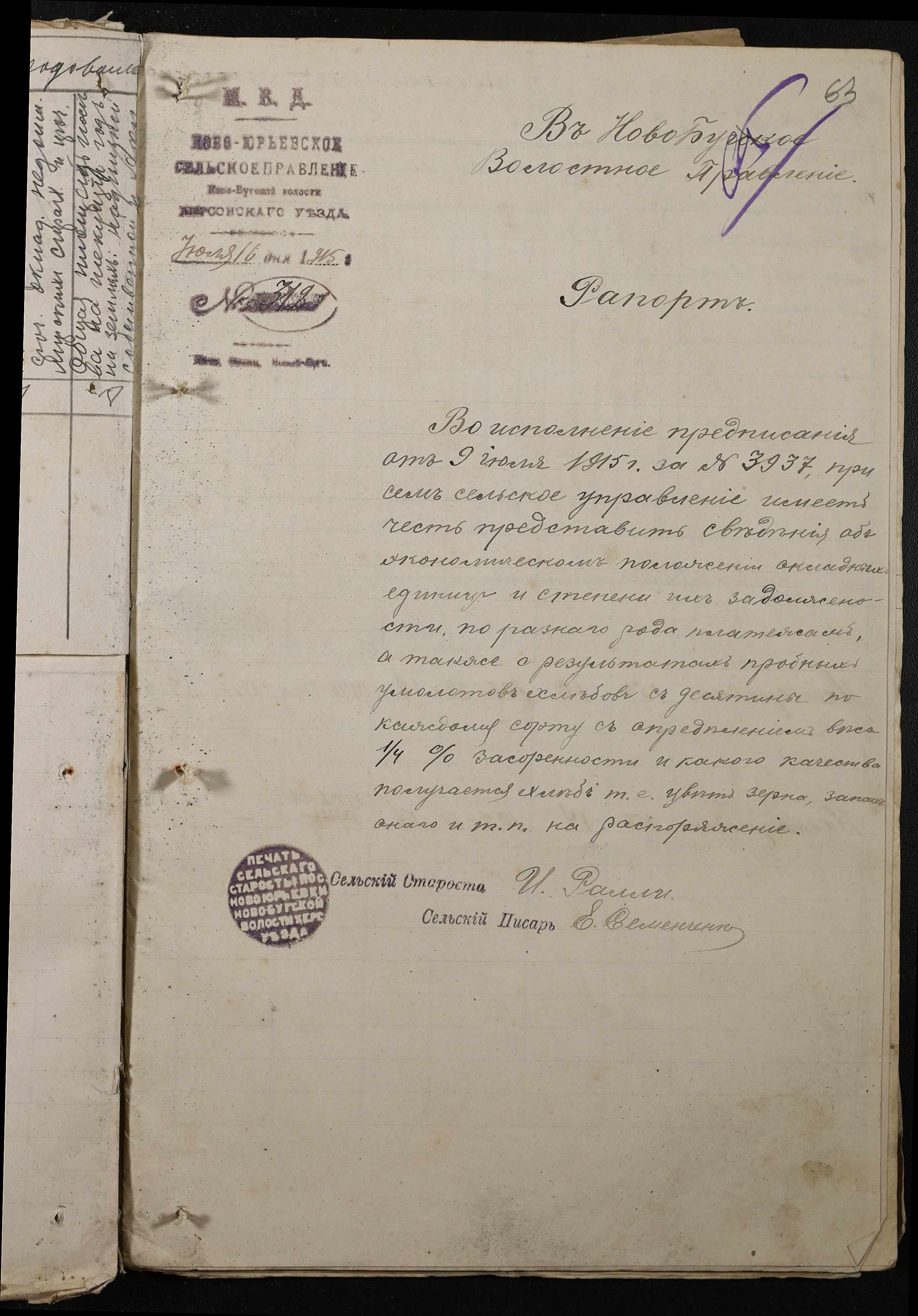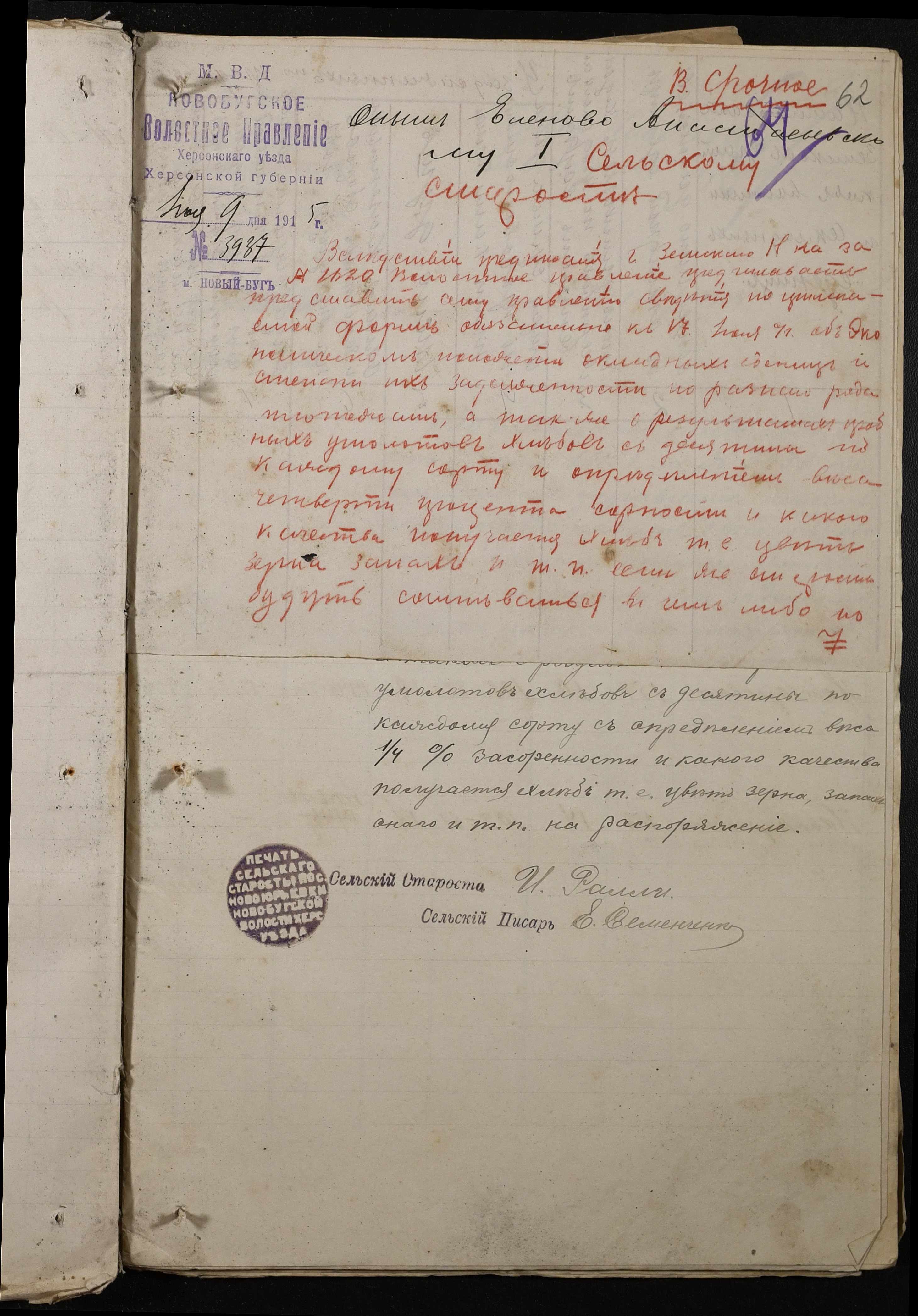 • • • • Справа № 220 “Розпорядження дільничного земського начальника Херсонського повіту та листування з ним про порядок та строки надання відомостей про стан землеробства у волості, відомості про стан селянських озимих та ярих культур, посівних трав у 1915 році”