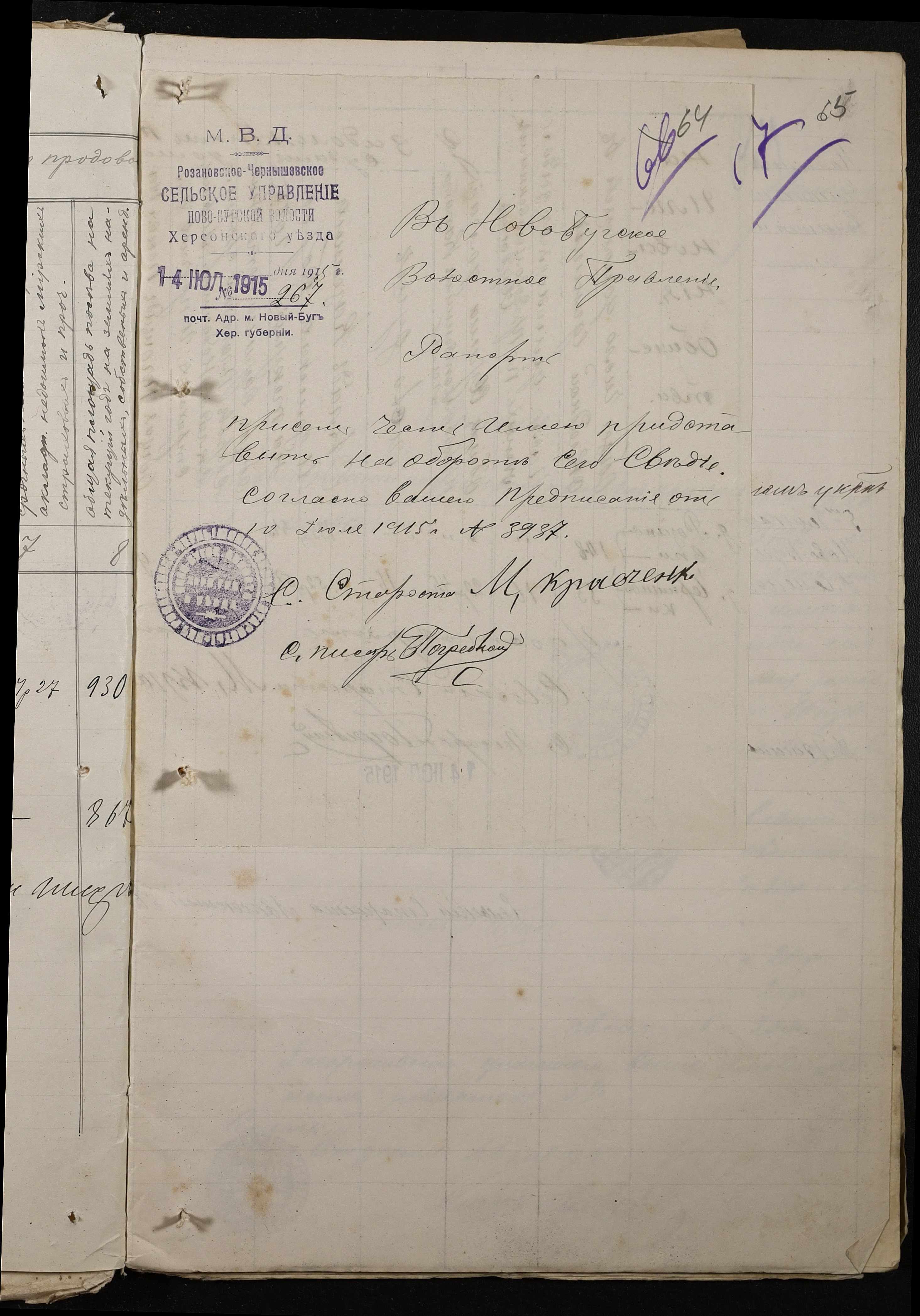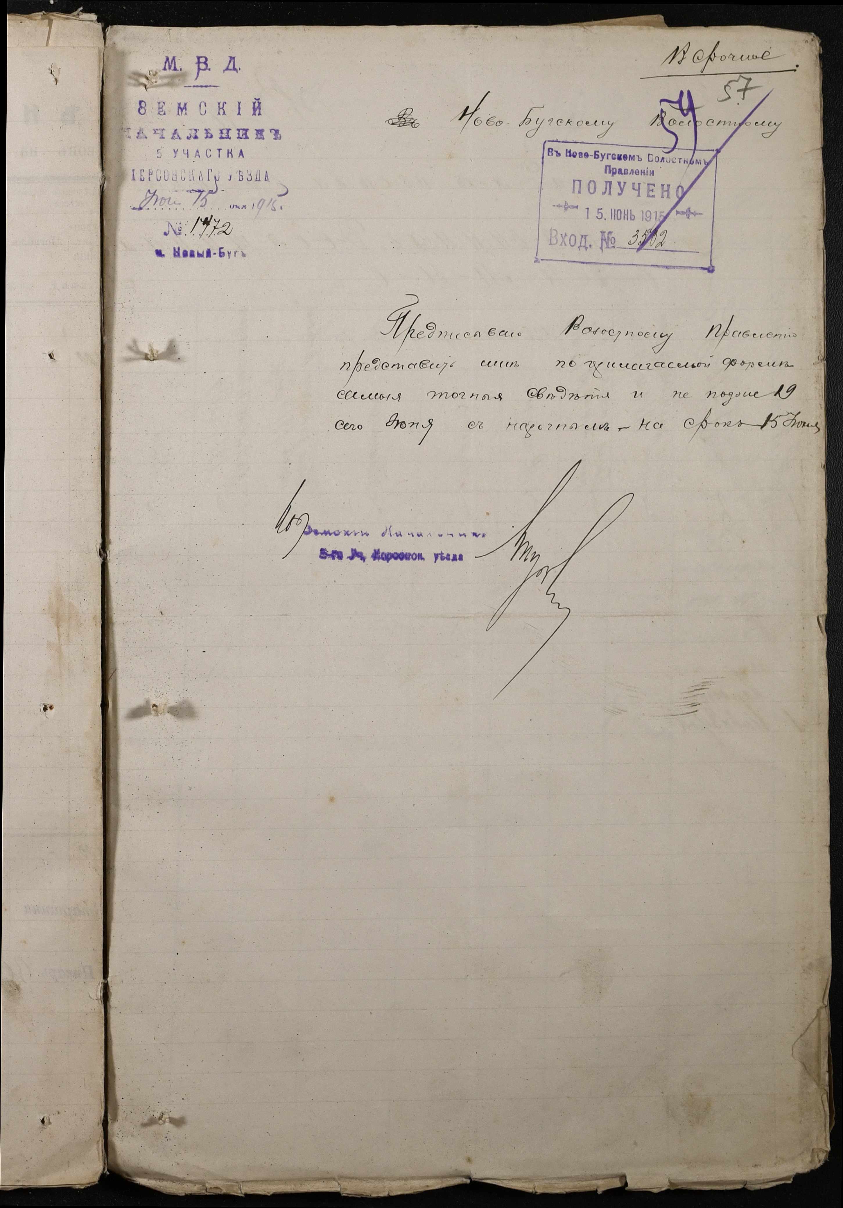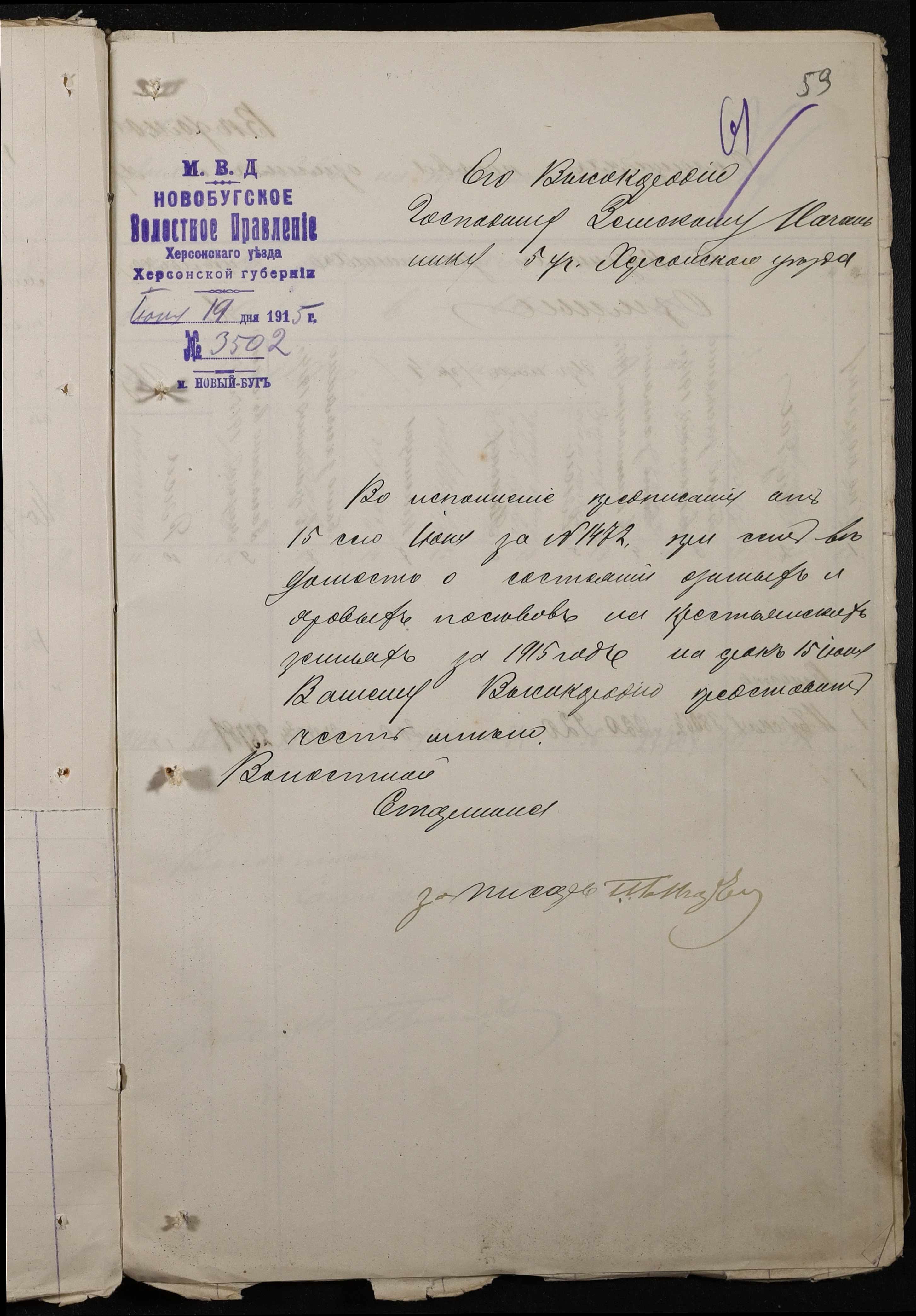 • • • • Справа № 220 “Розпорядження дільничного земського начальника Херсонського повіту та листування з ним про порядок та строки надання відомостей про стан землеробства у волості, відомості про стан селянських озимих та ярих культур, посівних трав у 1915 році”