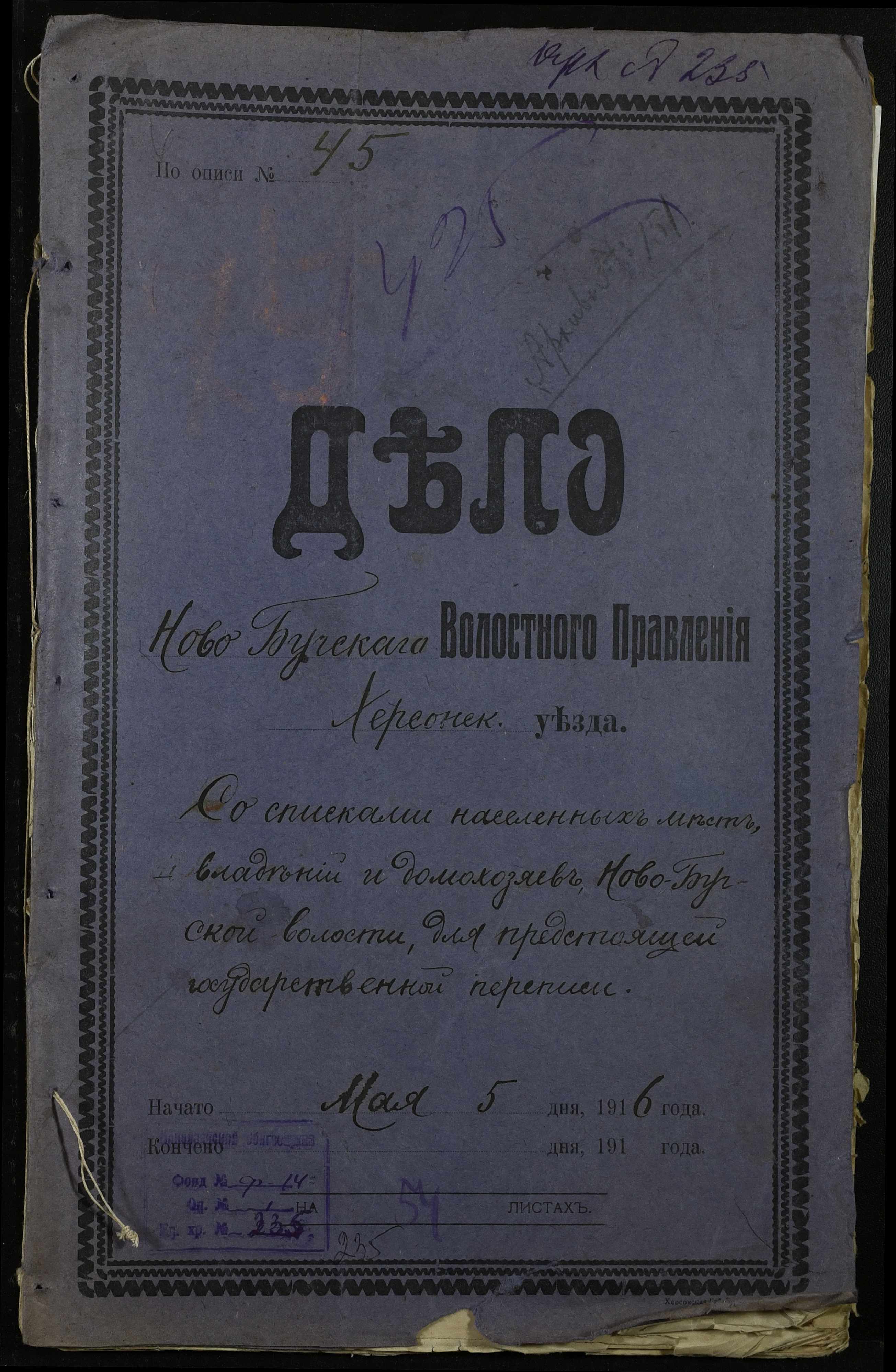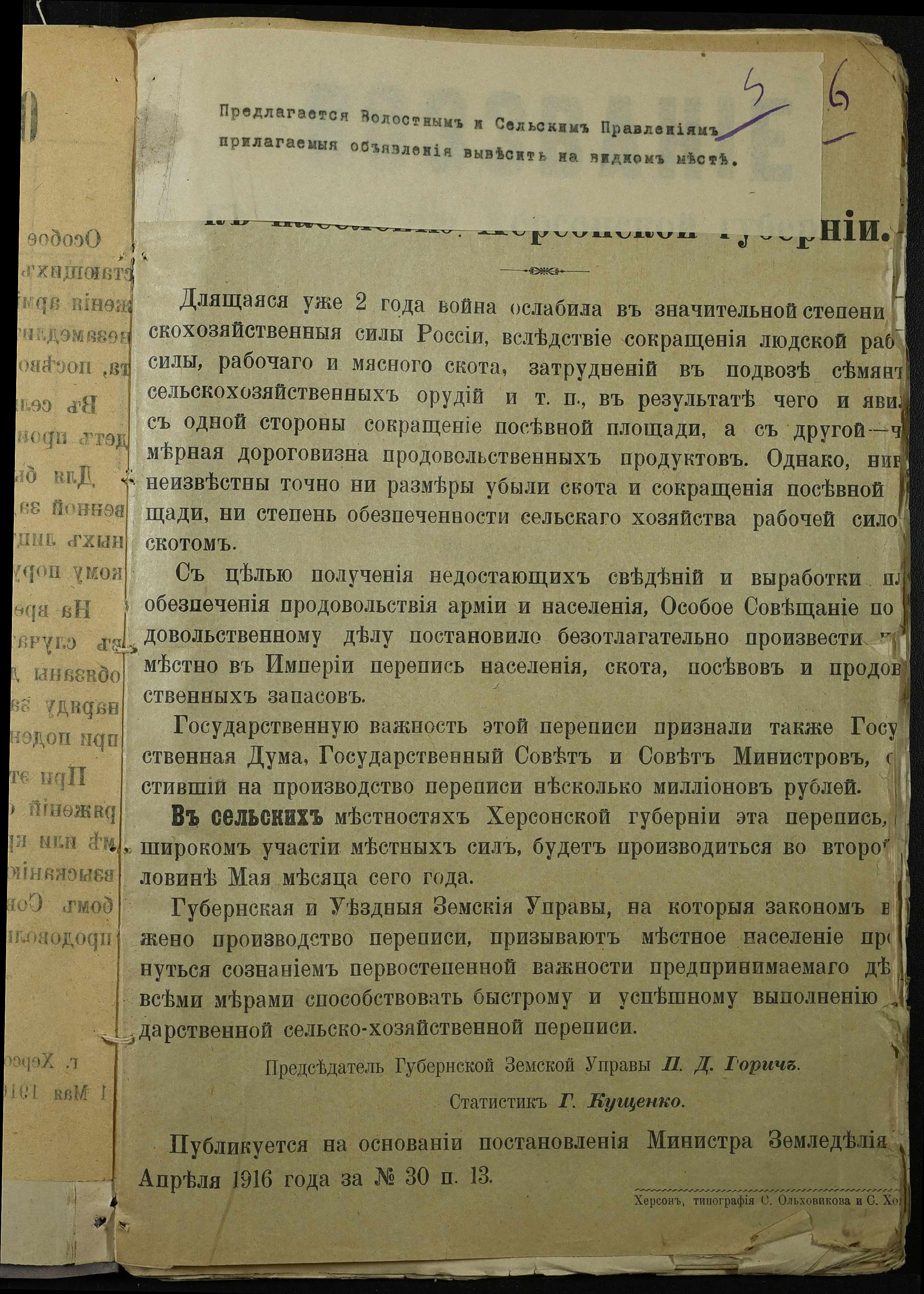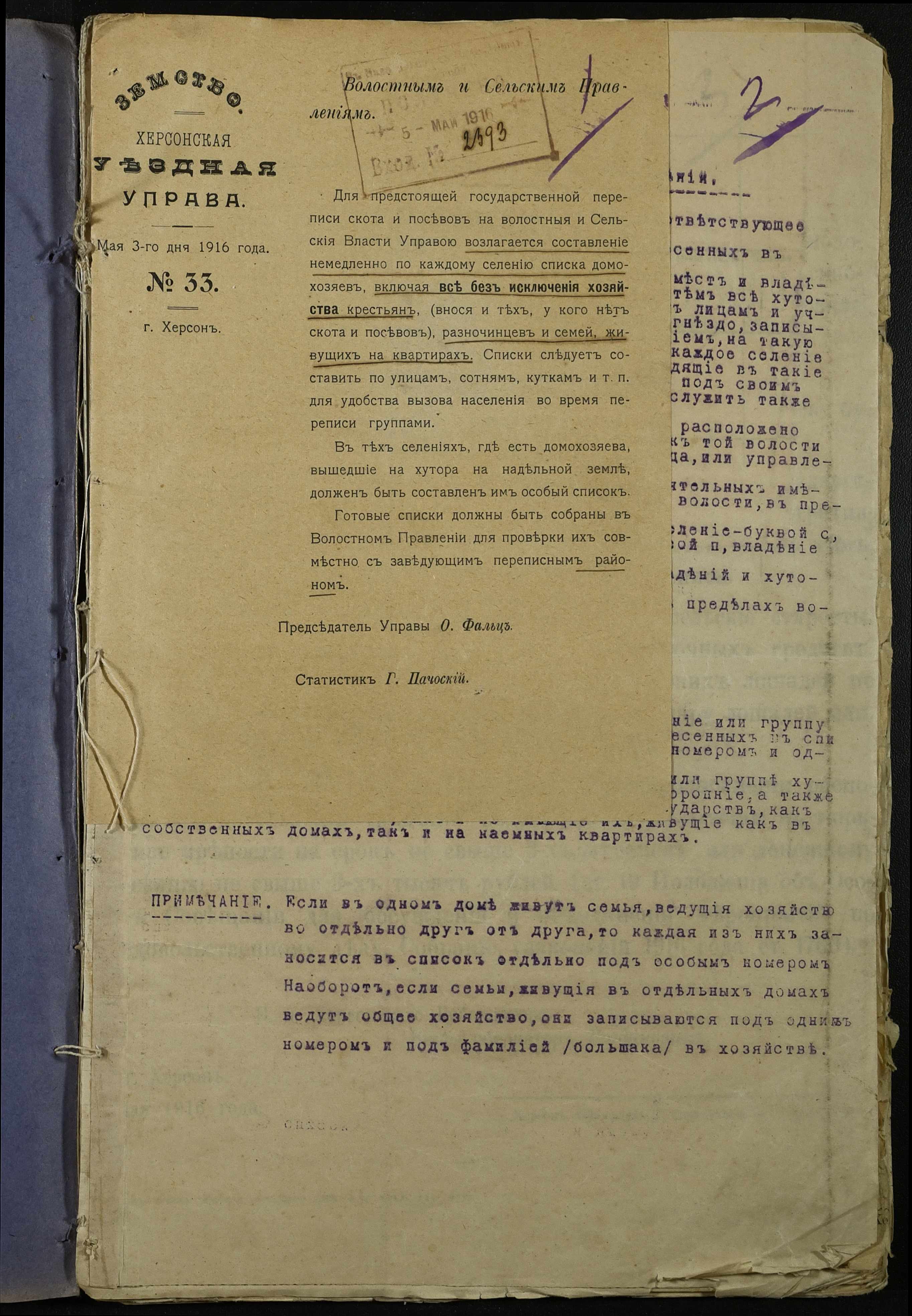 • • • • Справа № 235 “Звернення Херсонського губернатора та розпорядження Херсонської повітової управи про проведення перепису населення, худоби, посівів та продовольчих запасів, списки домогосподарств сільських товариств волості станом на 10 травня 1916 року”