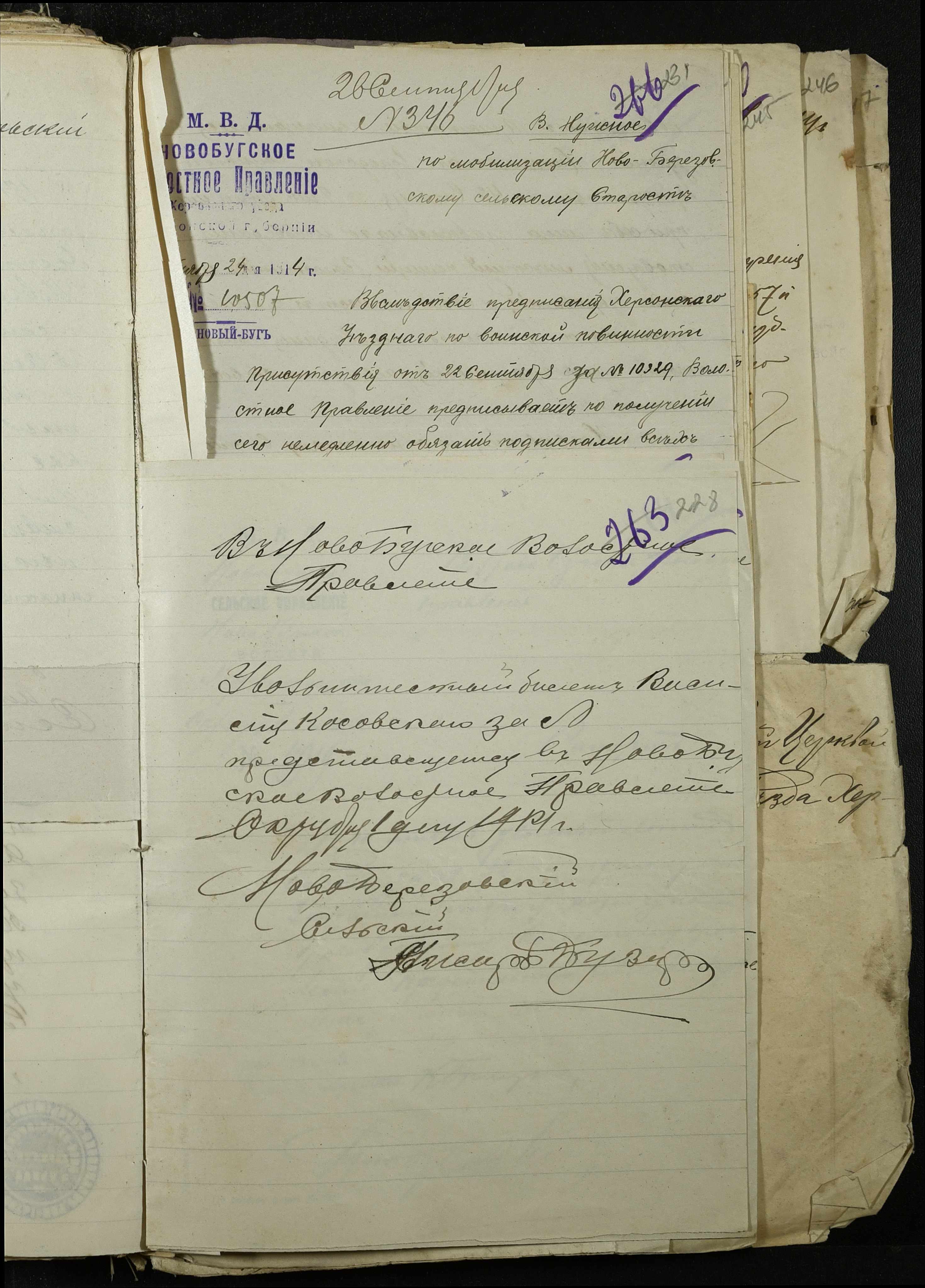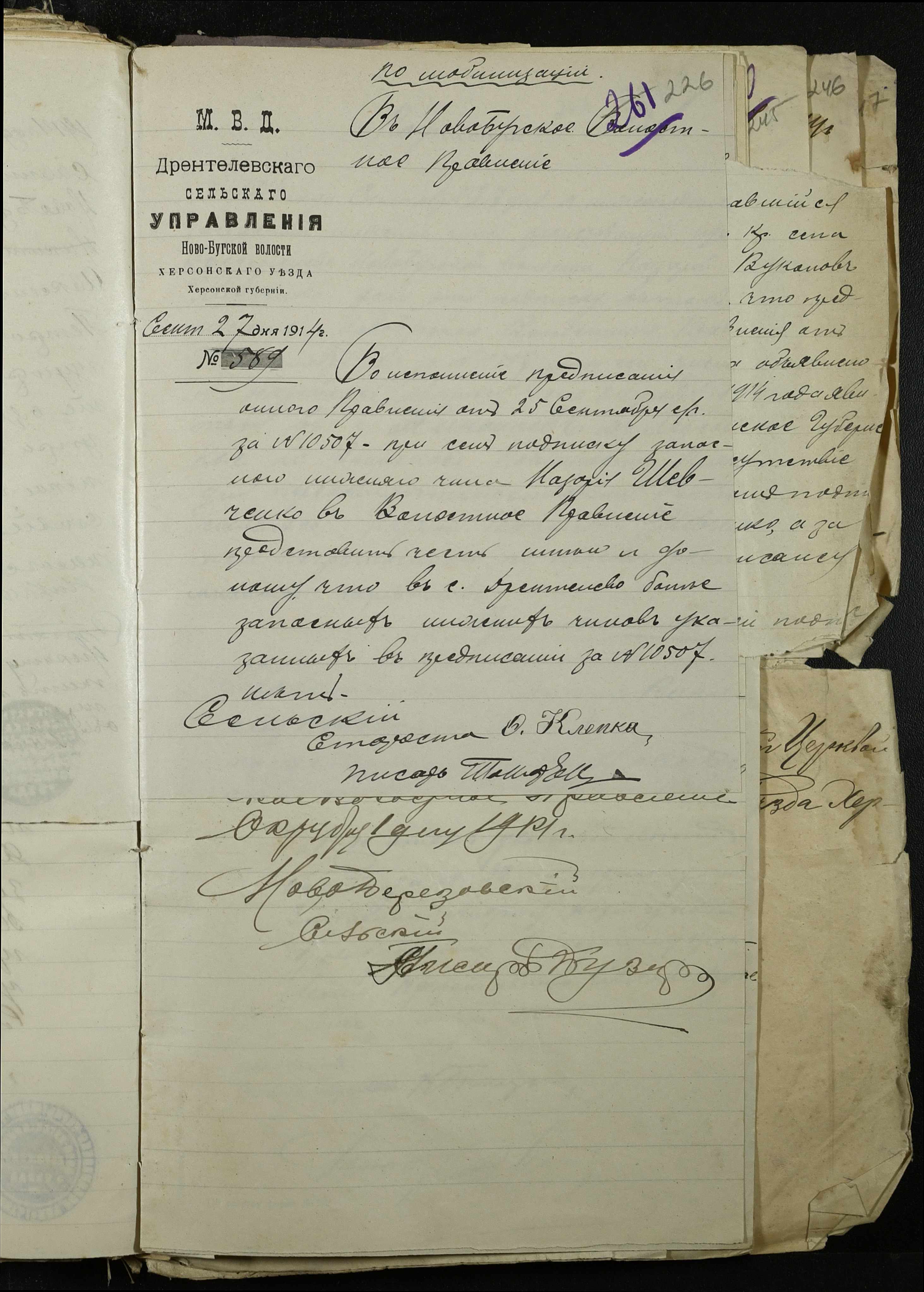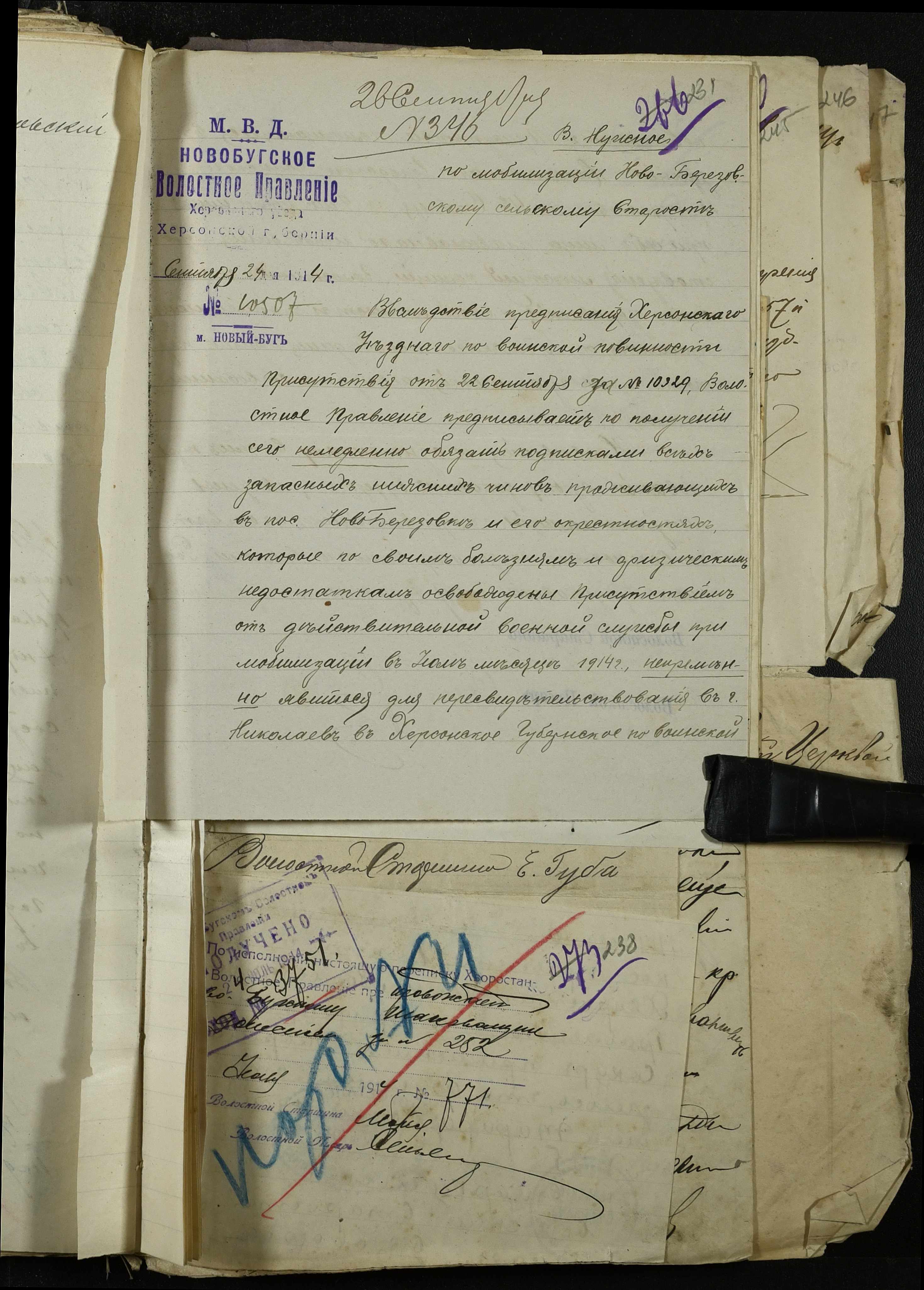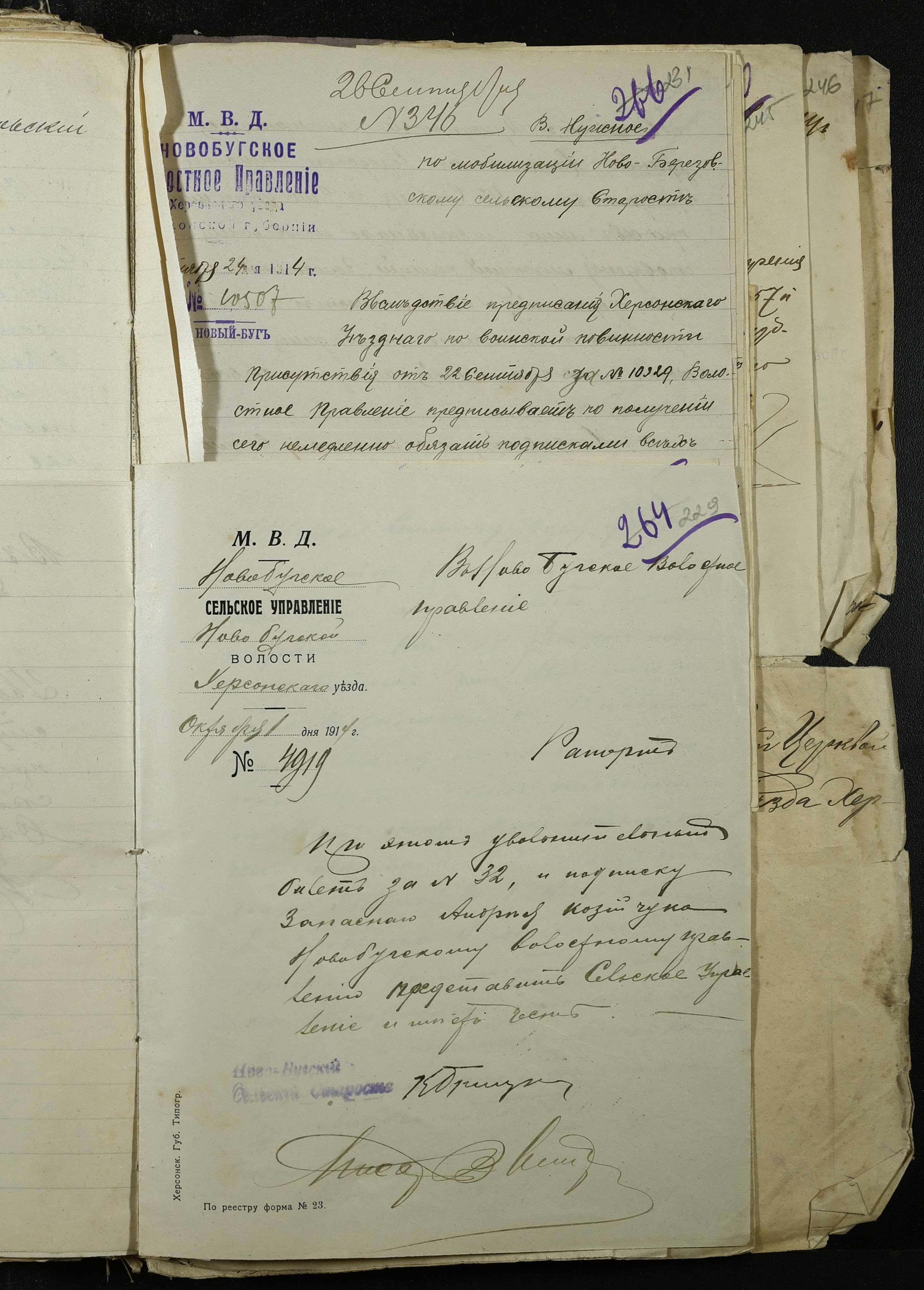 • • • • Справа № 236 “Розпорядження Херсонського повітового з військової повинності присутствія та листування з ним про порядок обліку військовозобов’язаних осіб, рапорти сільських старост, посімейні списки мобілізованих ратників, витяги з метричних книг про народження військово-зобов’язаних, присуди сільських сходів про затвердження списків осіб, покликаних в армію у 1914 році”