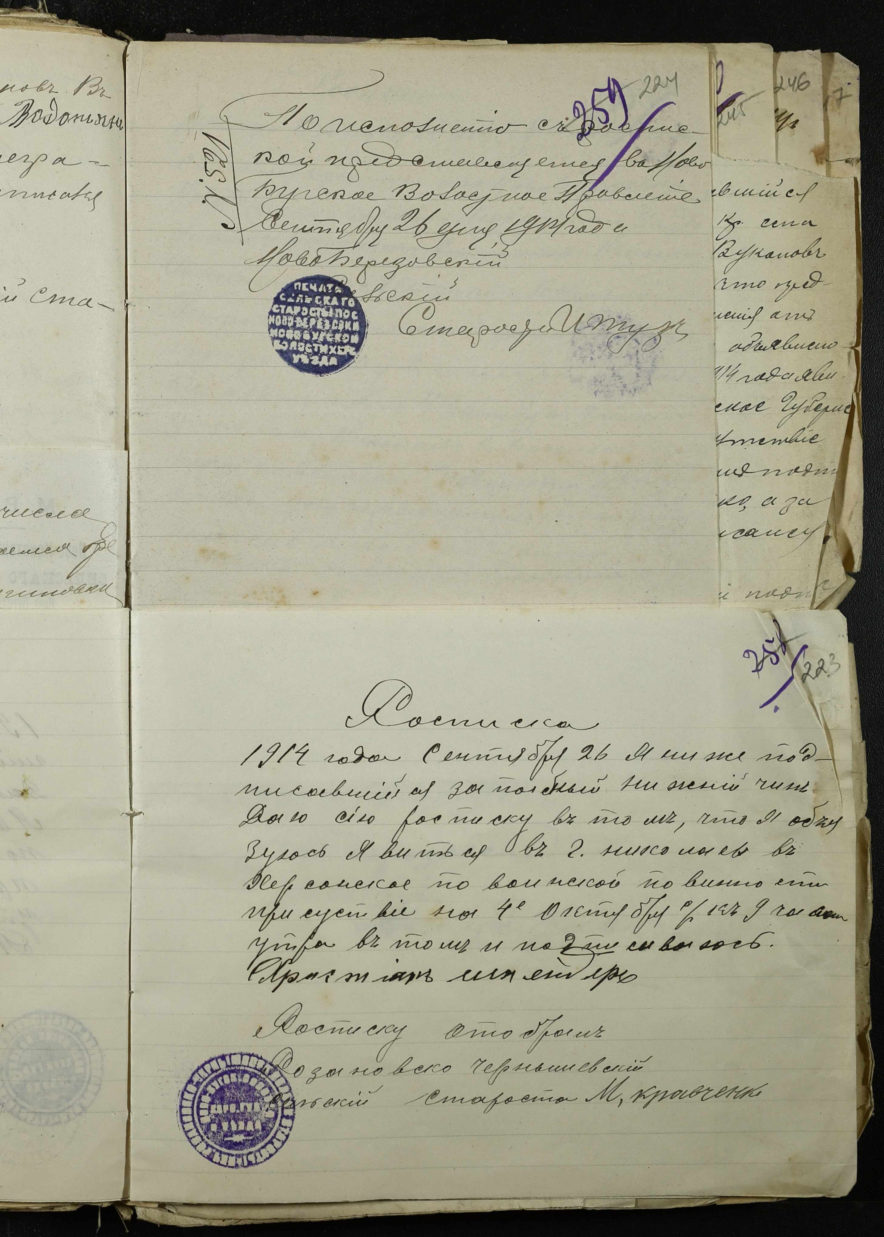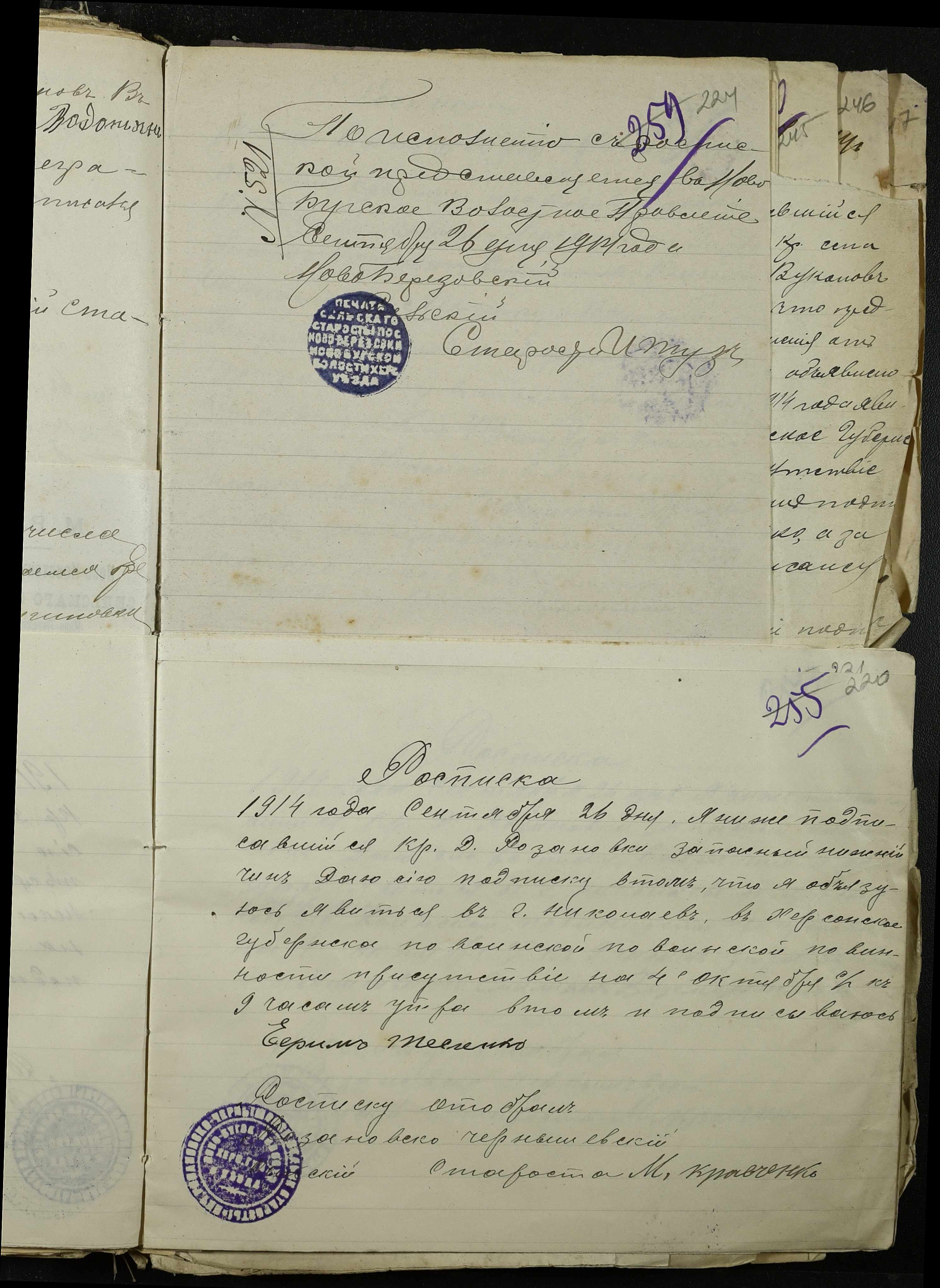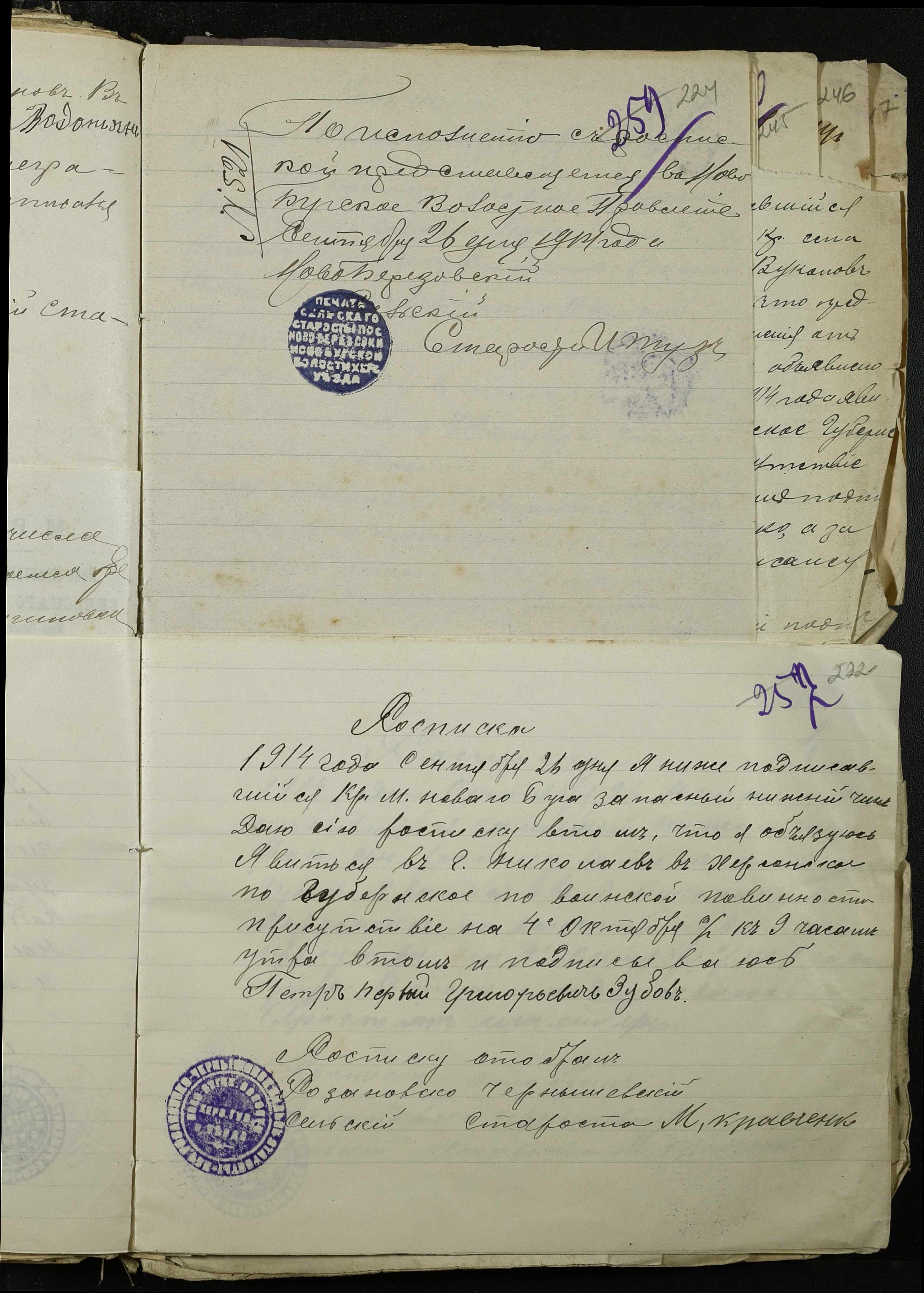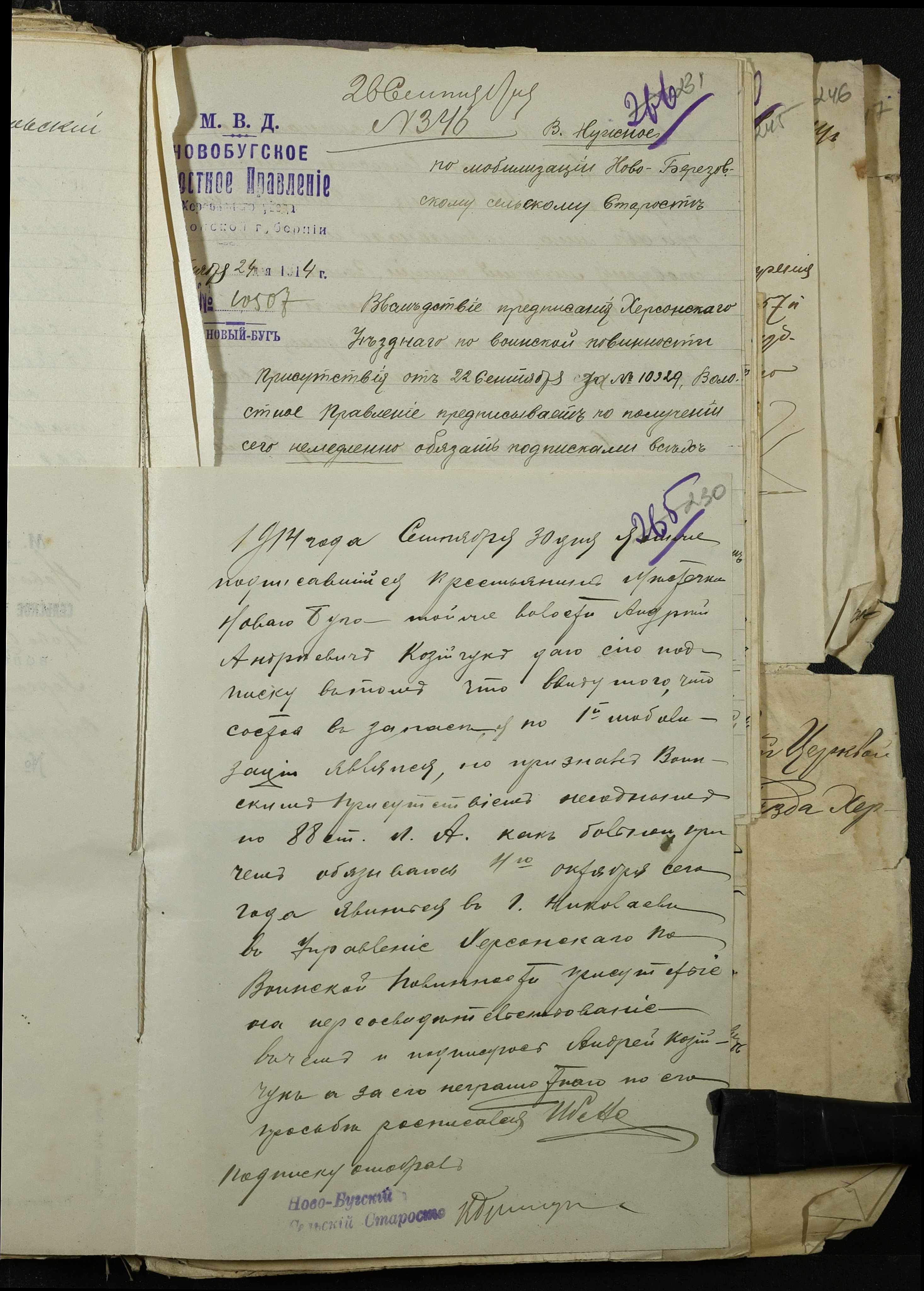 • • • • Справа № 236 “Розпорядження Херсонського повітового з військової повинності присутствія та листування з ним про порядок обліку військовозобов’язаних осіб, рапорти сільських старост, посімейні списки мобілізованих ратників, витяги з метричних книг про народження військово-зобов’язаних, присуди сільських сходів про затвердження списків осіб, покликаних в армію у 1914 році”