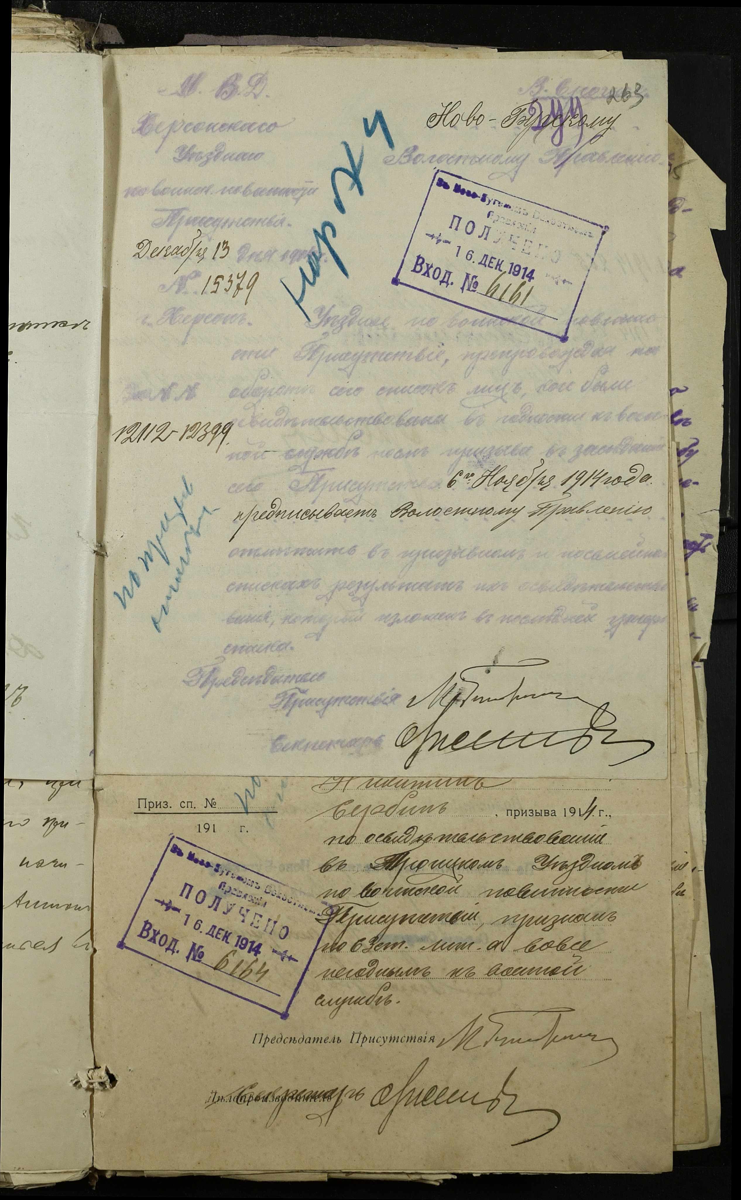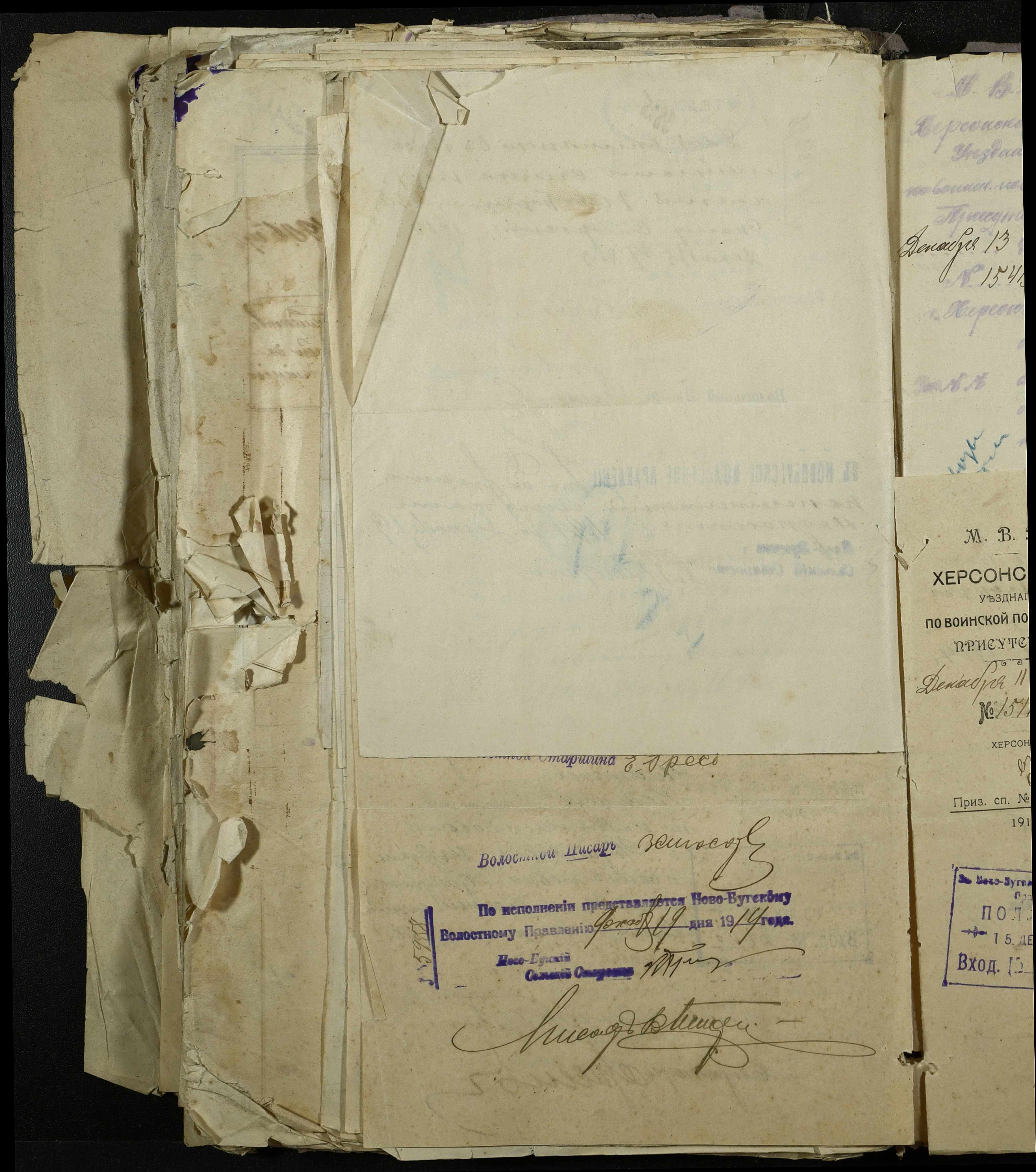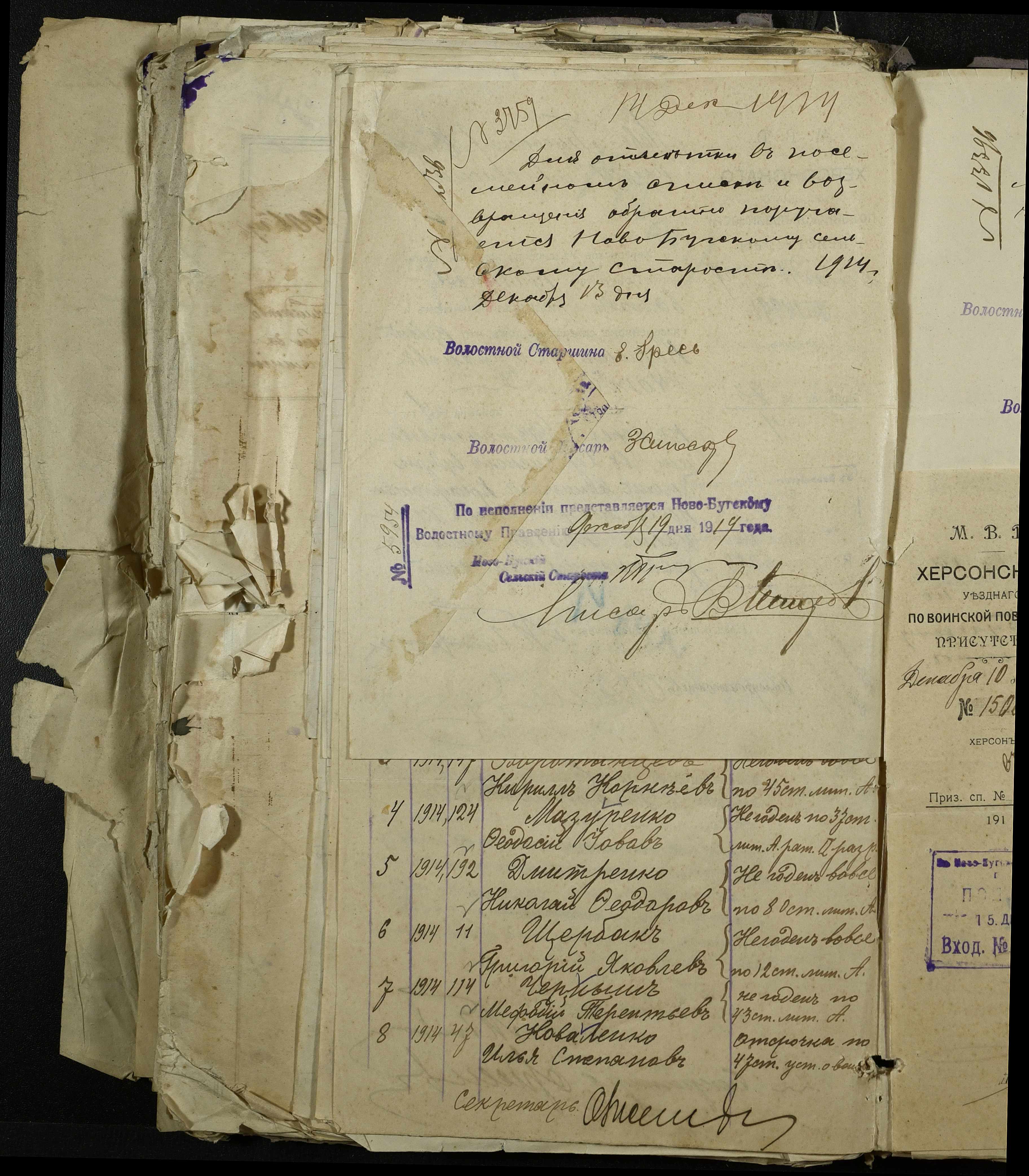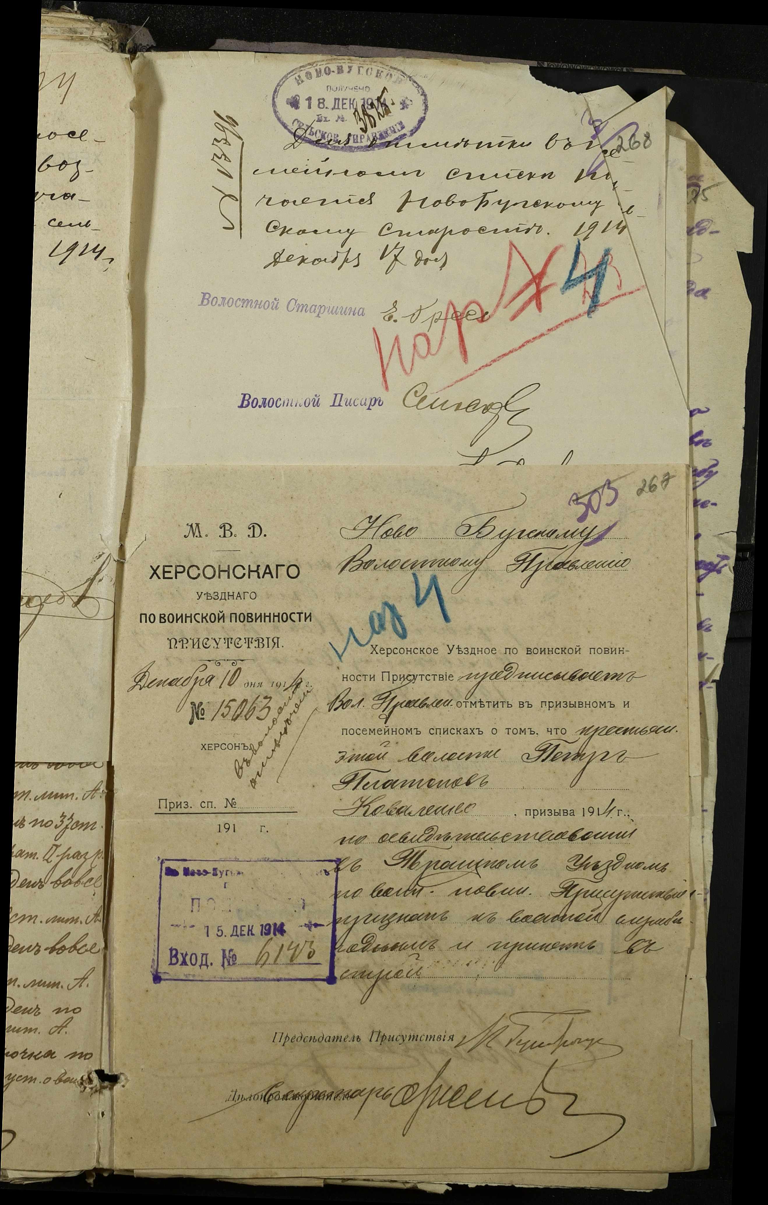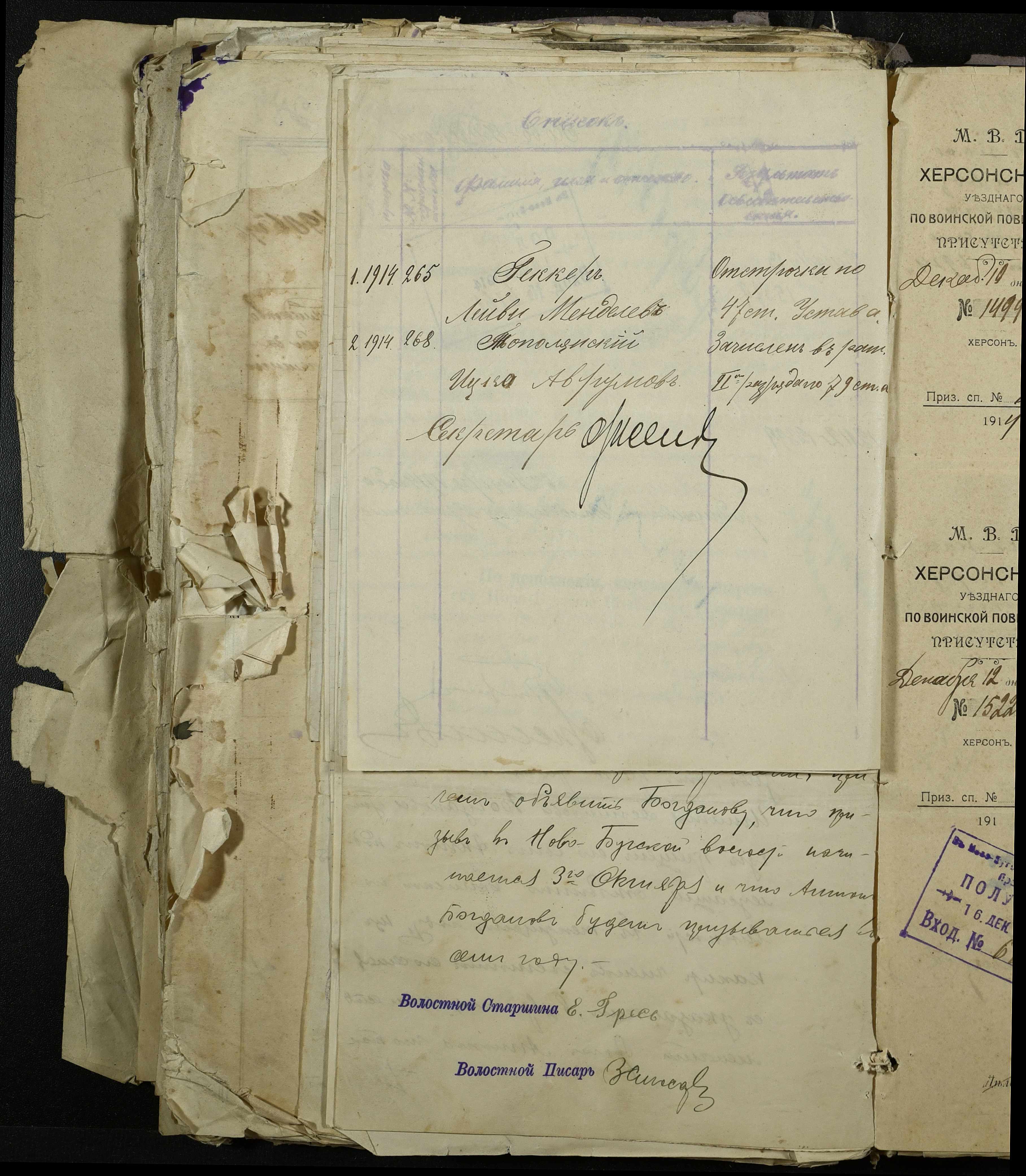 • • • • Справа № 236 “Розпорядження Херсонського повітового з військової повинності присутствія та листування з ним про порядок обліку військовозобов’язаних осіб, рапорти сільських старост, посімейні списки мобілізованих ратників, витяги з метричних книг про народження військово-зобов’язаних, присуди сільських сходів про затвердження списків осіб, покликаних в армію у 1914 році”