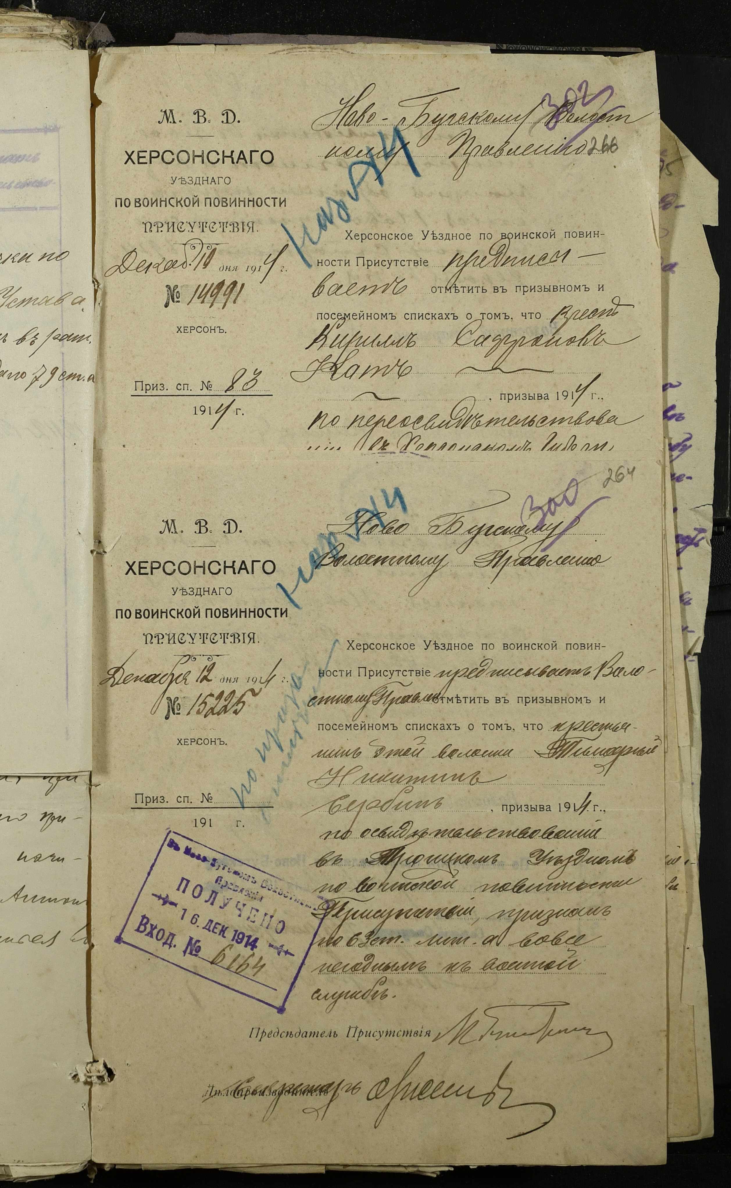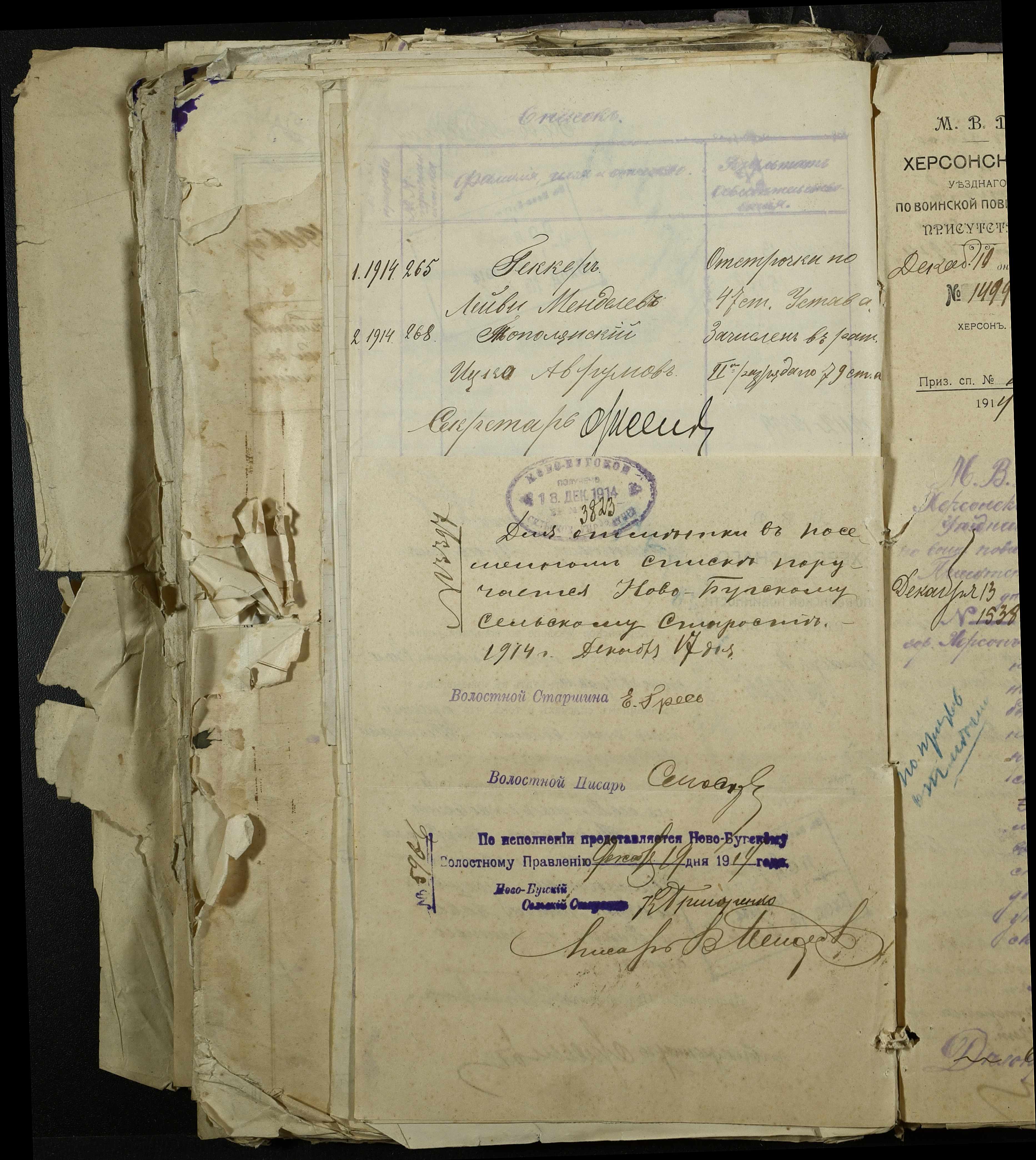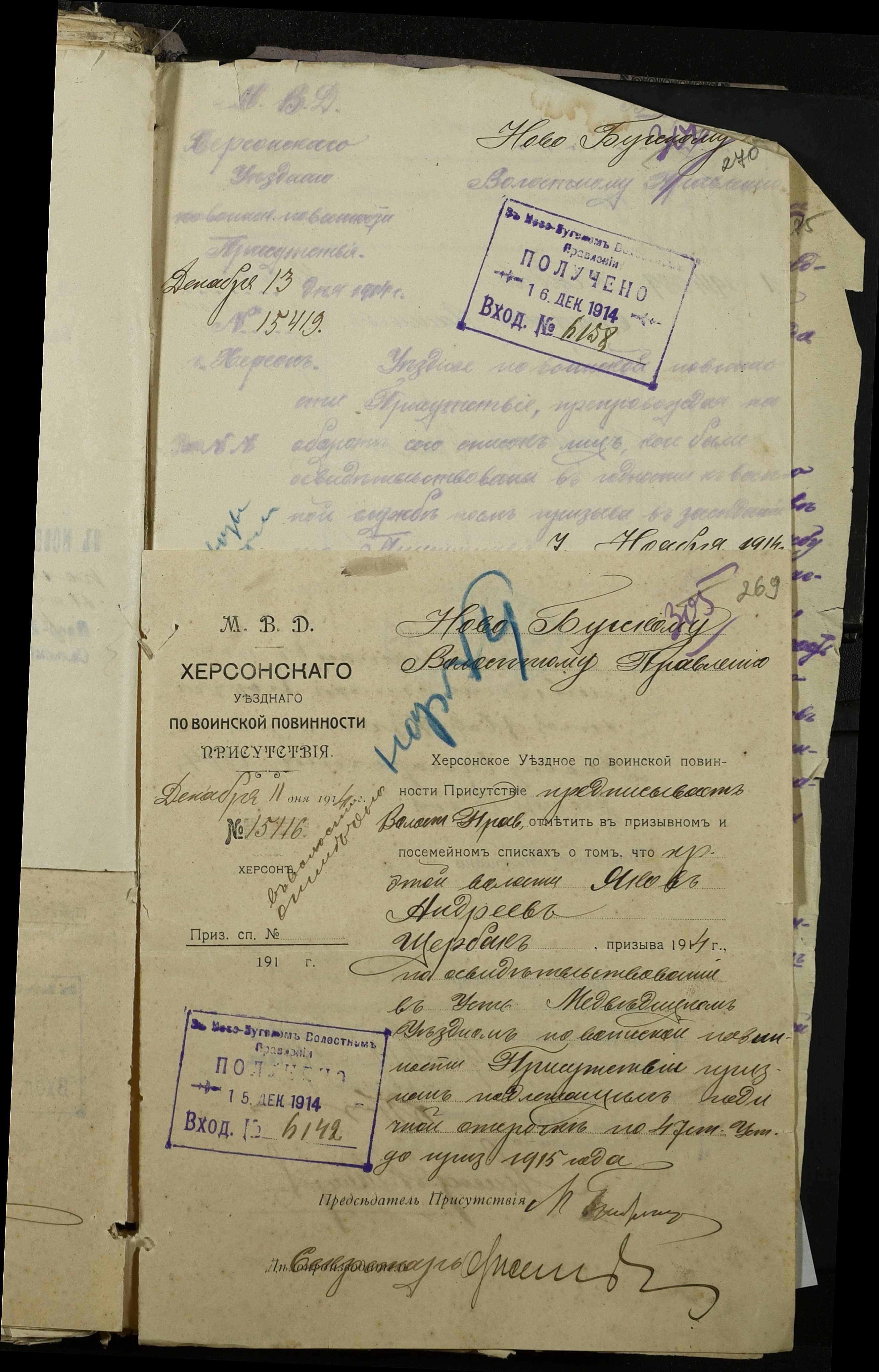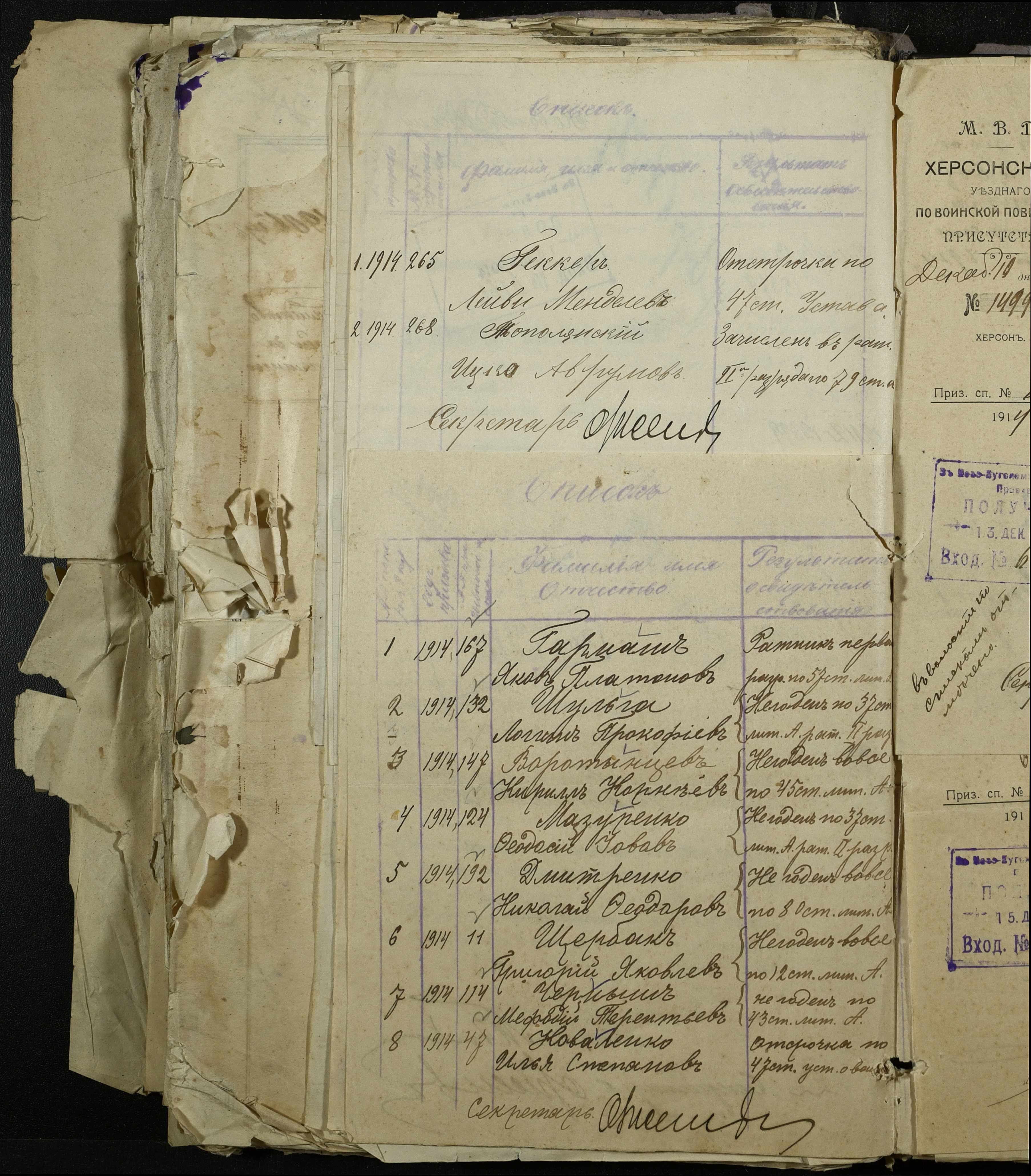 • • • • Справа № 236 “Розпорядження Херсонського повітового з військової повинності присутствія та листування з ним про порядок обліку військовозобов’язаних осіб, рапорти сільських старост, посімейні списки мобілізованих ратників, витяги з метричних книг про народження військово-зобов’язаних, присуди сільських сходів про затвердження списків осіб, покликаних в армію у 1914 році”
