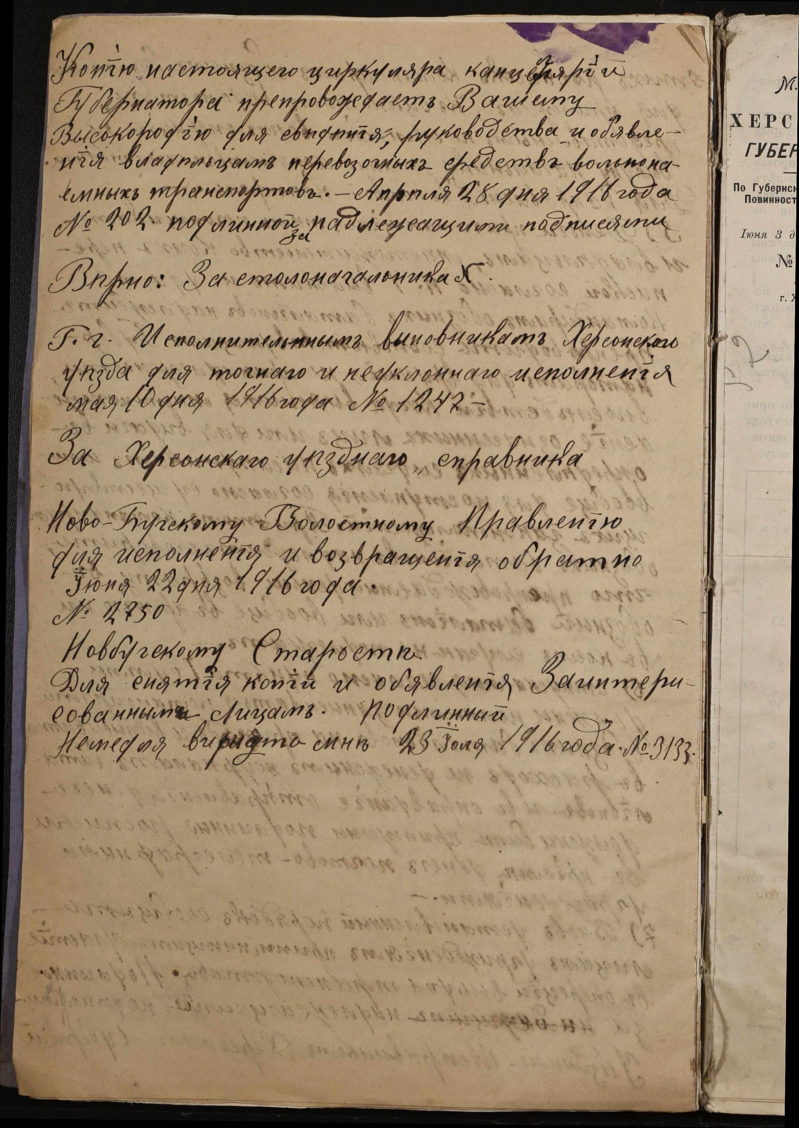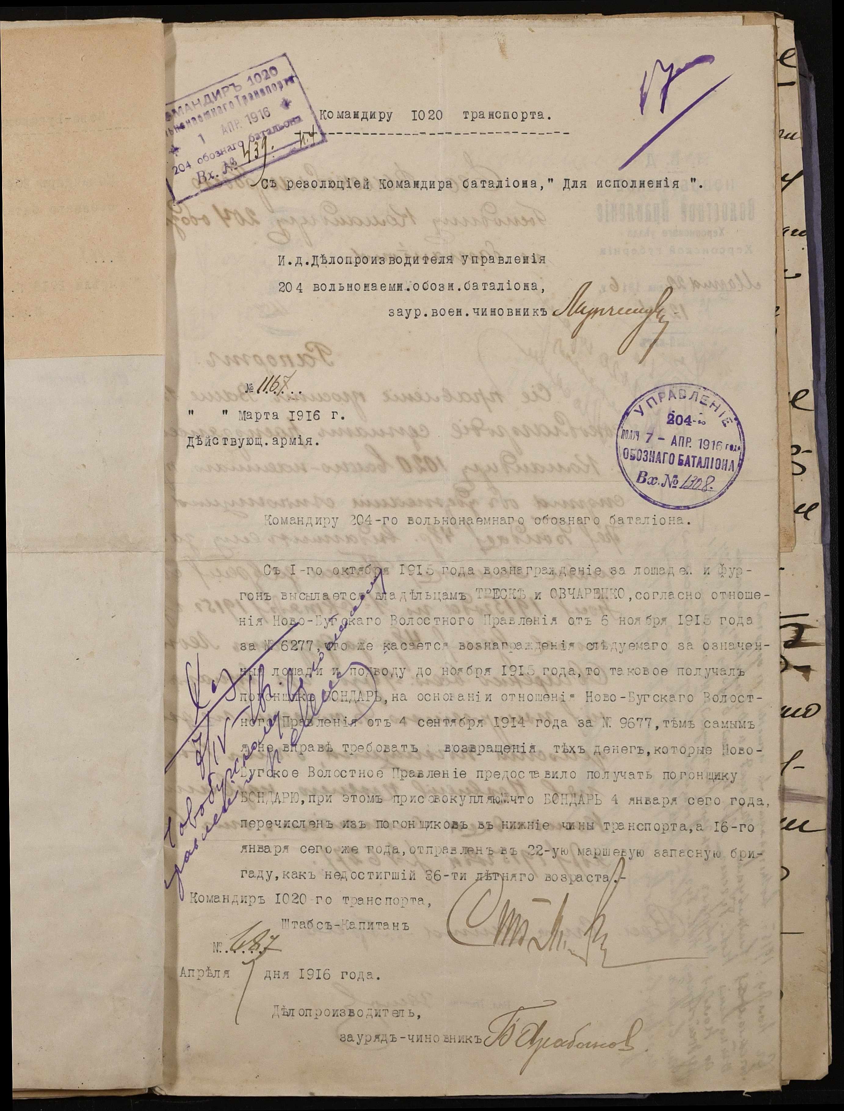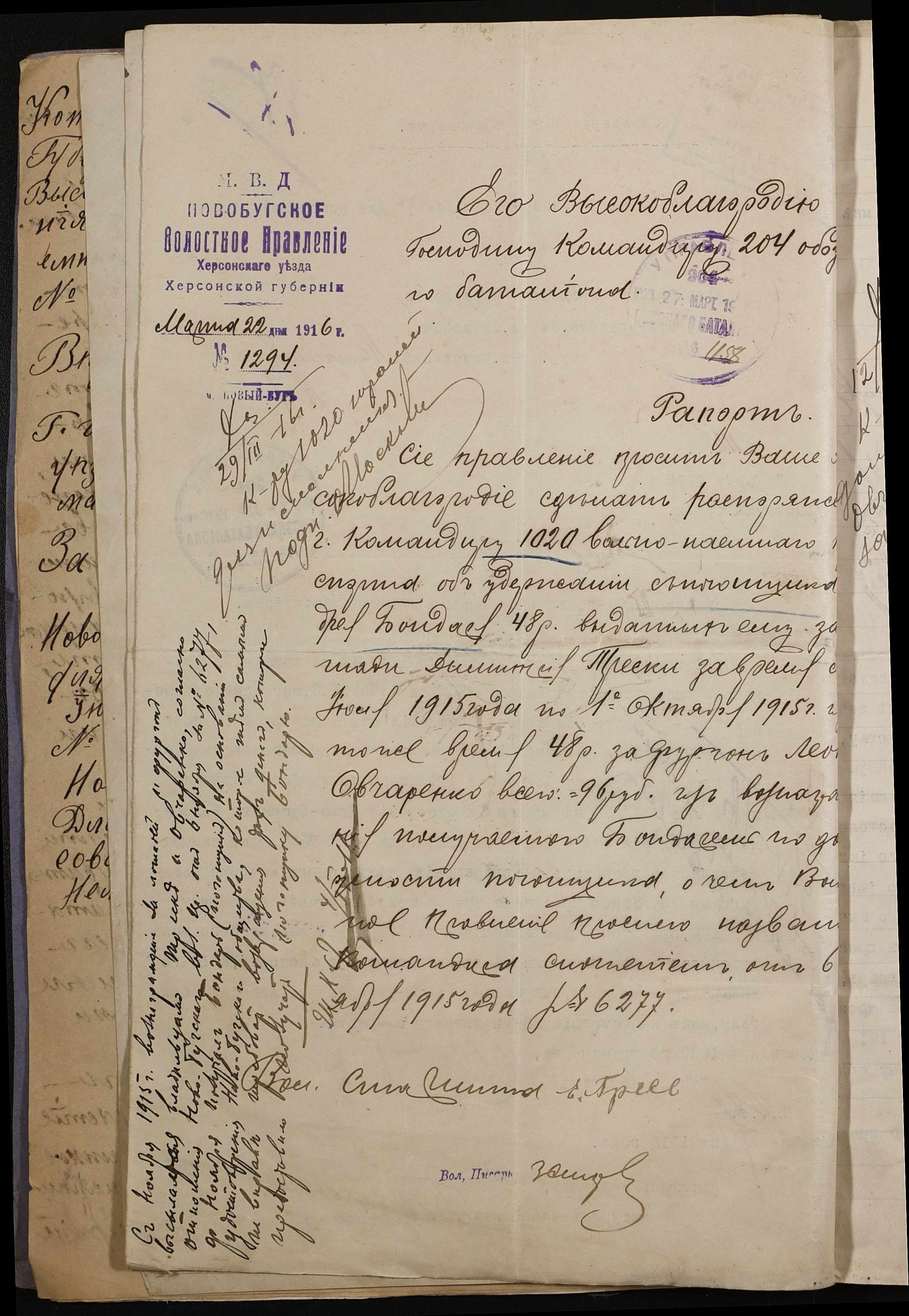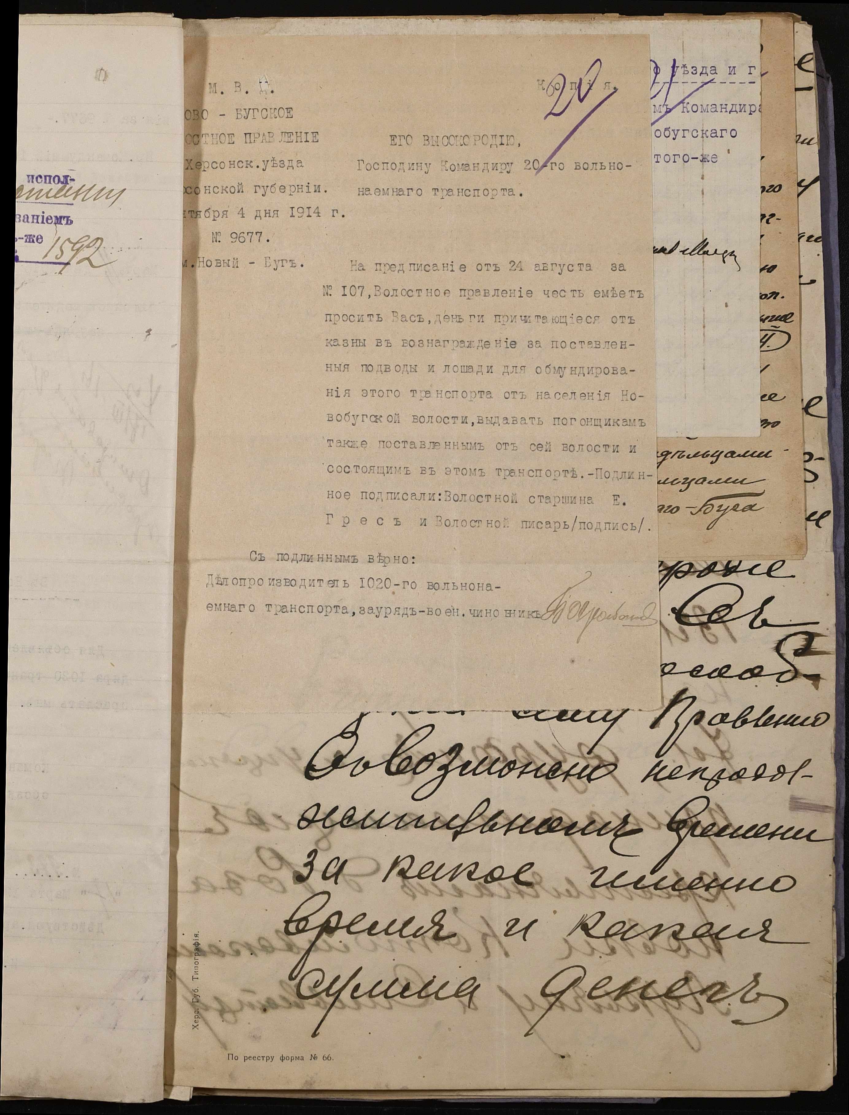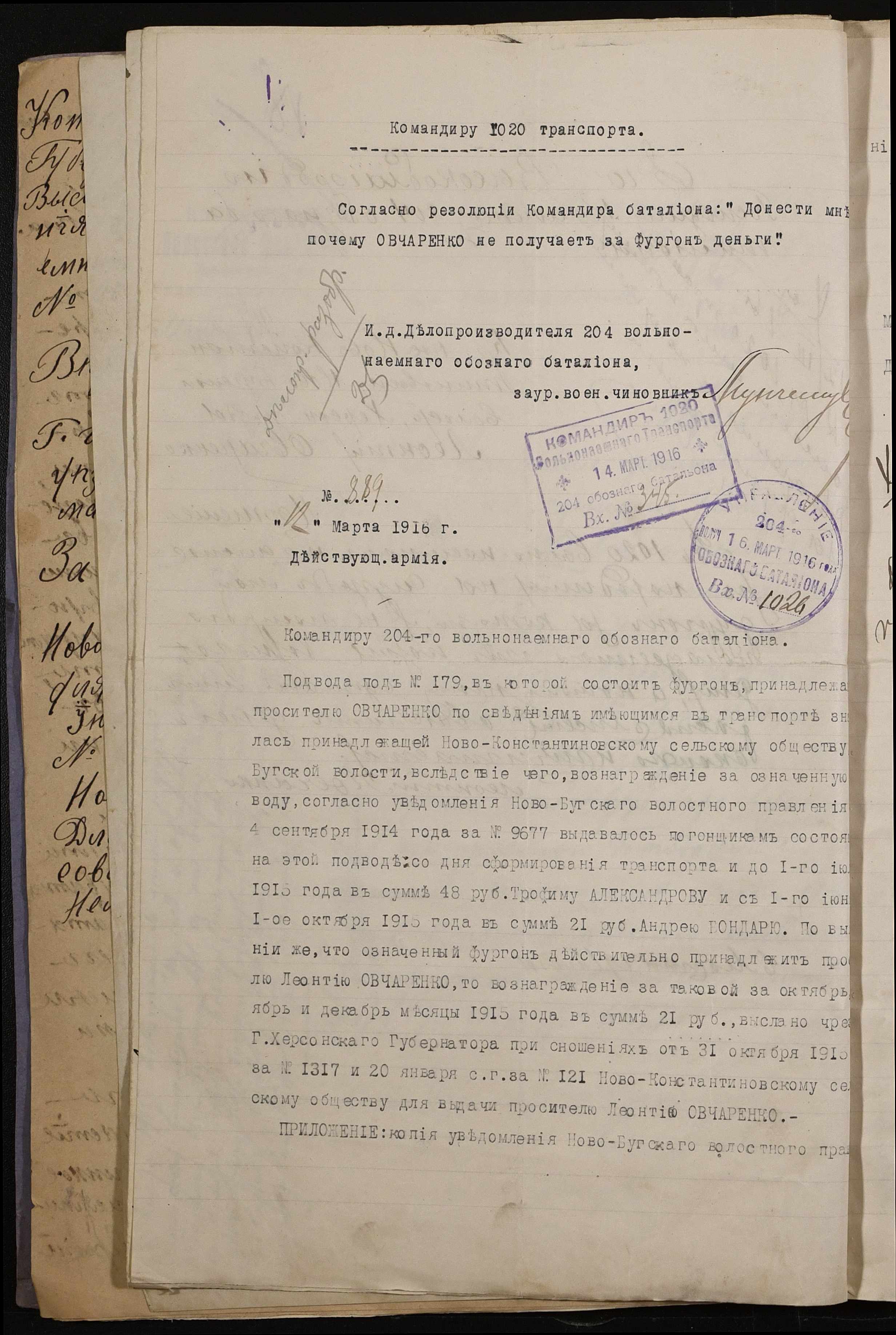 • • • • Справа № 242 “Обіжник Херсонського губернатора та листування з командуванням 202-го та 204-го обозних батальйонів, 1020-го допоміжного транспорту про порядок залучення та оплати вільнонайманого транспорту та погоничів для потреб армії”