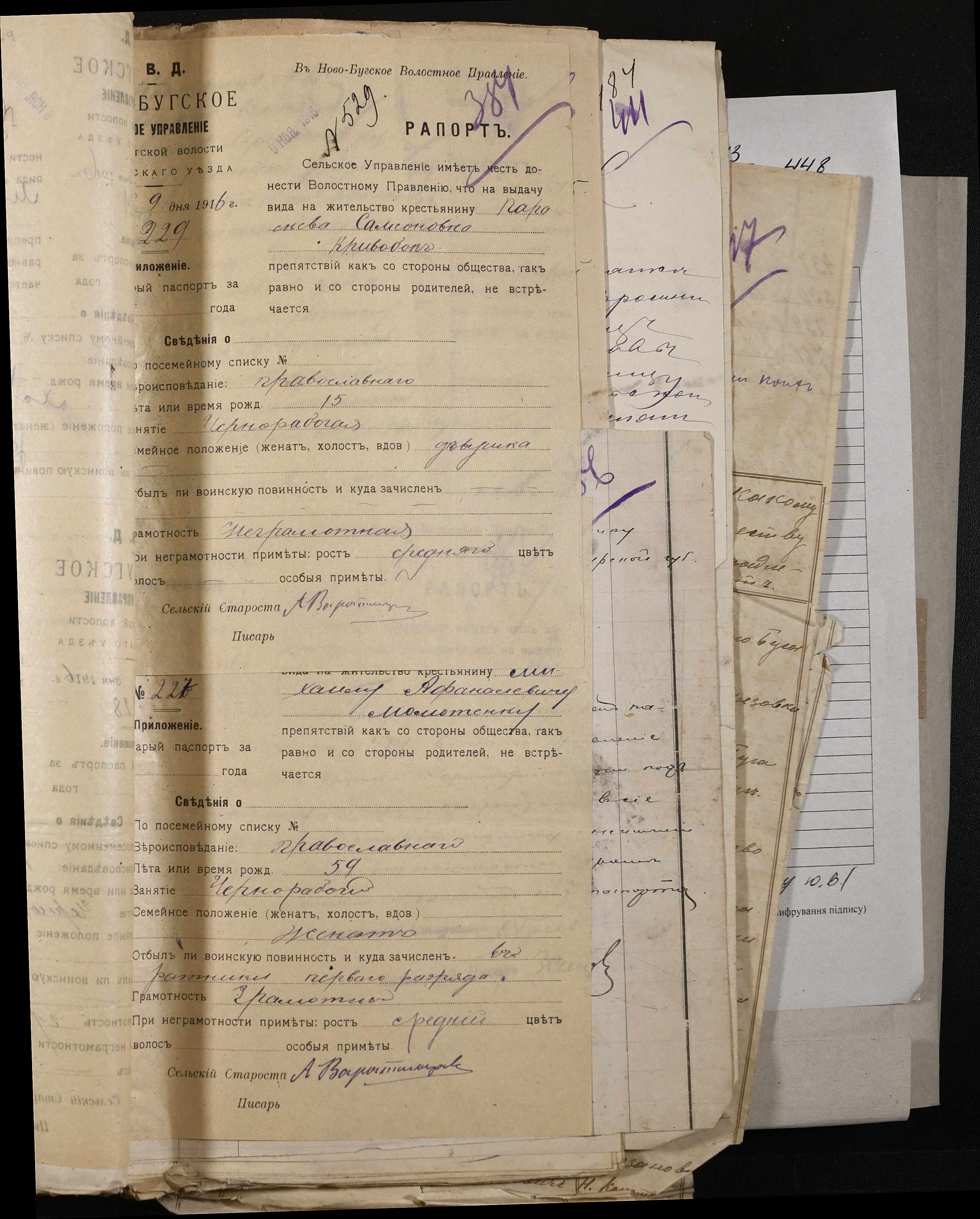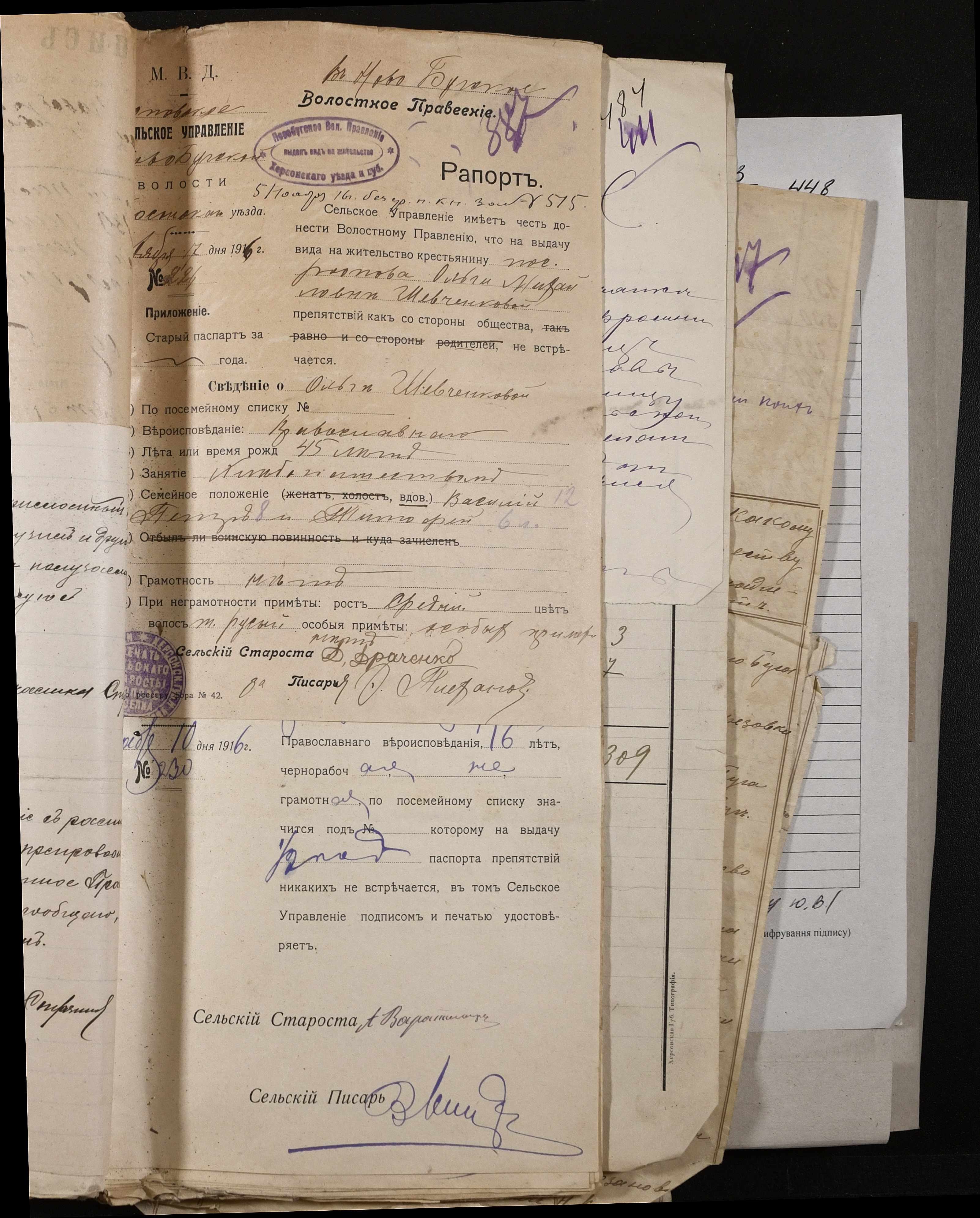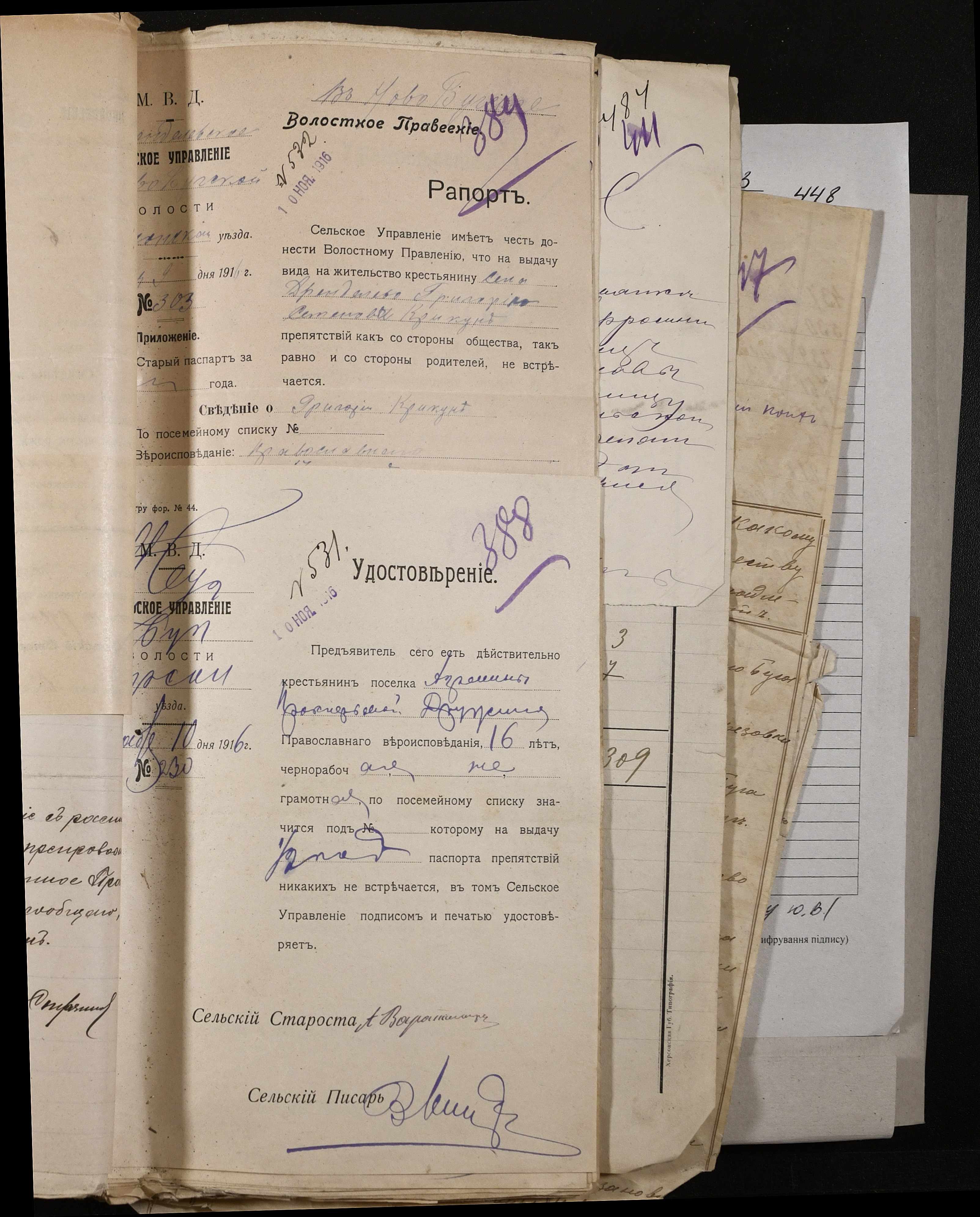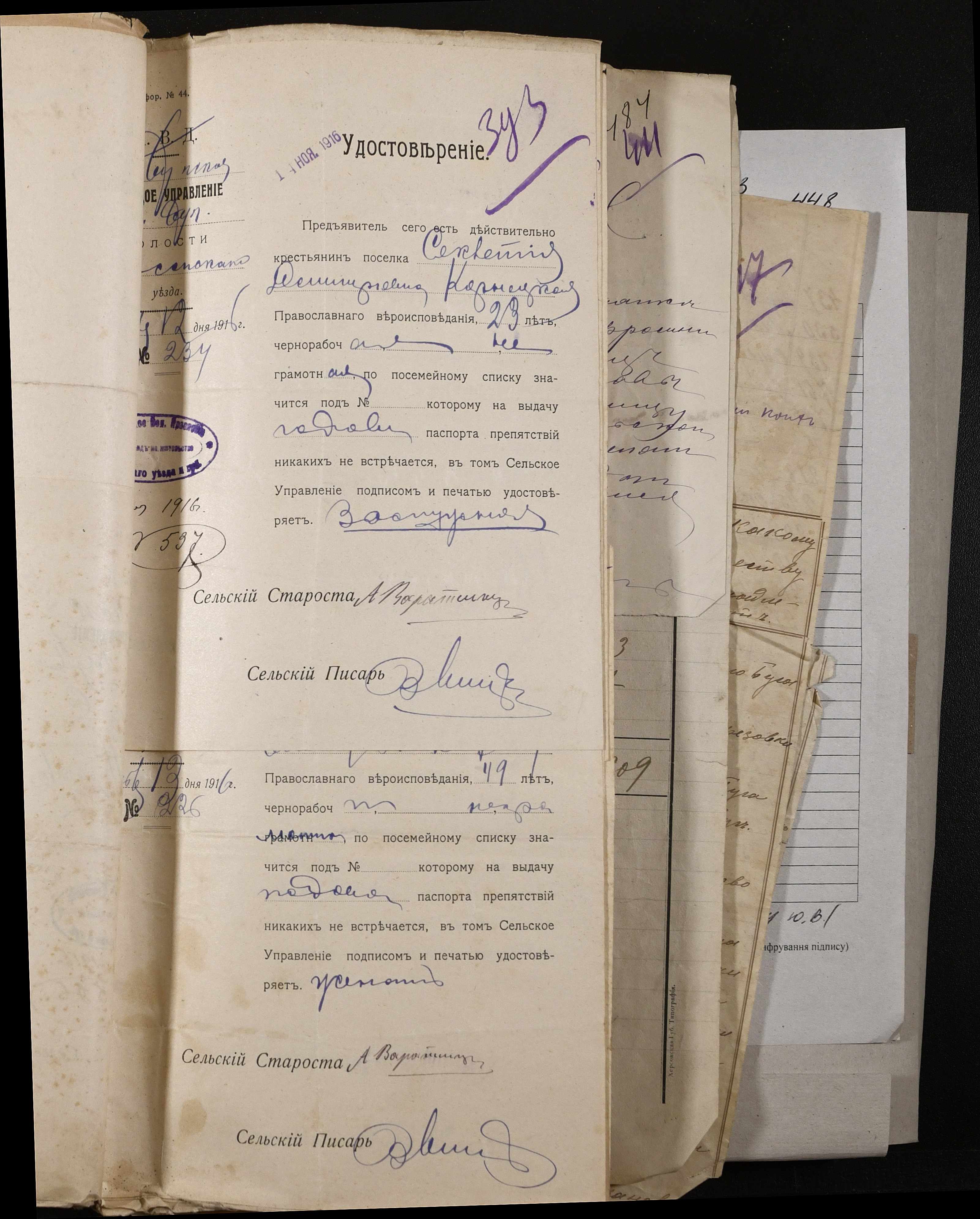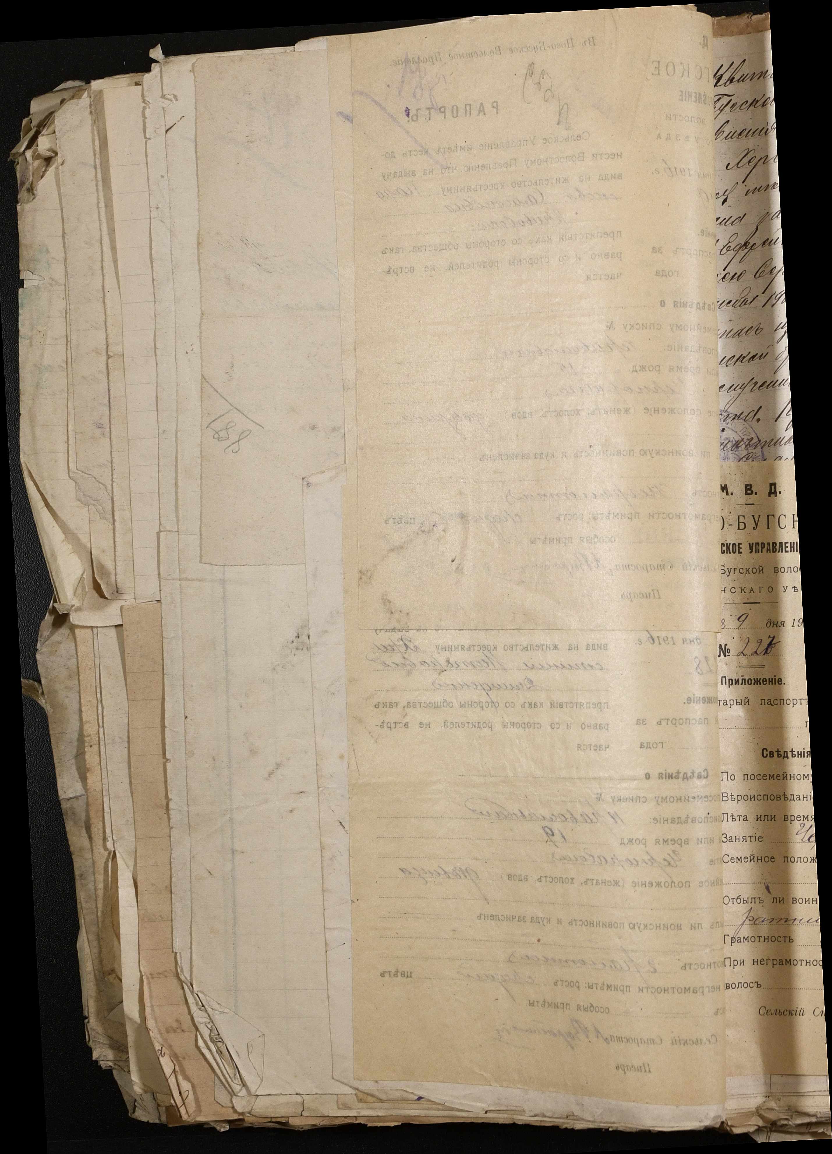 • • • • Справа № 243 “Відомості волосного правління про витрачені паспортні книжки у 1914-1915 роках, заяви та прохання громадян про видачу їм паспортів, листування з сільськими управліннями, рапорти та посвідчення, надані громадянам для отримання паспортів, посімейні списки”