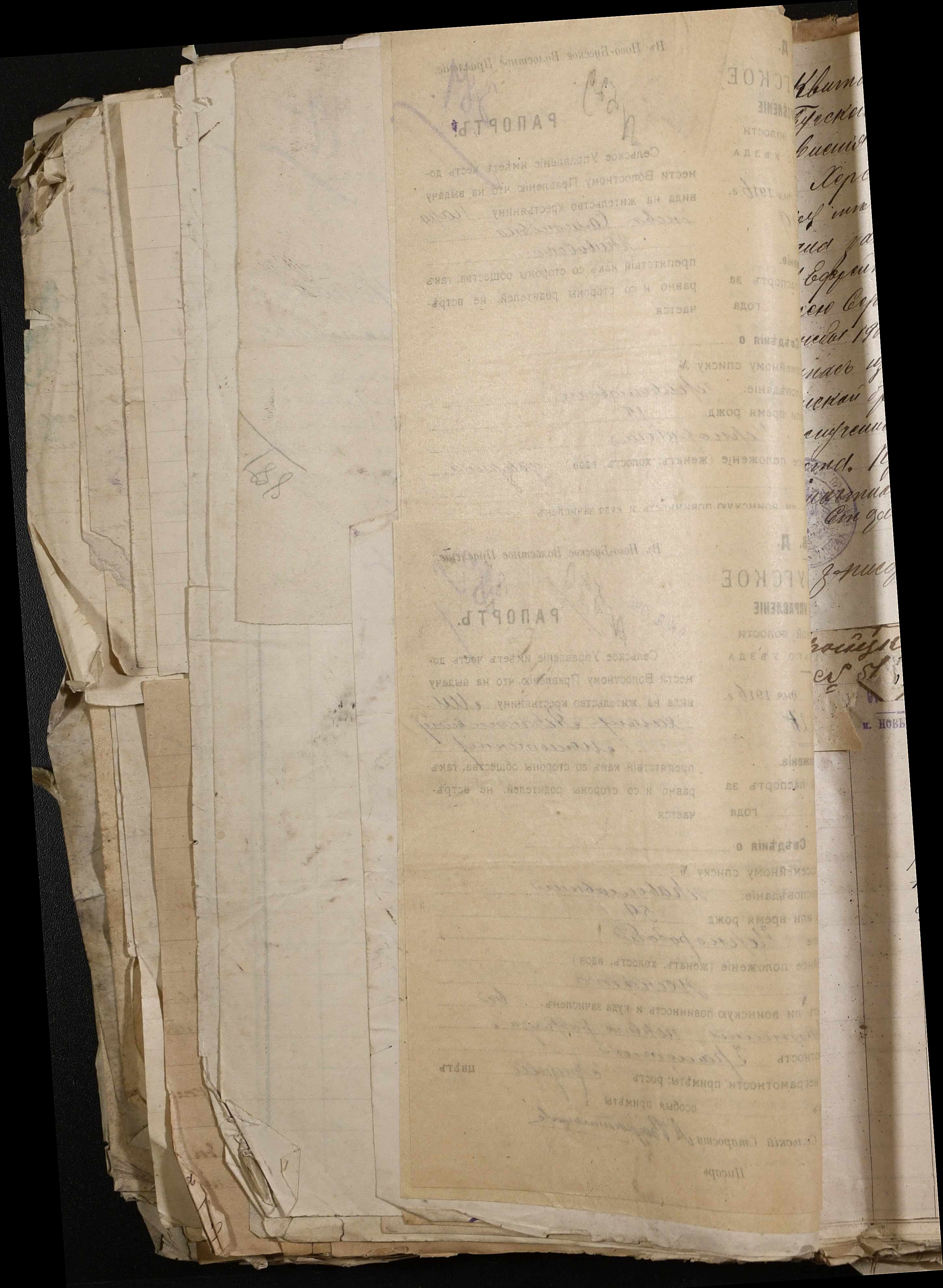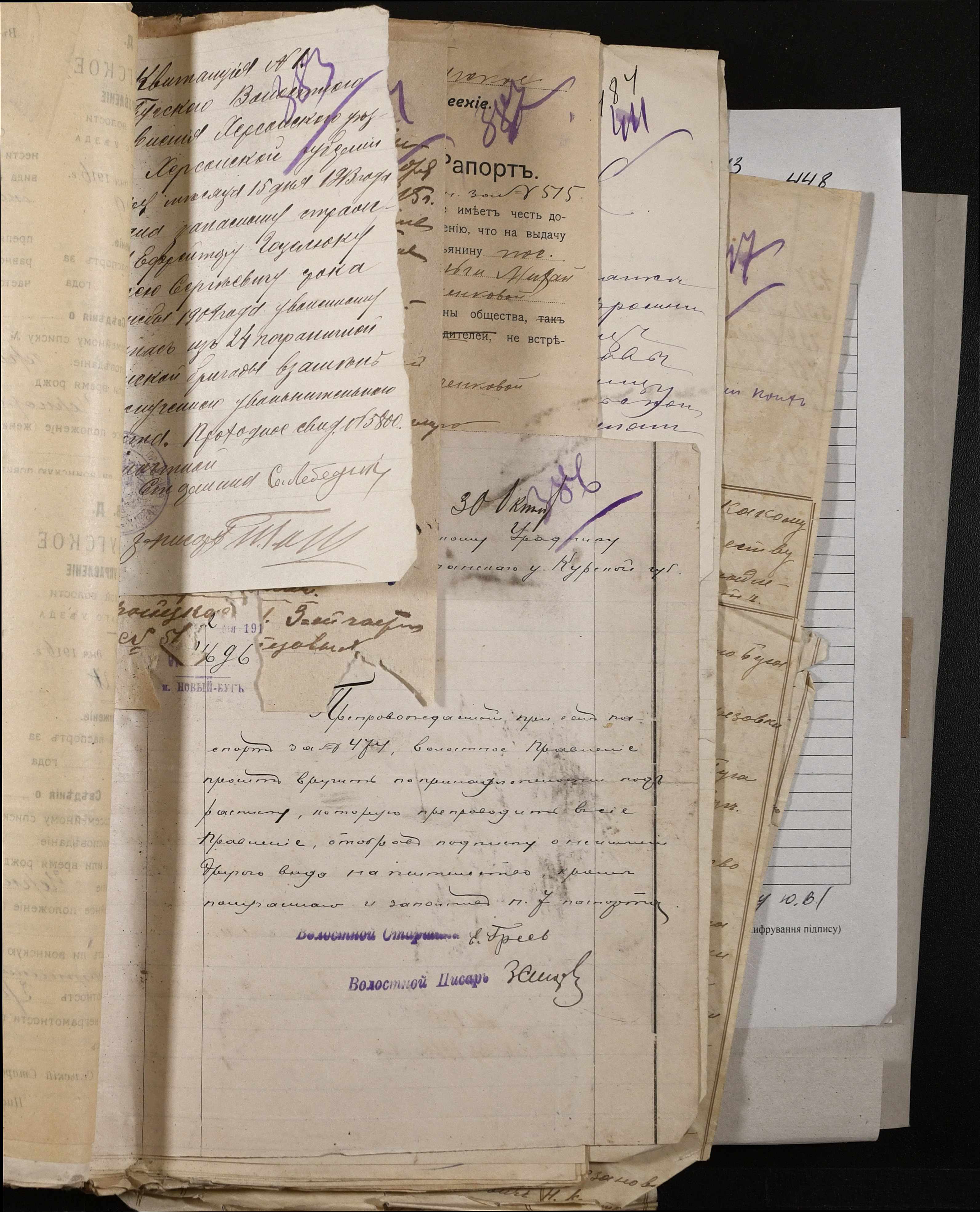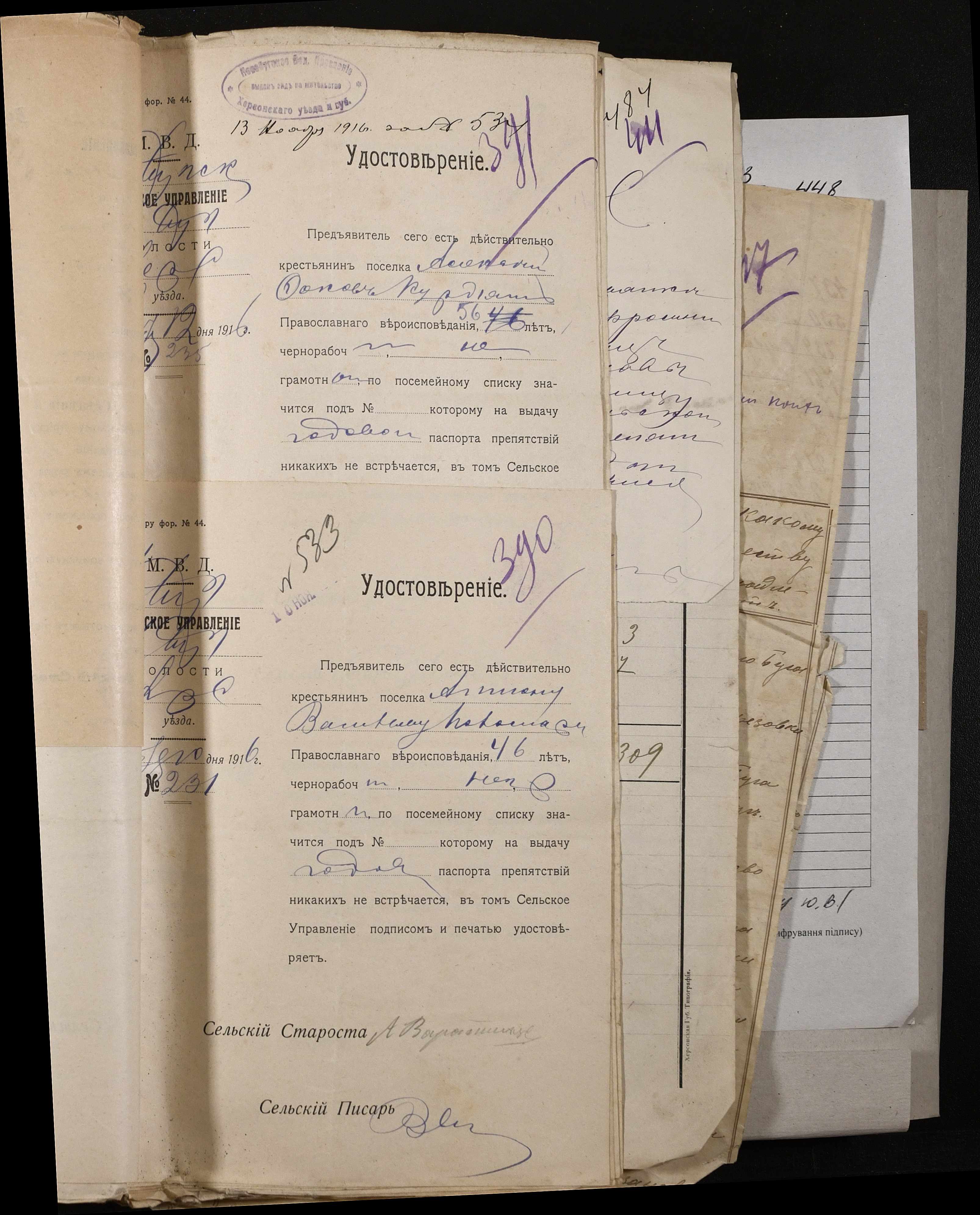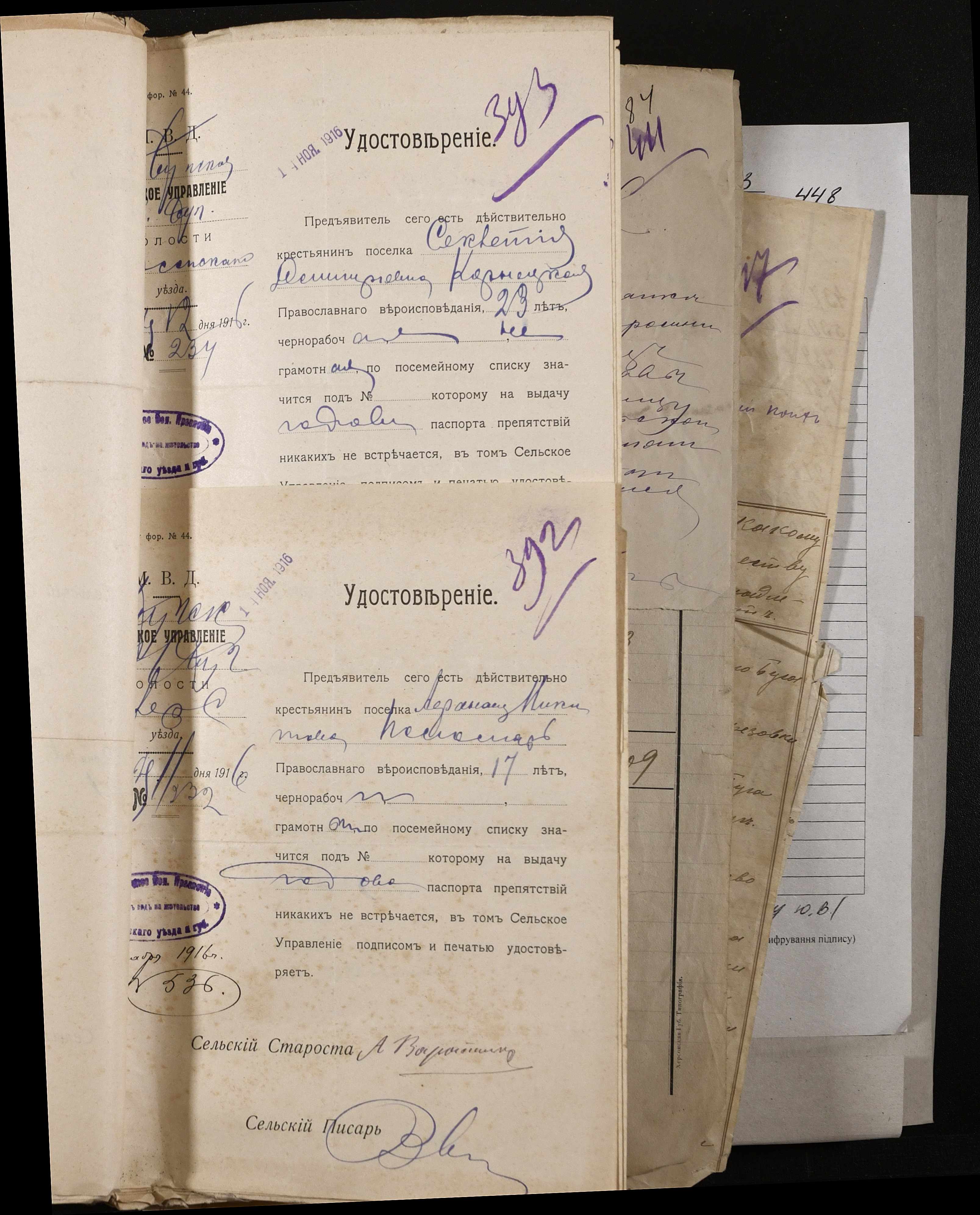• • • • Справа № 243 “Відомості волосного правління про витрачені паспортні книжки у 1914-1915 роках, заяви та прохання громадян про видачу їм паспортів, листування з сільськими управліннями, рапорти та посвідчення, надані громадянам для отримання паспортів, посімейні списки”