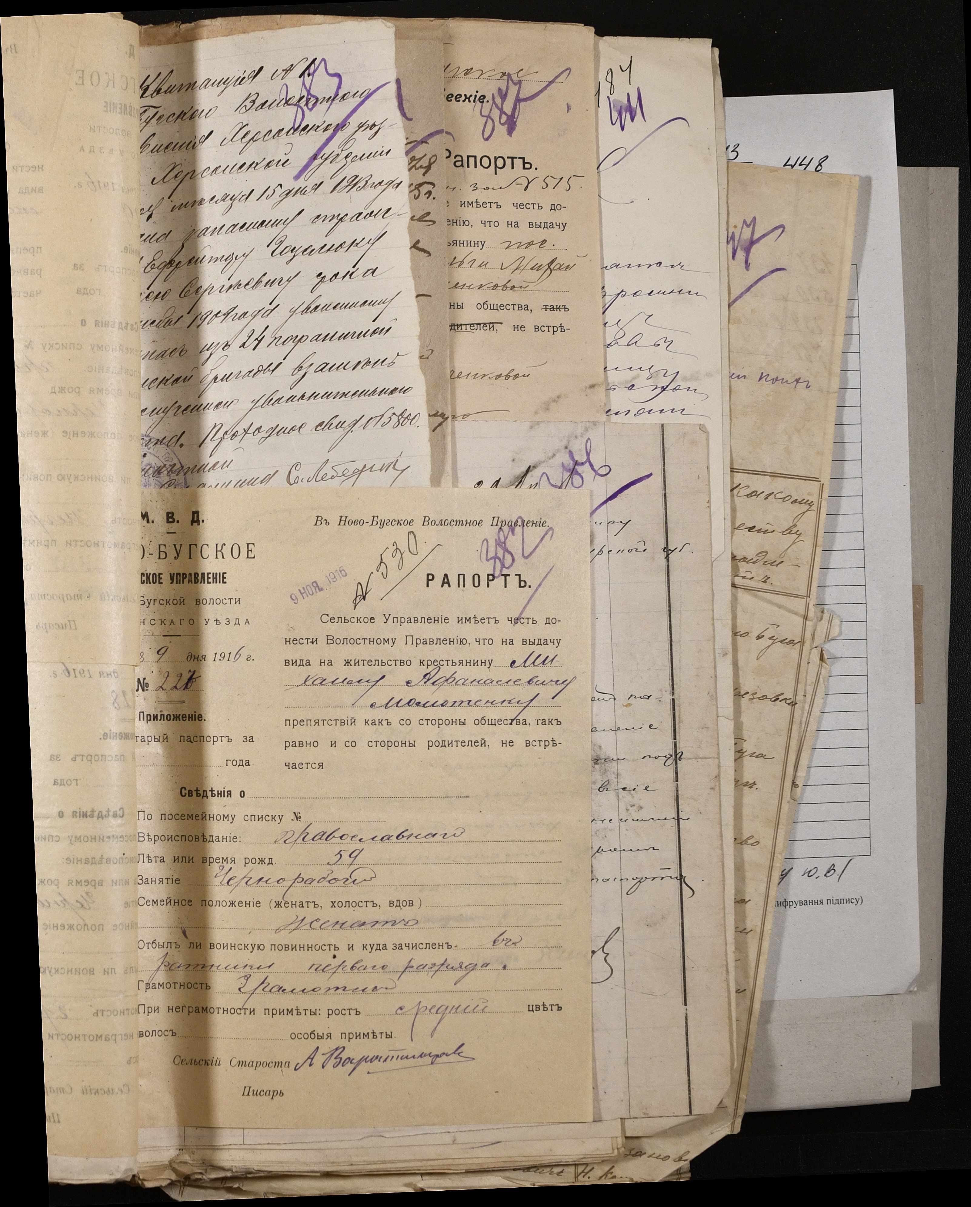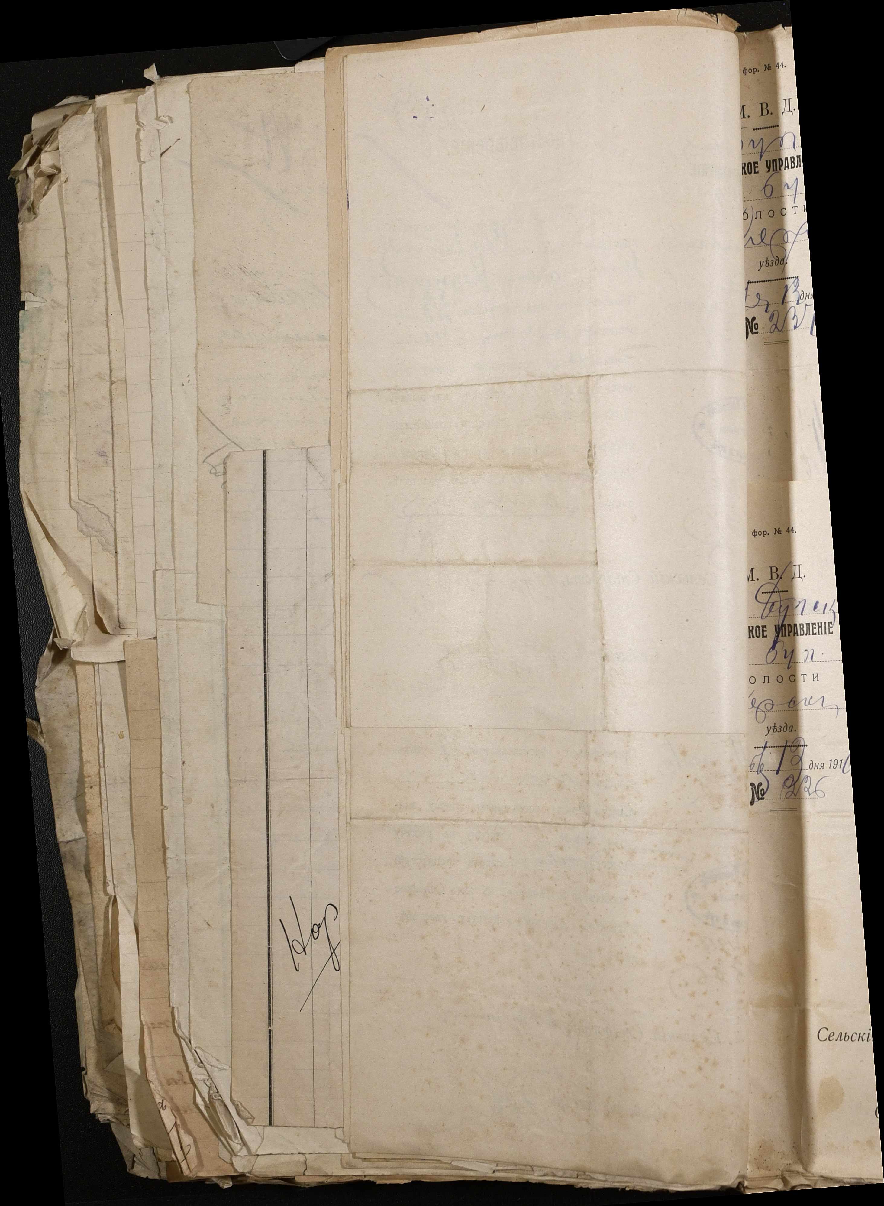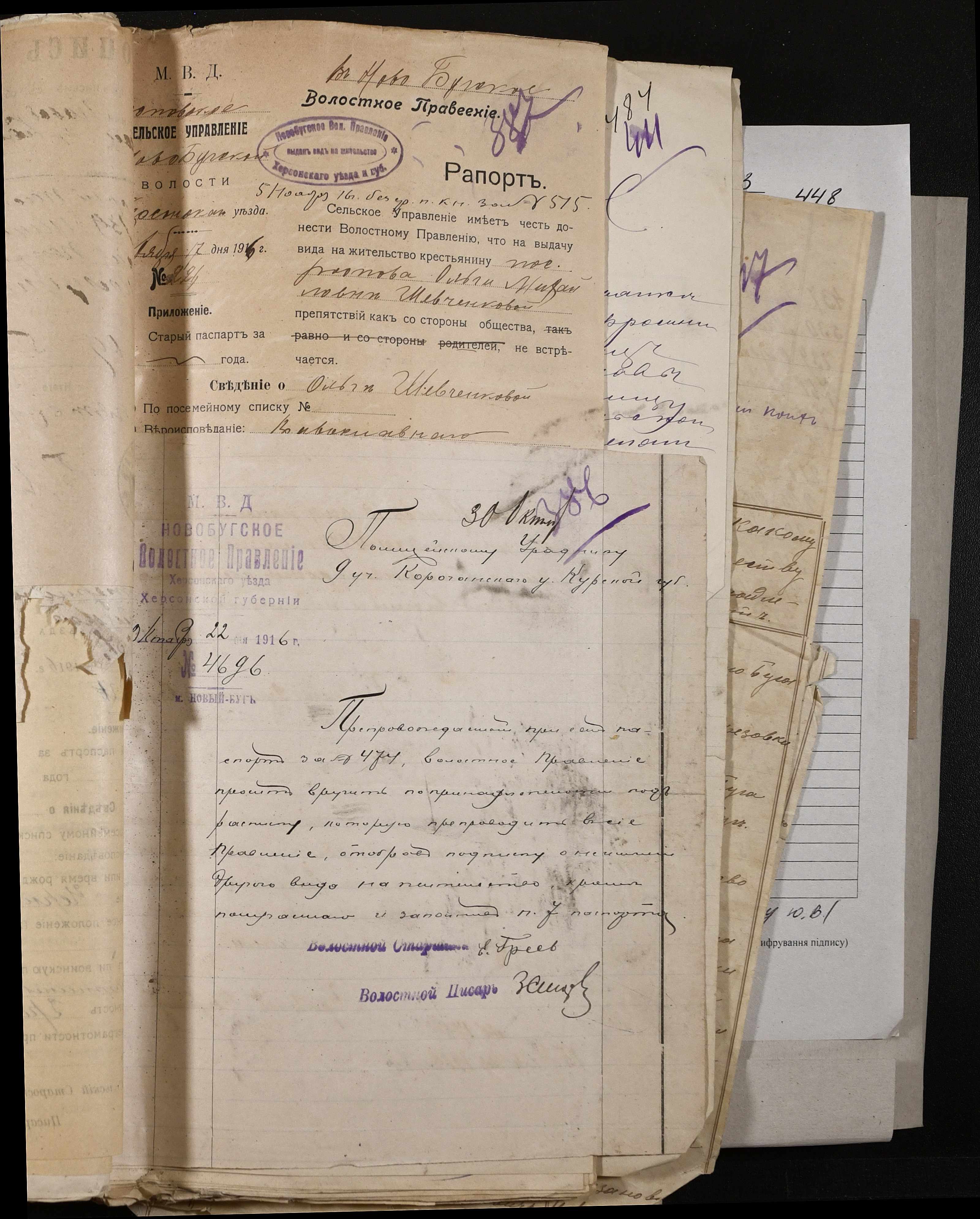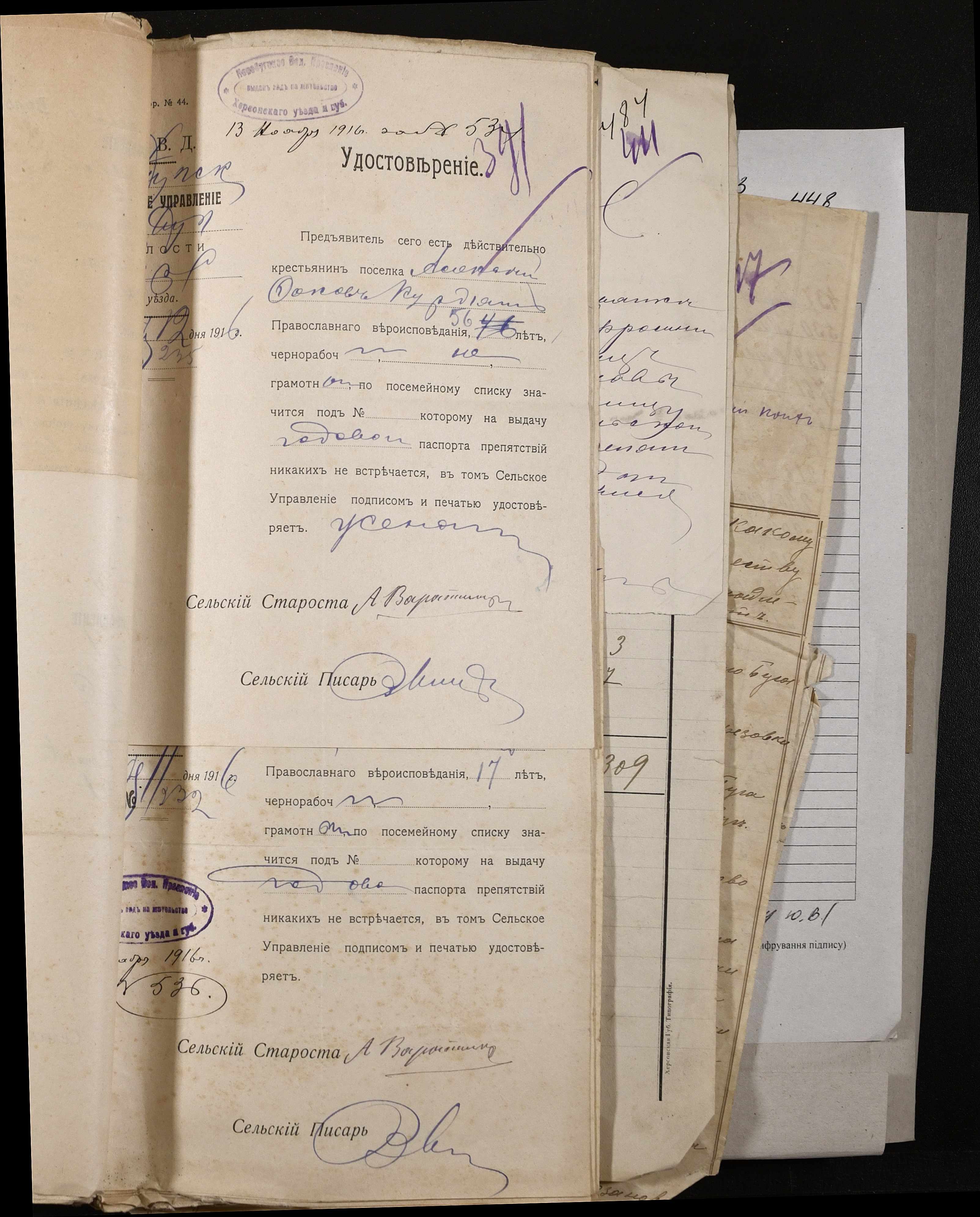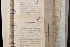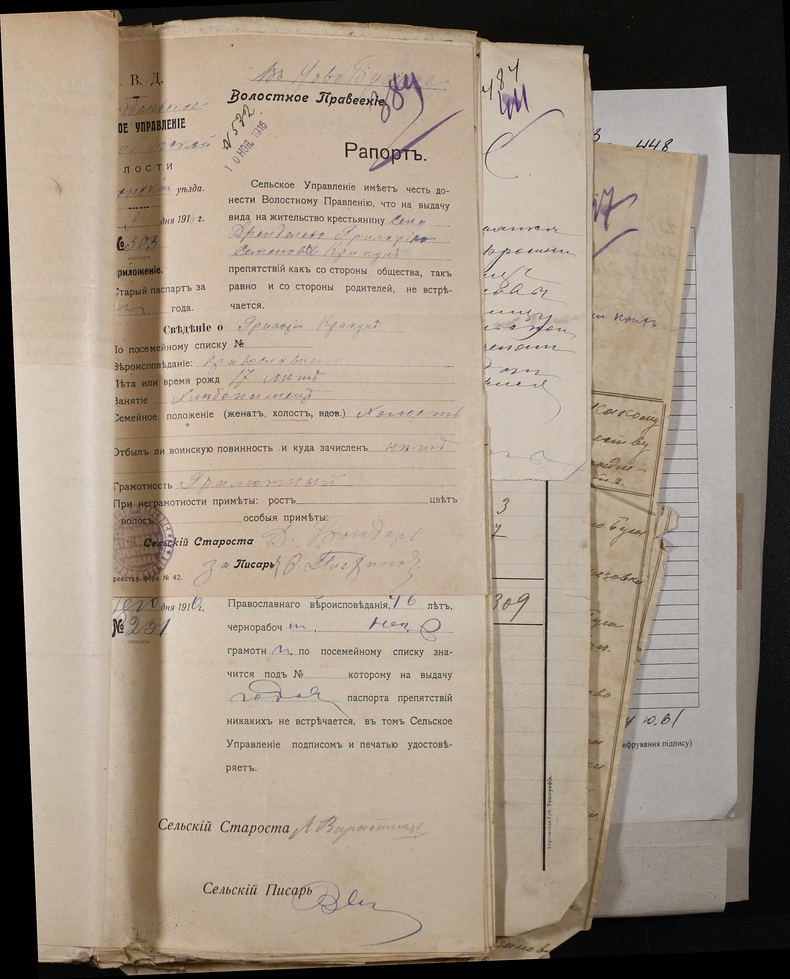 • • • • Справа № 243 “Відомості волосного правління про витрачені паспортні книжки у 1914-1915 роках, заяви та прохання громадян про видачу їм паспортів, листування з сільськими управліннями, рапорти та посвідчення, надані громадянам для отримання паспортів, посімейні списки”
