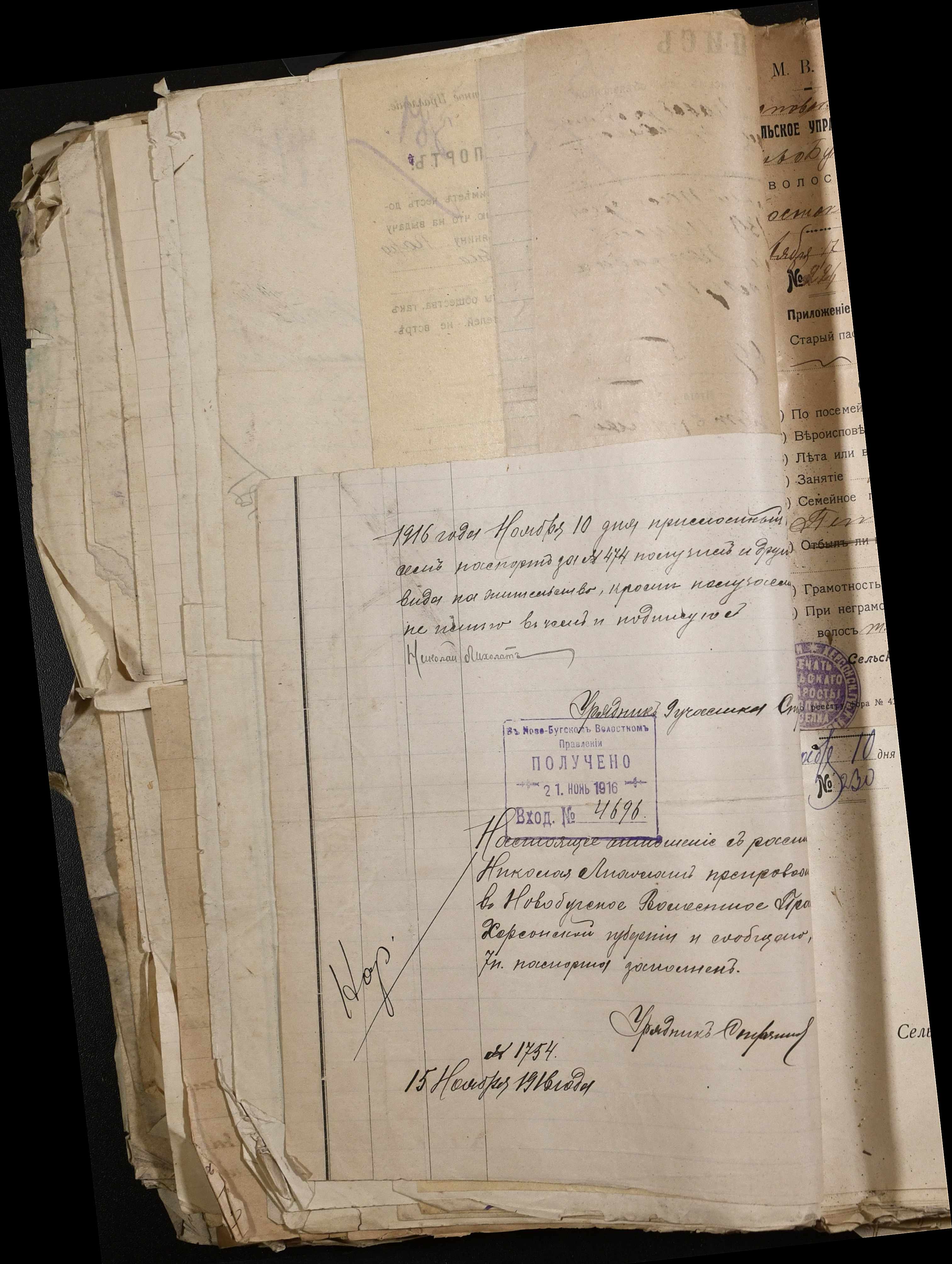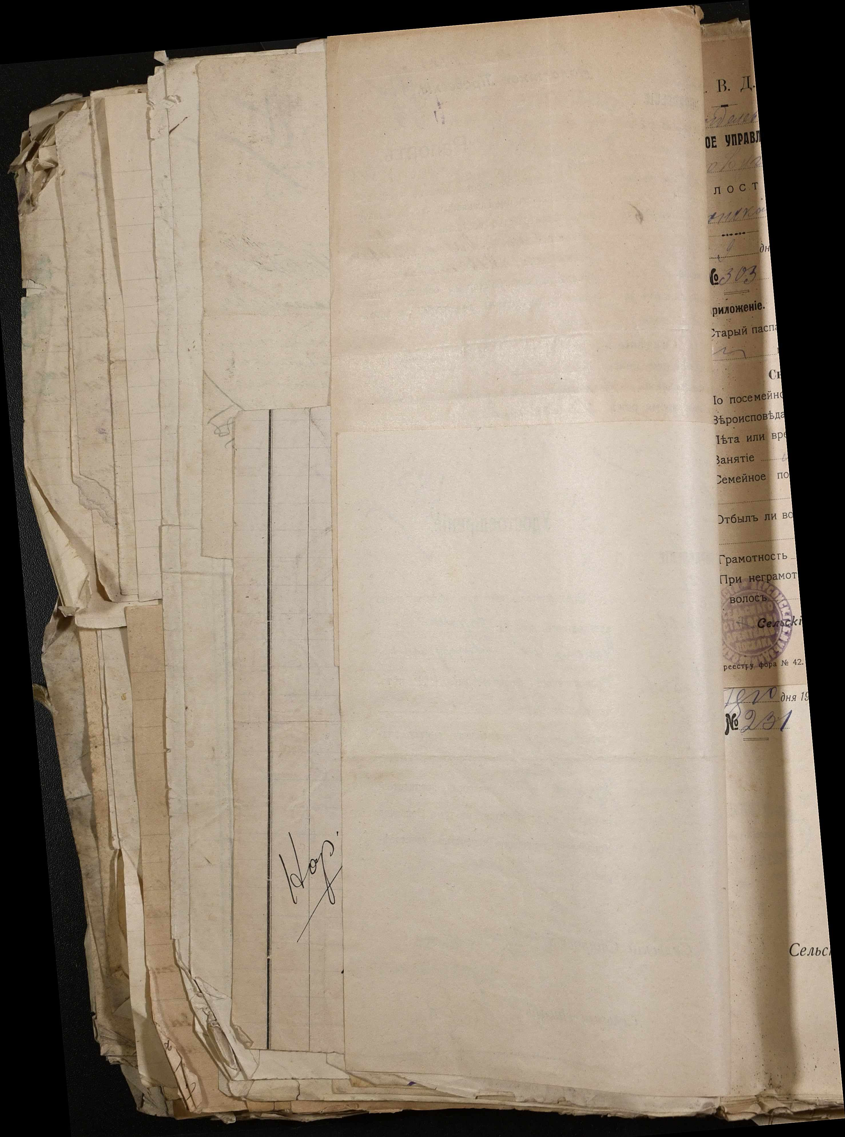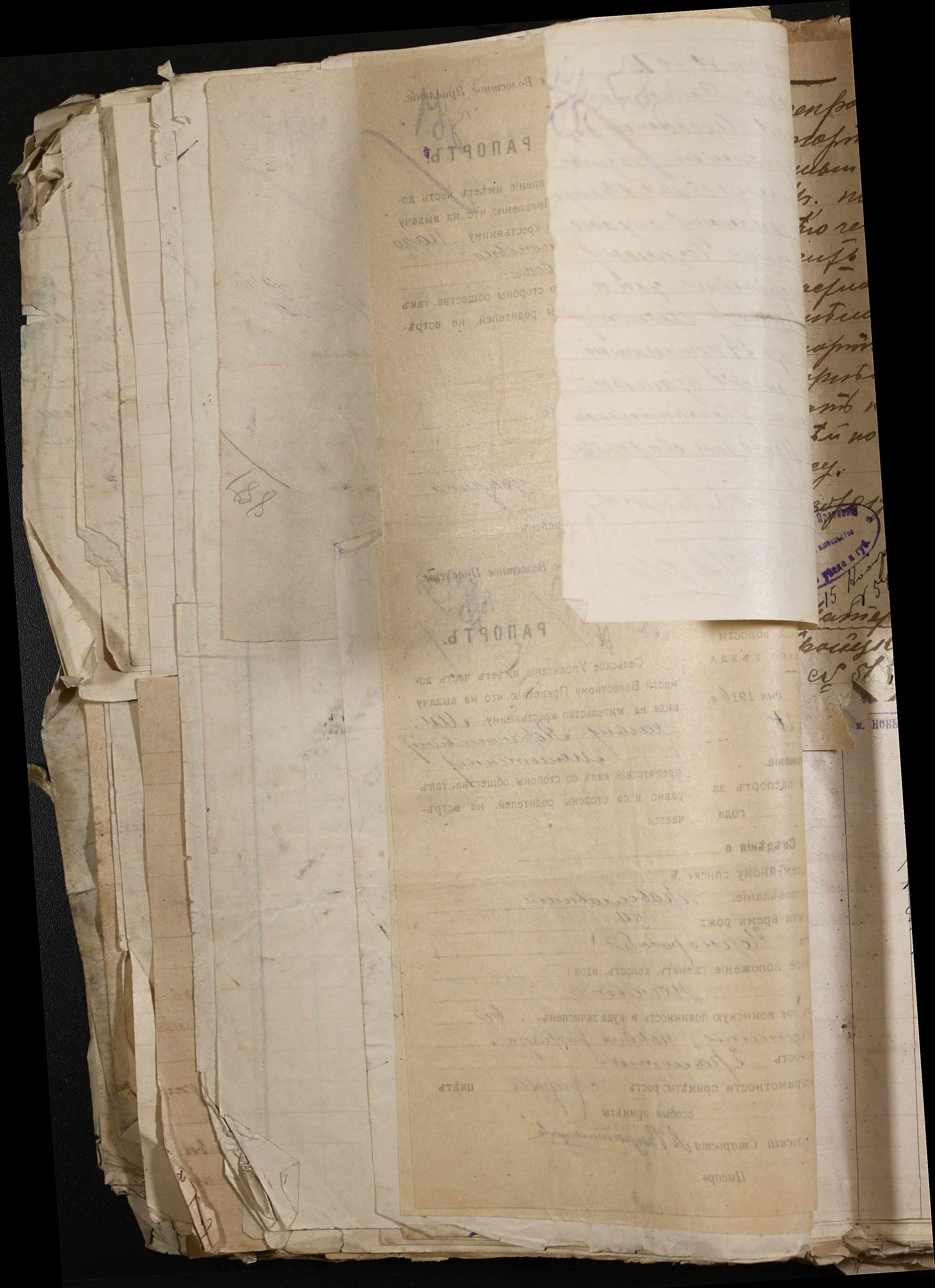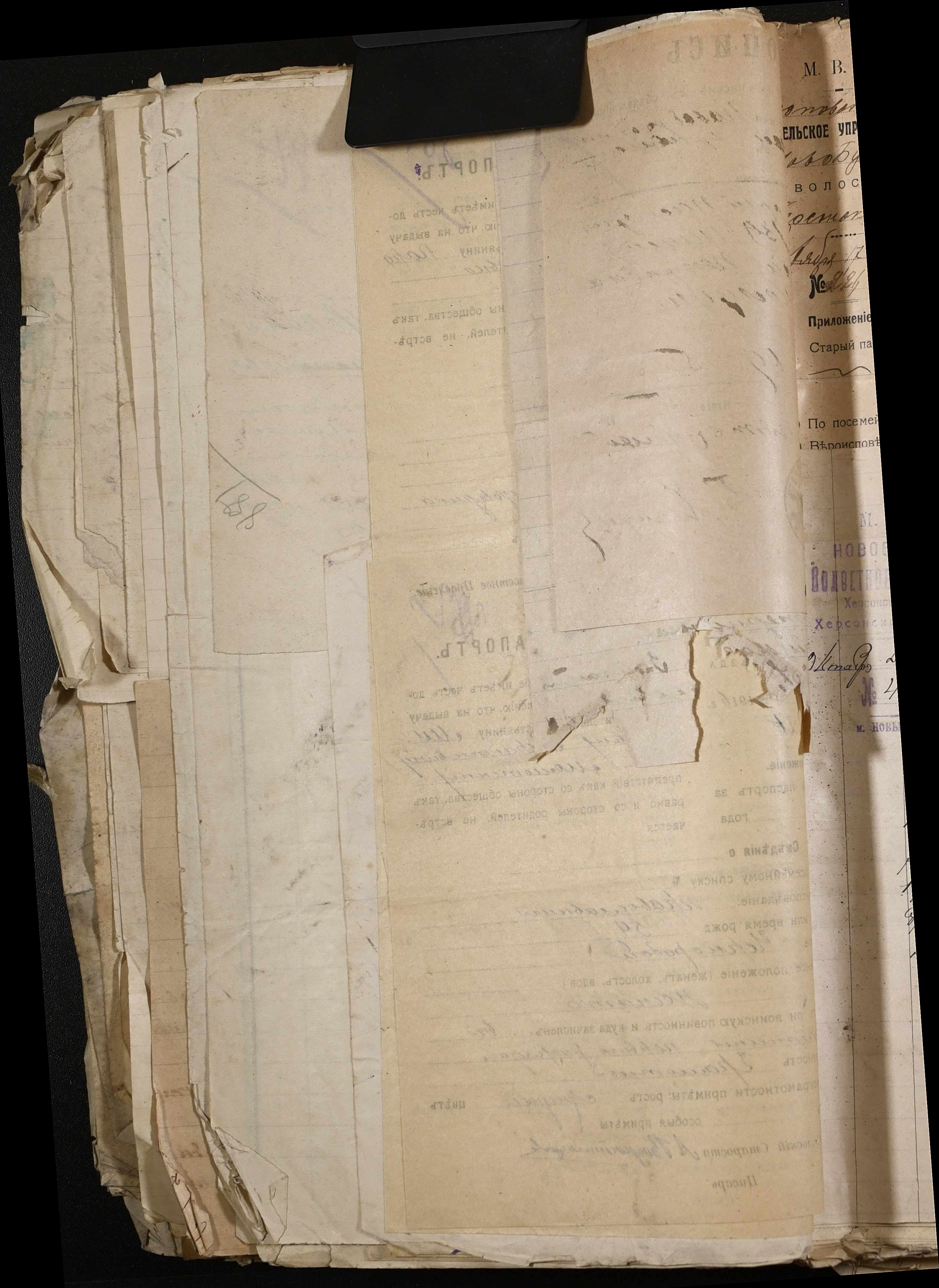 • • • • Справа № 243 “Відомості волосного правління про витрачені паспортні книжки у 1914-1915 роках, заяви та прохання громадян про видачу їм паспортів, листування з сільськими управліннями, рапорти та посвідчення, надані громадянам для отримання паспортів, посімейні списки”