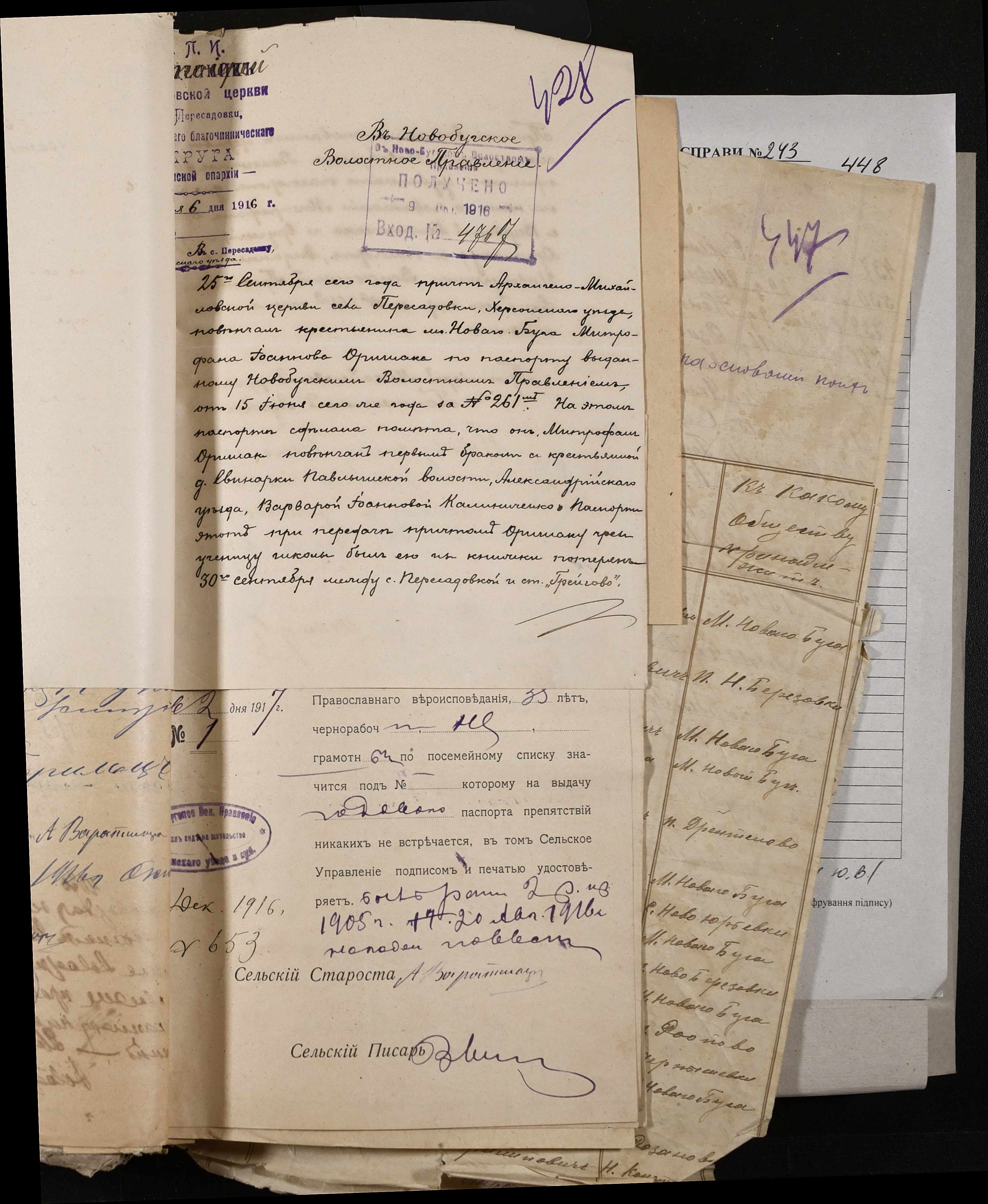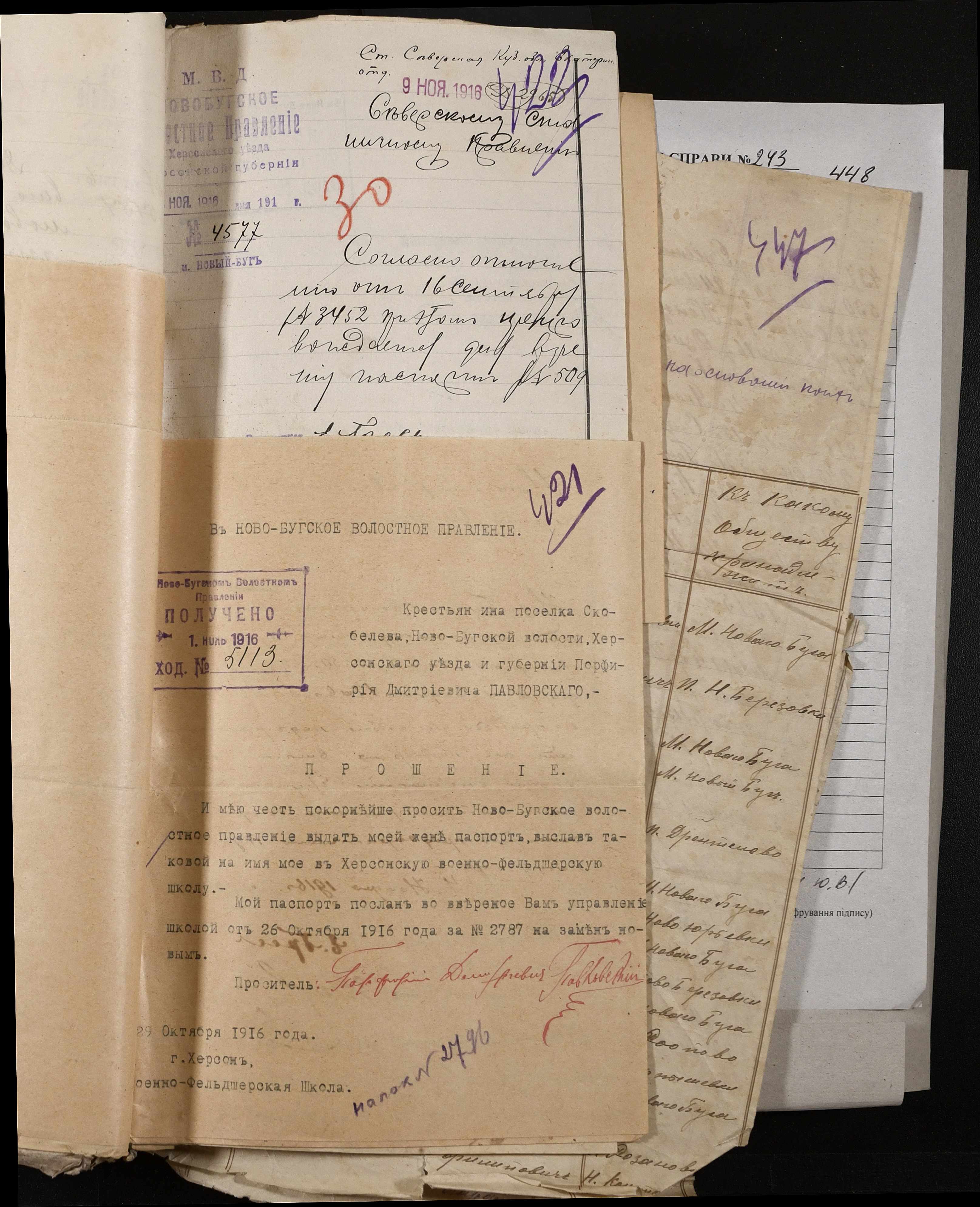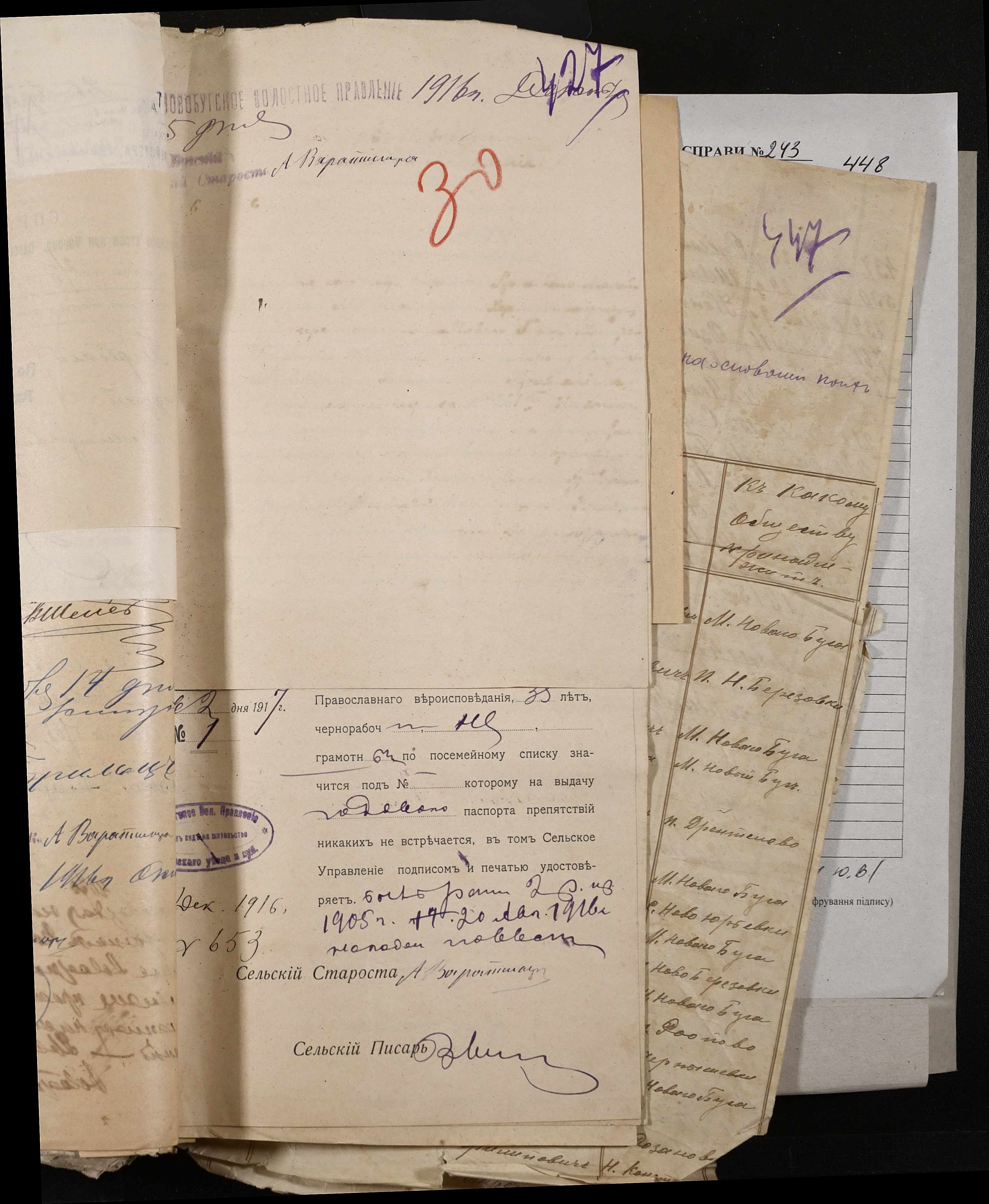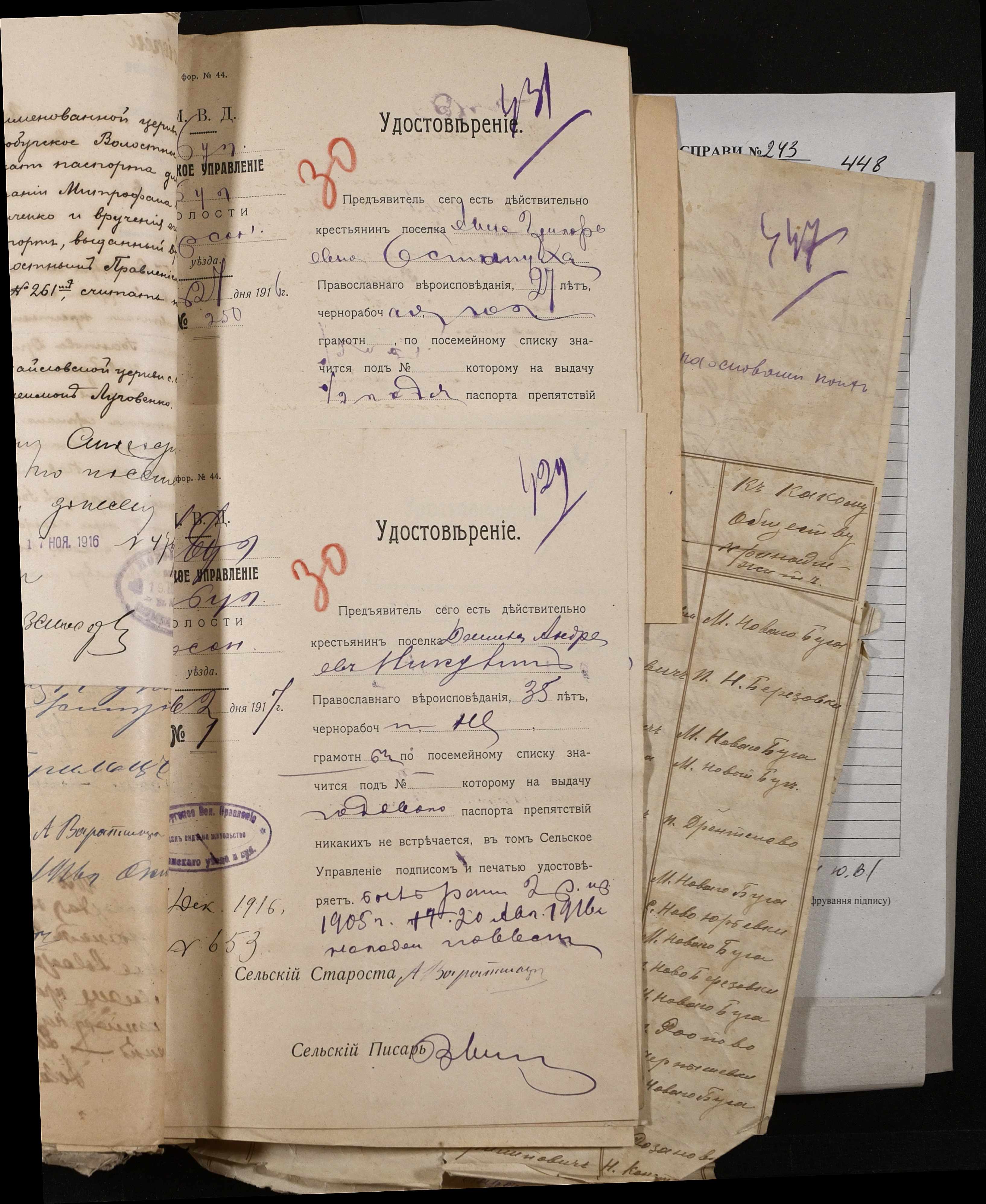 • • • • Справа № 243 “Відомості волосного правління про витрачені паспортні книжки у 1914-1915 роках, заяви та прохання громадян про видачу їм паспортів, листування з сільськими управліннями, рапорти та посвідчення, надані громадянам для отримання паспортів, посімейні списки”