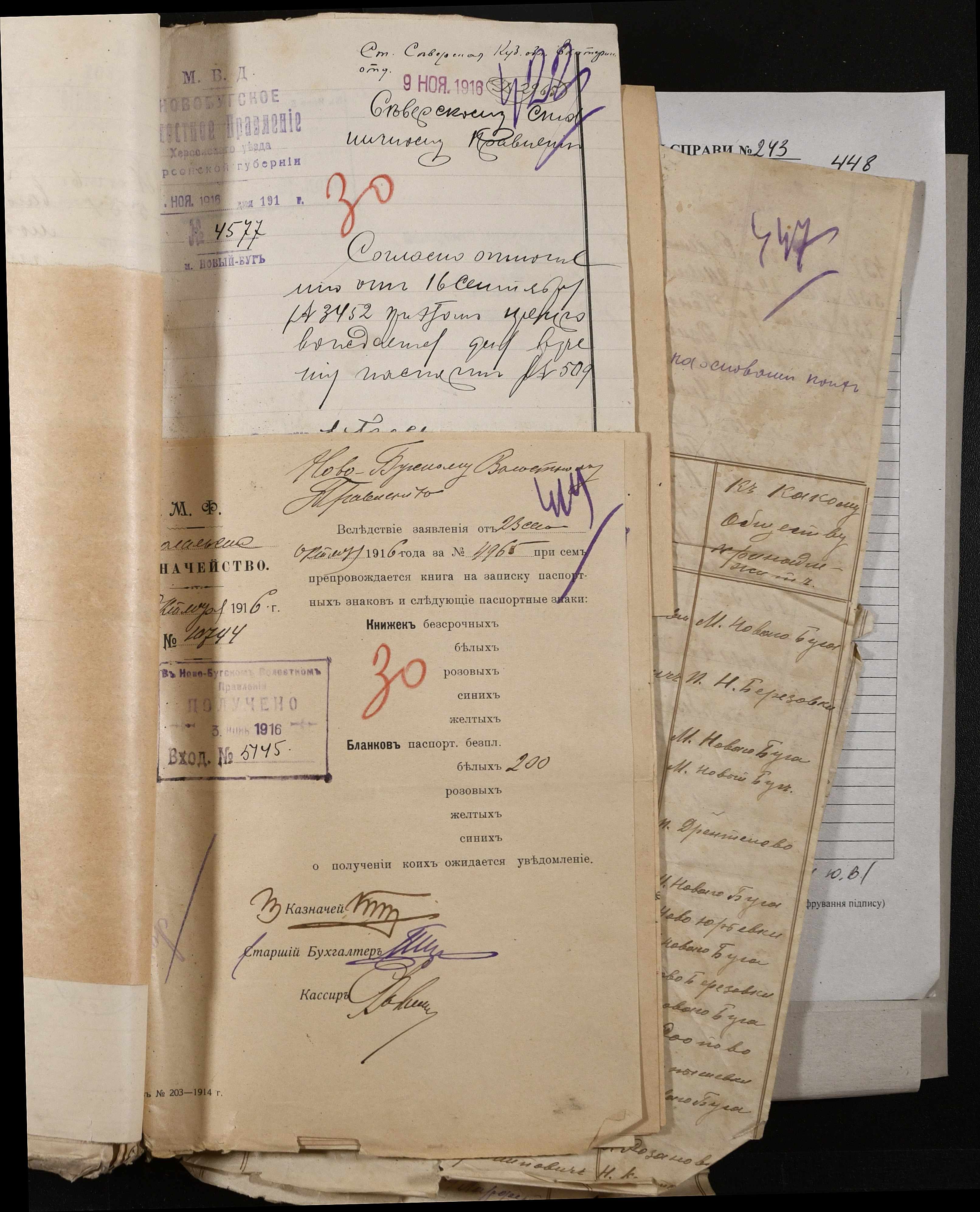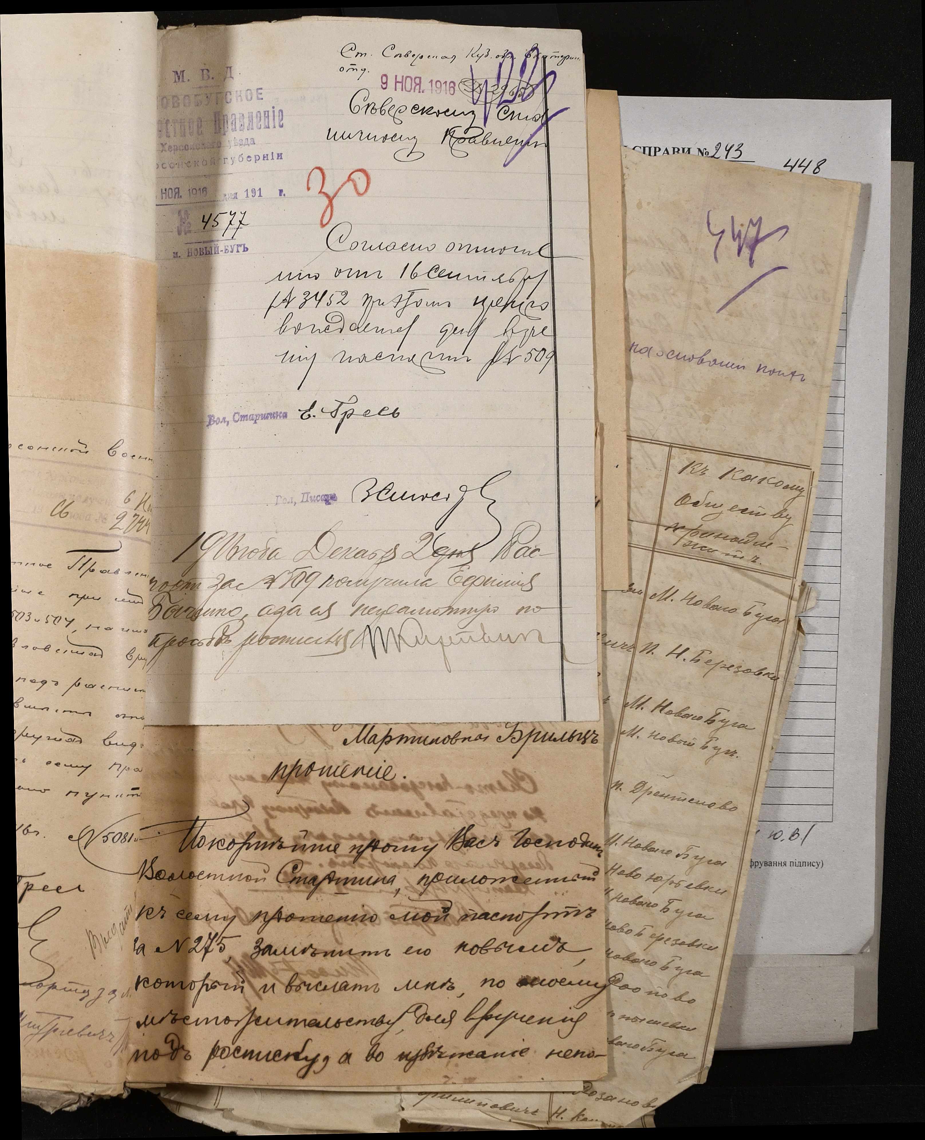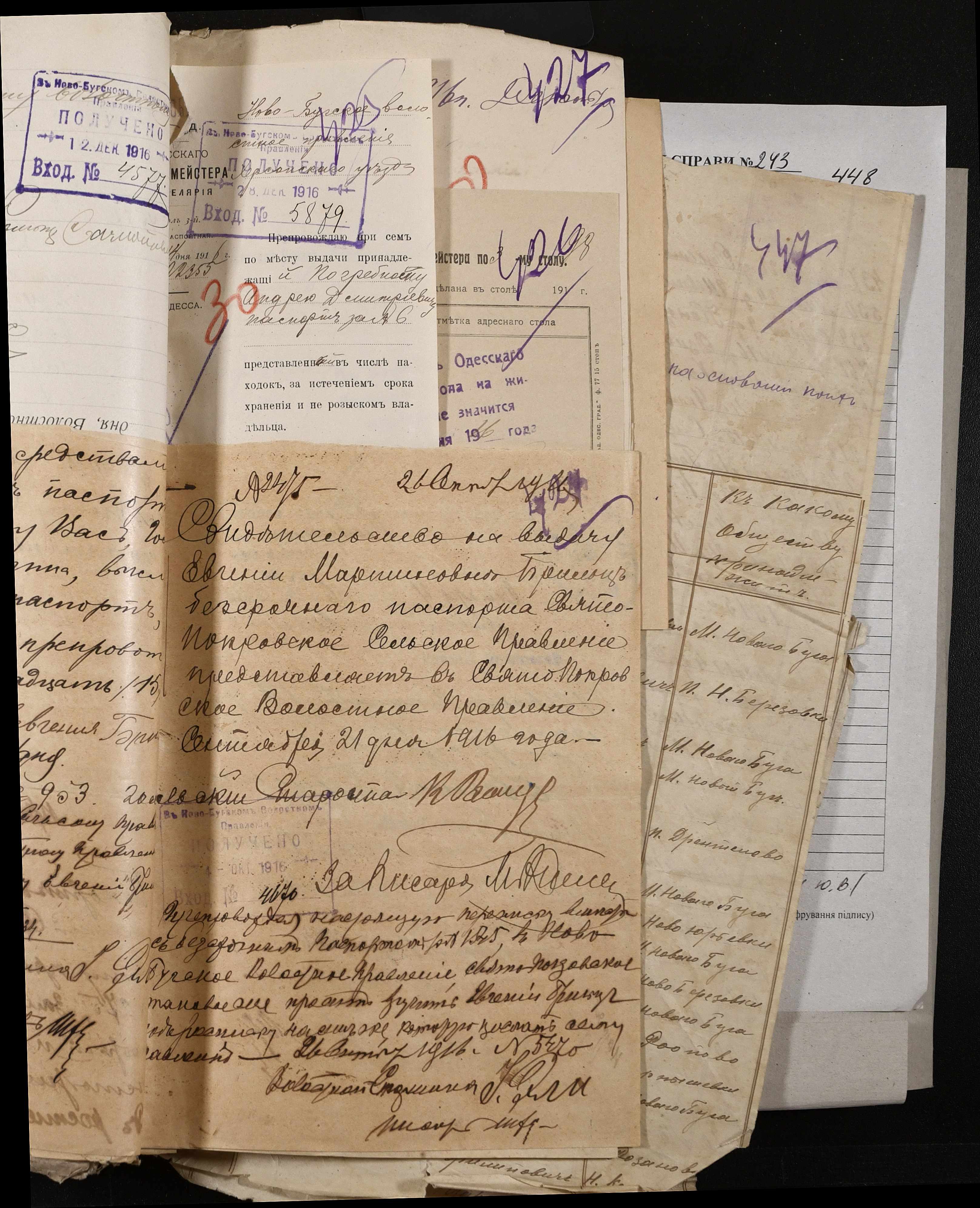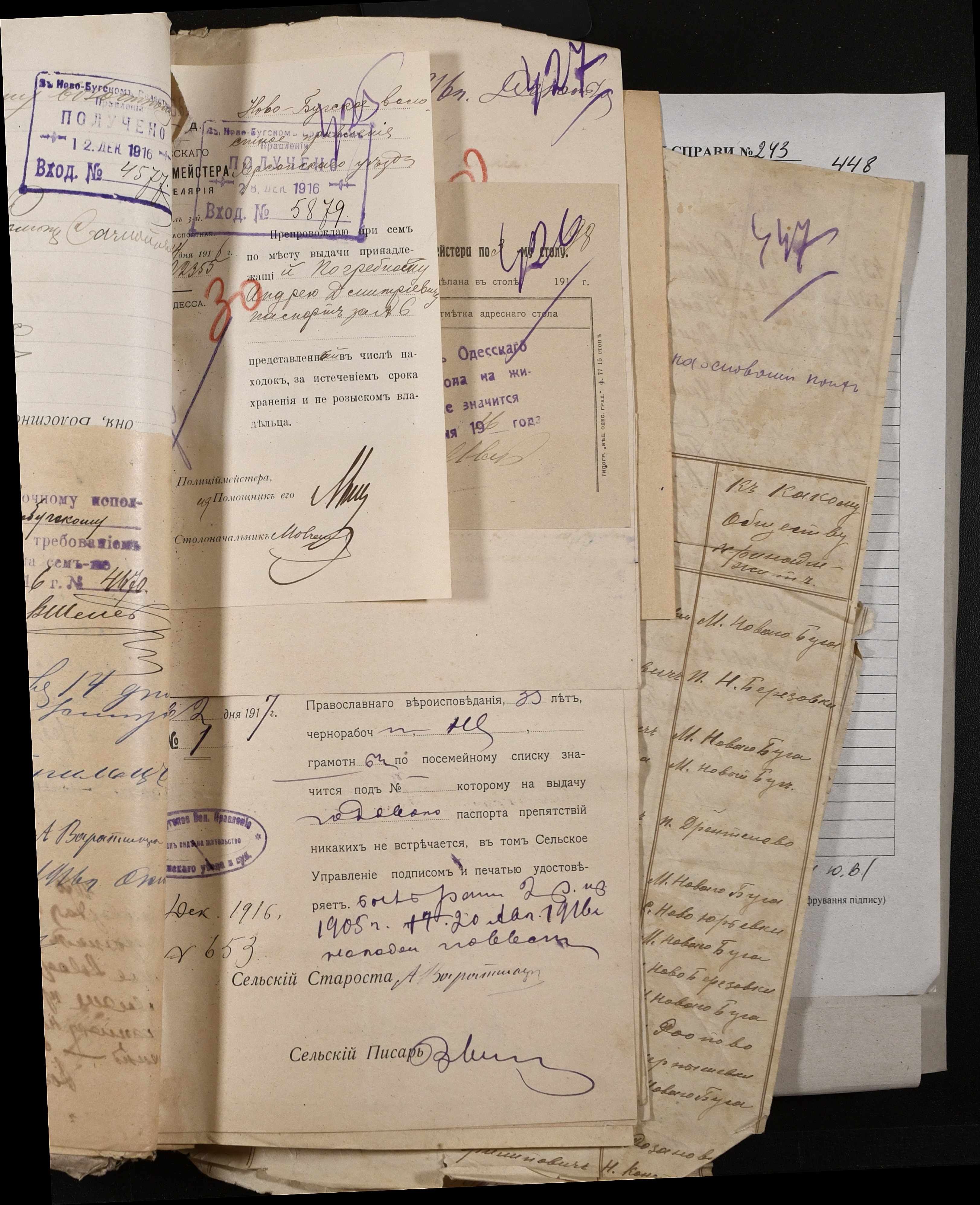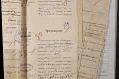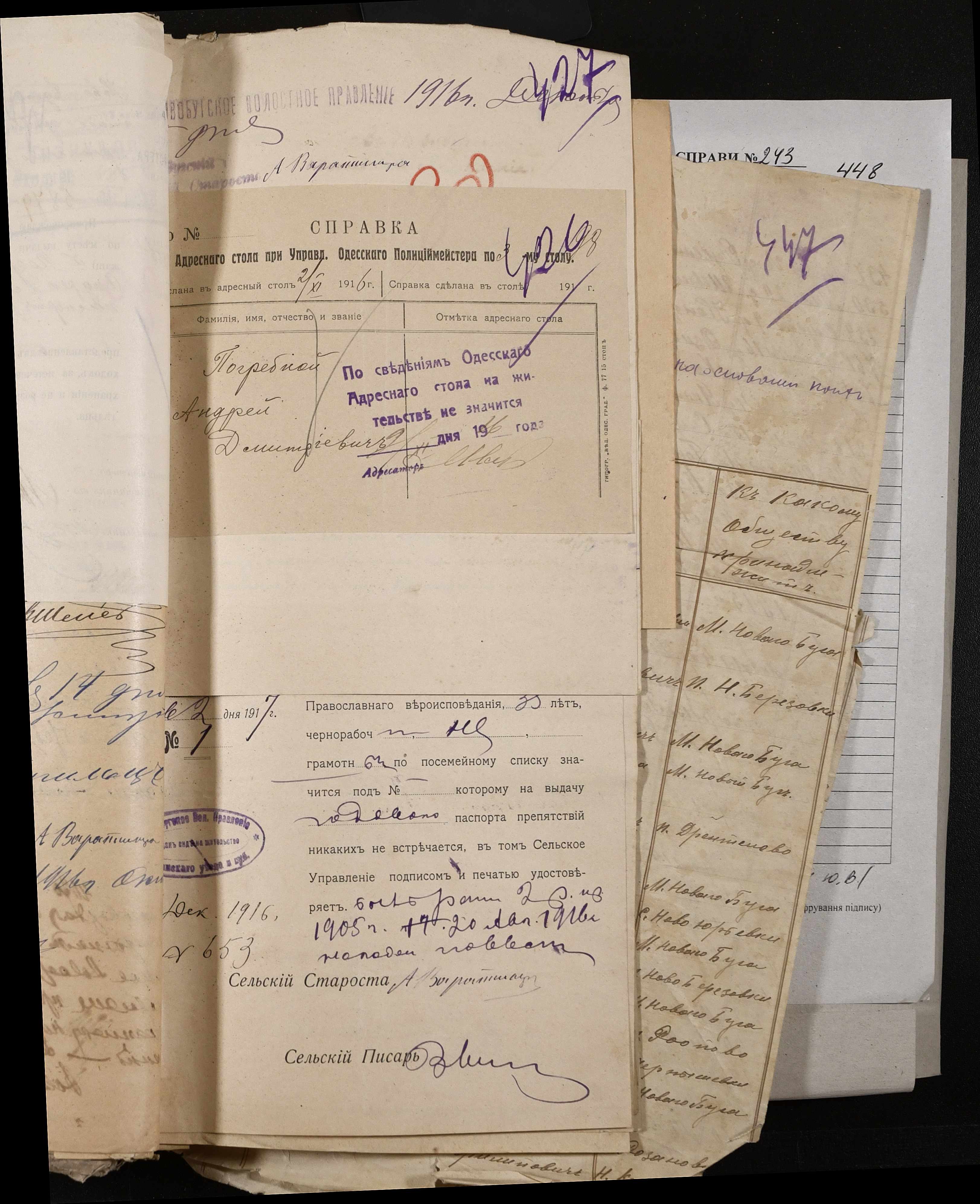 • • • • Справа № 243 “Відомості волосного правління про витрачені паспортні книжки у 1914-1915 роках, заяви та прохання громадян про видачу їм паспортів, листування з сільськими управліннями, рапорти та посвідчення, надані громадянам для отримання паспортів, посімейні списки”