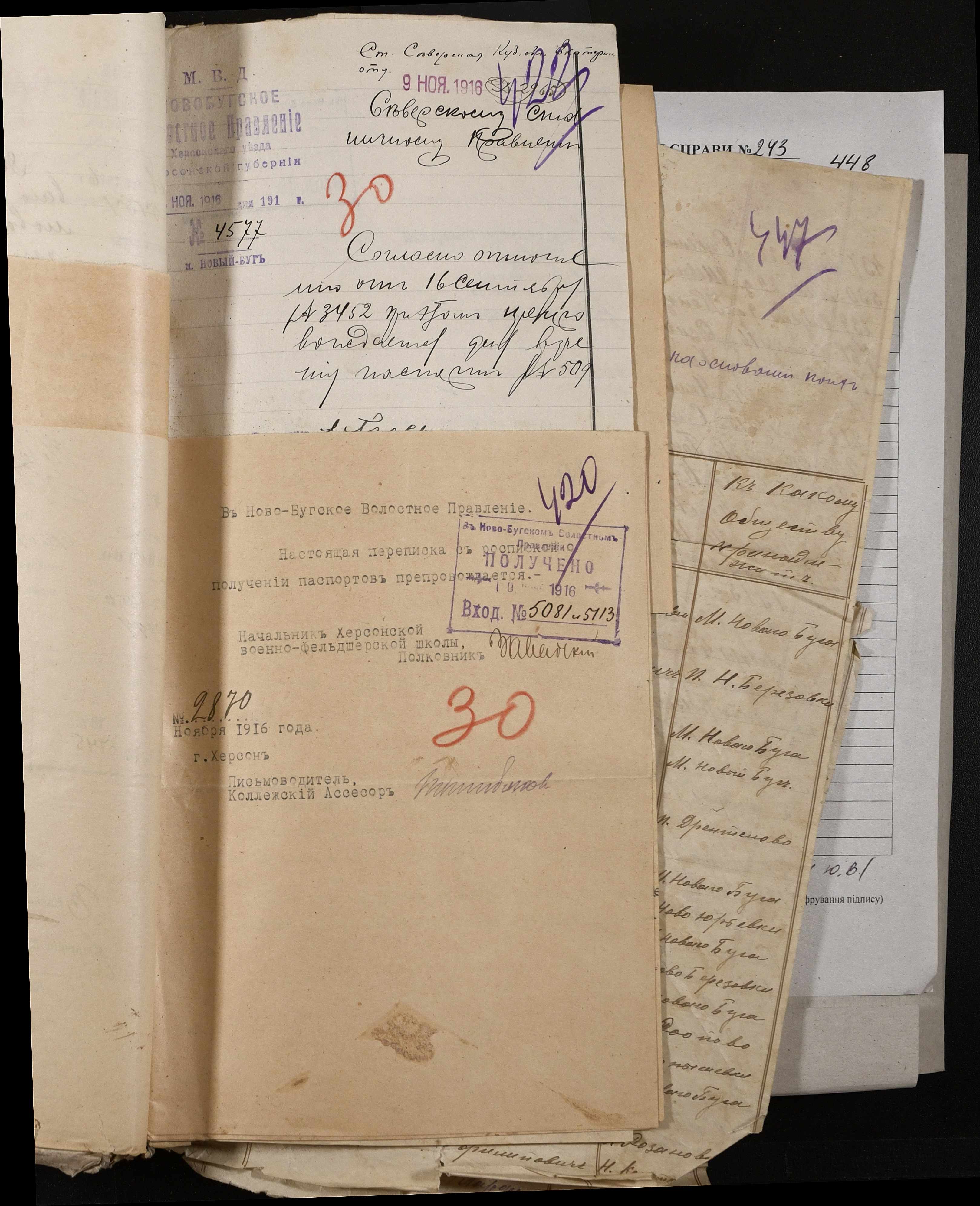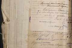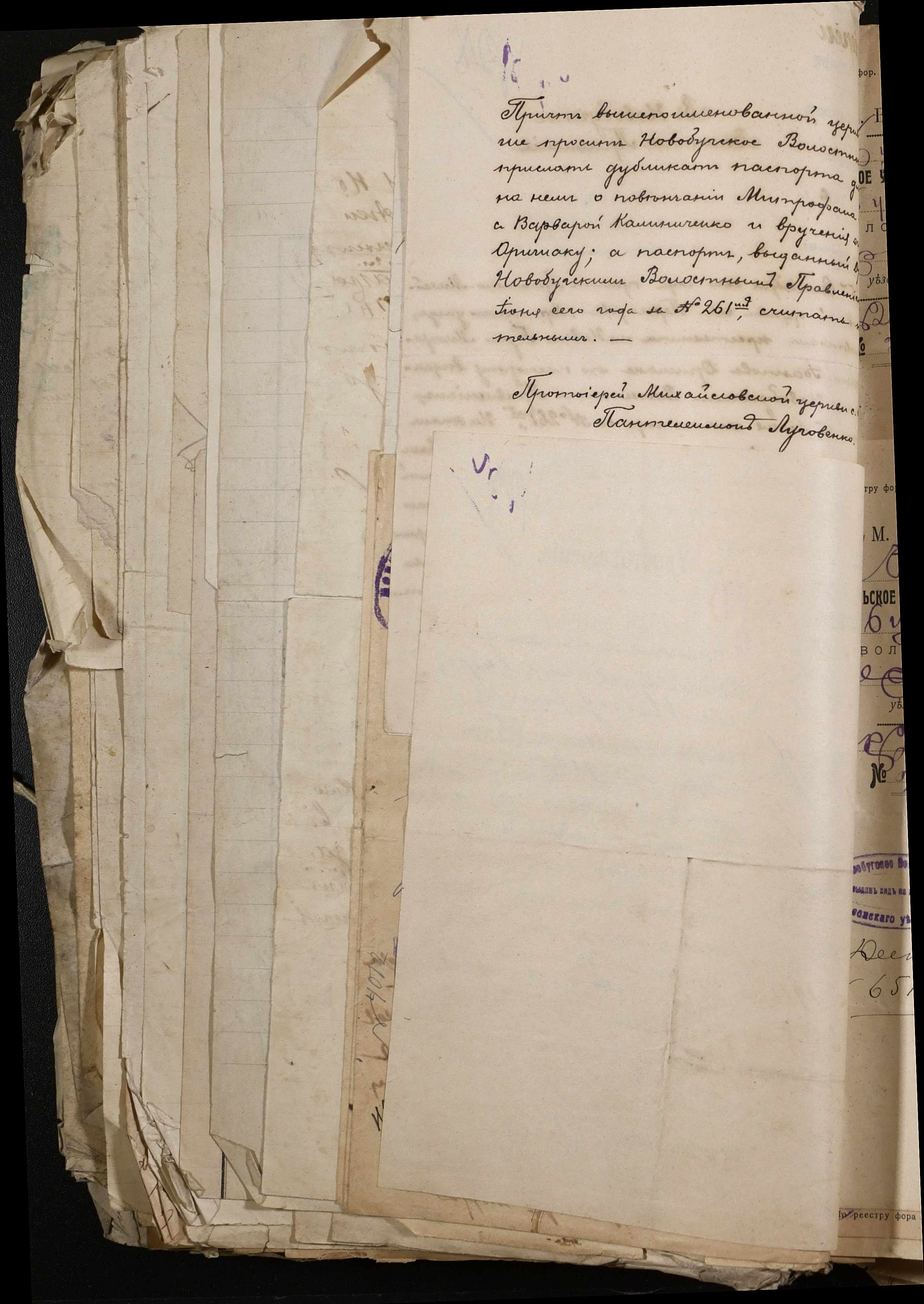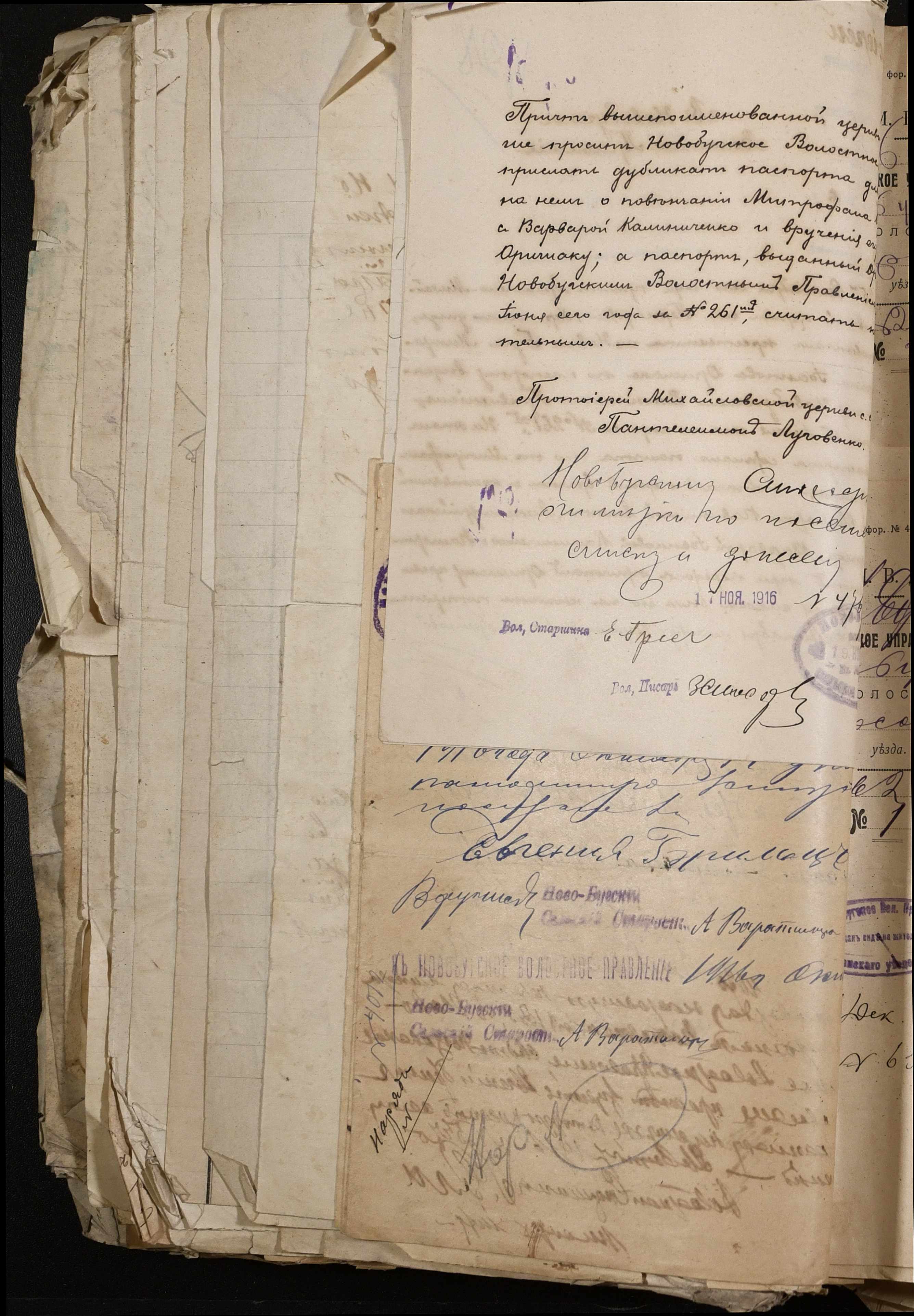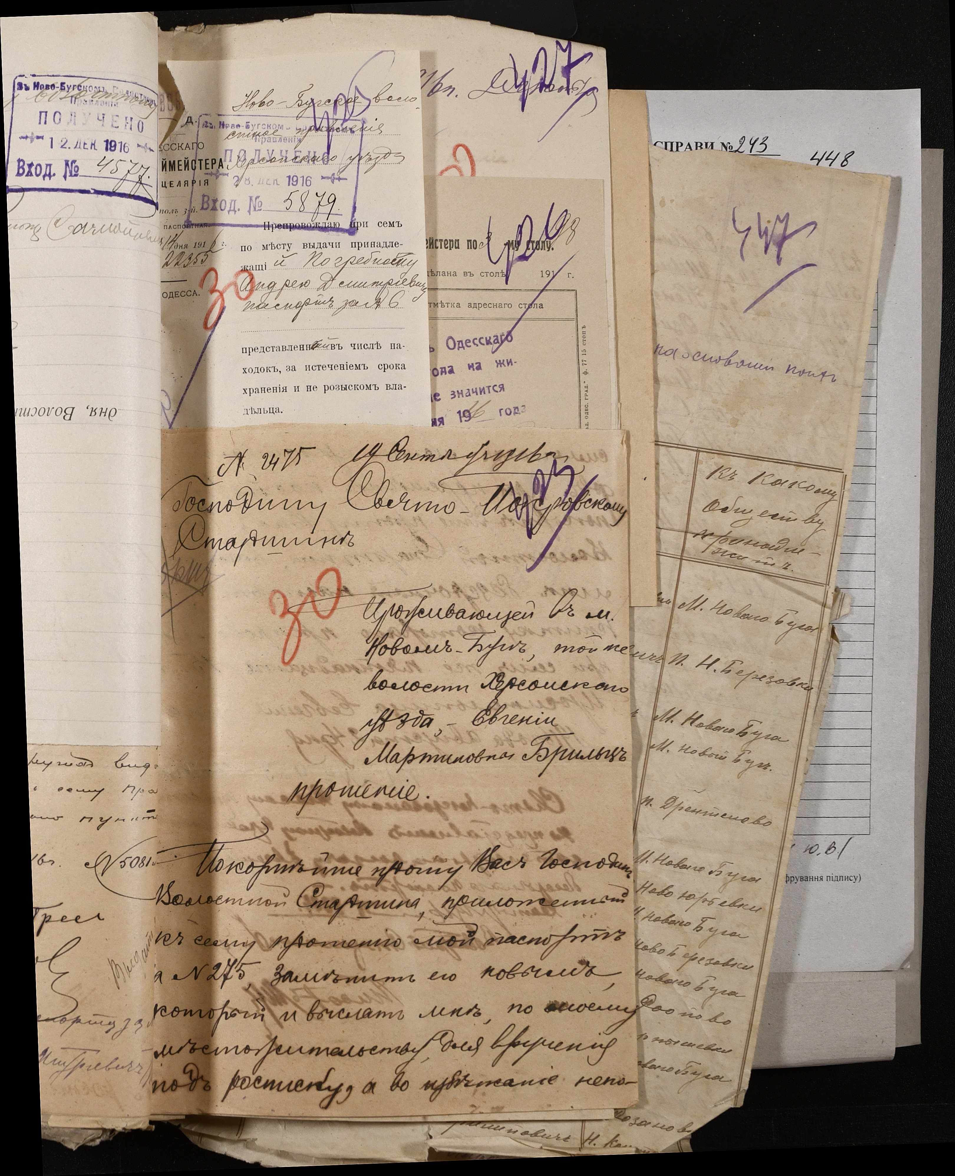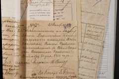 • • • • Справа № 243 “Відомості волосного правління про витрачені паспортні книжки у 1914-1915 роках, заяви та прохання громадян про видачу їм паспортів, листування з сільськими управліннями, рапорти та посвідчення, надані громадянам для отримання паспортів, посімейні списки”
