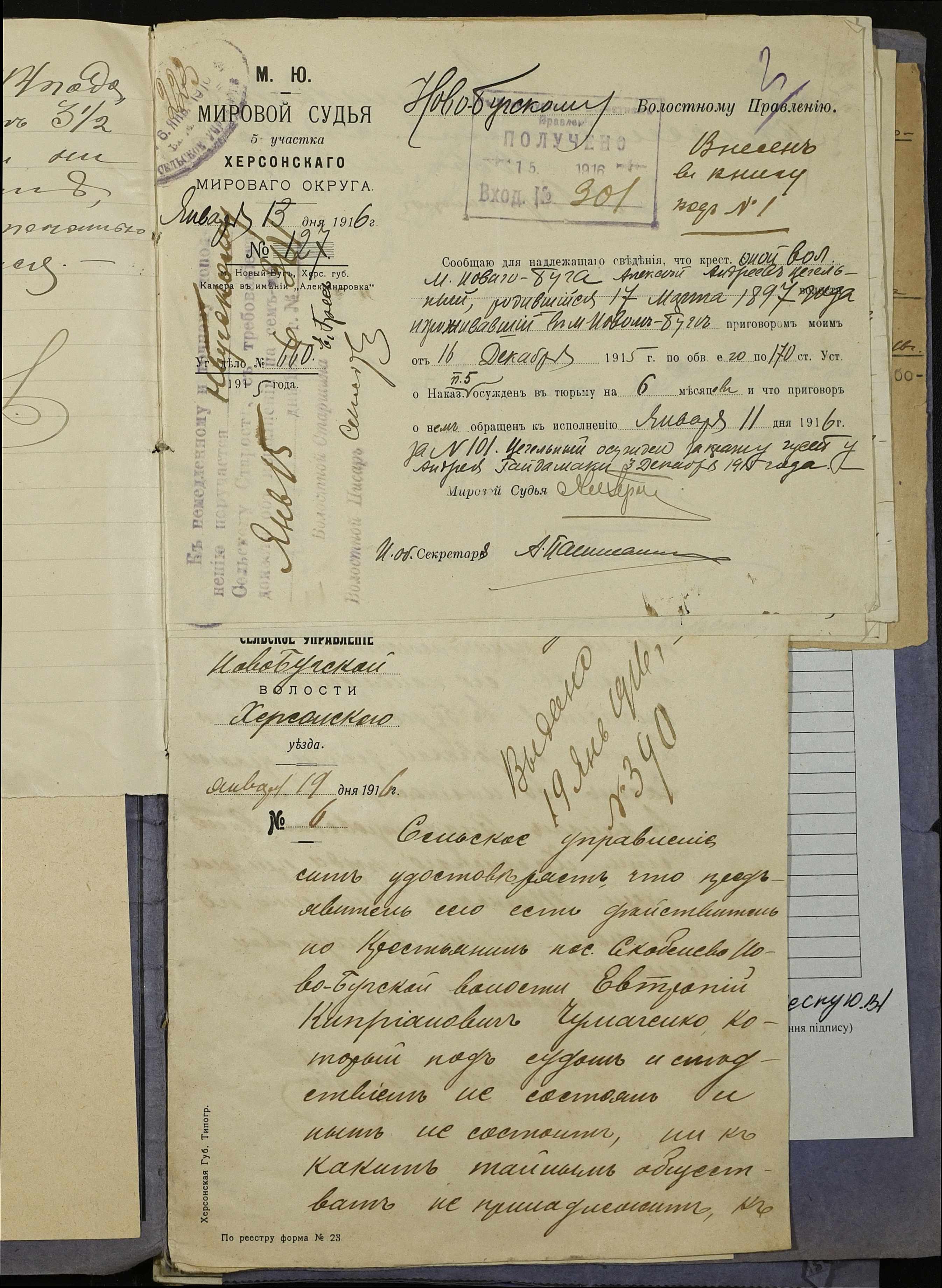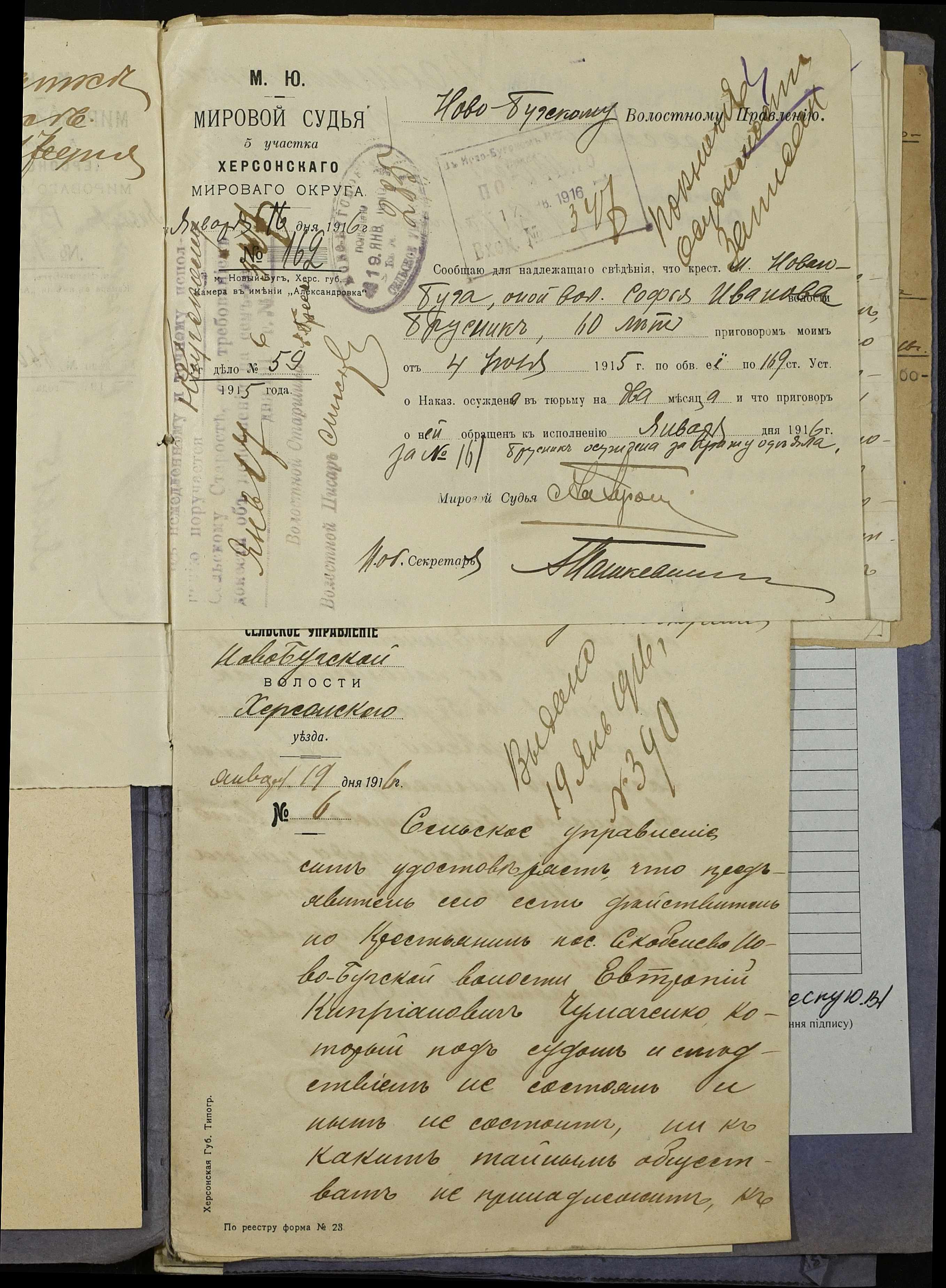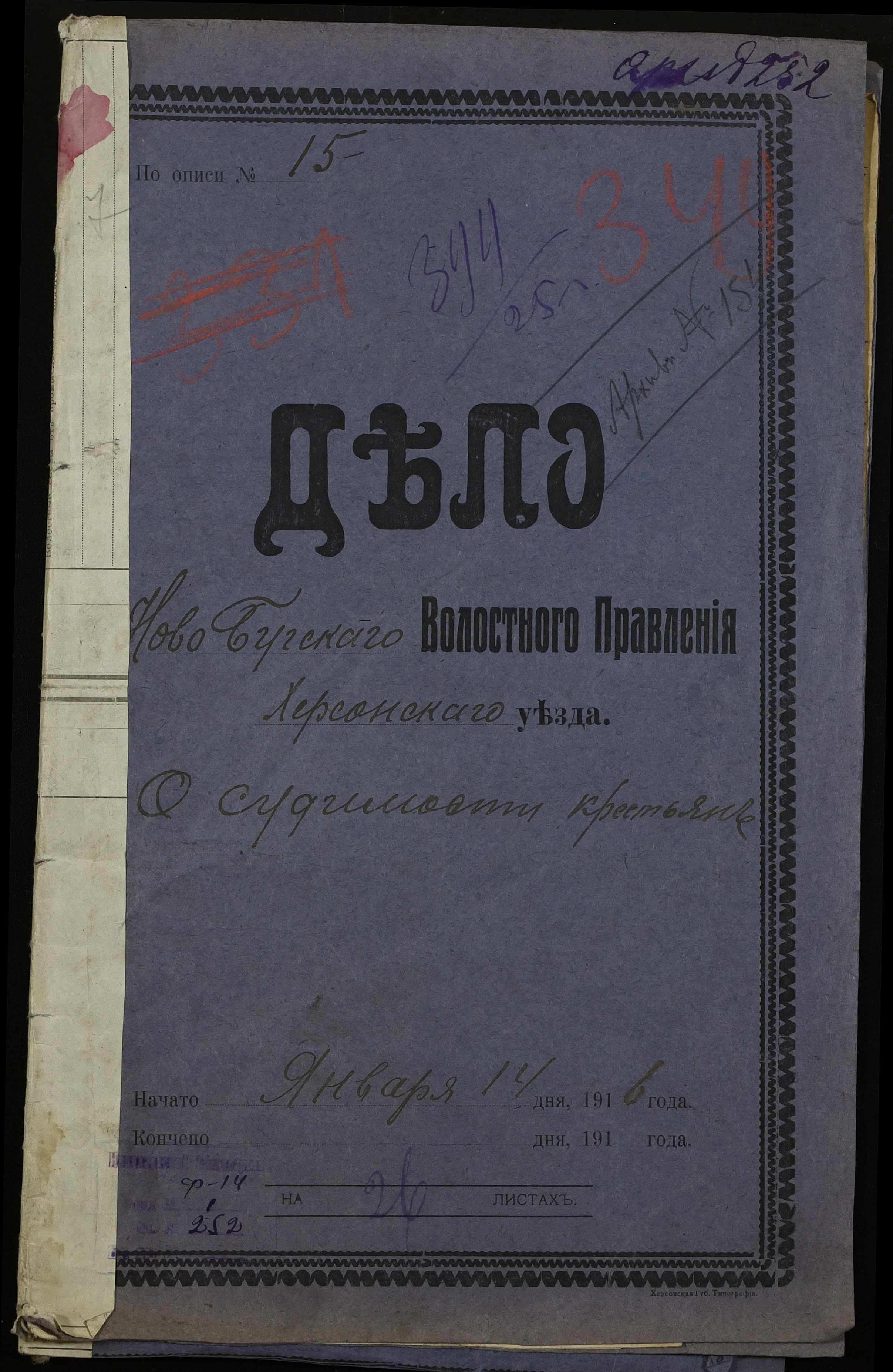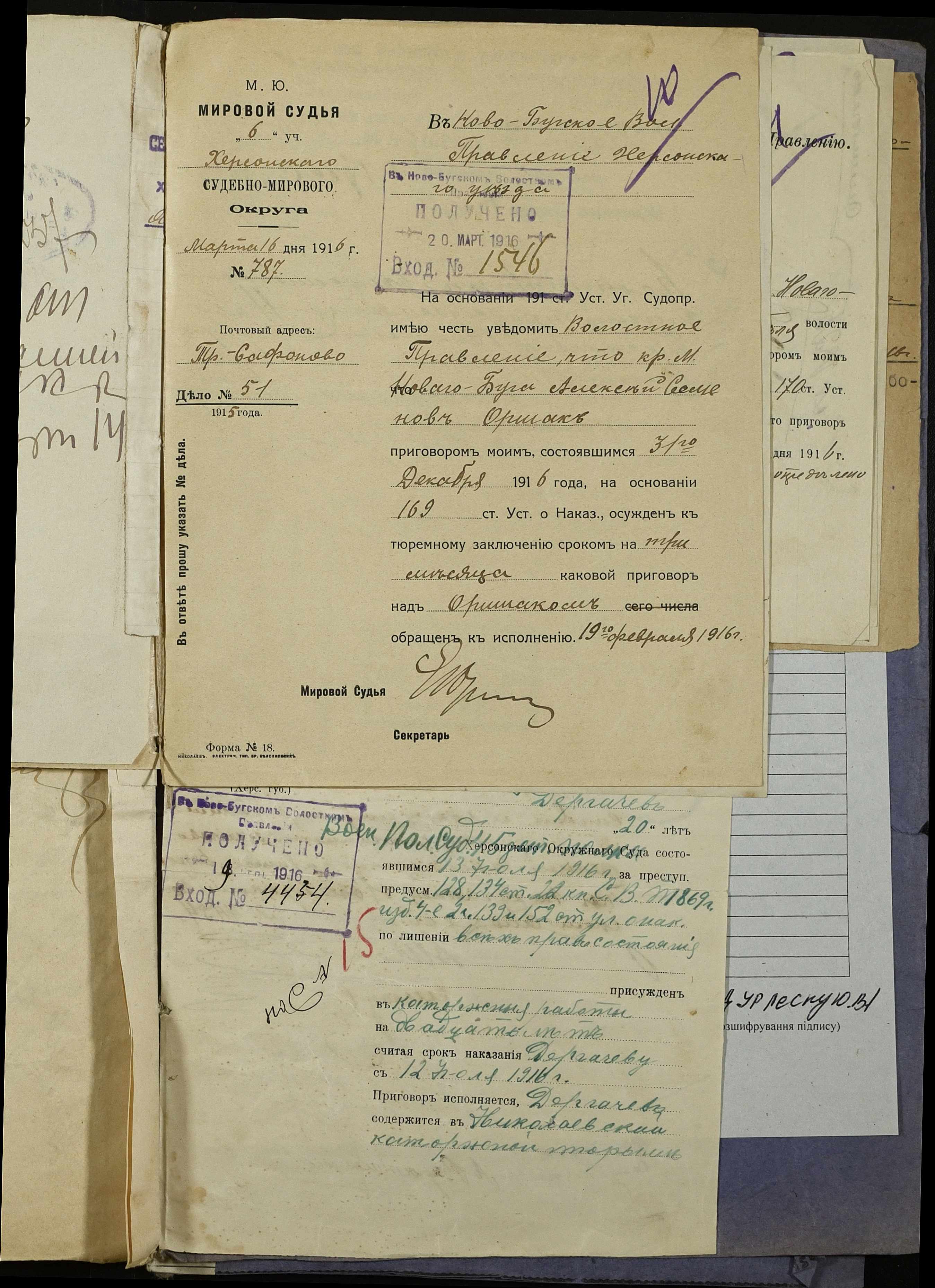 • • • • Справа № 252 “Повідомлення мирового судді 5-ої дільниці Херсонського мирового округу про засудження до тюремного ув’язнення селян м. Новий Буг Цегельного А.А., Кривобока І.С., Брусника С.І. та інш.”