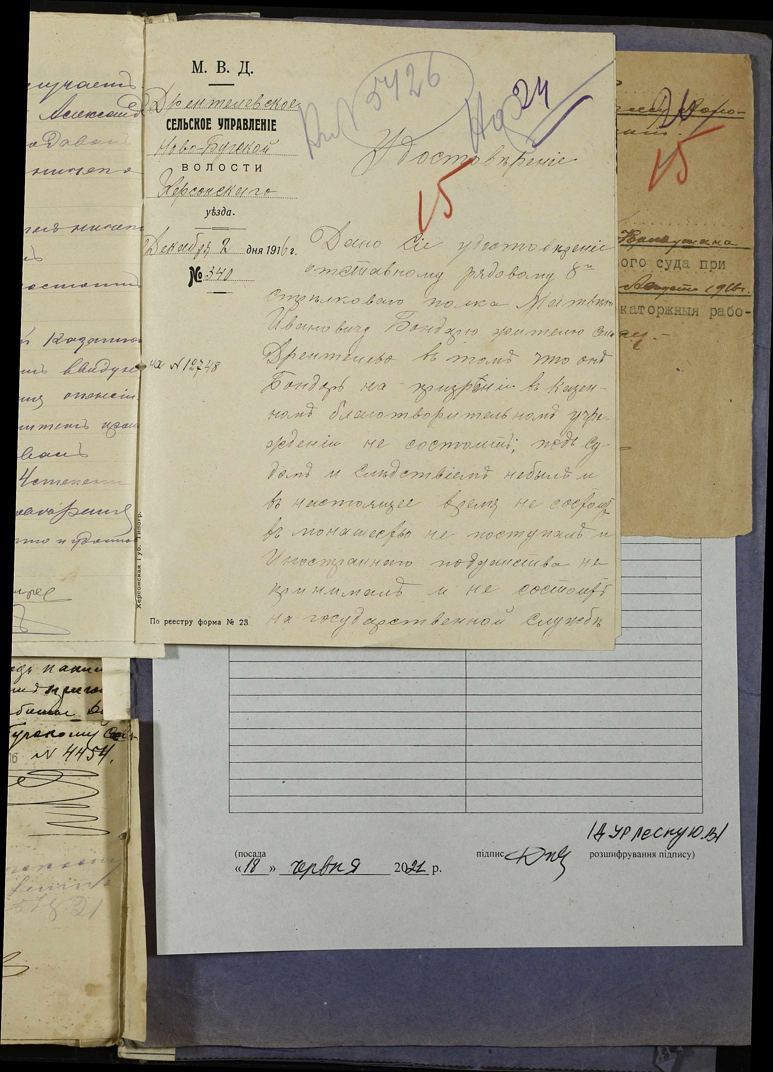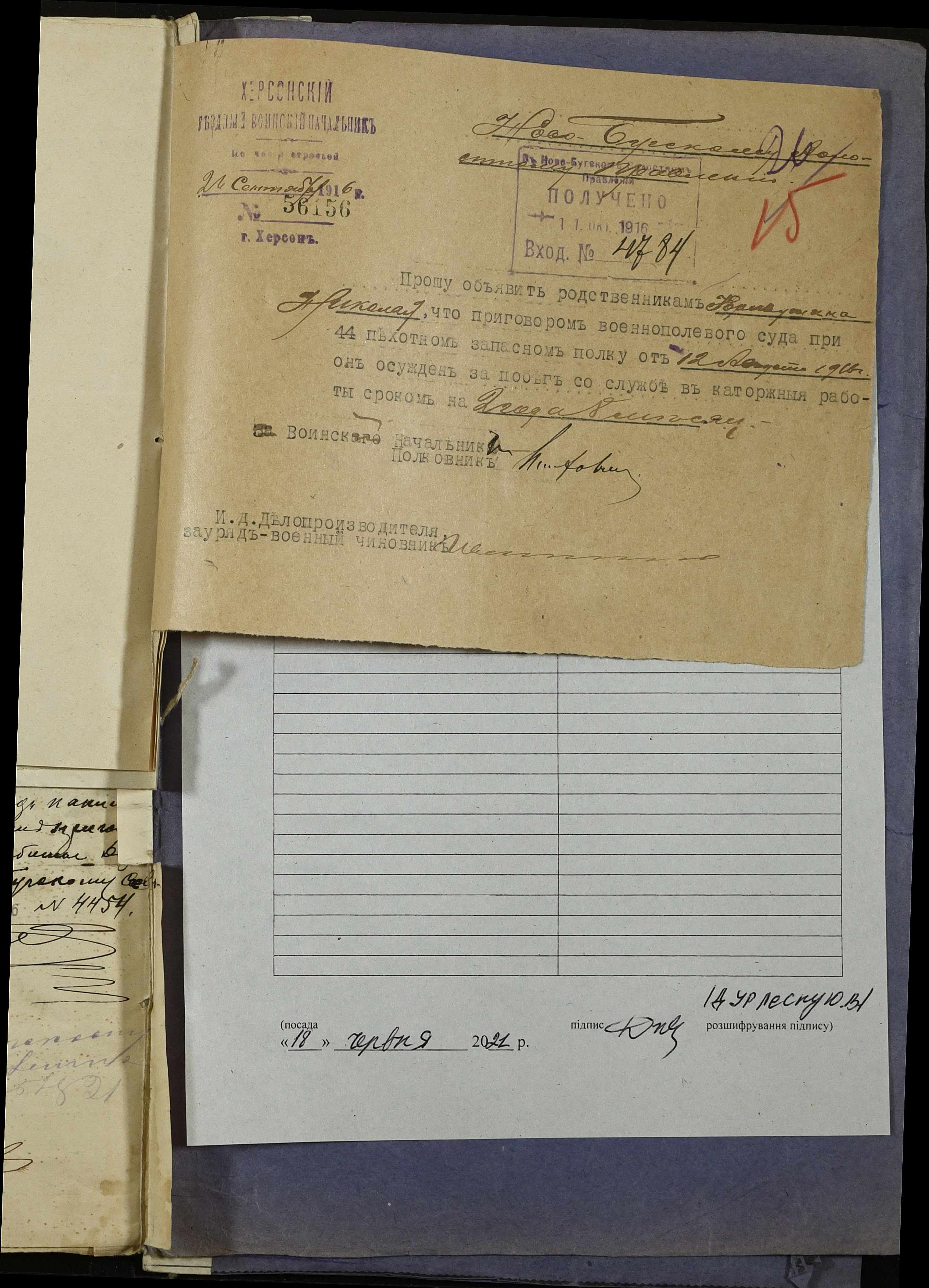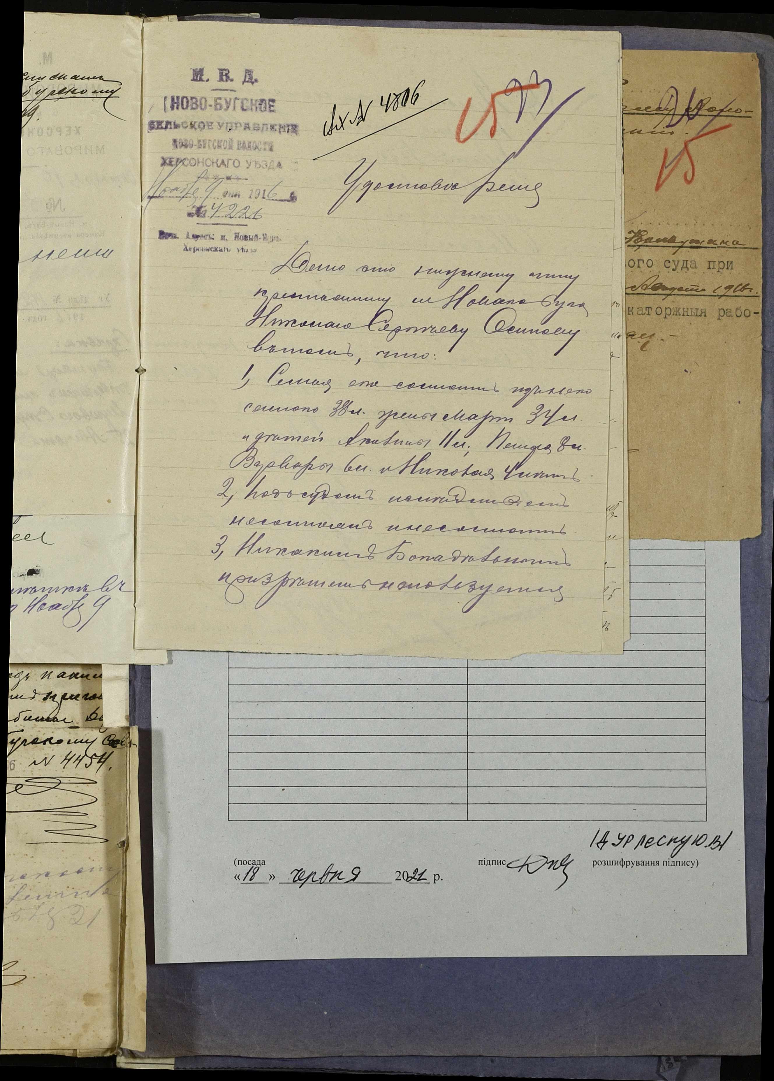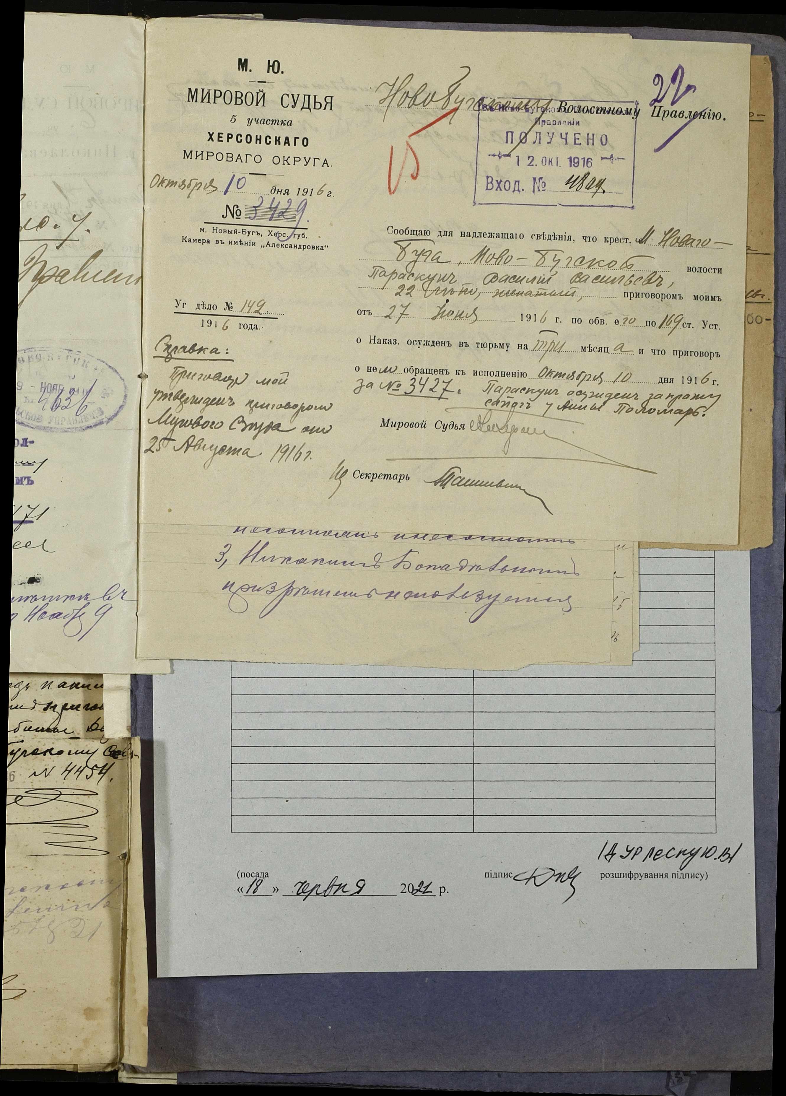 • • • • Справа № 252 “Повідомлення мирового судді 5-ої дільниці Херсонського мирового округу про засудження до тюремного ув’язнення селян м. Новий Буг Цегельного А.А., Кривобока І.С., Брусника С.І. та інш.”