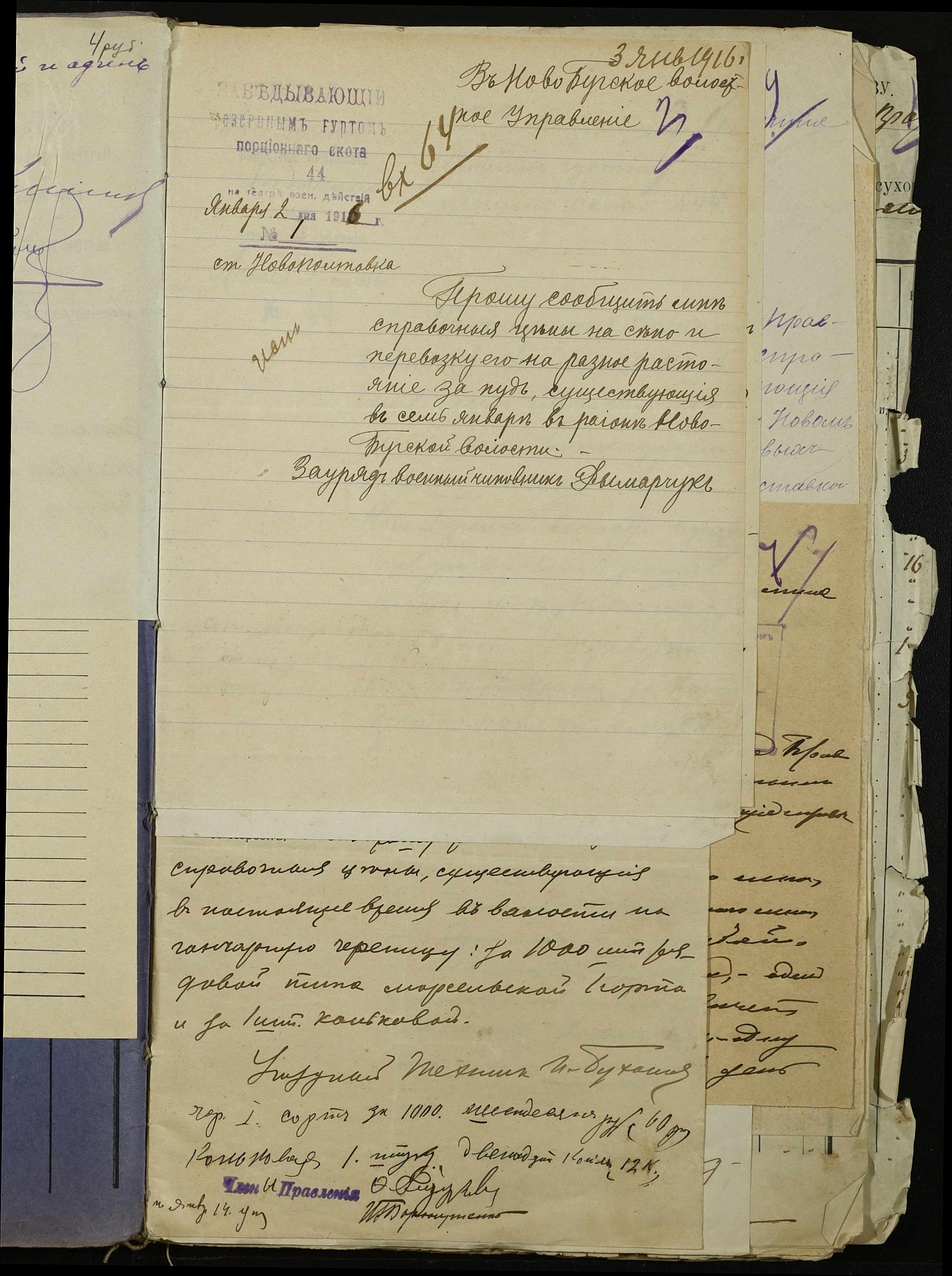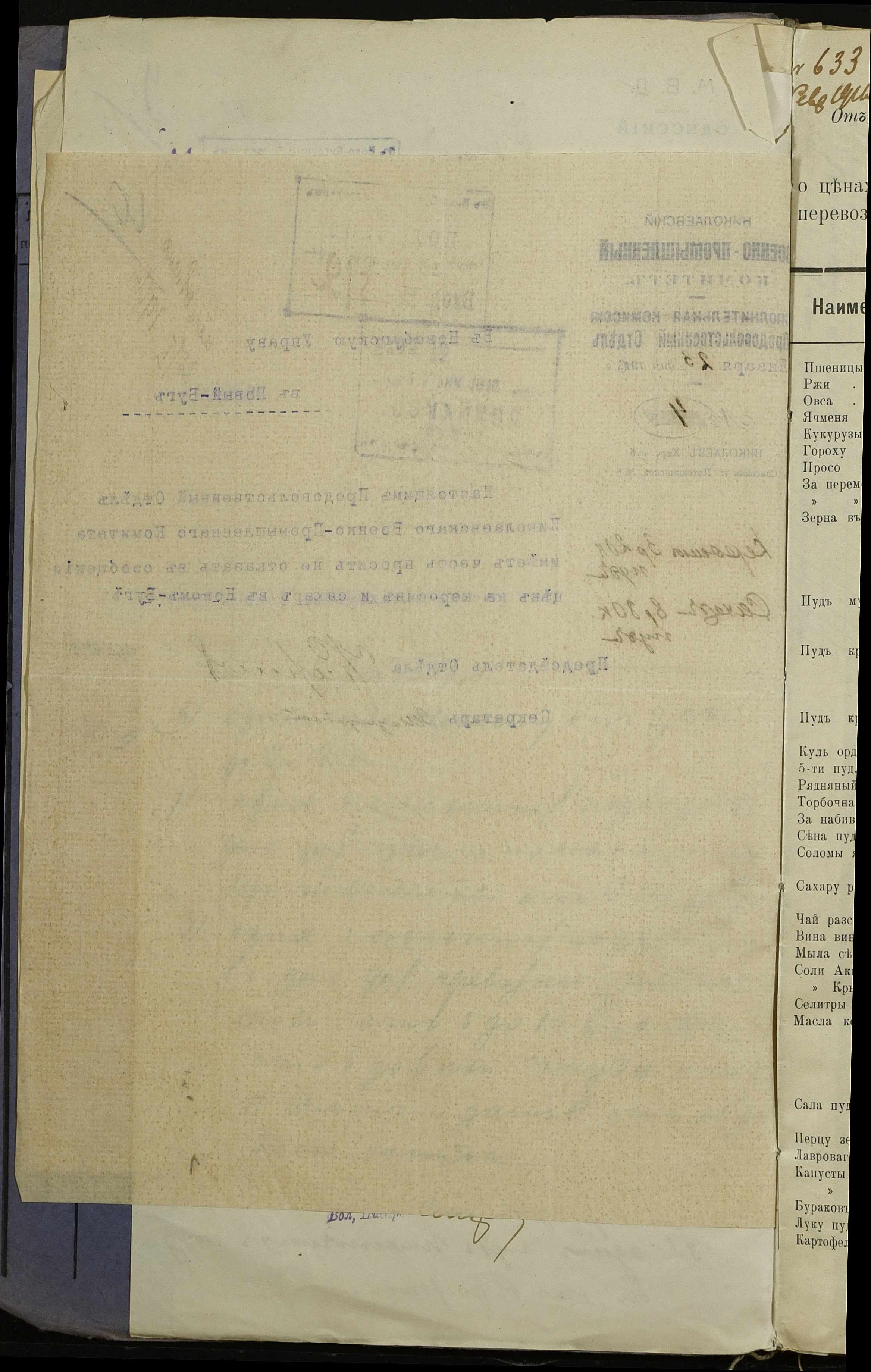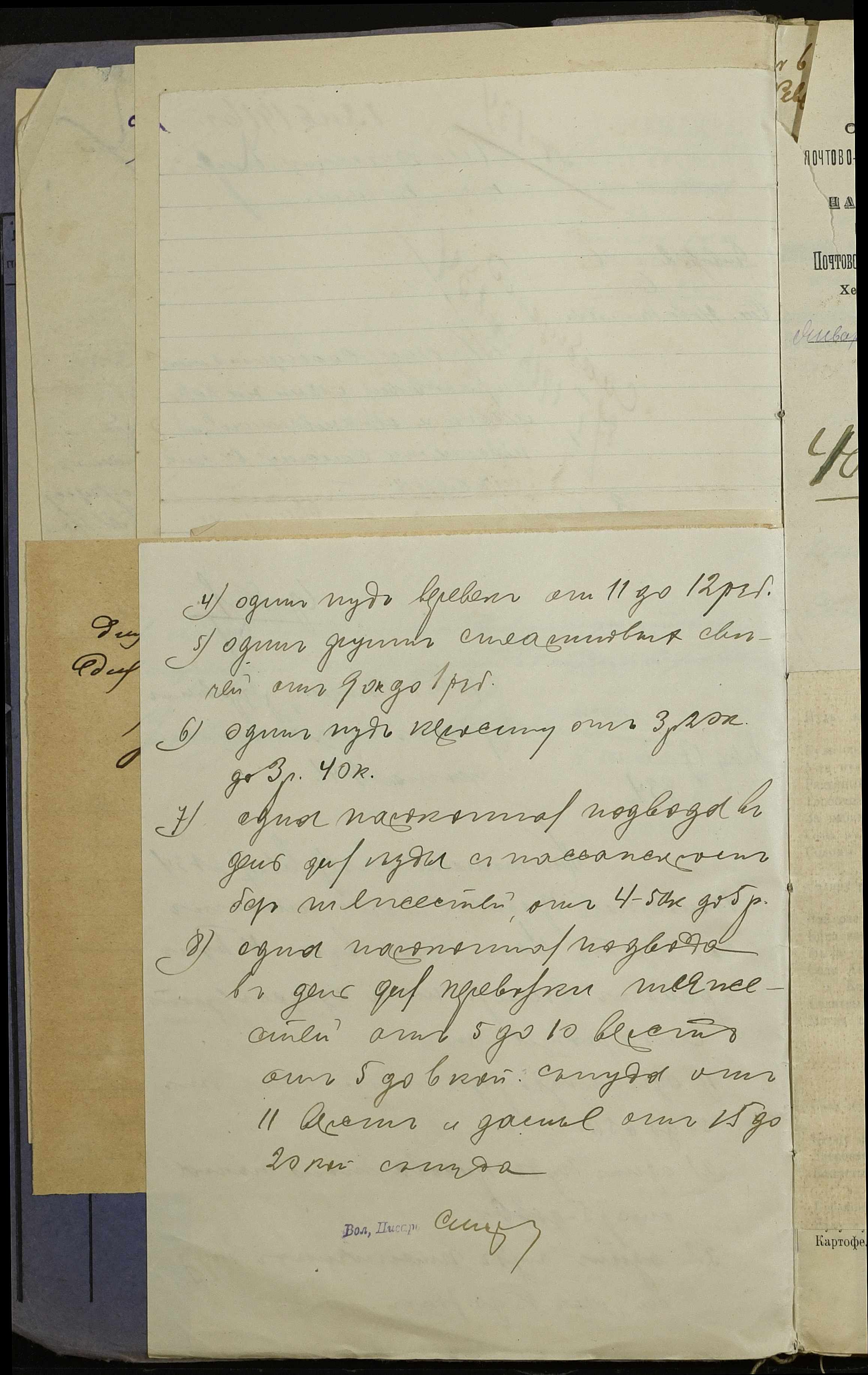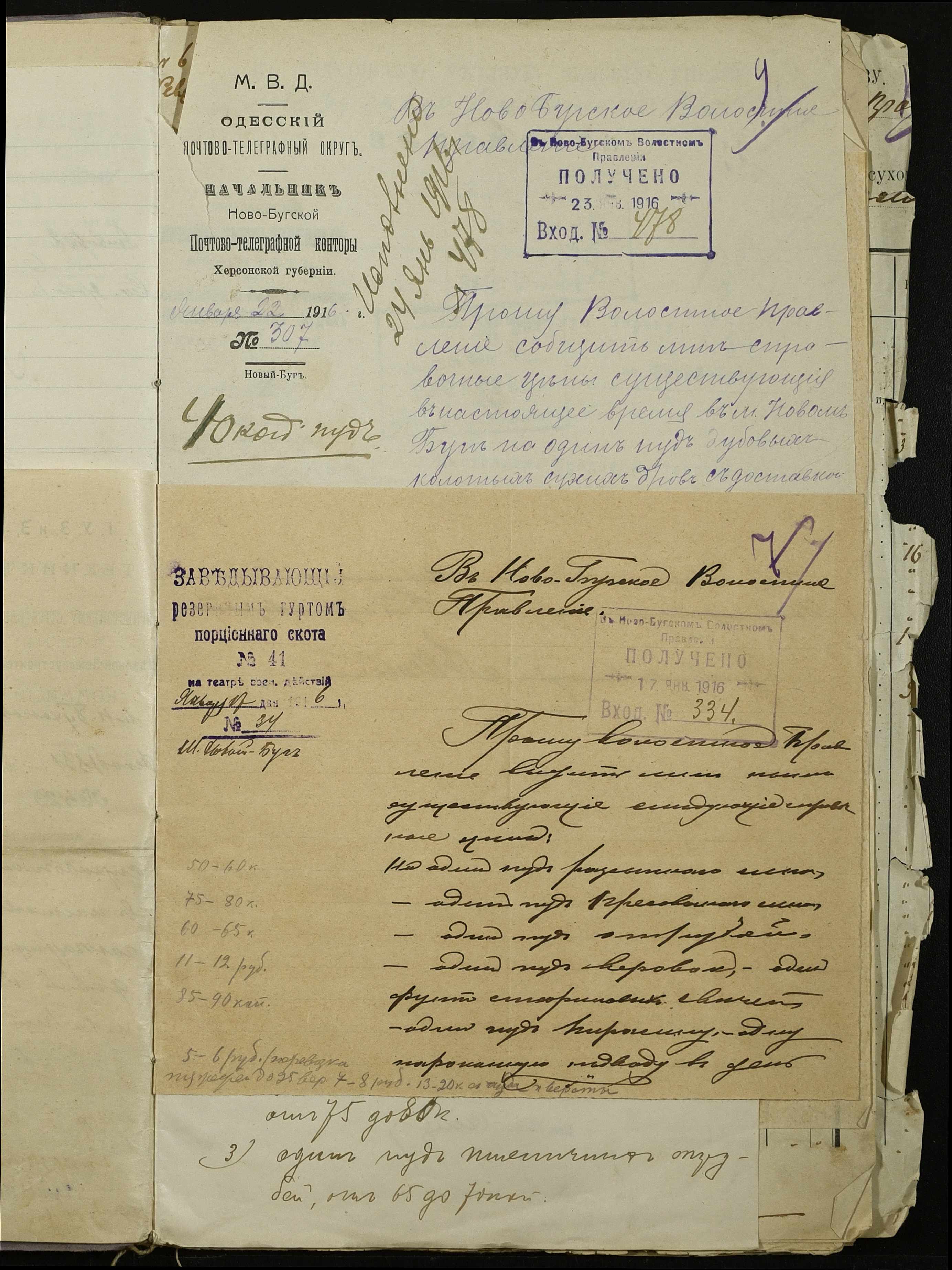 • • • • Справа № 254 “Листування з поштово-телеграфною конторою, завідувачем резервним гуртом порційної худоби, з продовольчим відділом та іншими установами про ціни на продовольство та фураж, відомості про ціни на провіант, фураж та інші припаси, про сухопутні перевезення у волості”