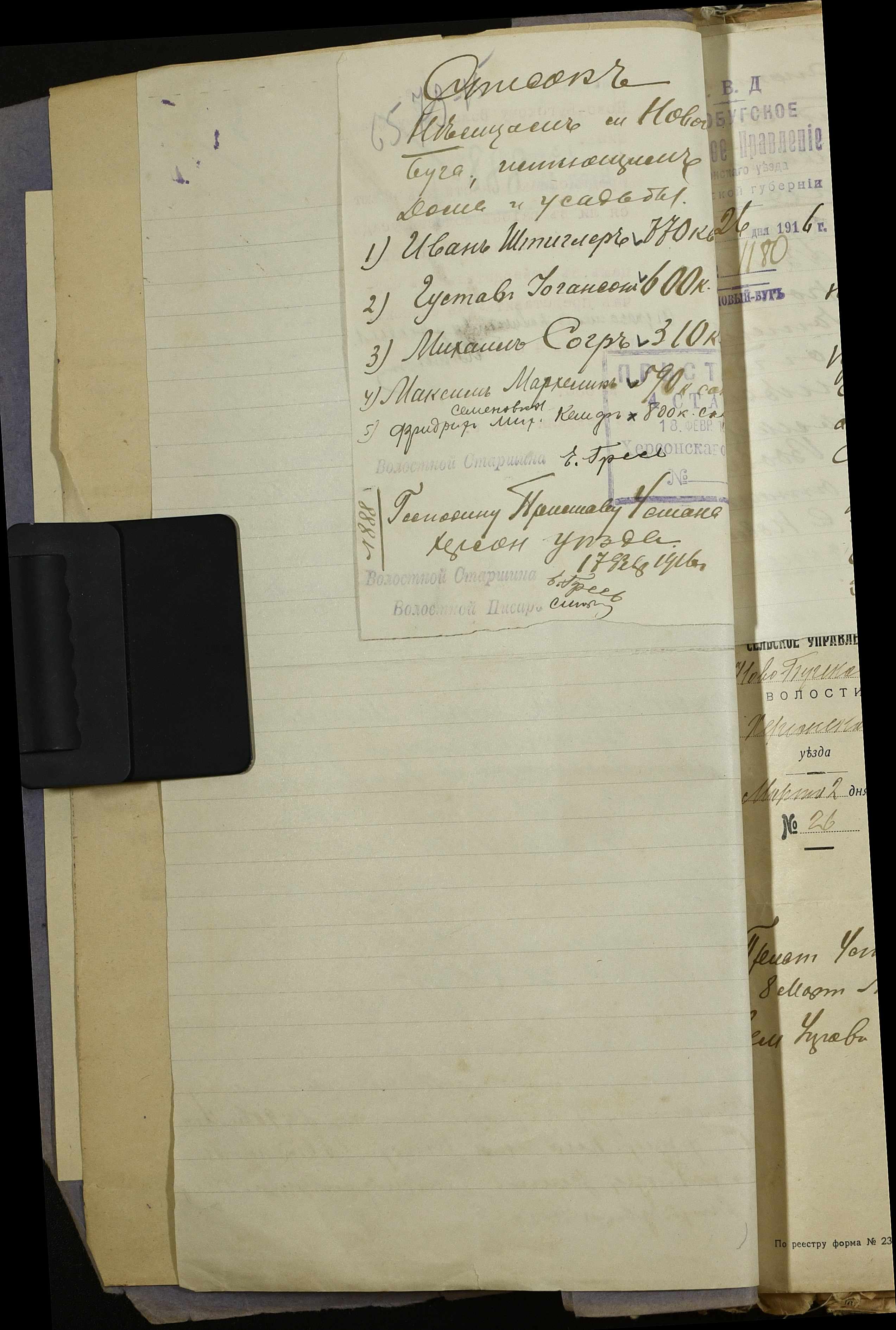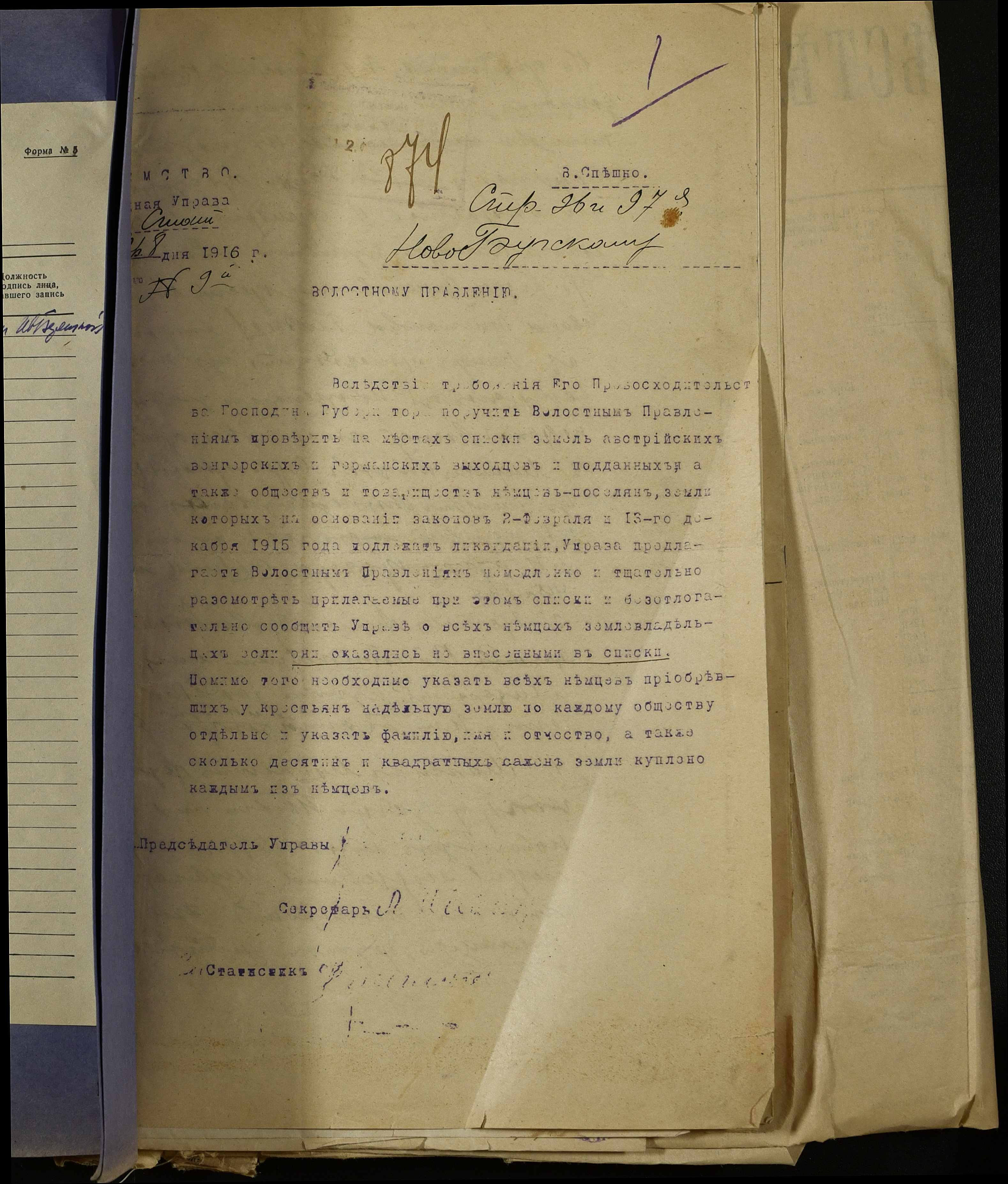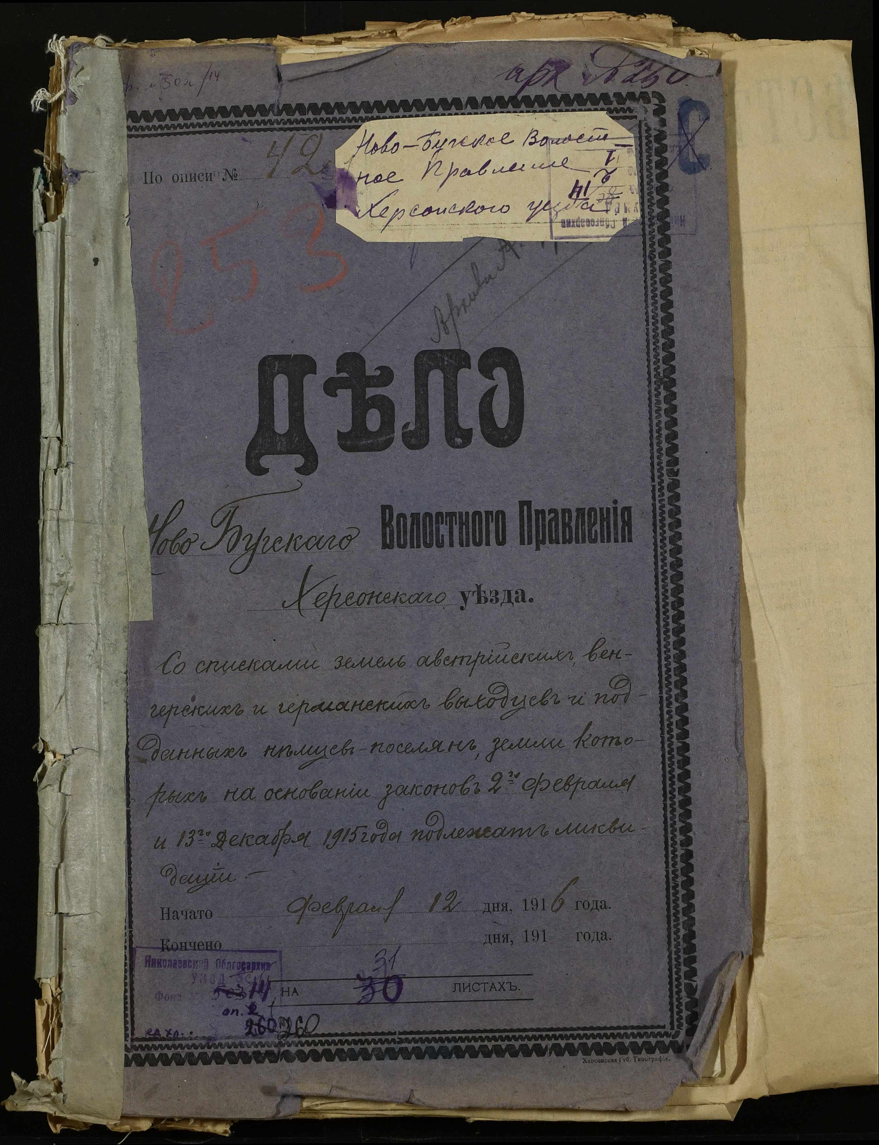 • • • • Справа № 260 “Розпорядження Херсонської повітової управи про ліквідацію (на підставі Законів від 02 лютого та 13 грудня 1915 року) землеволодінь австрійських, угорських, німецьких та турецьких підданих, товариств німців-поселян, листування з цього питання з сільськими управліннями, списки іноземних підданих (є Херсонські губернські відомості №108 від 10.10.1916 та № 42 від 19.04.1915)”