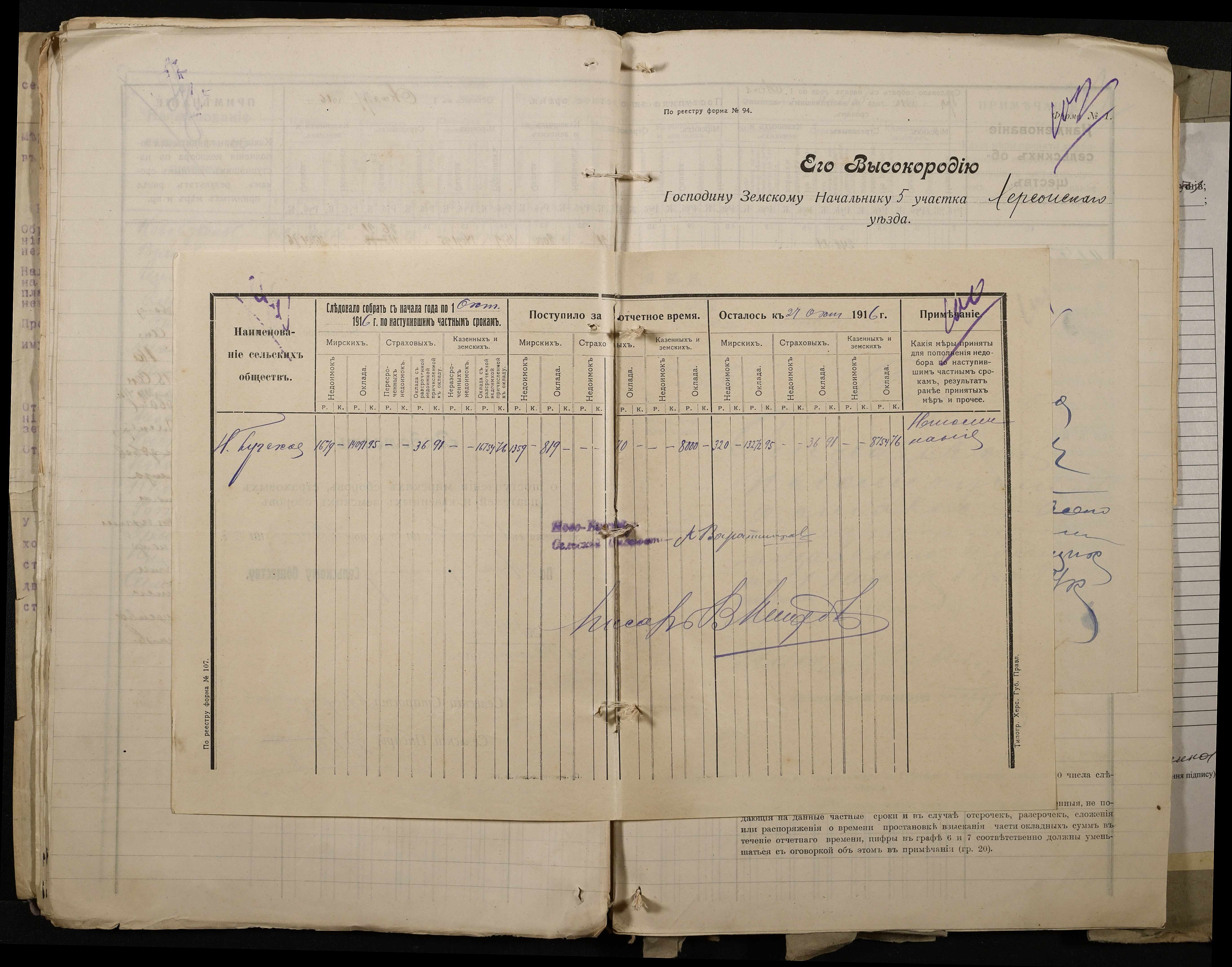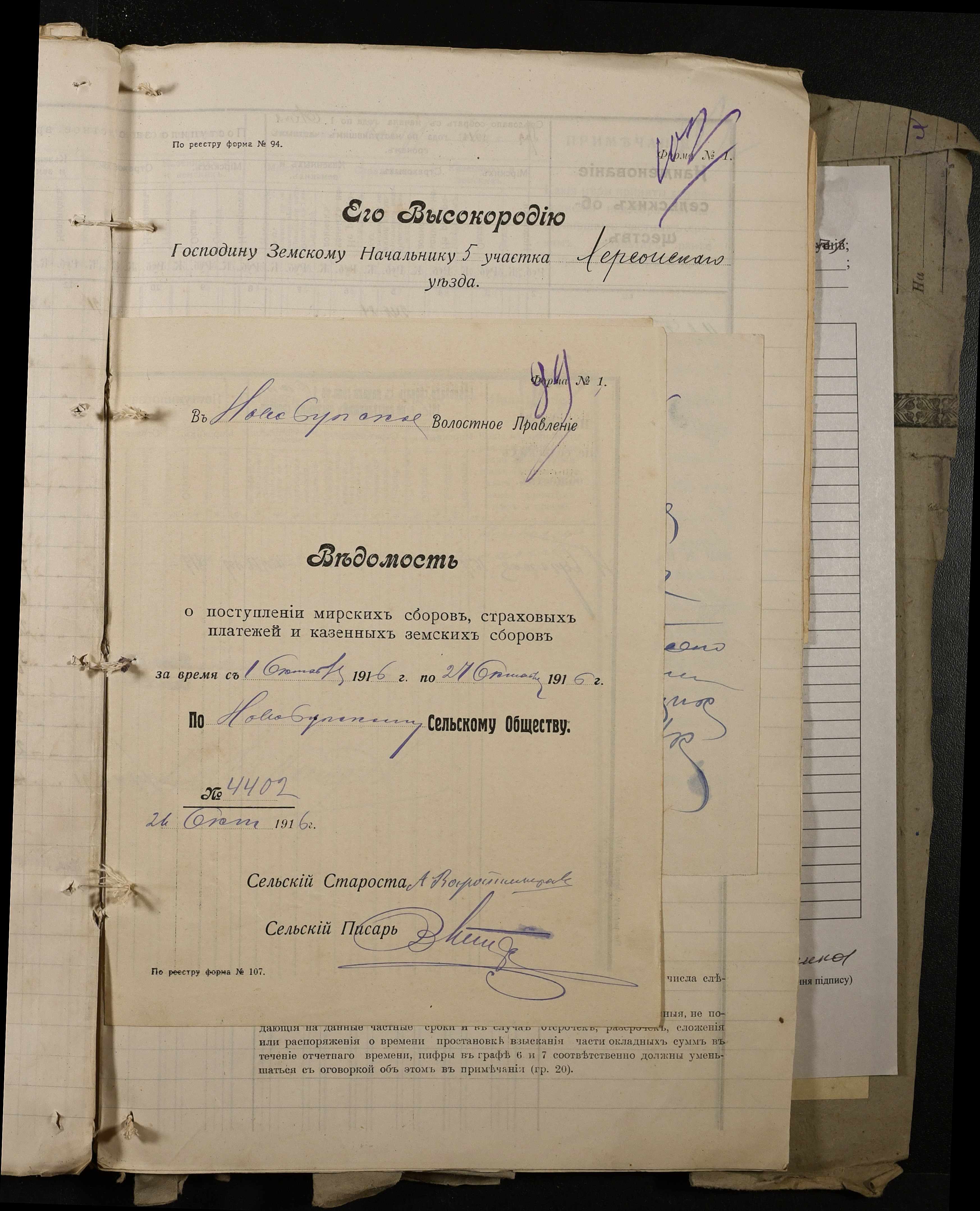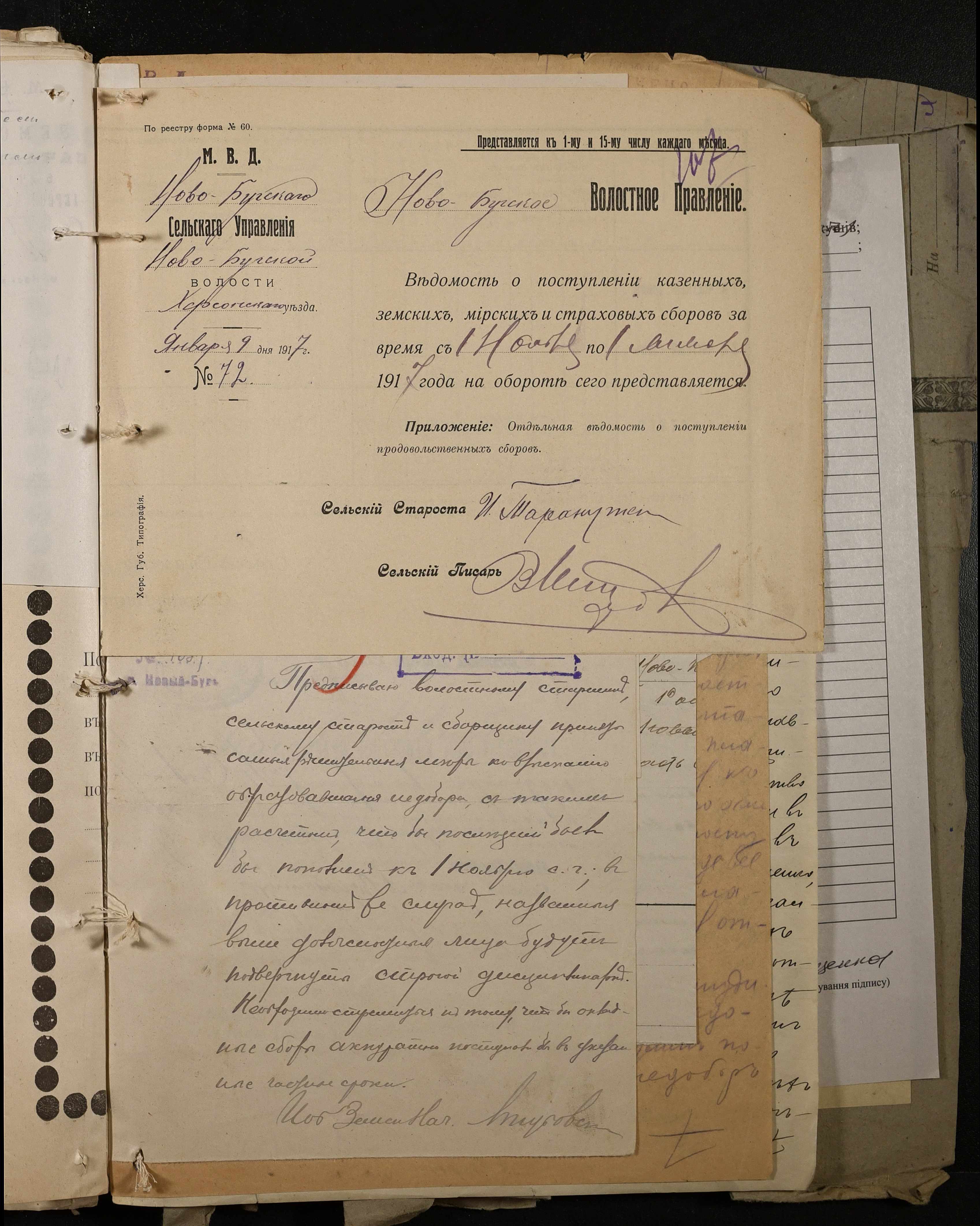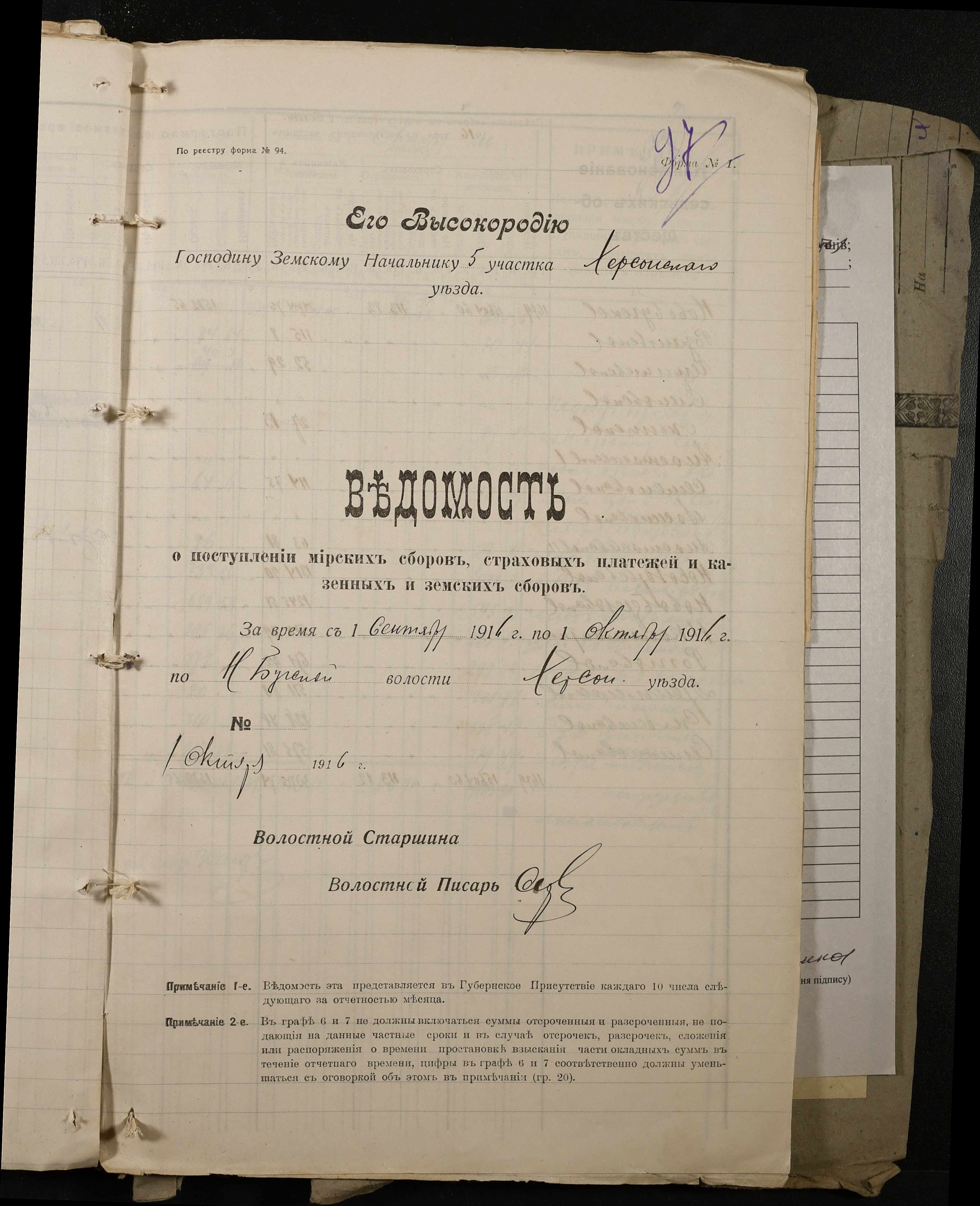 • • • • Справа № 266 “Листування з Херсонським повітовим податним інспектором та сільськими старостами волості про стан мирських зборів, присуди та розкладкові збори сільських товариств волості, звітні відомості про надходження мирських зборів, страхових платежів та казенних земських зборів по сільських товариствах волості”