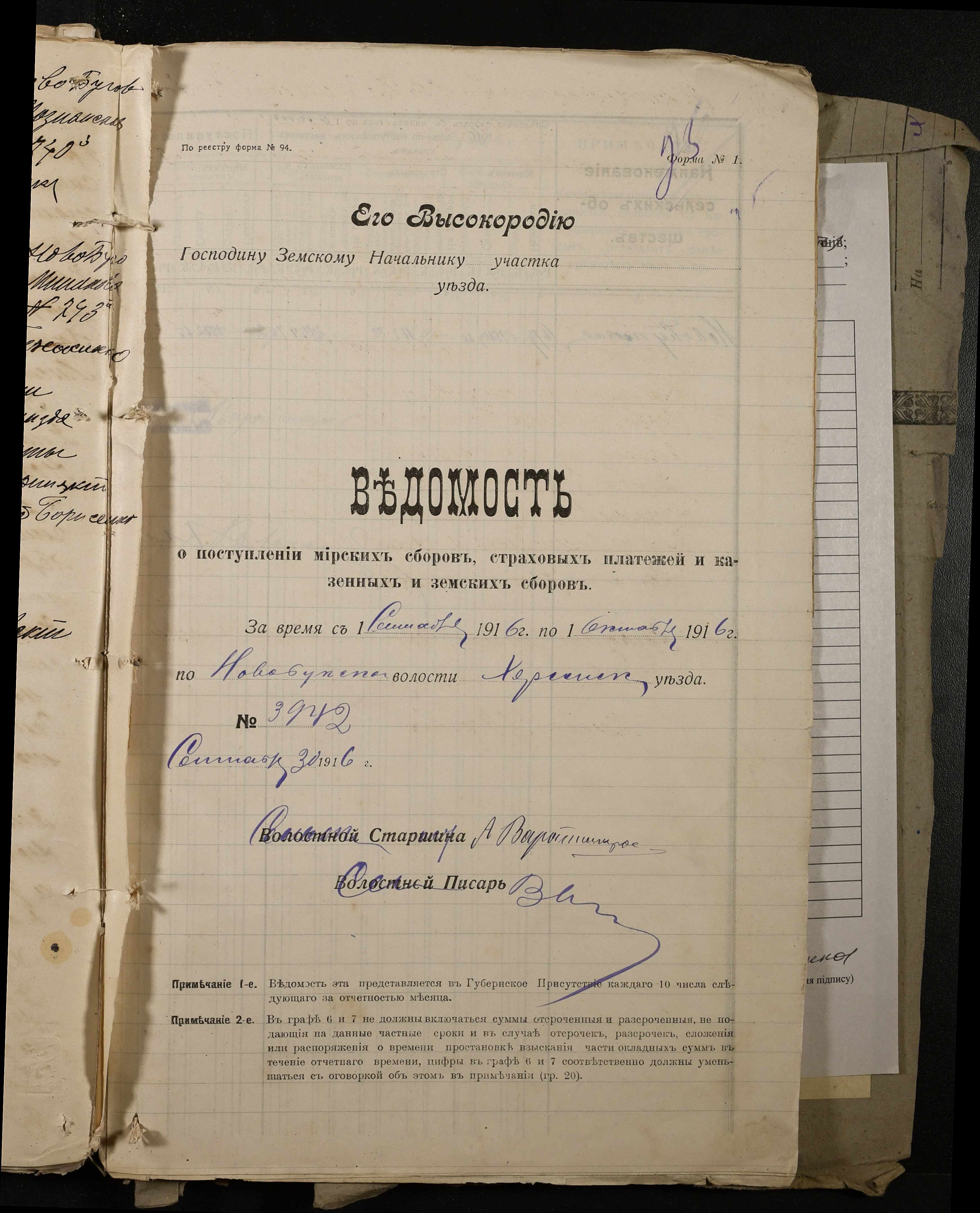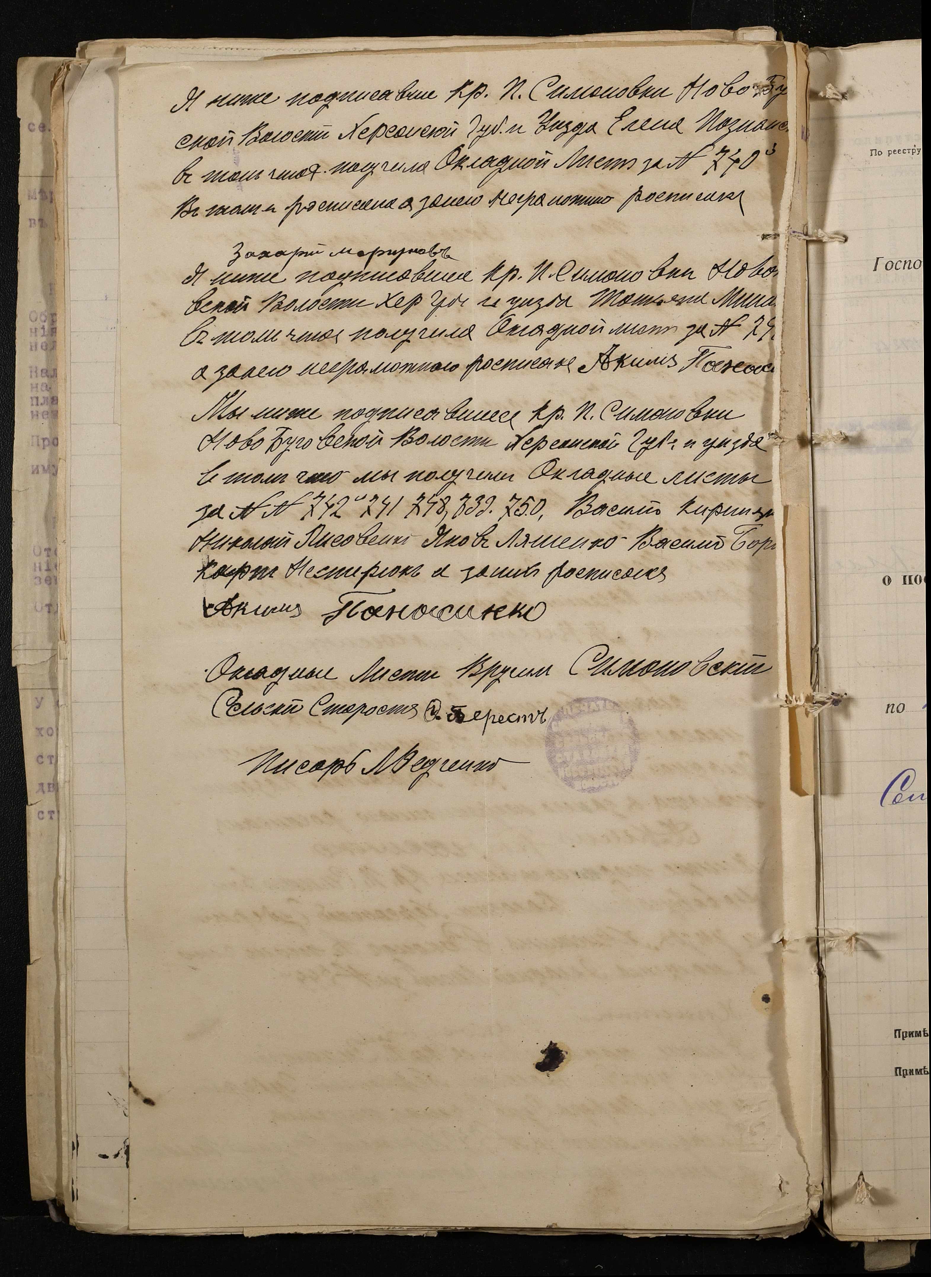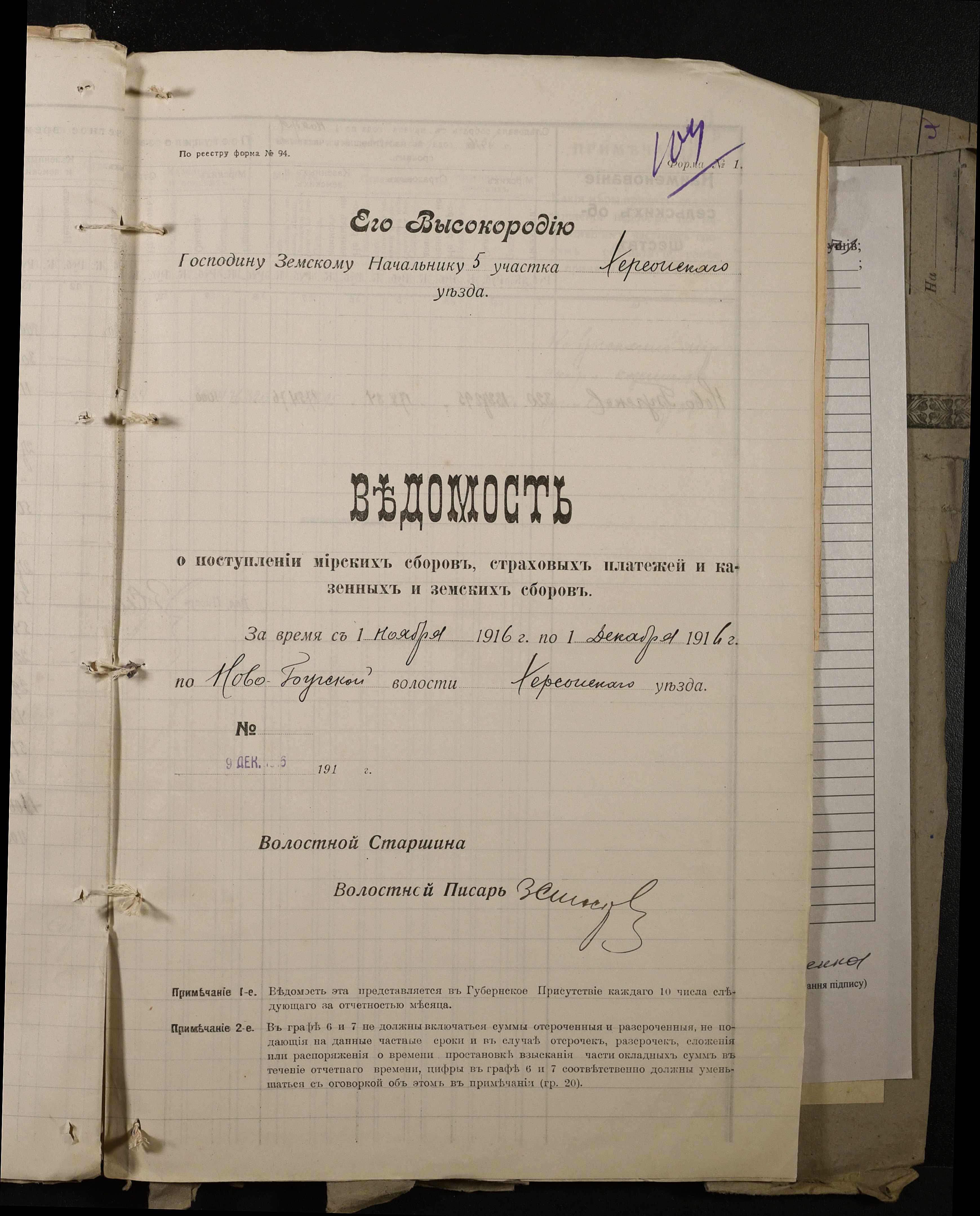 • • • • Справа № 266 “Листування з Херсонським повітовим податним інспектором та сільськими старостами волості про стан мирських зборів, присуди та розкладкові збори сільських товариств волості, звітні відомості про надходження мирських зборів, страхових платежів та казенних земських зборів по сільських товариствах волості”