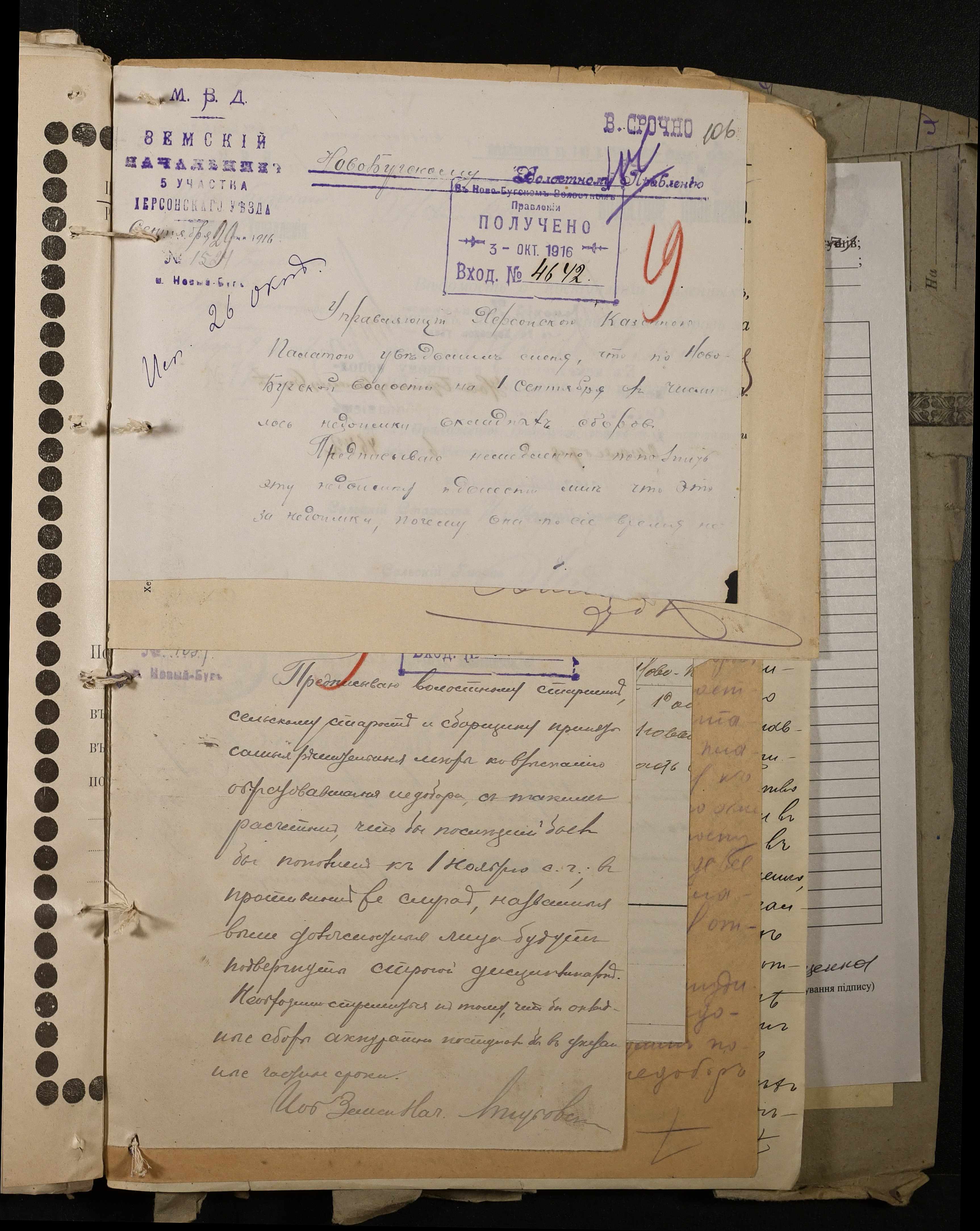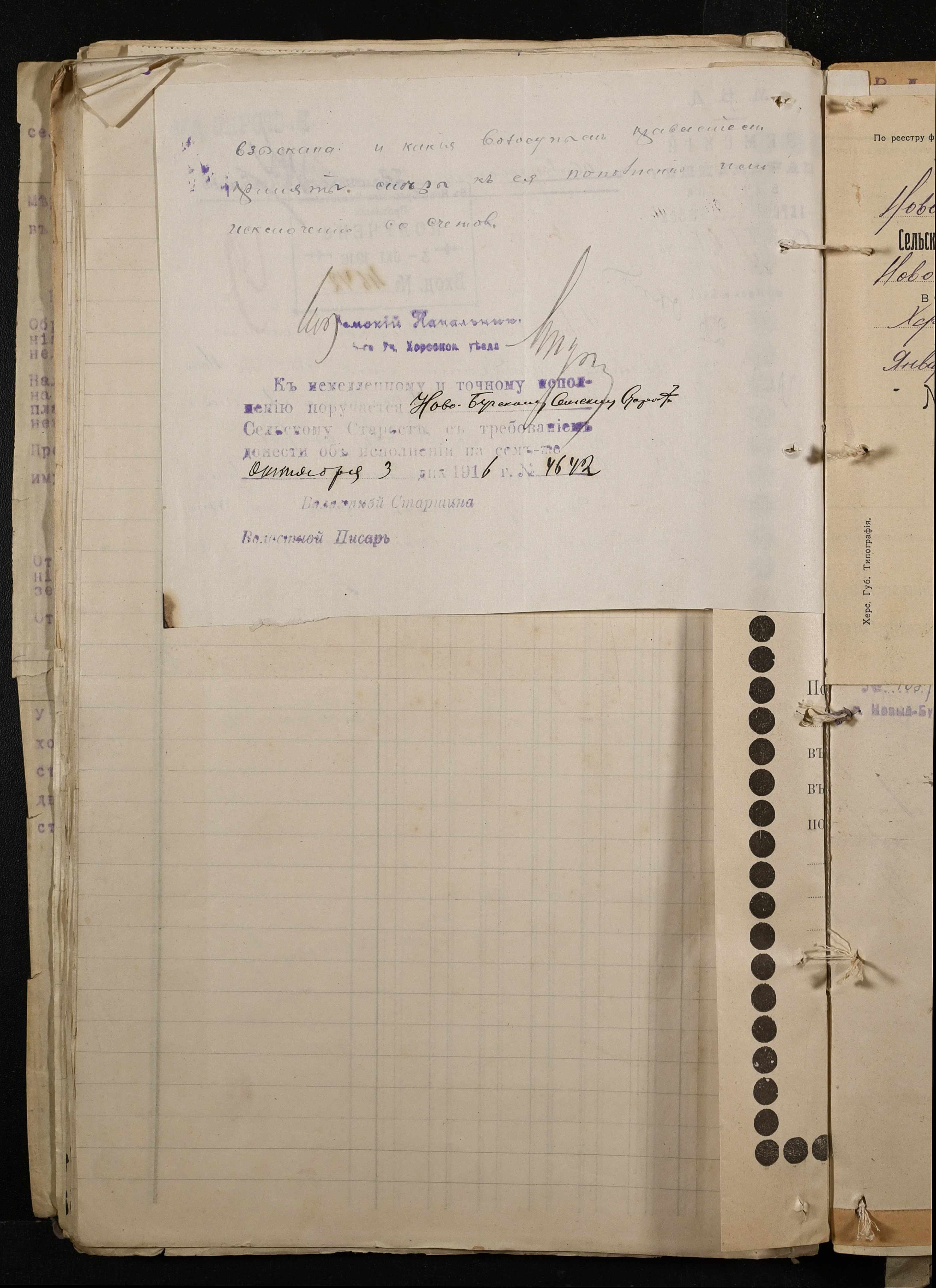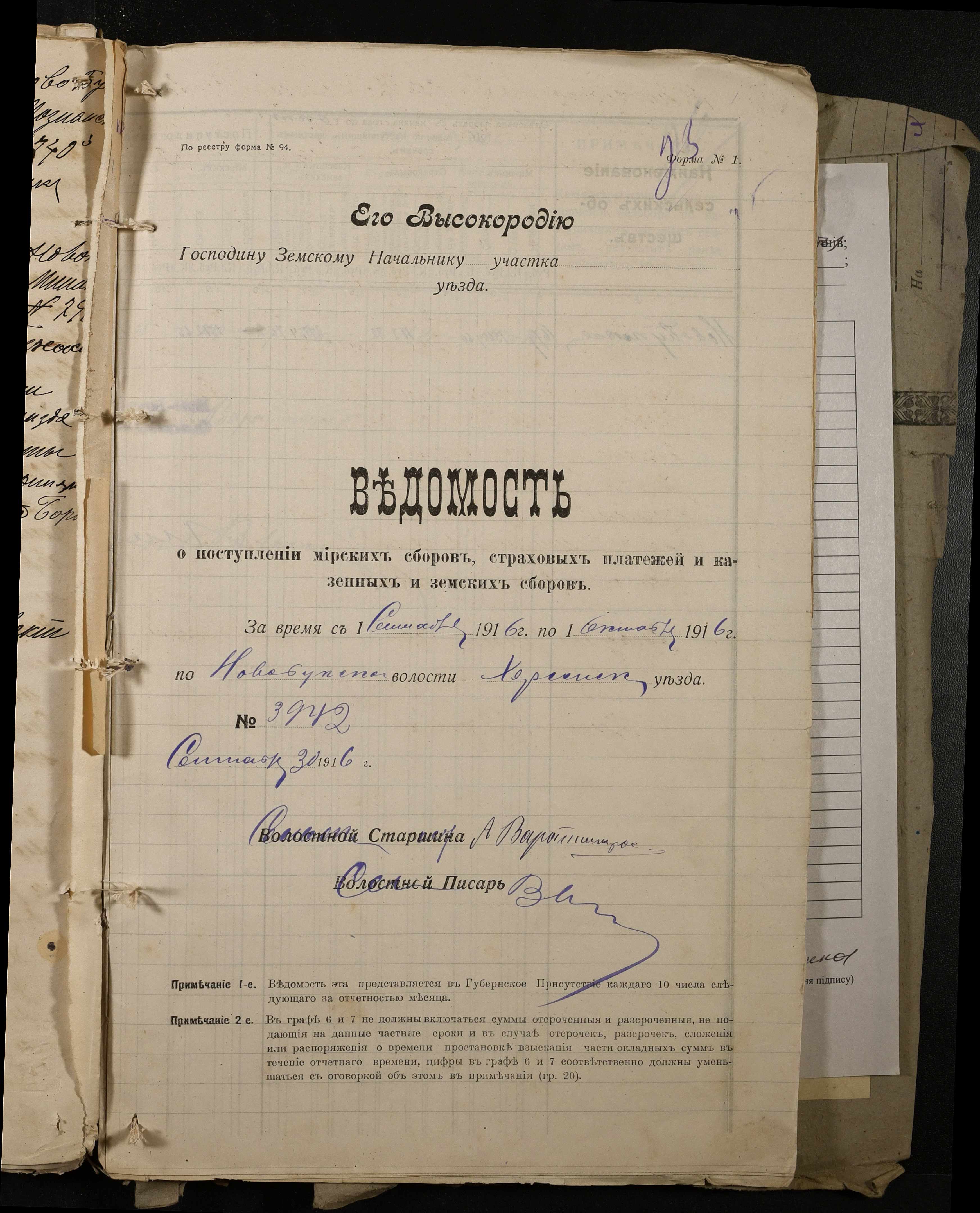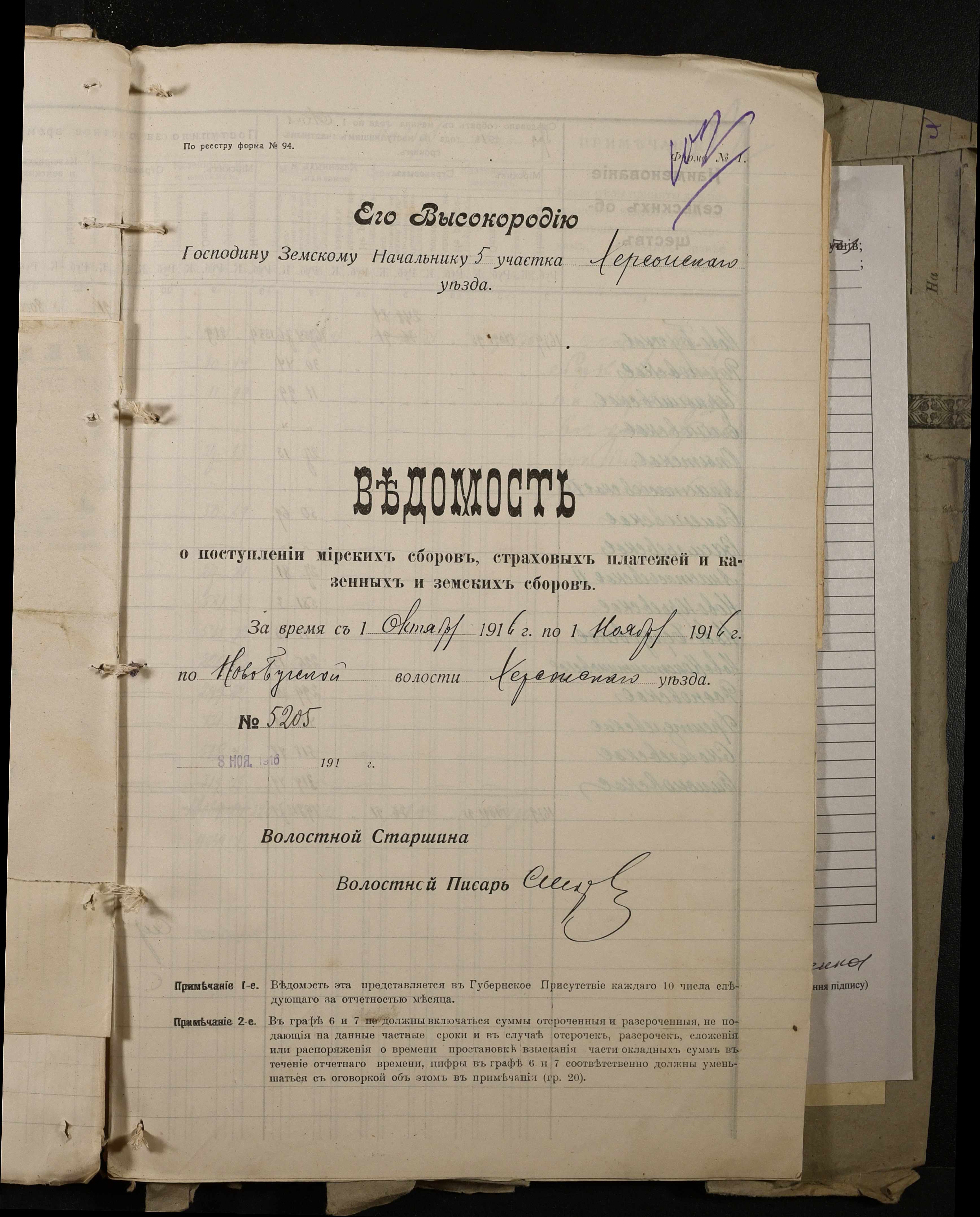 • • • • Справа № 266 “Листування з Херсонським повітовим податним інспектором та сільськими старостами волості про стан мирських зборів, присуди та розкладкові збори сільських товариств волості, звітні відомості про надходження мирських зборів, страхових платежів та казенних земських зборів по сільських товариствах волості”