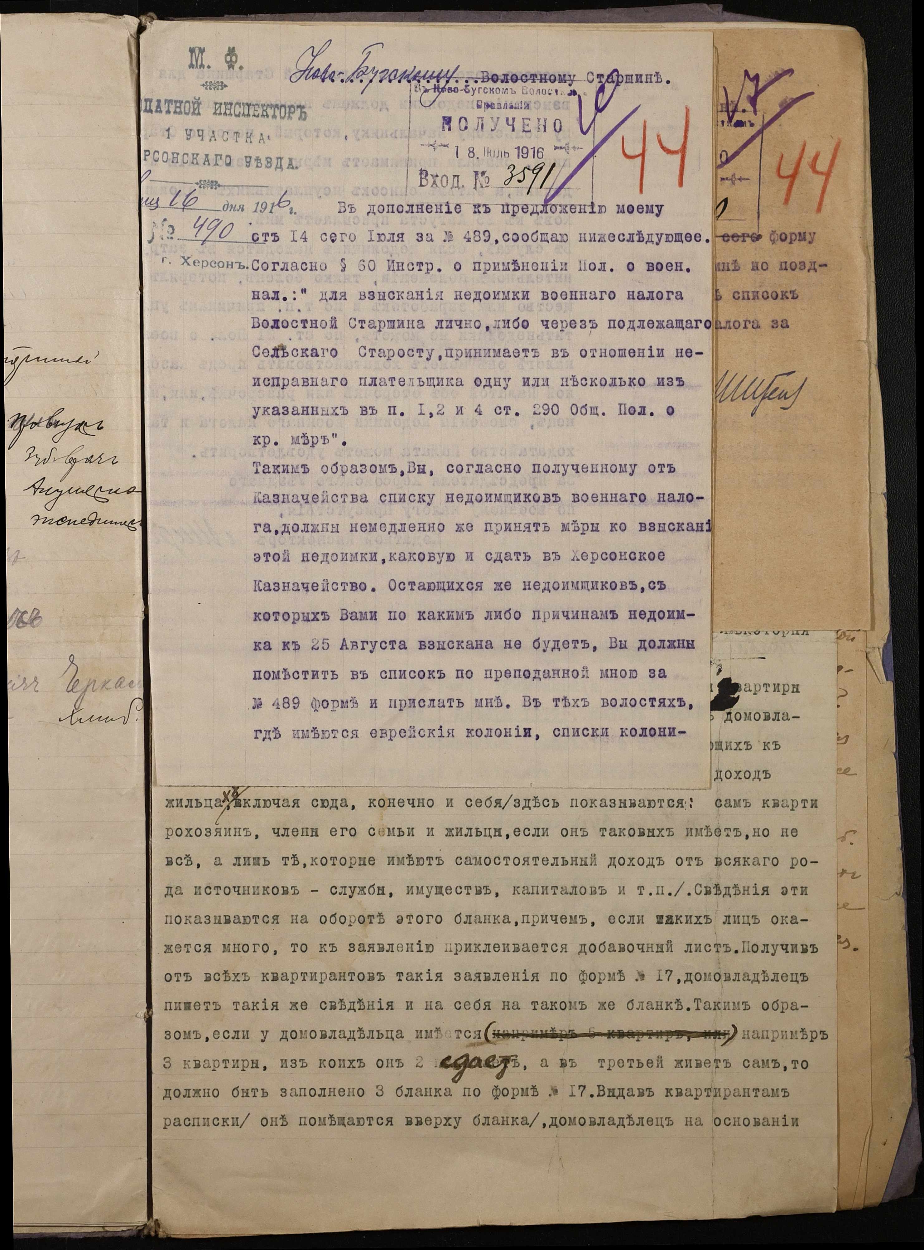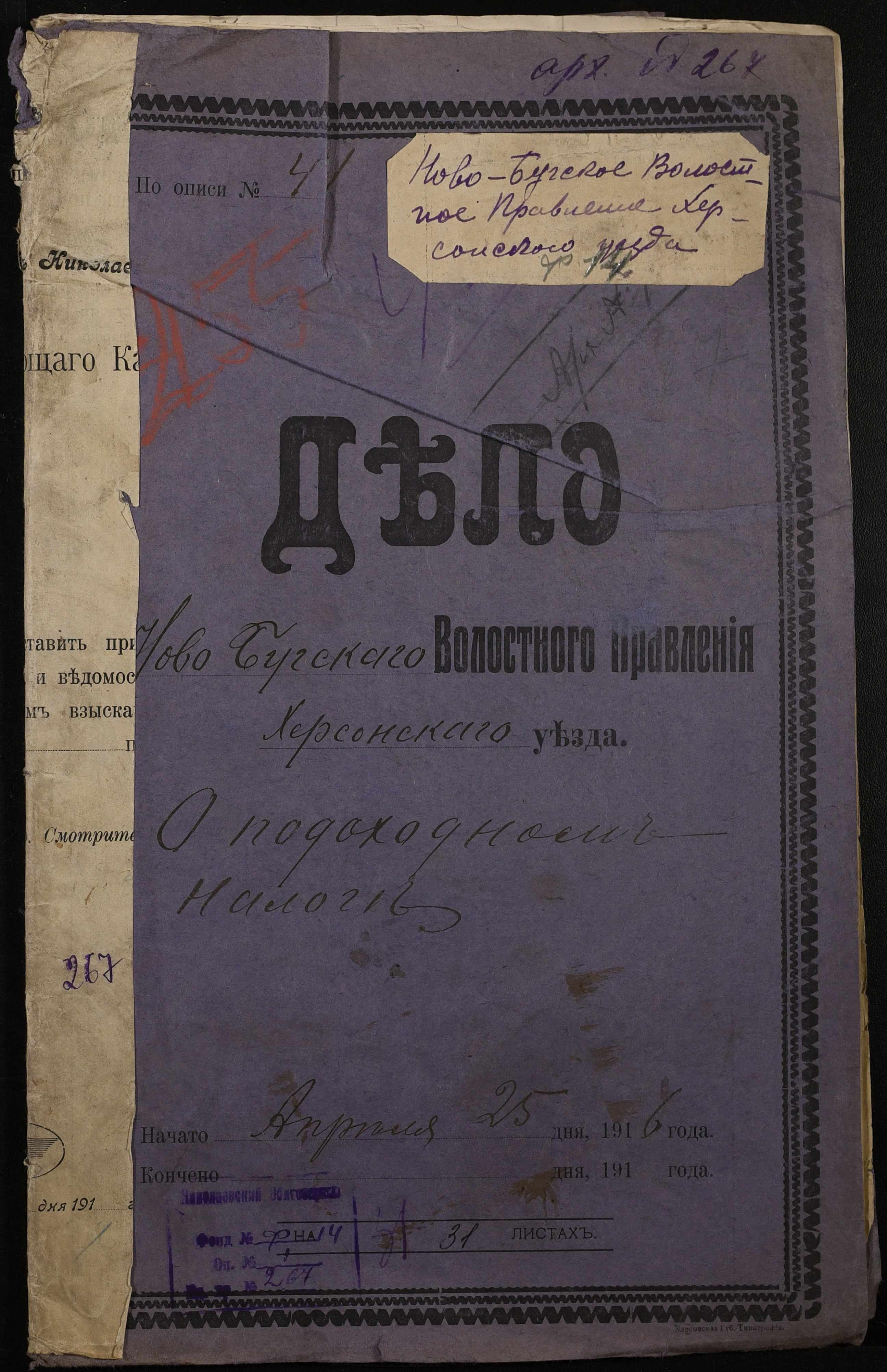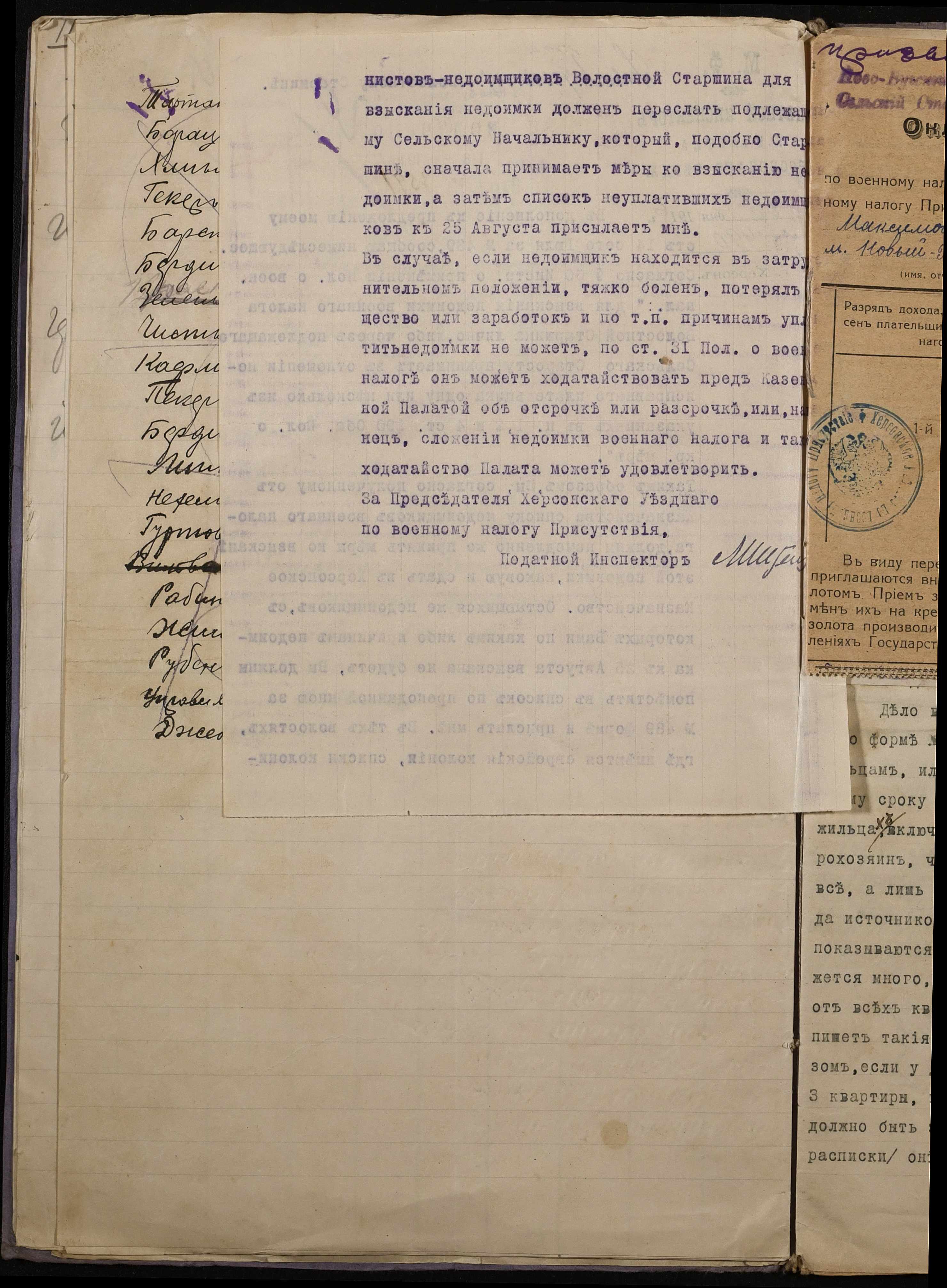 • • • • Справа № 267 “Обіжник Херсонського податного інспектора та листування з ним про порядок та строки стягнення податку на прибуток з населення волості, списки платників податків, окладні листи”