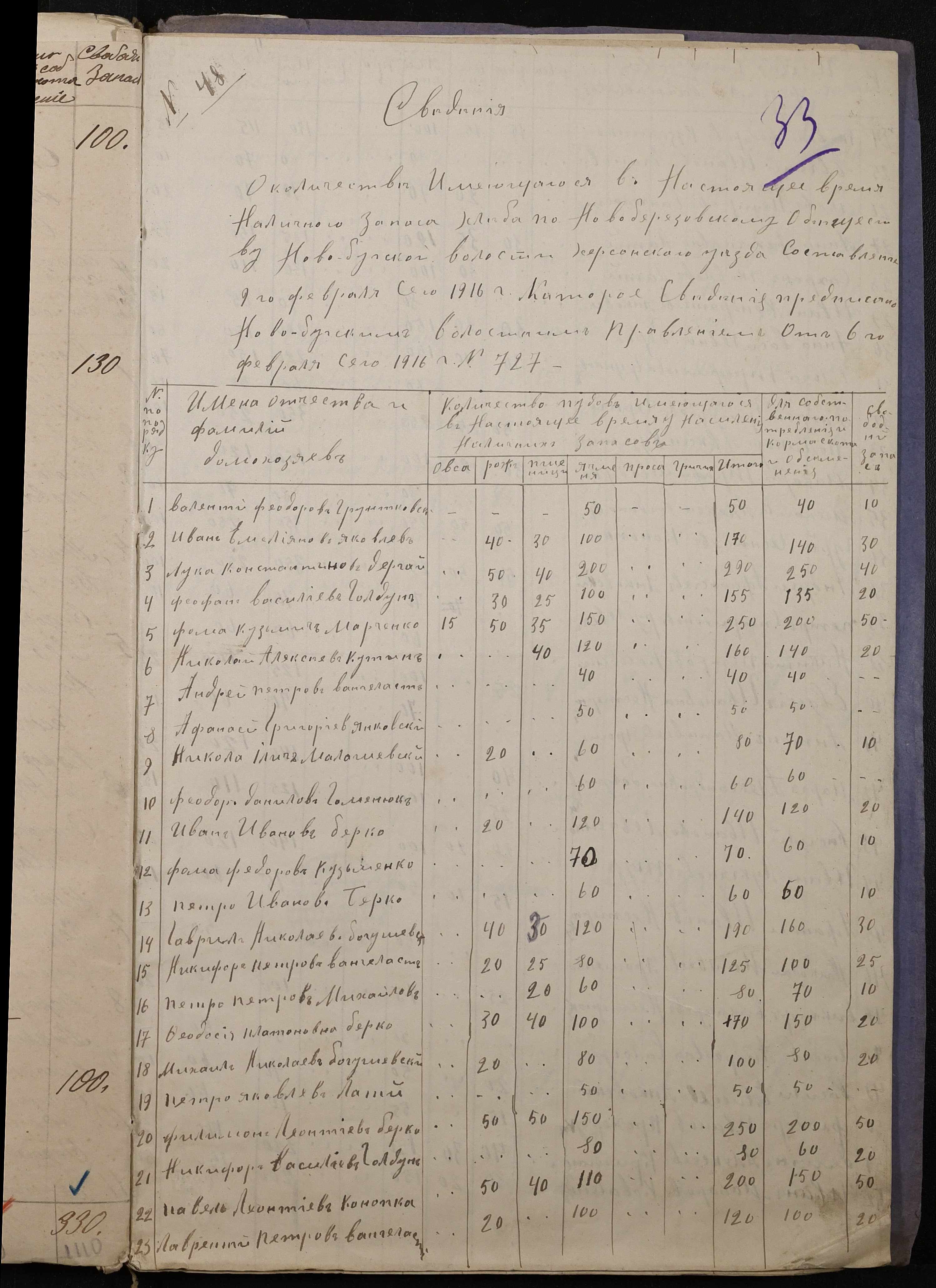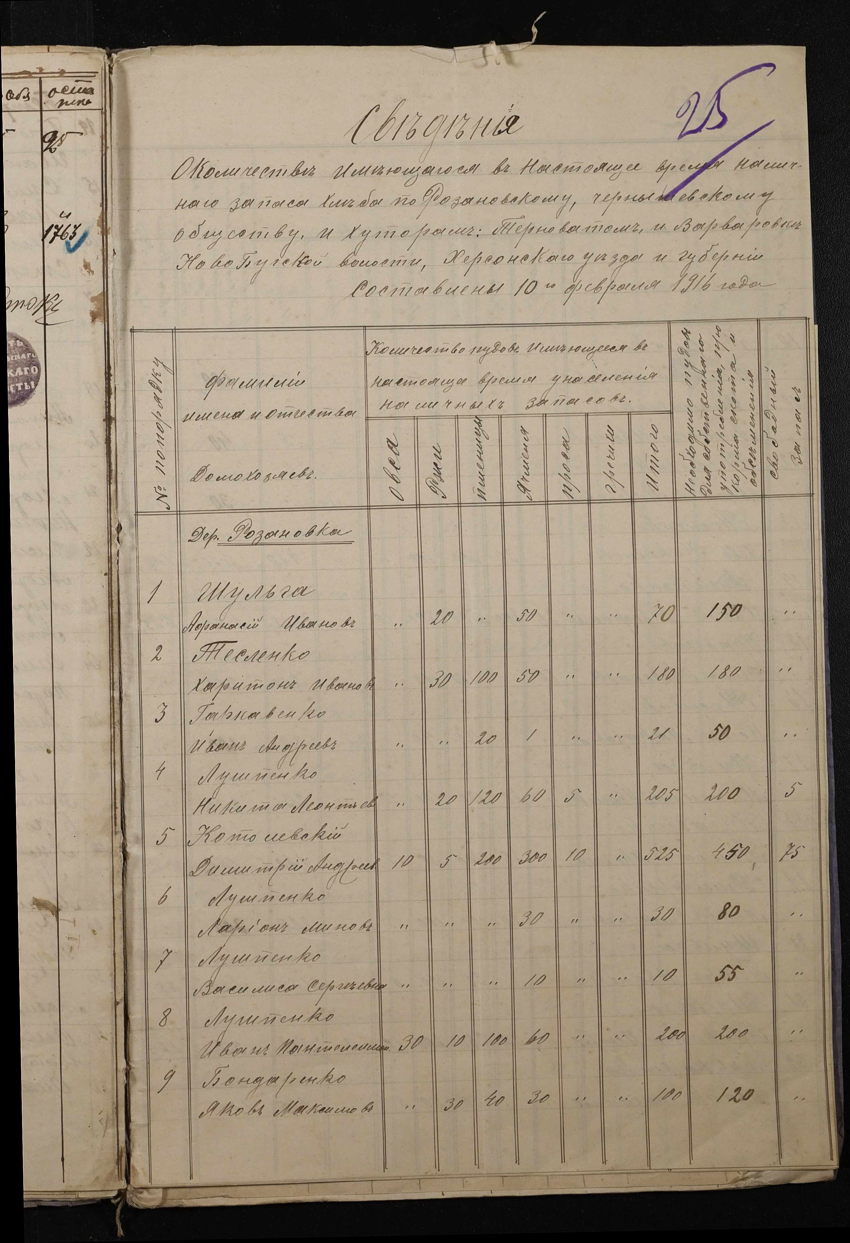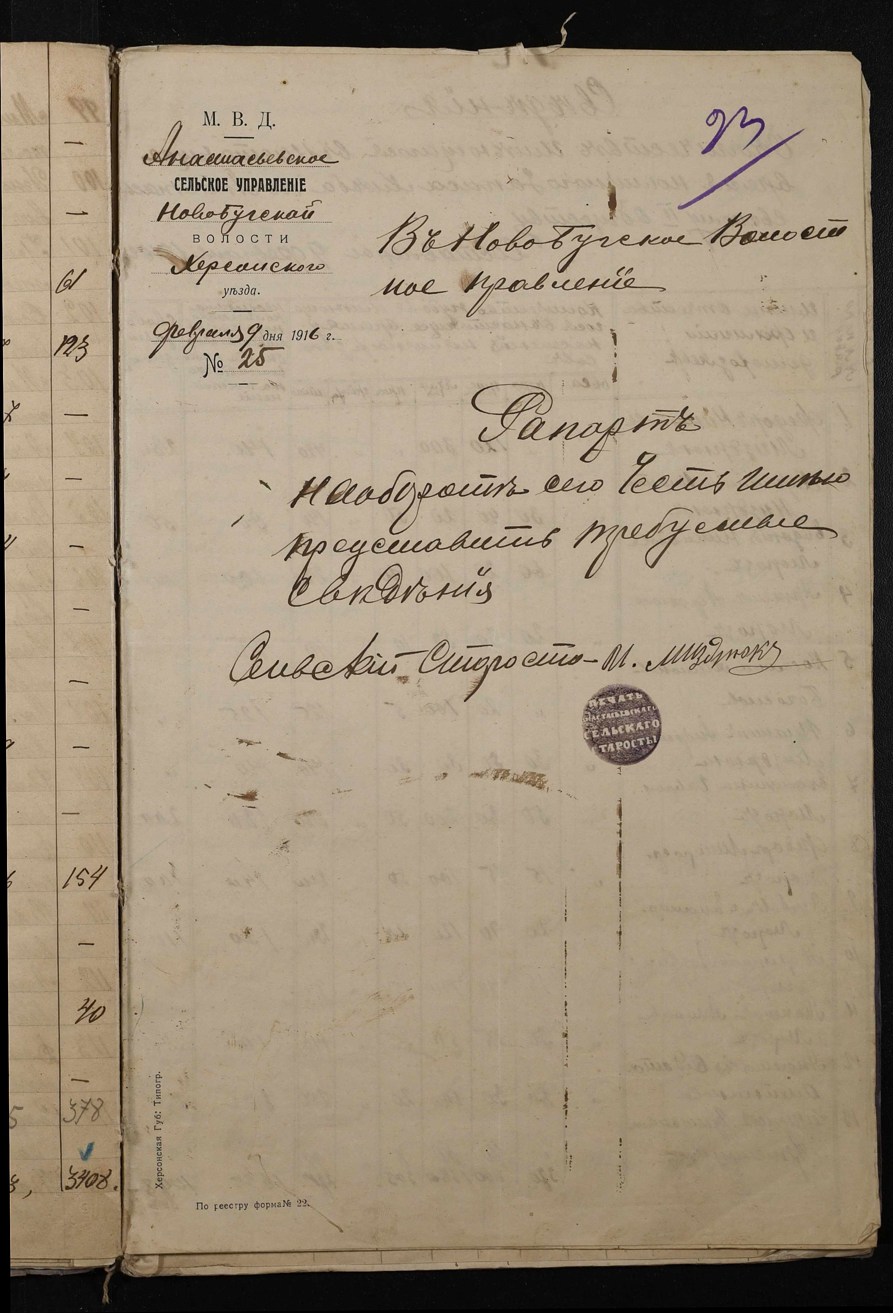 • • • • Справа № 272 “Обіжник земського начальника 5-ої дільниці Херсонського повіту про проведення обліку у населення волості наявних запасів продовольчого та фуражного зерна станом на 01 березня 1916 року, відомості щодо населених пунктів волості про підсумки обліку продовольчого та фуражного зерна”