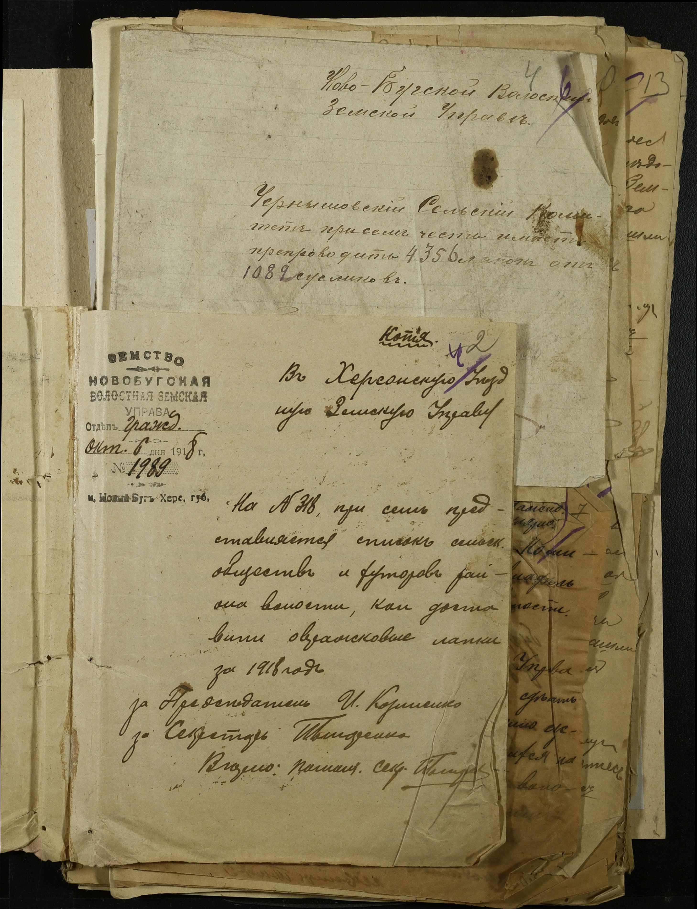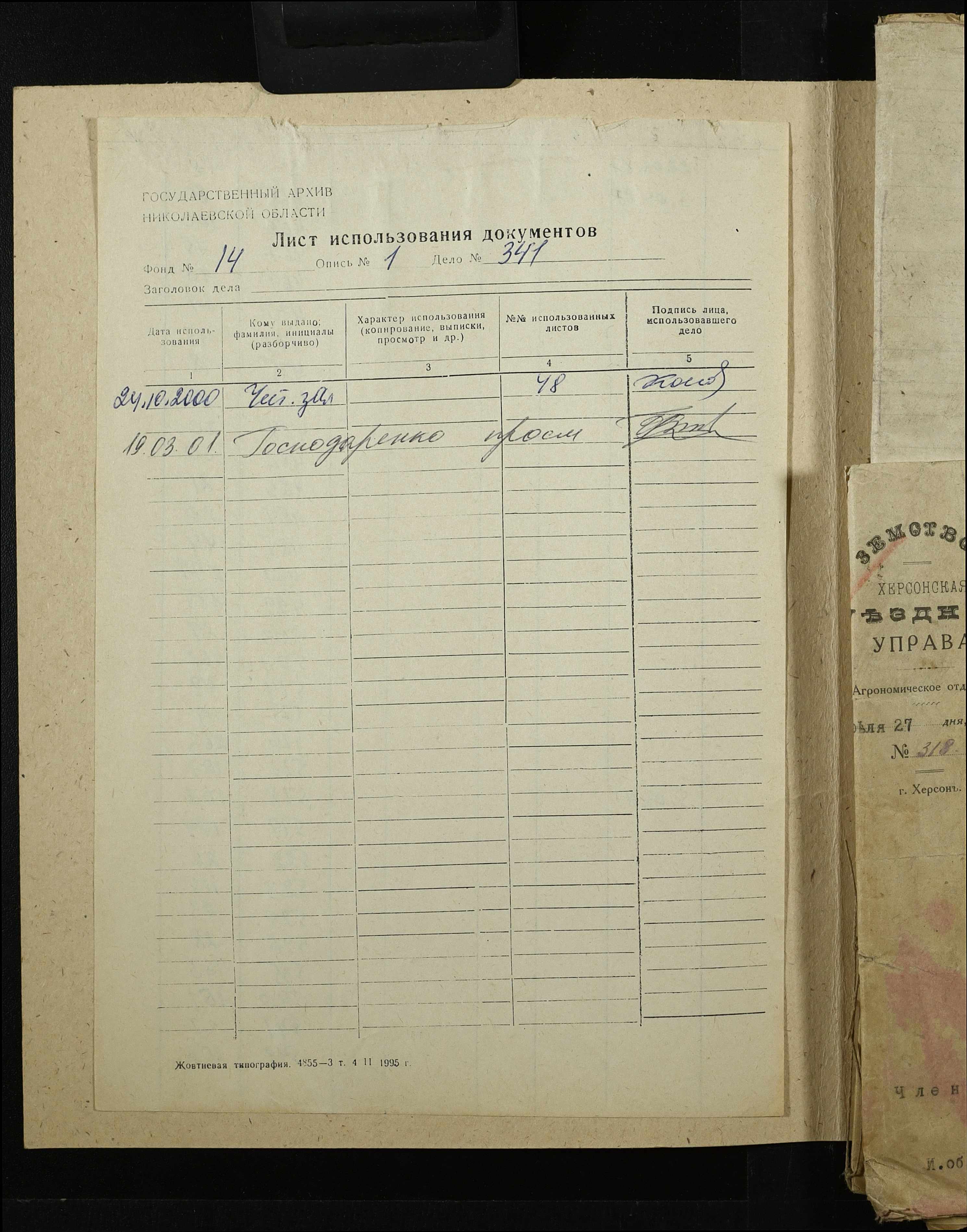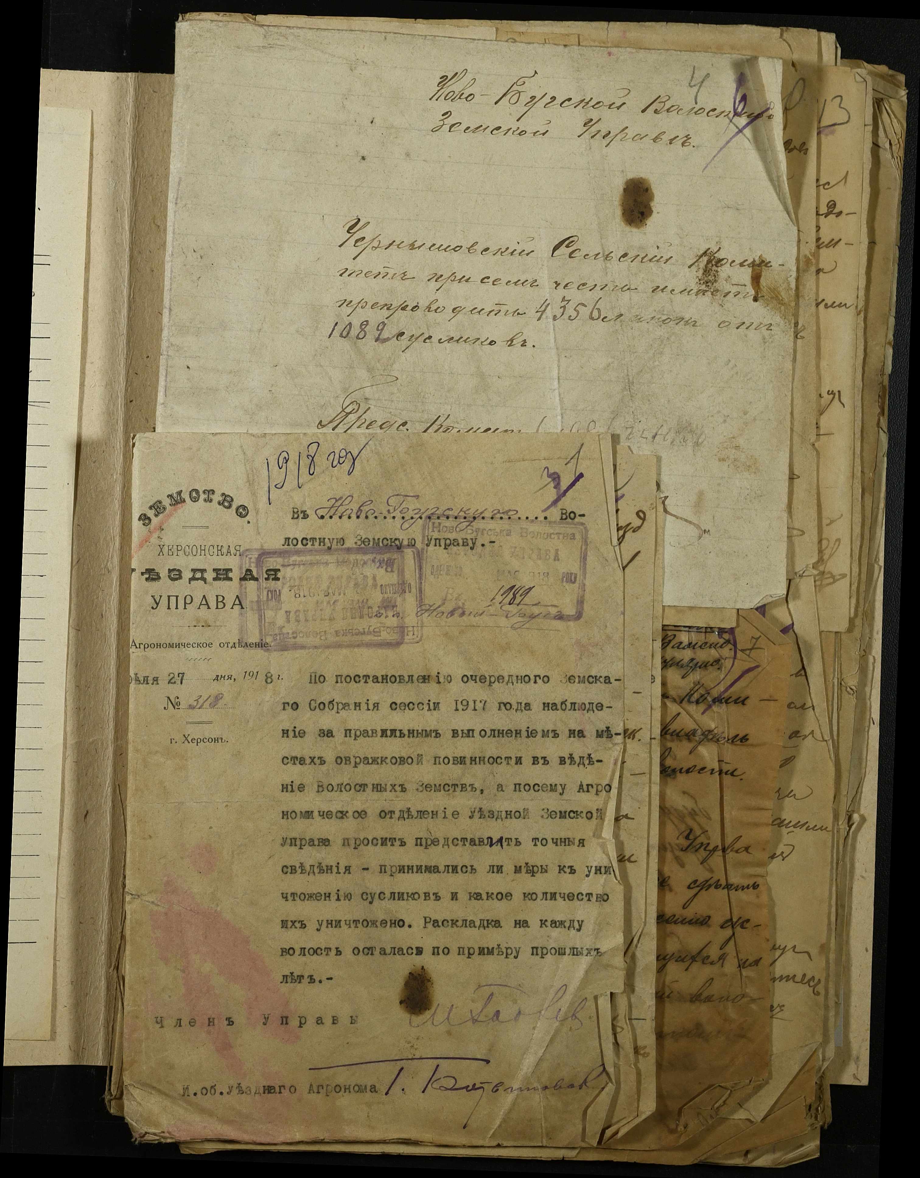 • • • • Справа № 341 “Розпорядження Херсонської земської управи та листування з нею про стан та заходи боротьби з ховрахами, список осіб, які здали лапки знищених ховрахів, протокол та акт огляду полів, звільнених від ховрахів”