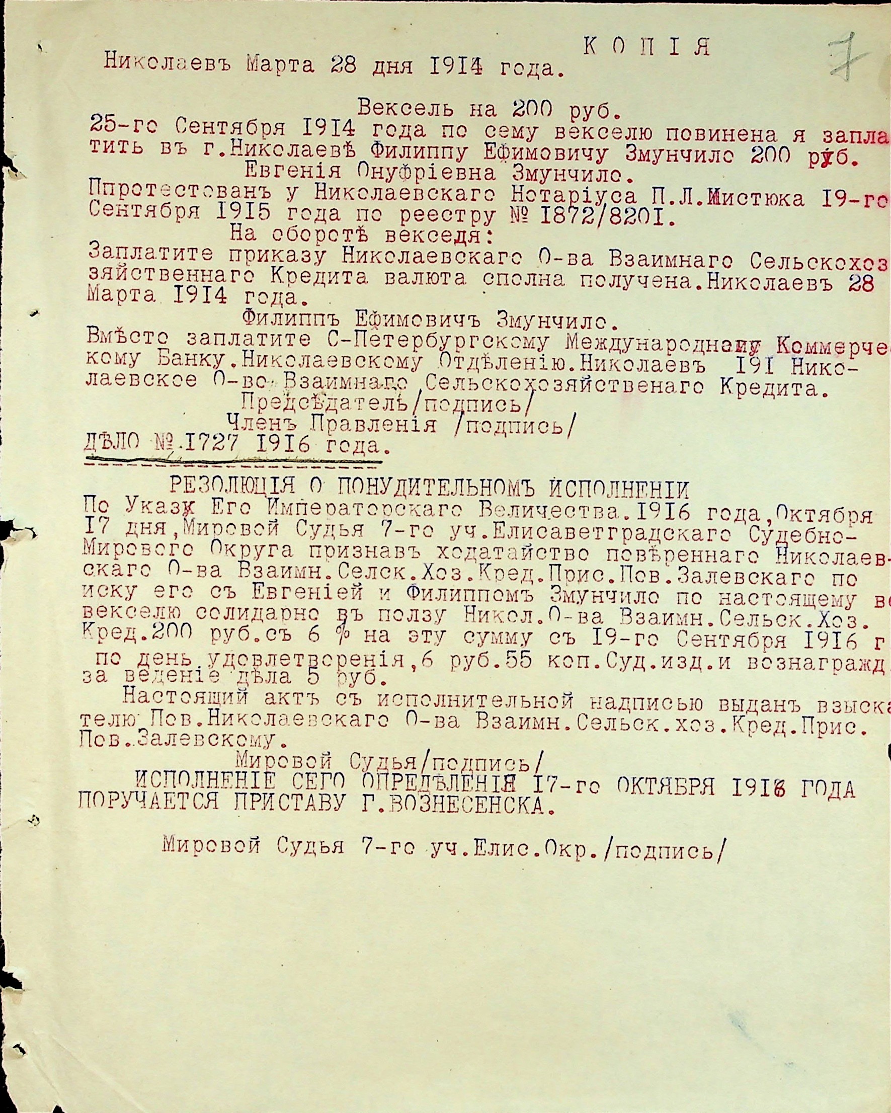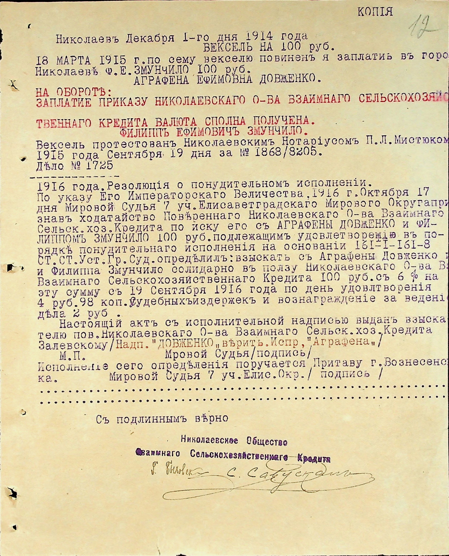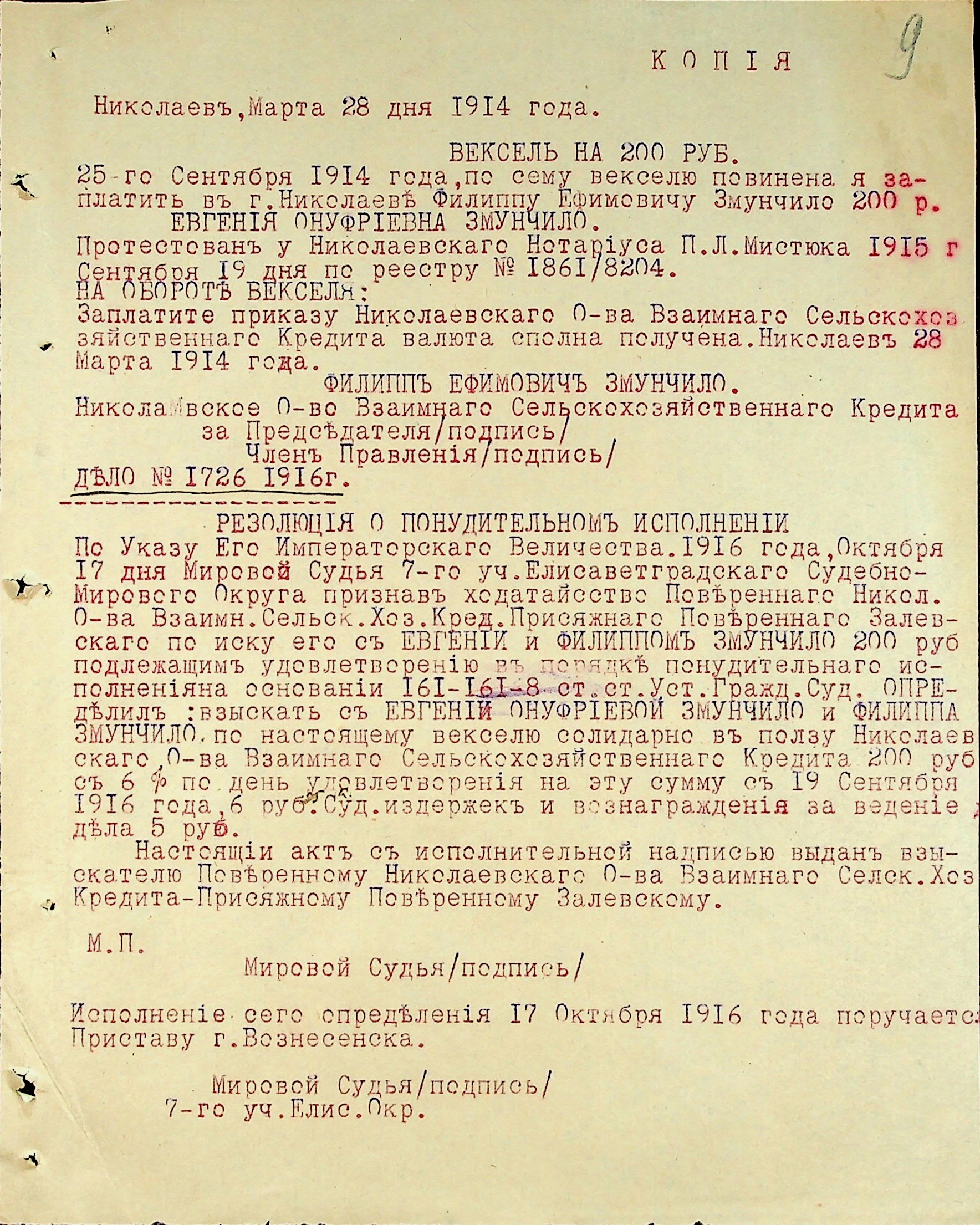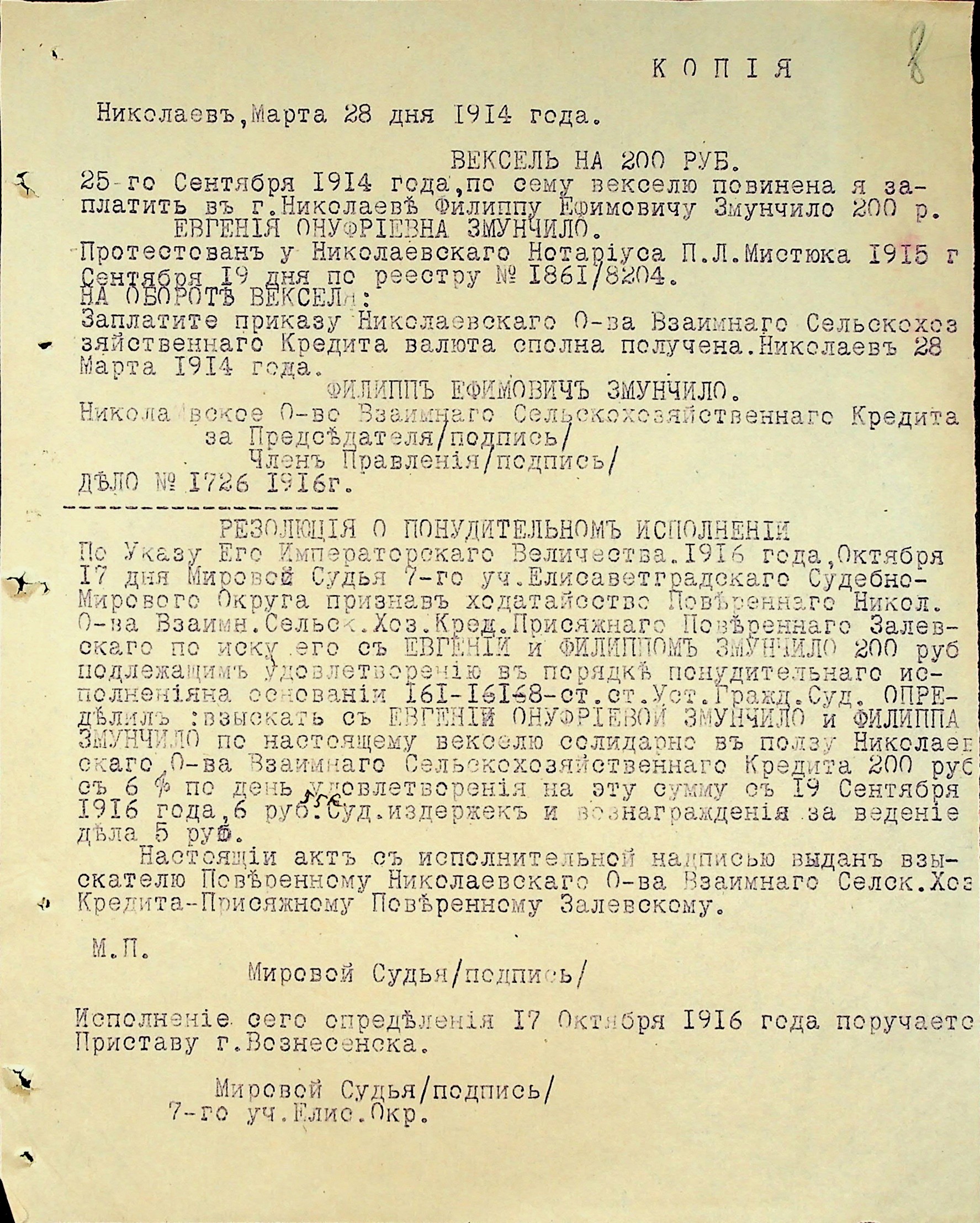 • • • • Справа № 3 “Виконавчі листи, заяви та копії векселів про стягнення грошей на користь товариства з Змунчила П.Ю., Змунчило Є.О. і Довженко А.Ю.”