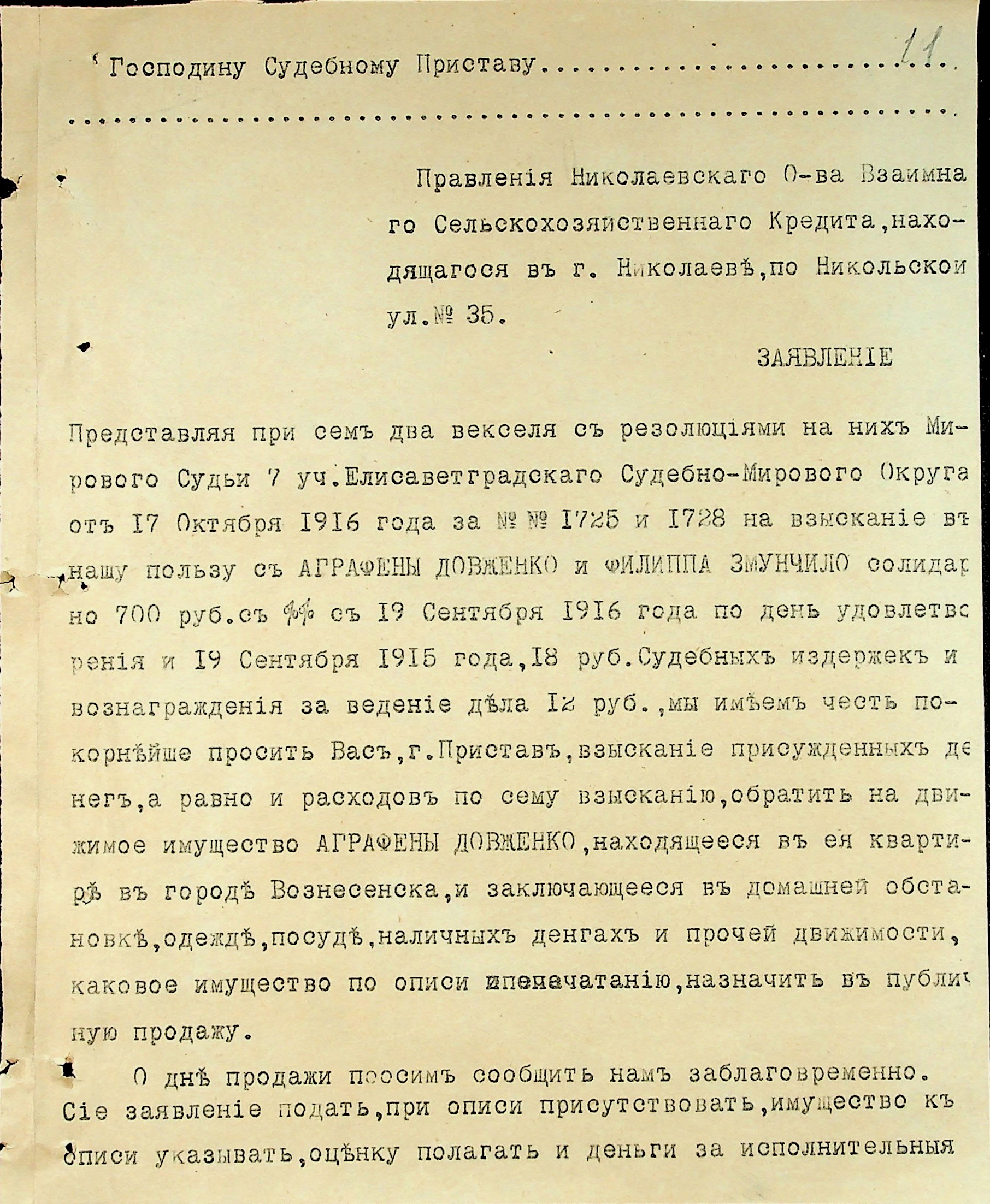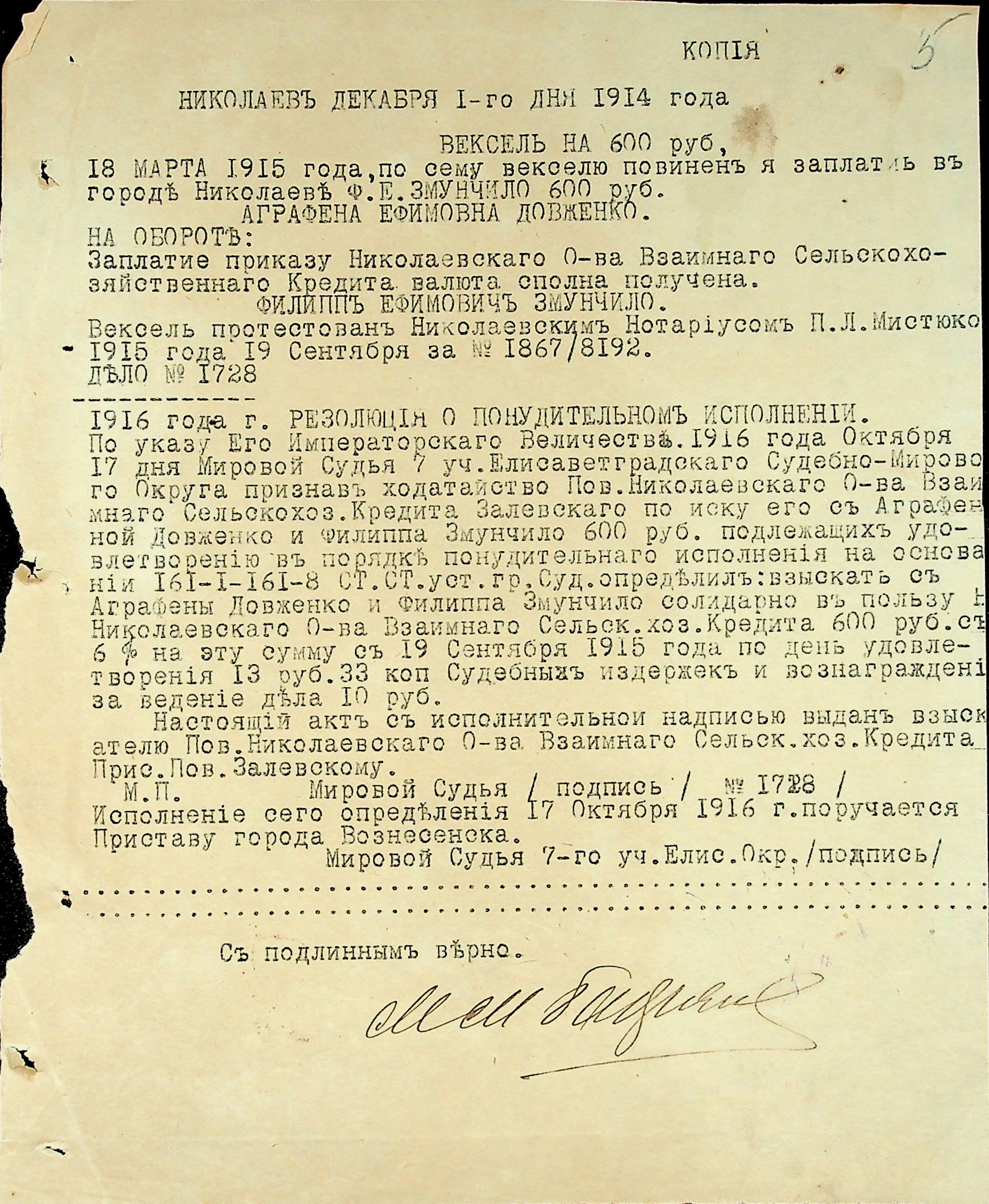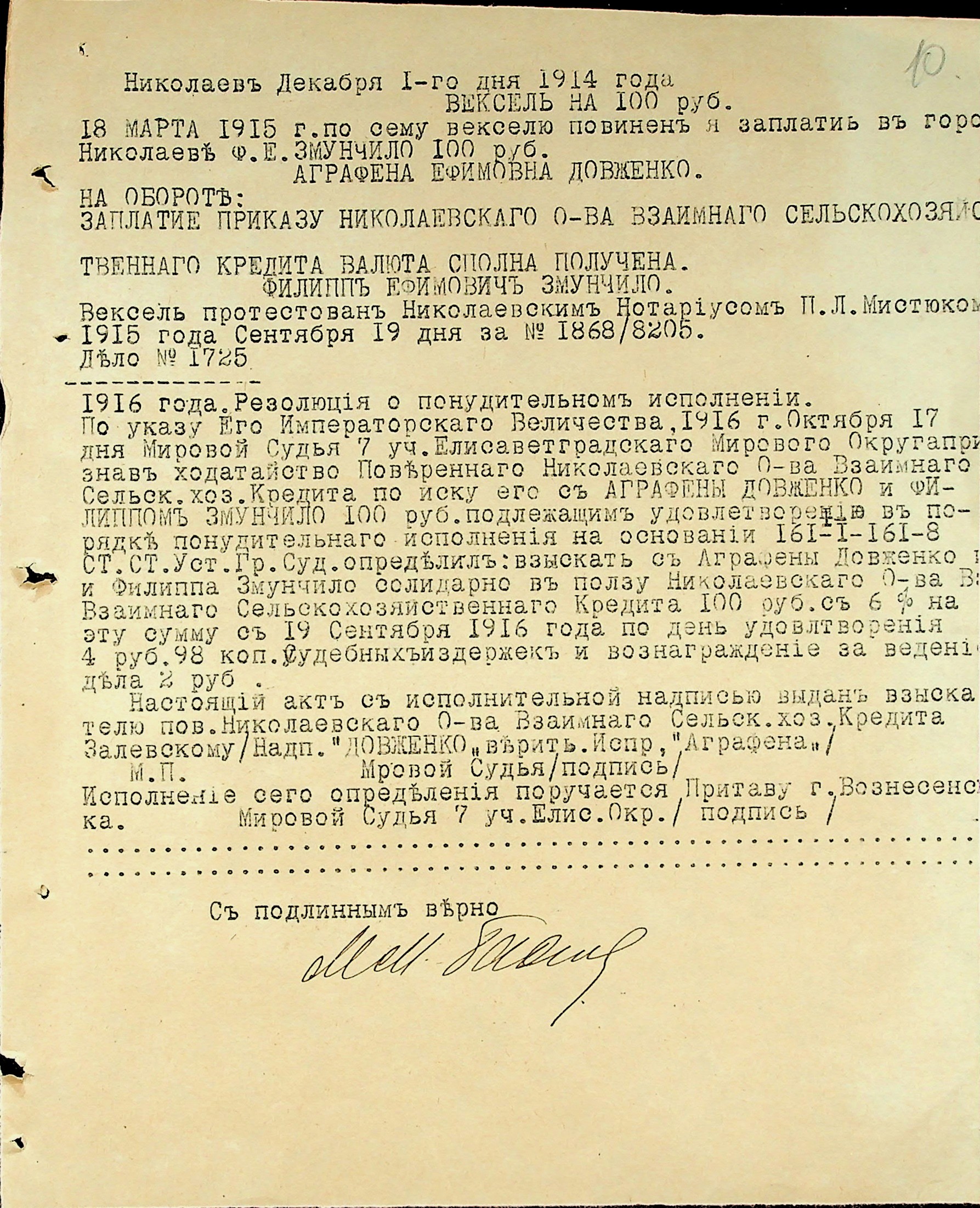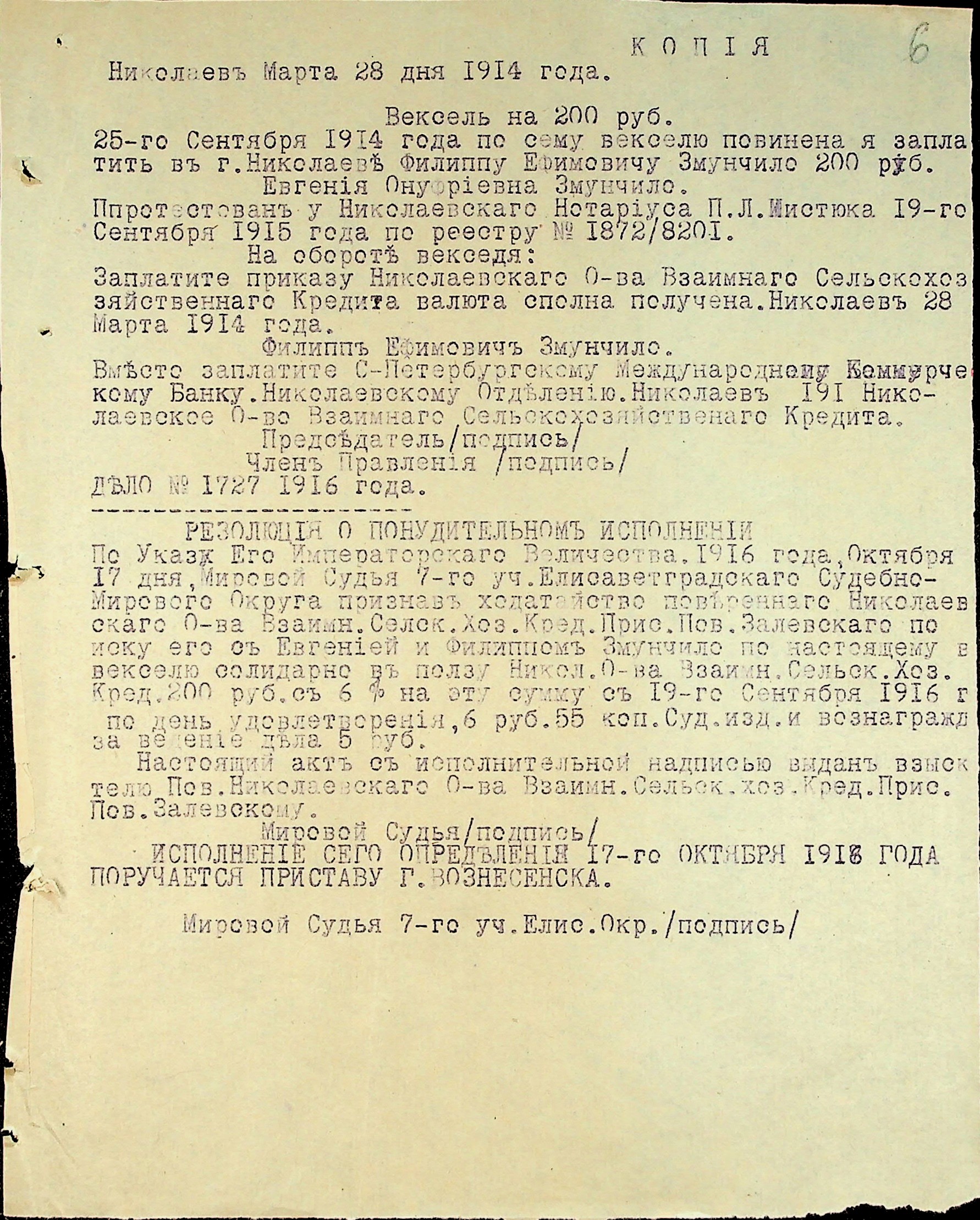 • • • • Справа № 3 “Виконавчі листи, заяви та копії векселів про стягнення грошей на користь товариства з Змунчила П.Ю., Змунчило Є.О. і Довженко А.Ю.”