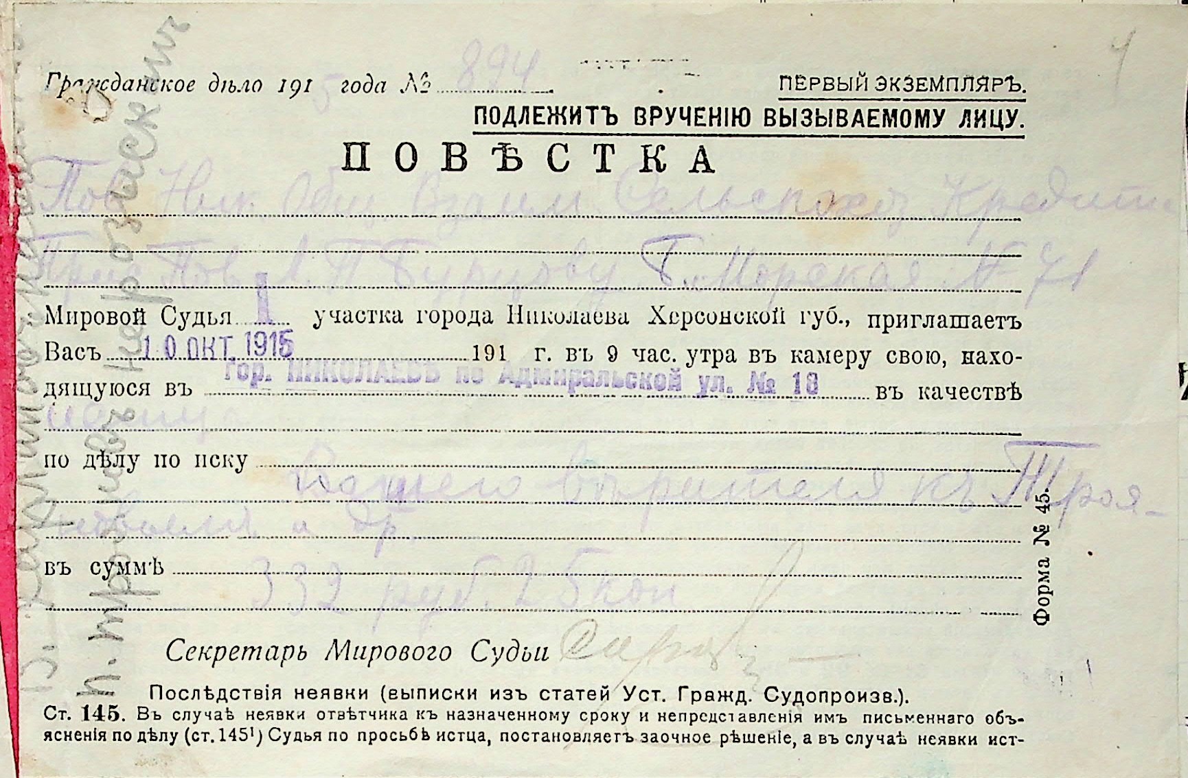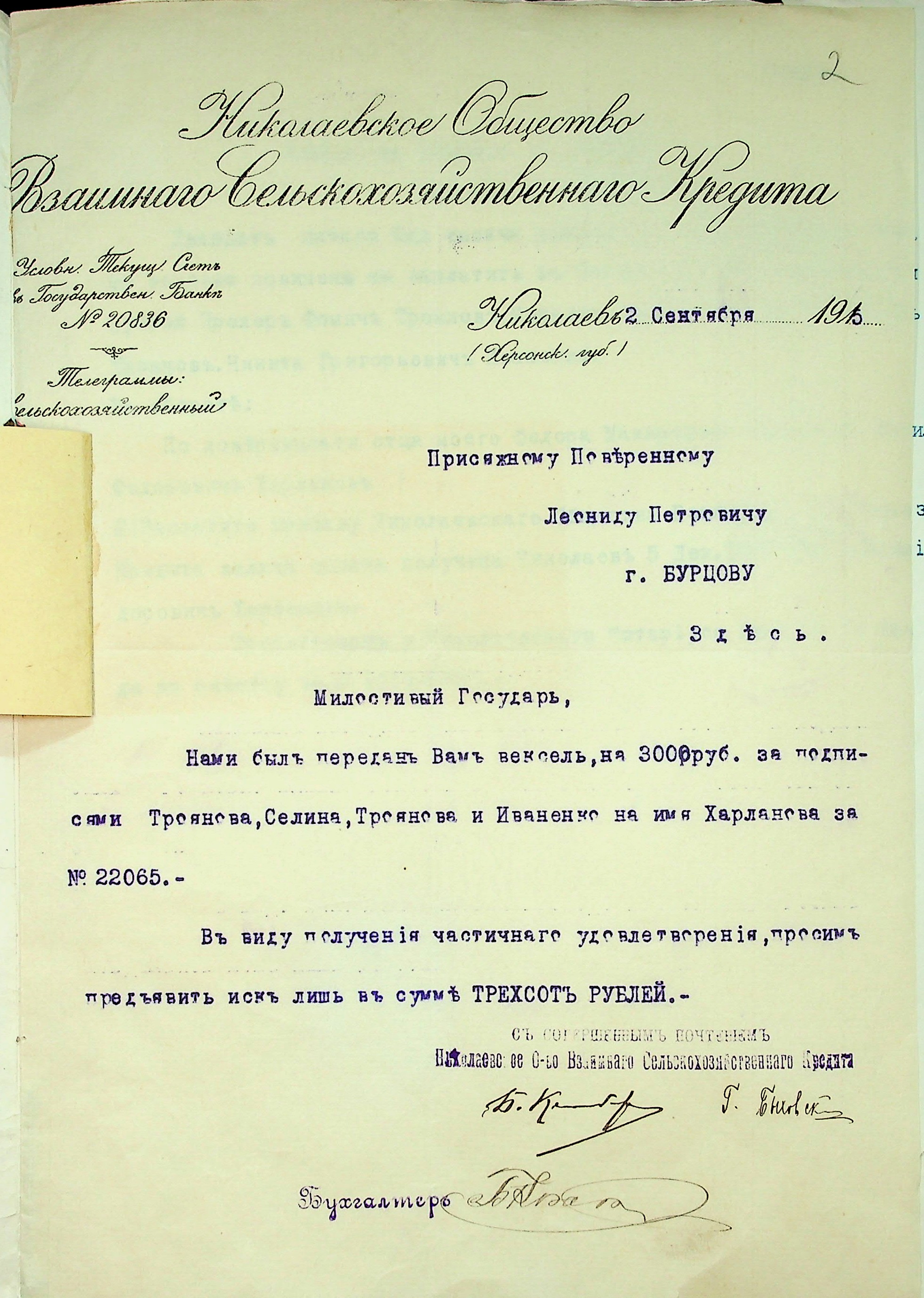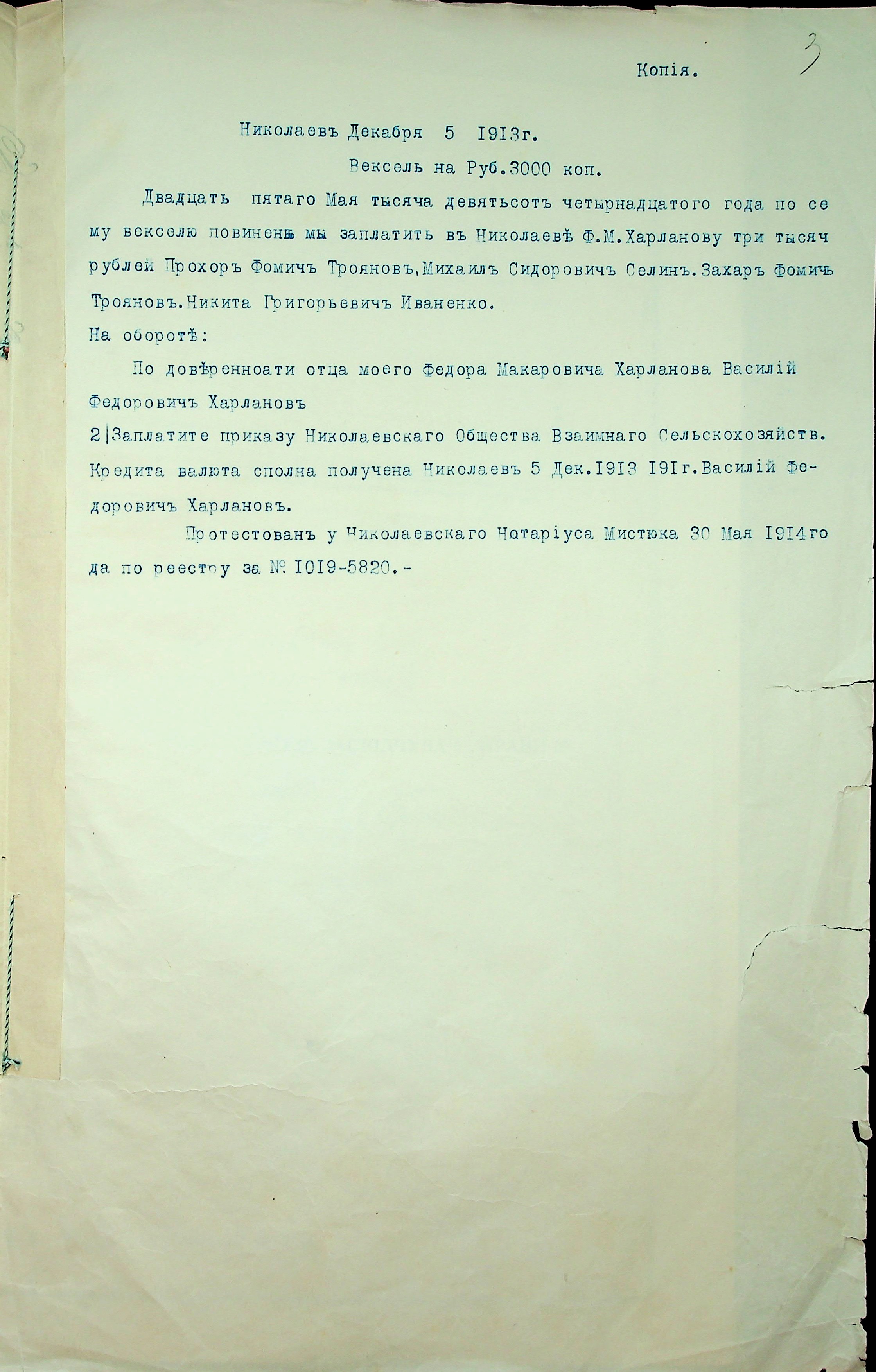 • • • • Справа № 9 “Документи (заяви, прохання, повістка, вексель, листування) мирового судді дільниці № 1 м. Миколаїв про стягнення грошей за векселями на користь товариства з Троянова П.Ф., Троянова З.Ф., Іваненка М.Г., Селіна М.С., Харланова Ф.М. і Харланова В.Ф.”