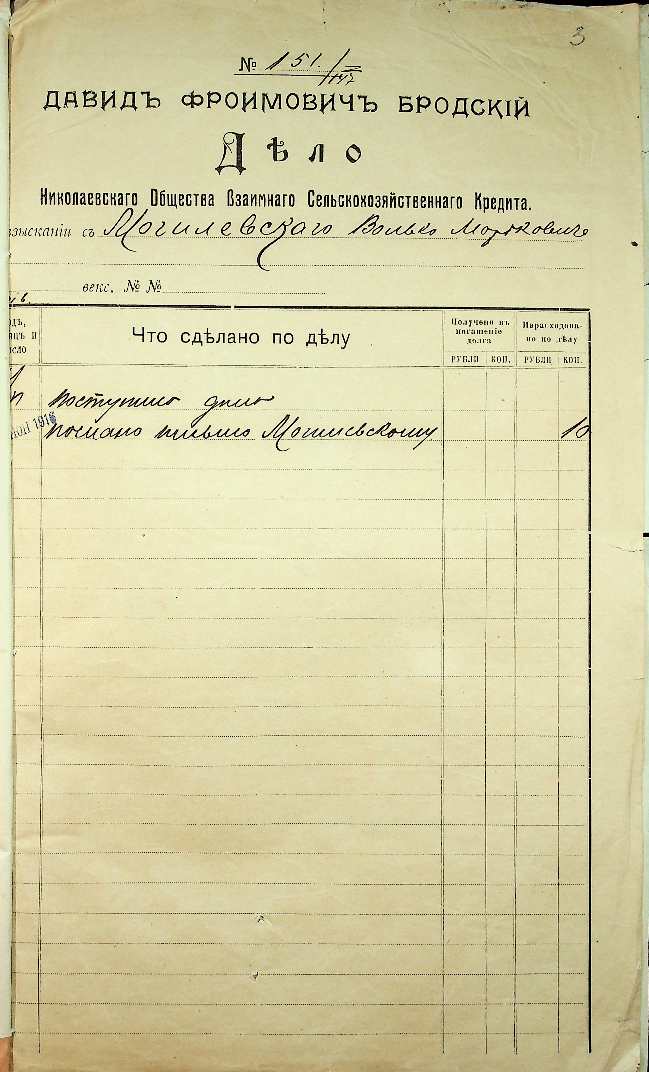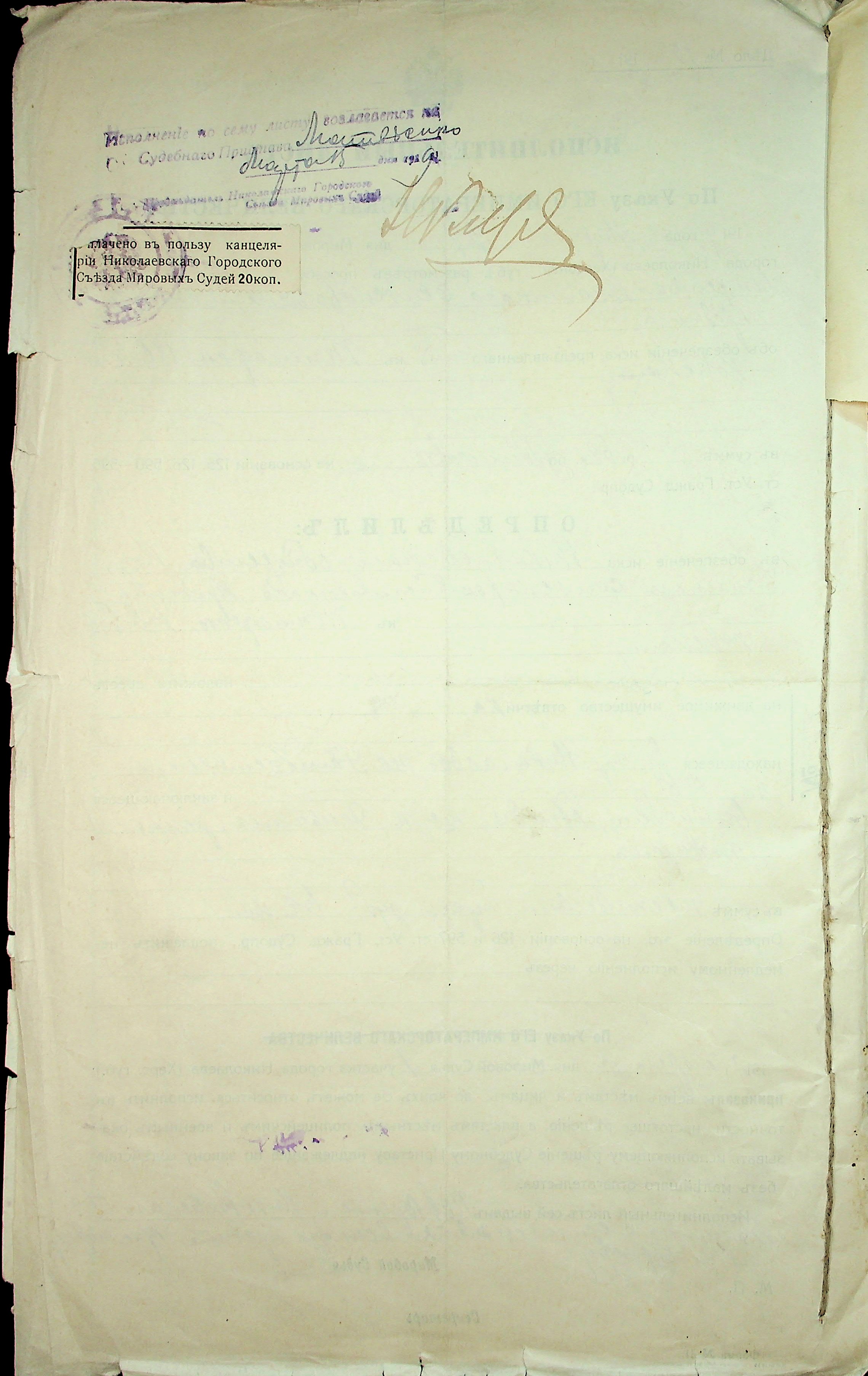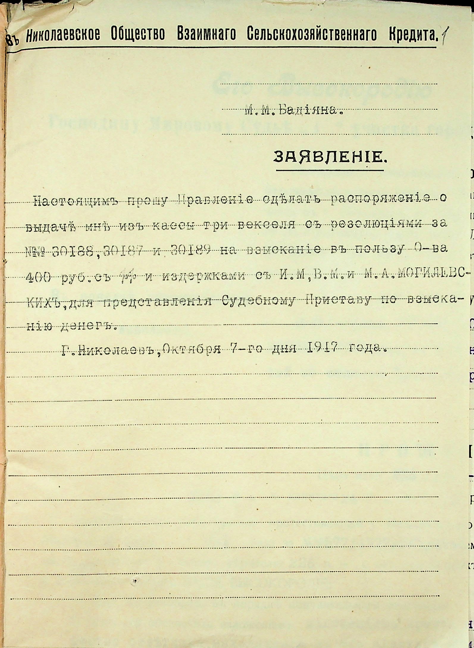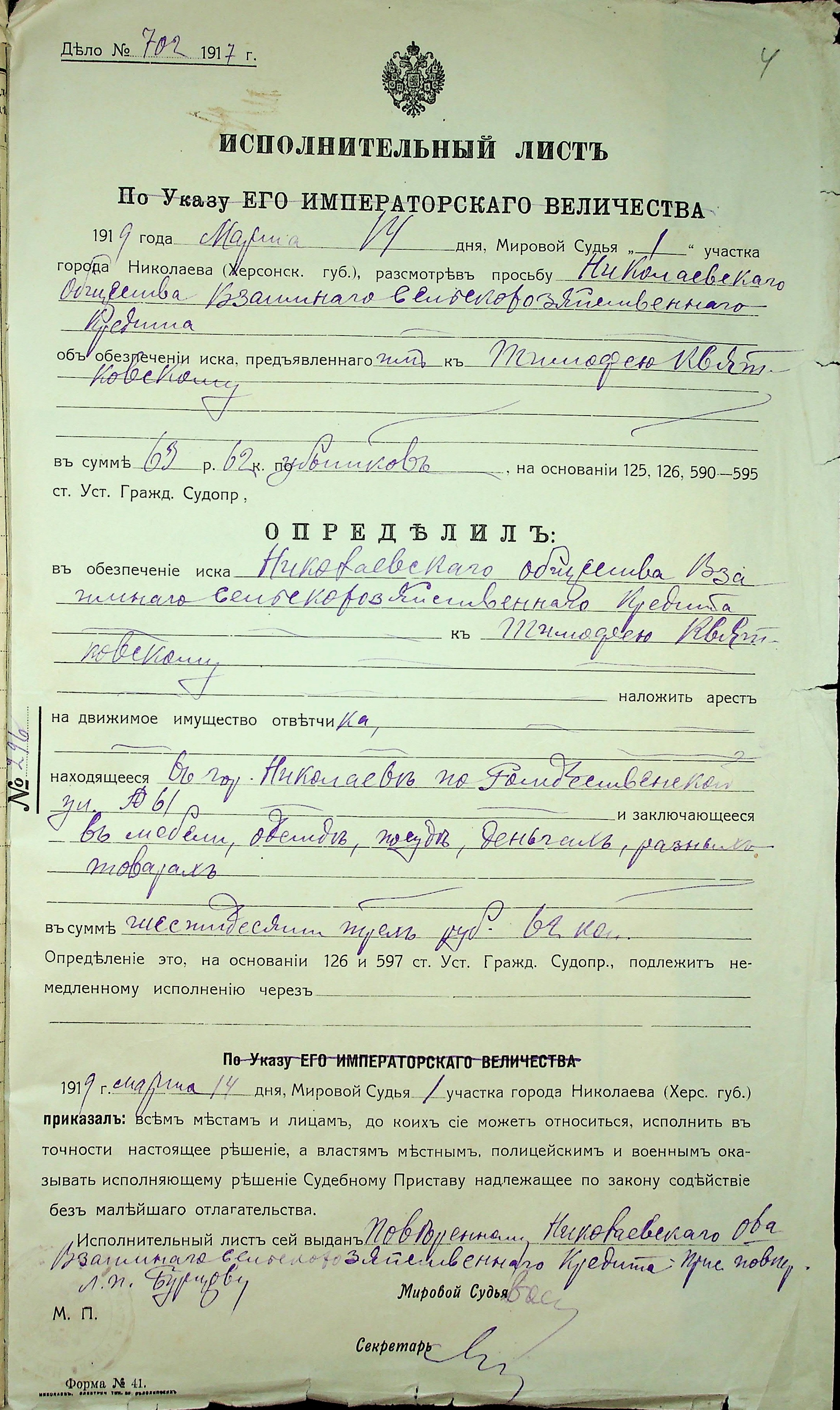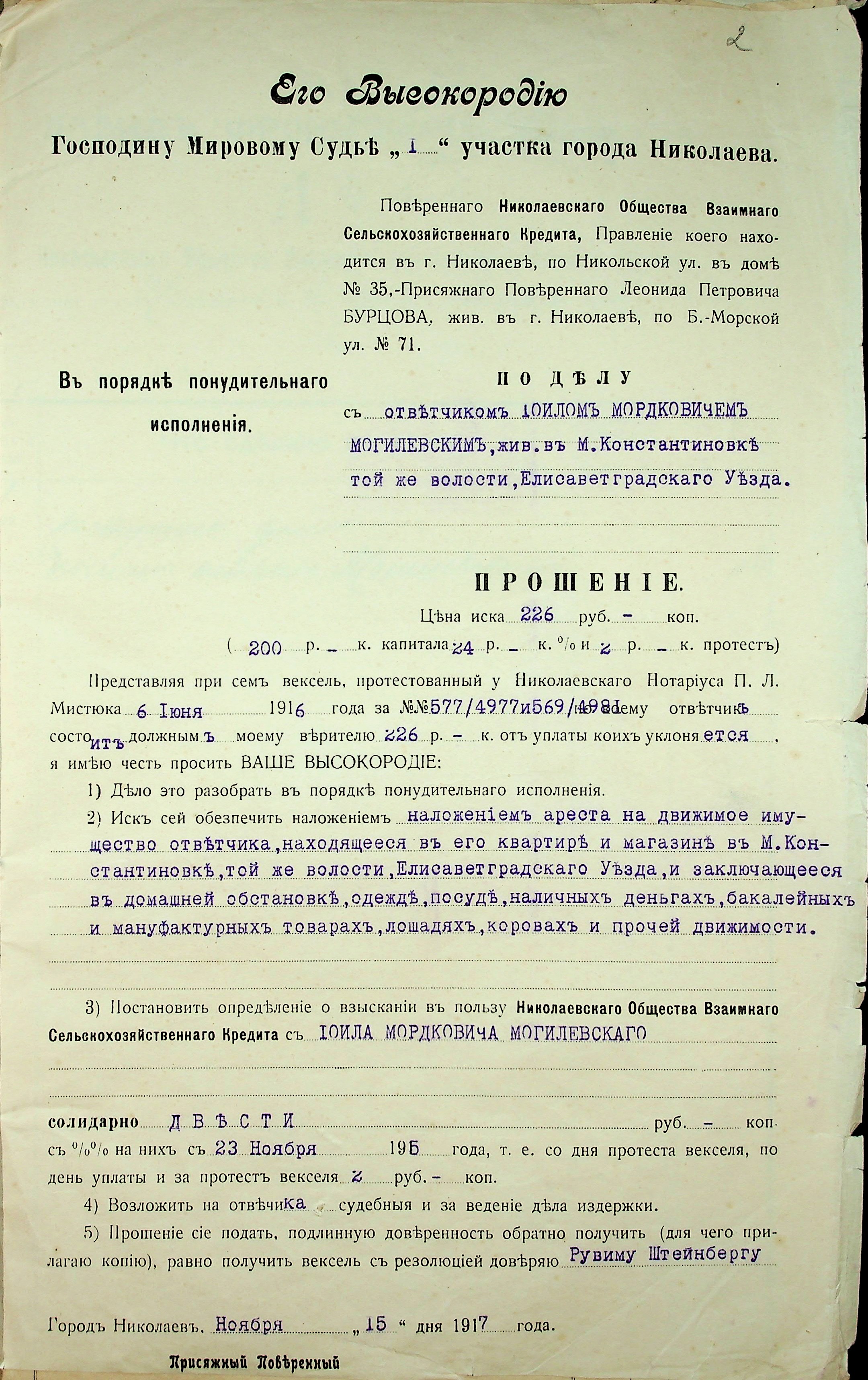 • • • • Справа № 13 “Прохання присяжного повіреного товариства Бурцова Л.П. до мирового судді дільниці № 1 м. Миколаїв та виконавчий аркуш про накладення арешту на рухоме майно Могилевського І.М і Квятковського Т.”