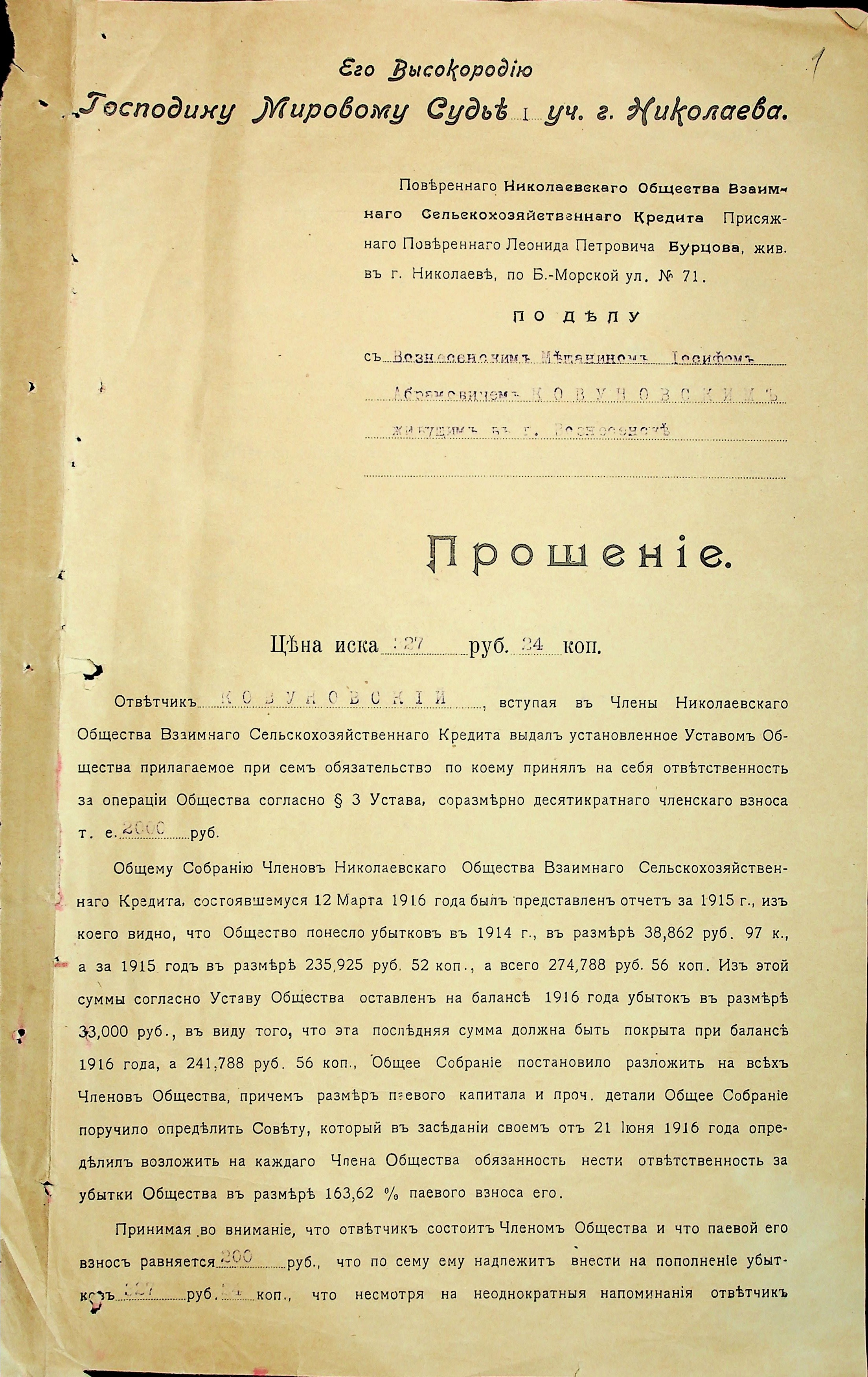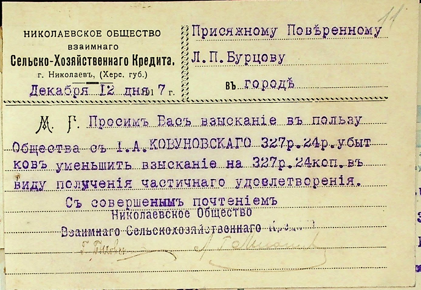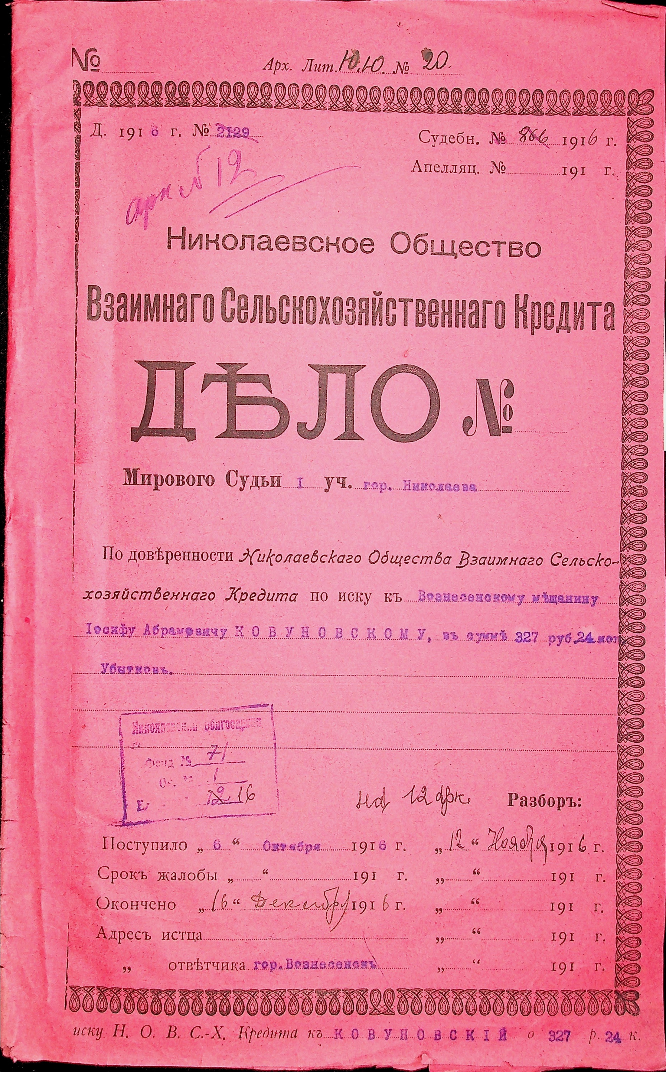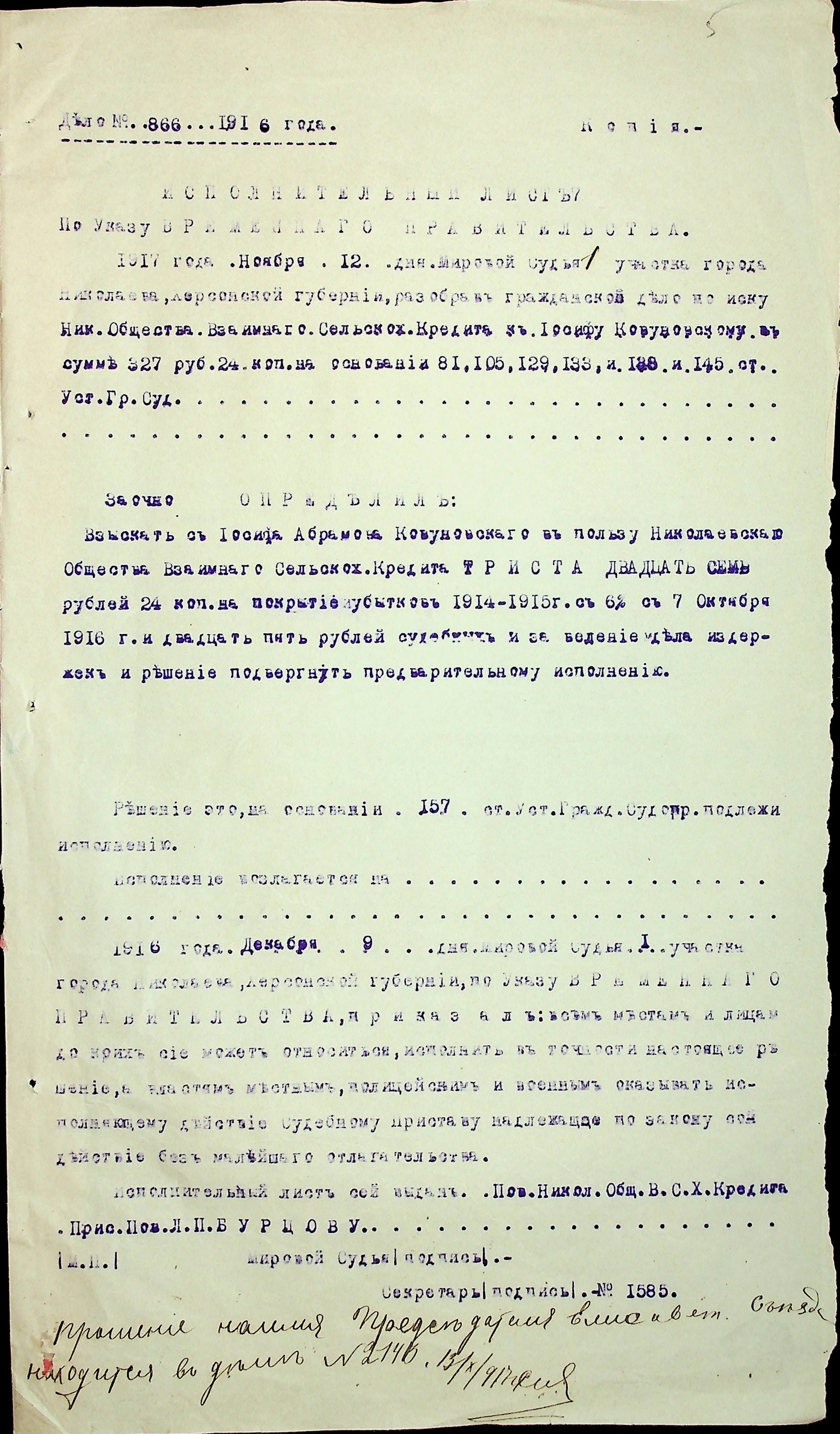 • • • • Справа № 16 “Документи (прохання, протести, квитанції, виконавчі листи, листування тощо) мирового судді дільниці № 1 м. Миколаїв про стягнення грошей за векселями на користь товариства з Кавунівського І.А.”