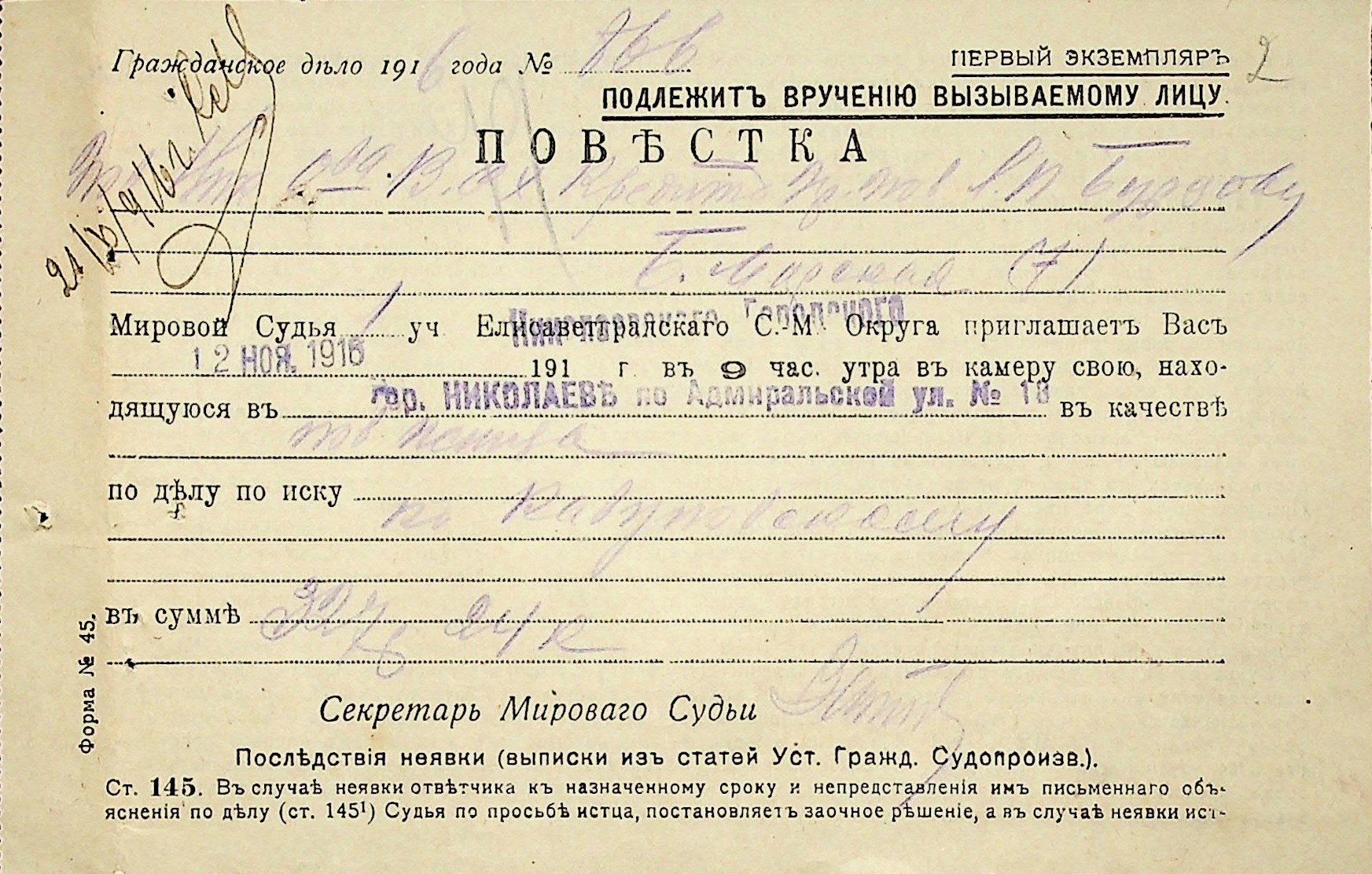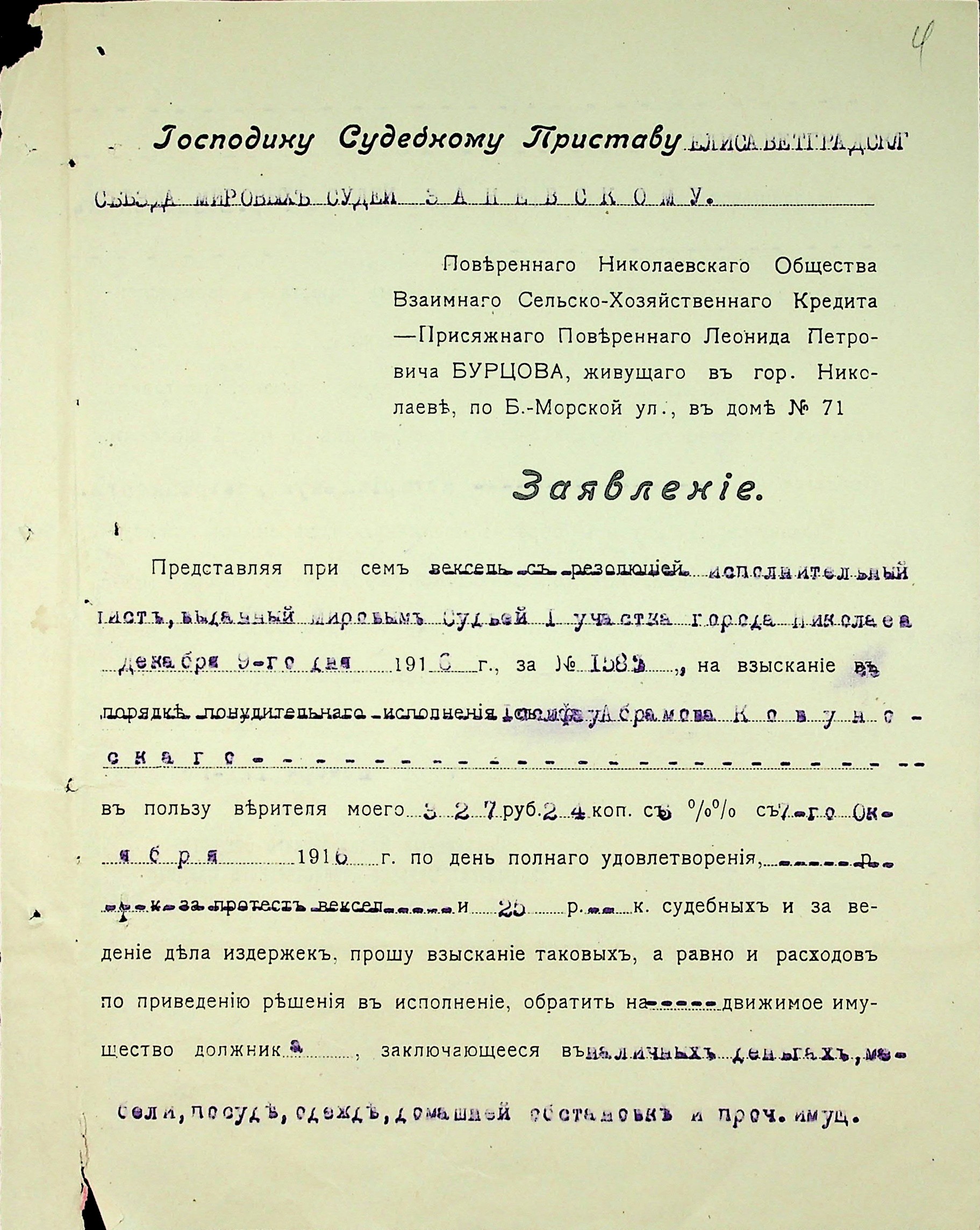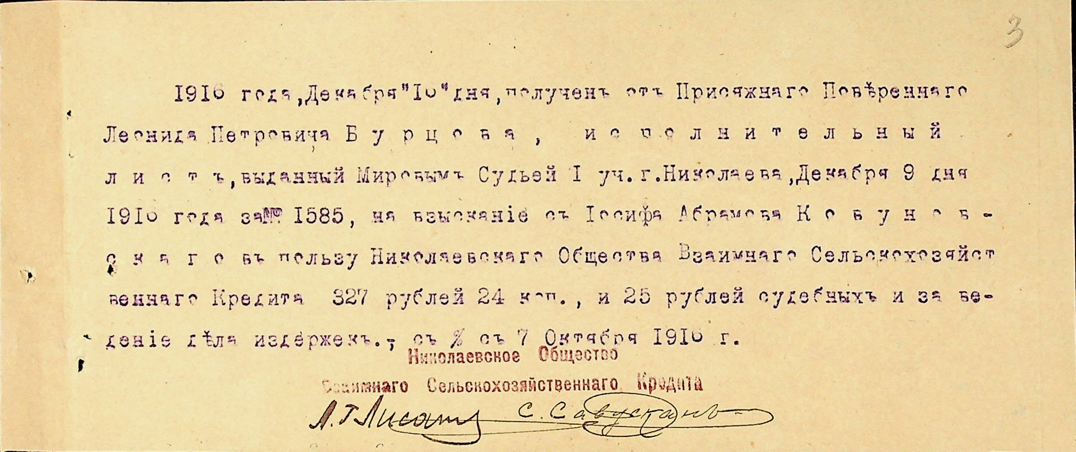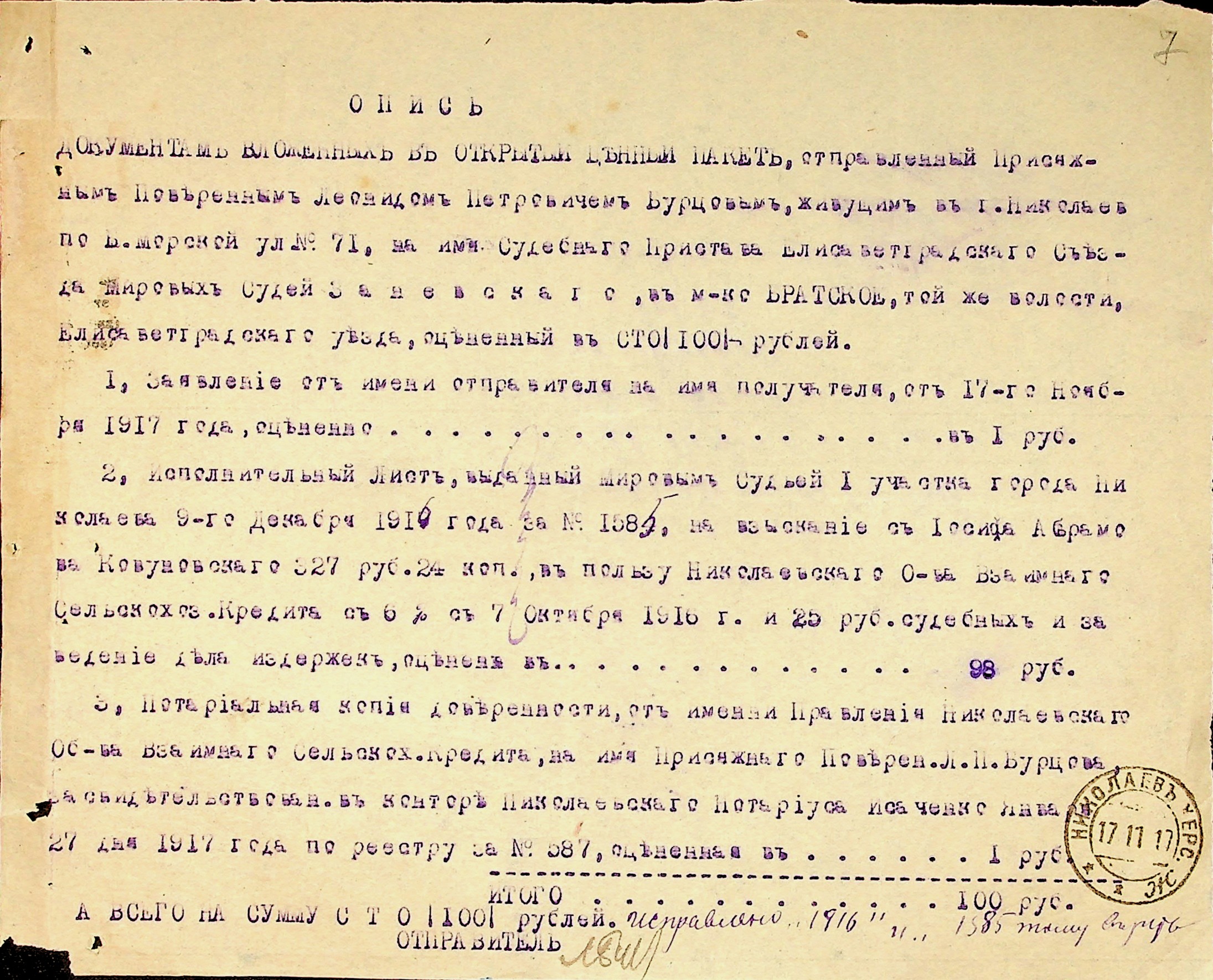 • • • • Справа № 16 “Документи (прохання, протести, квитанції, виконавчі листи, листування тощо) мирового судді дільниці № 1 м. Миколаїв про стягнення грошей за векселями на користь товариства з Кавунівського І.А.”