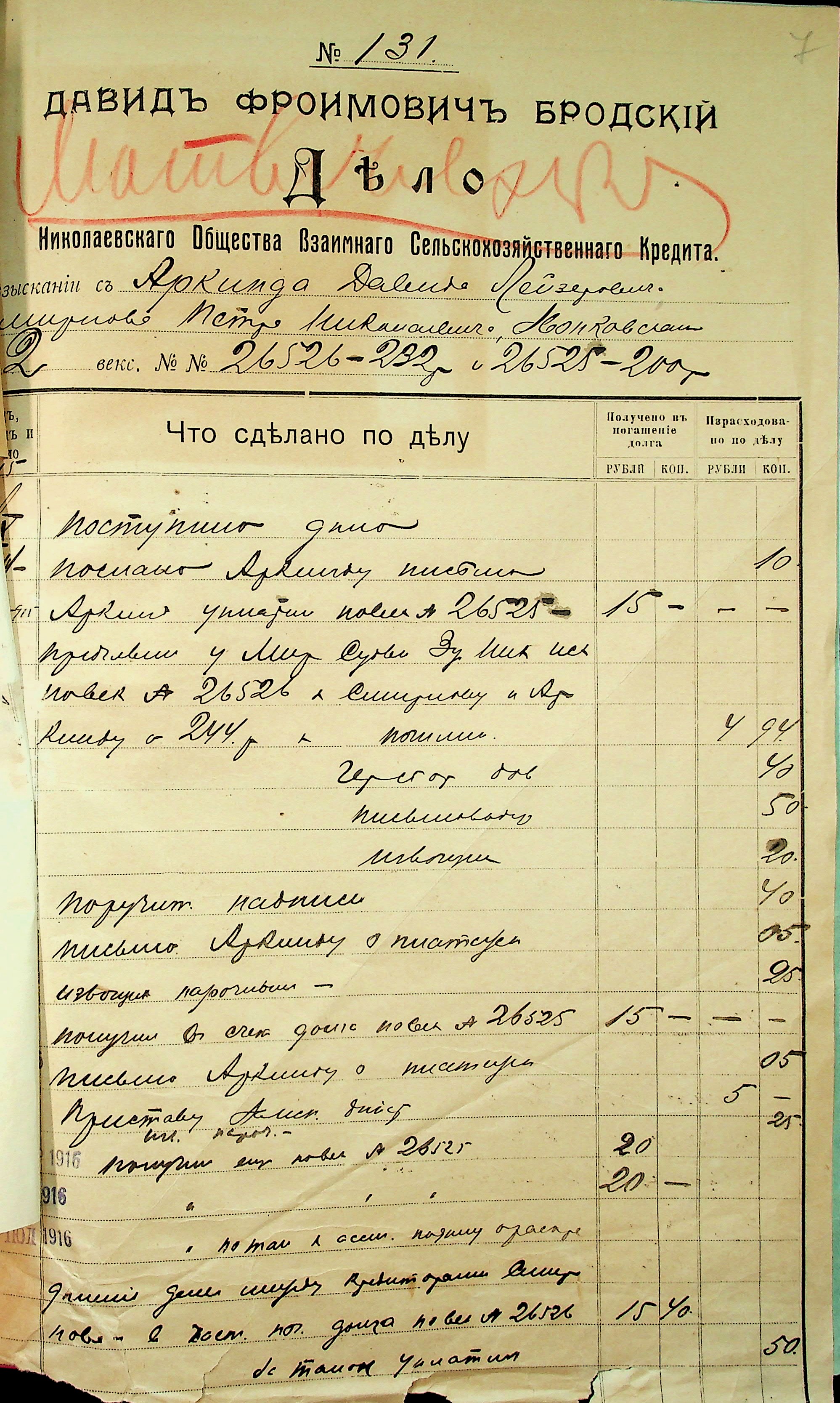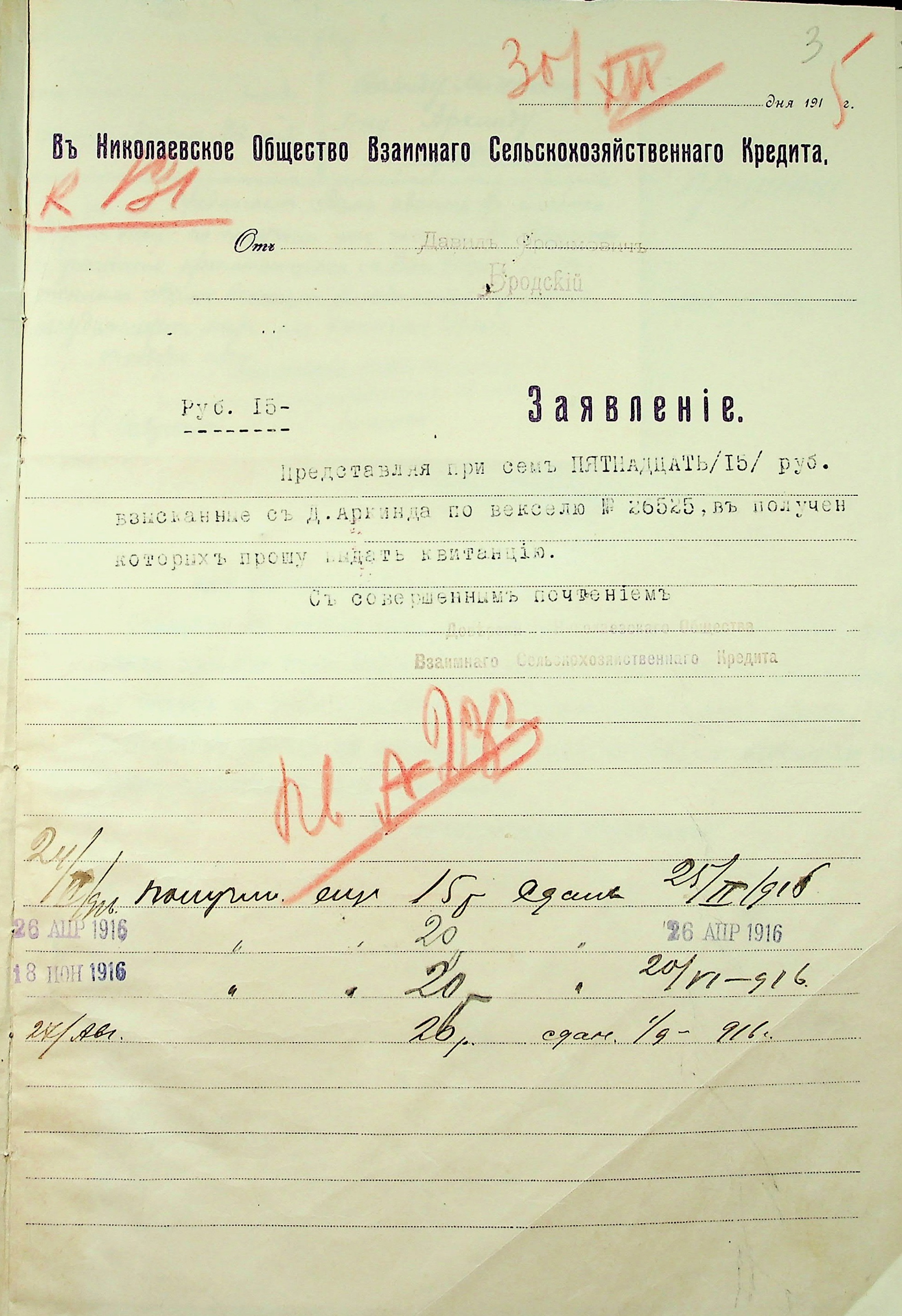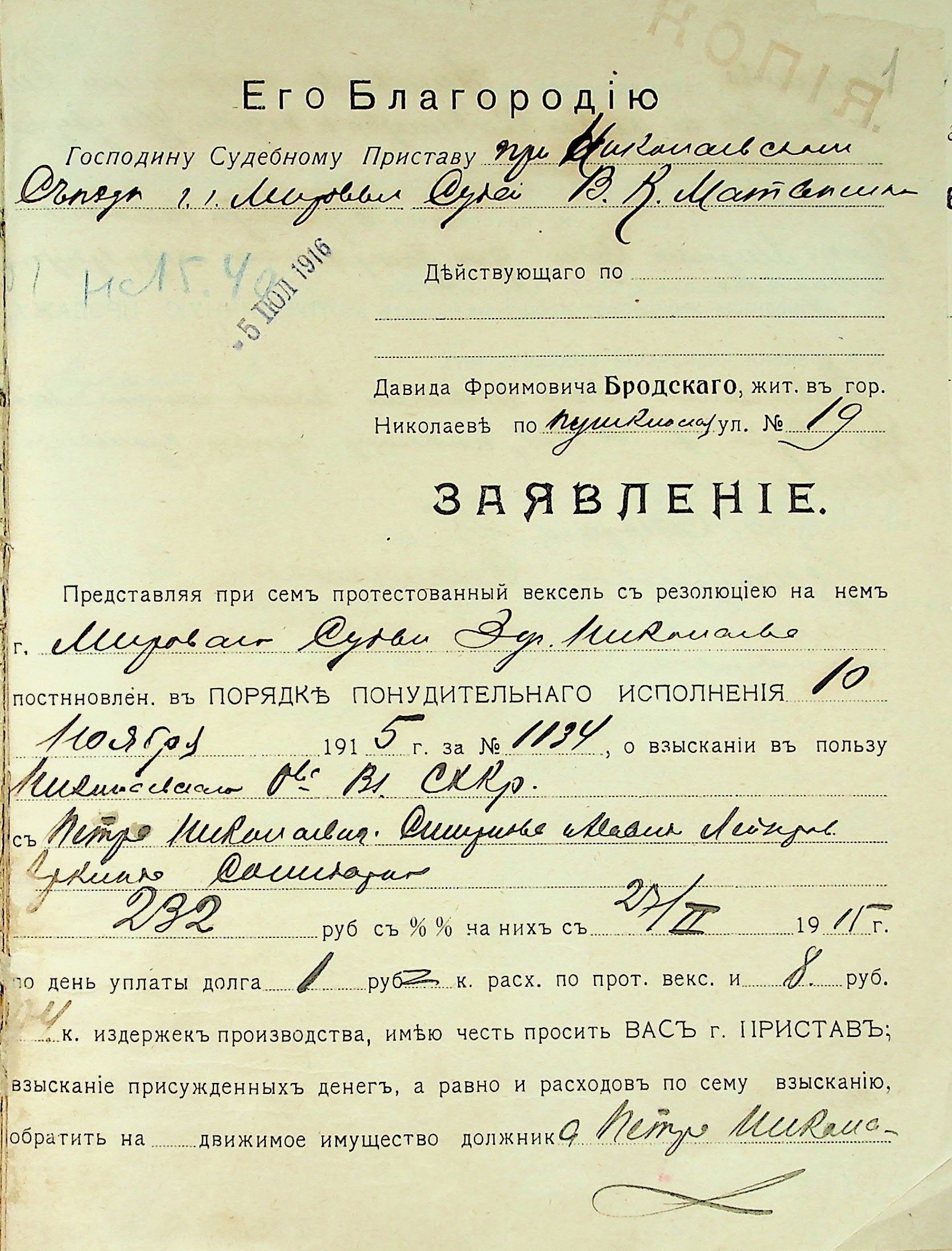 • • • • Справа № 22 “Документи (заяви, квитанції, розписки, листування) мирового судді дільниці № 3 м. Миколаїв про стягнення грошей за векселями на користь товариства з Аркіна Д.Л. і Смирнова П.М.”