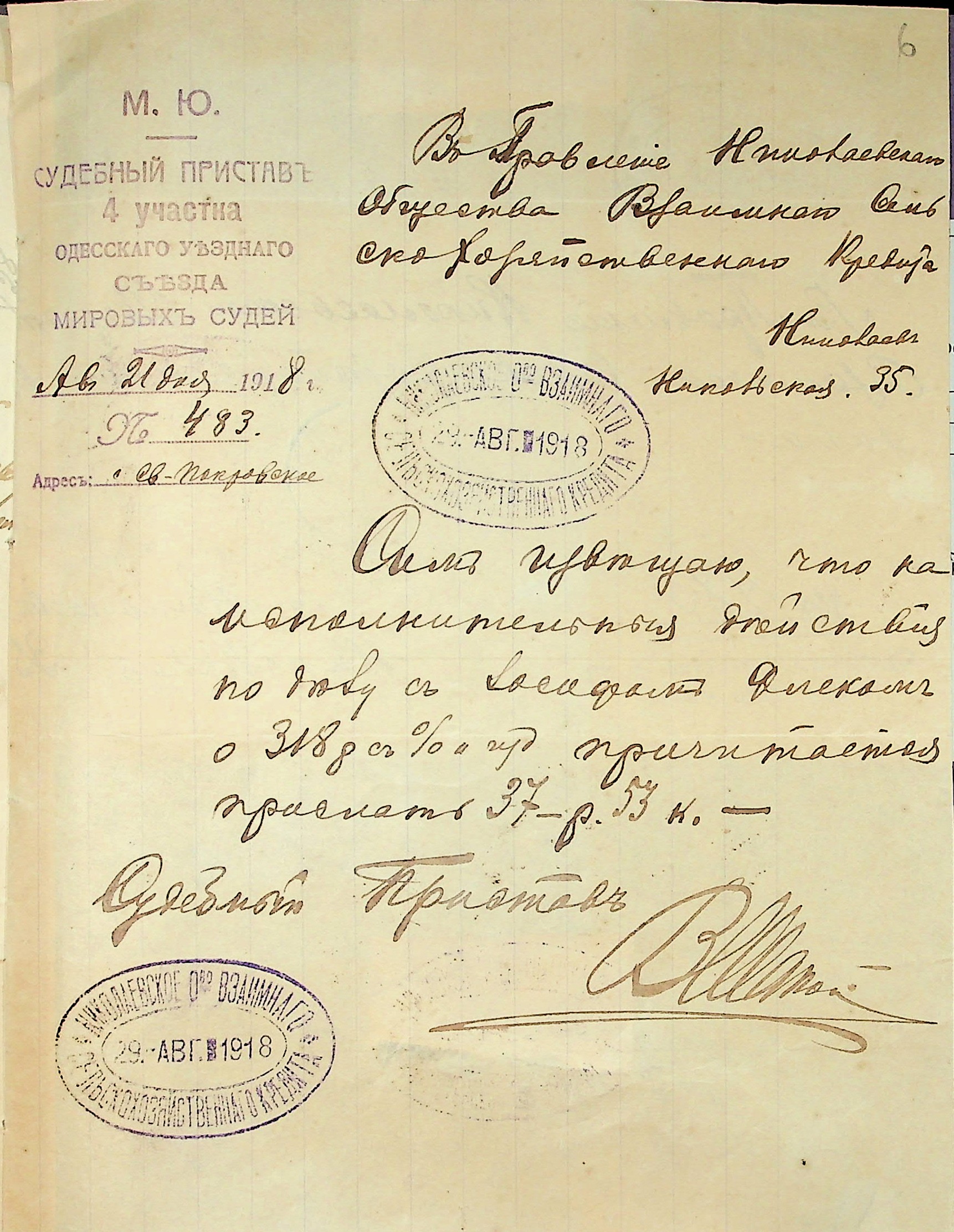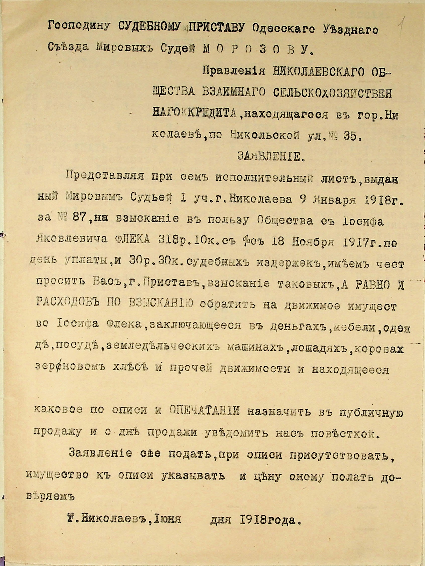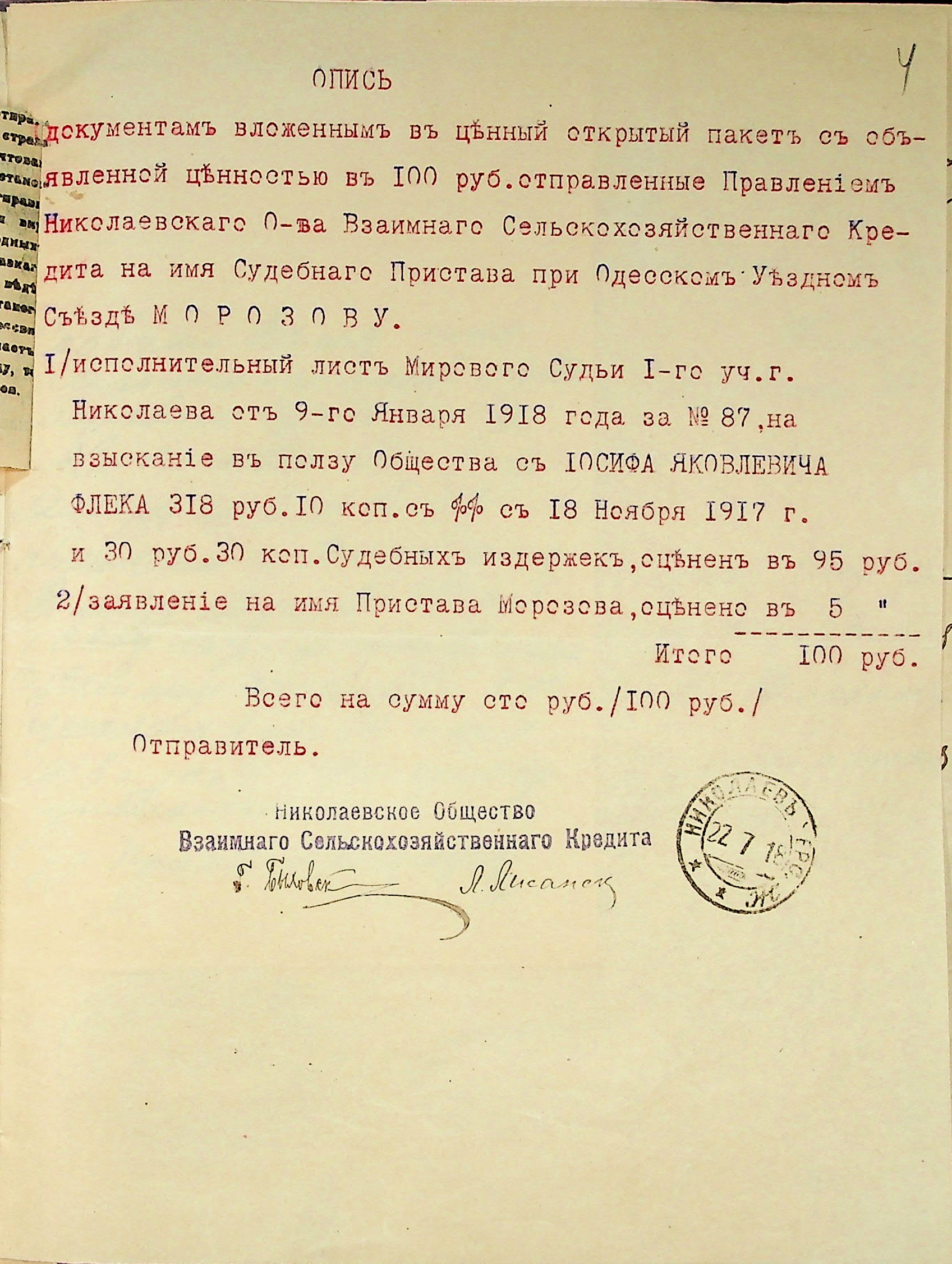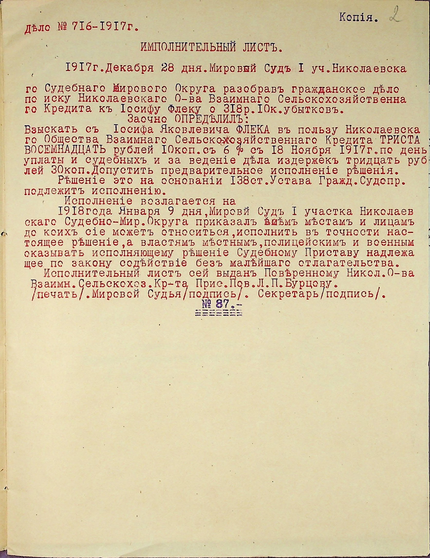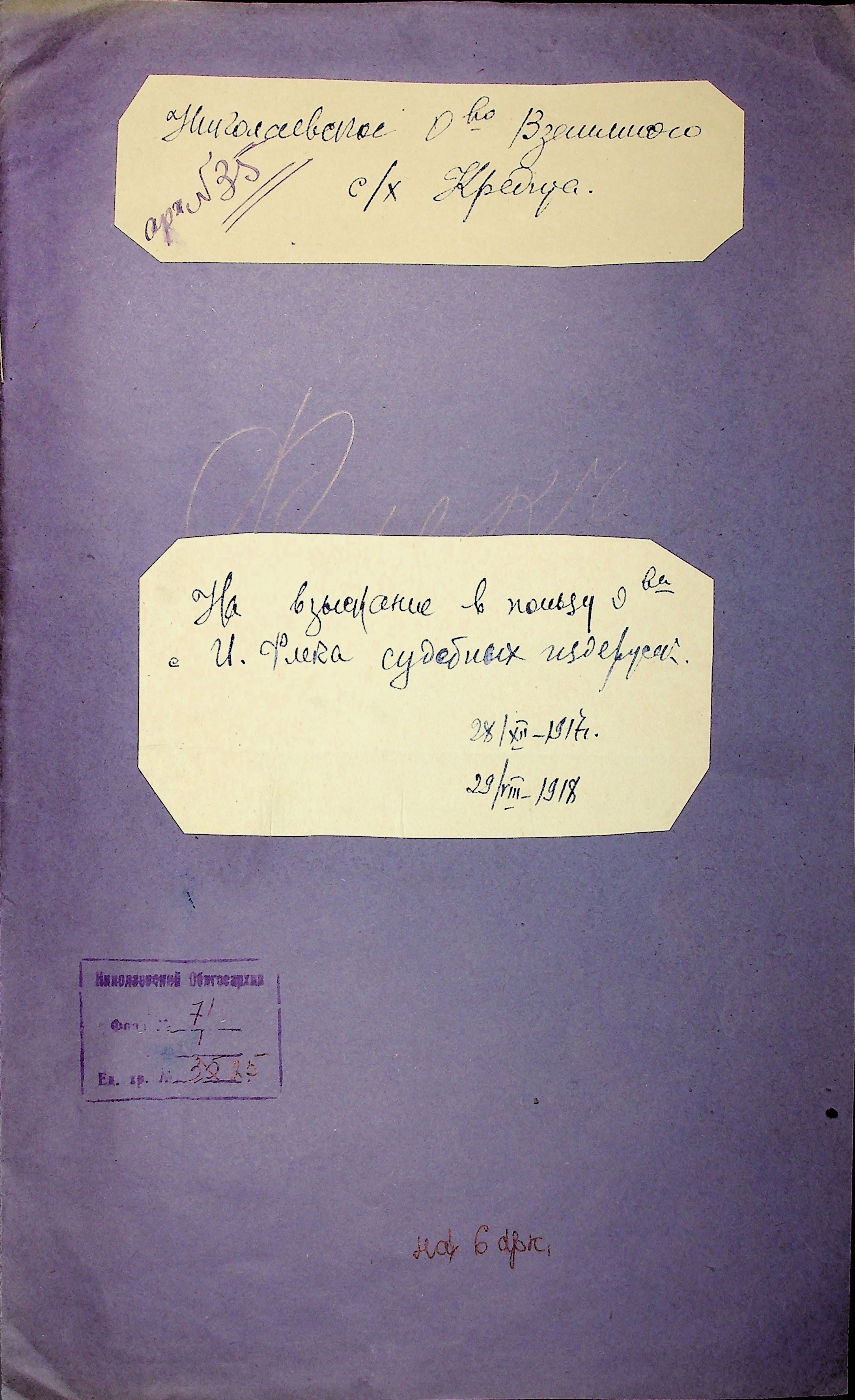 • • • • Справа № 25 “Заява правління Миколаївського товариства взаємного сільськогосподарського кредиту про стягнення судових витрат на користь товариства з Флека І.Я.; копії векселів”