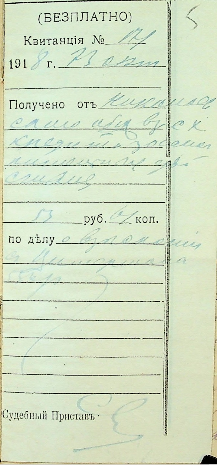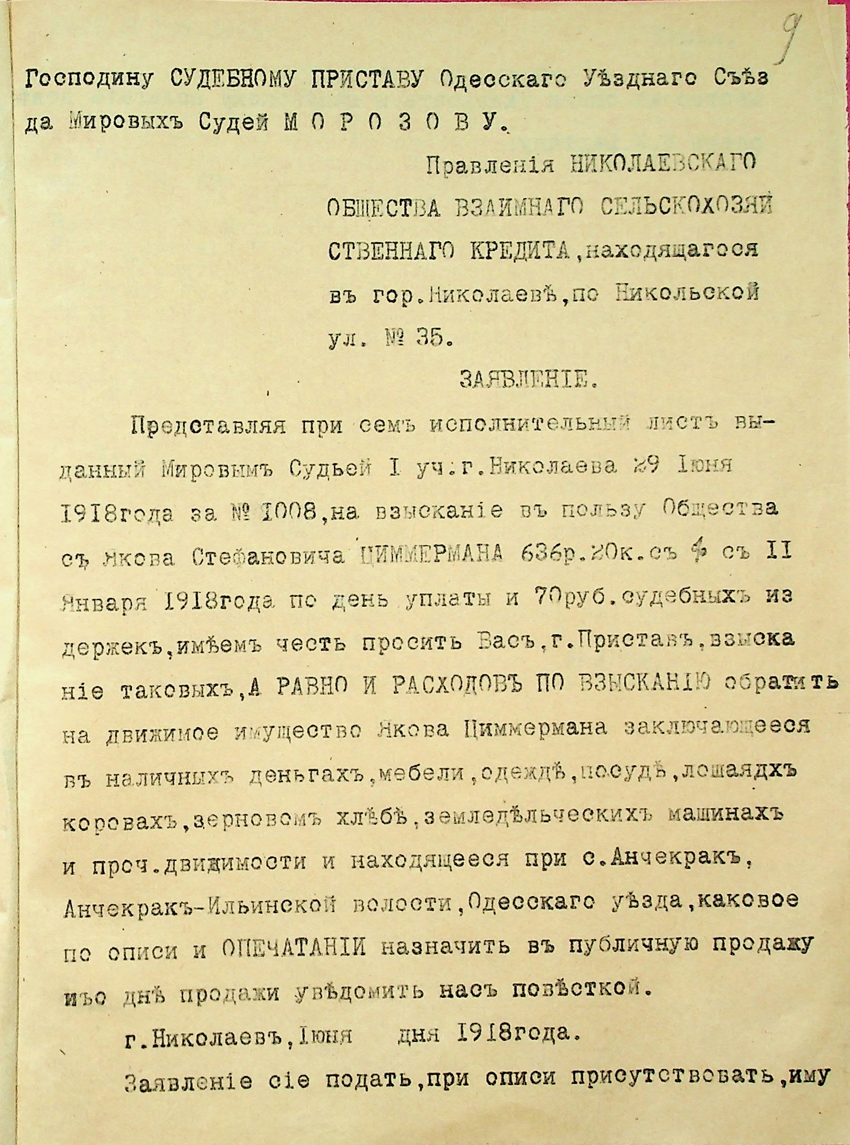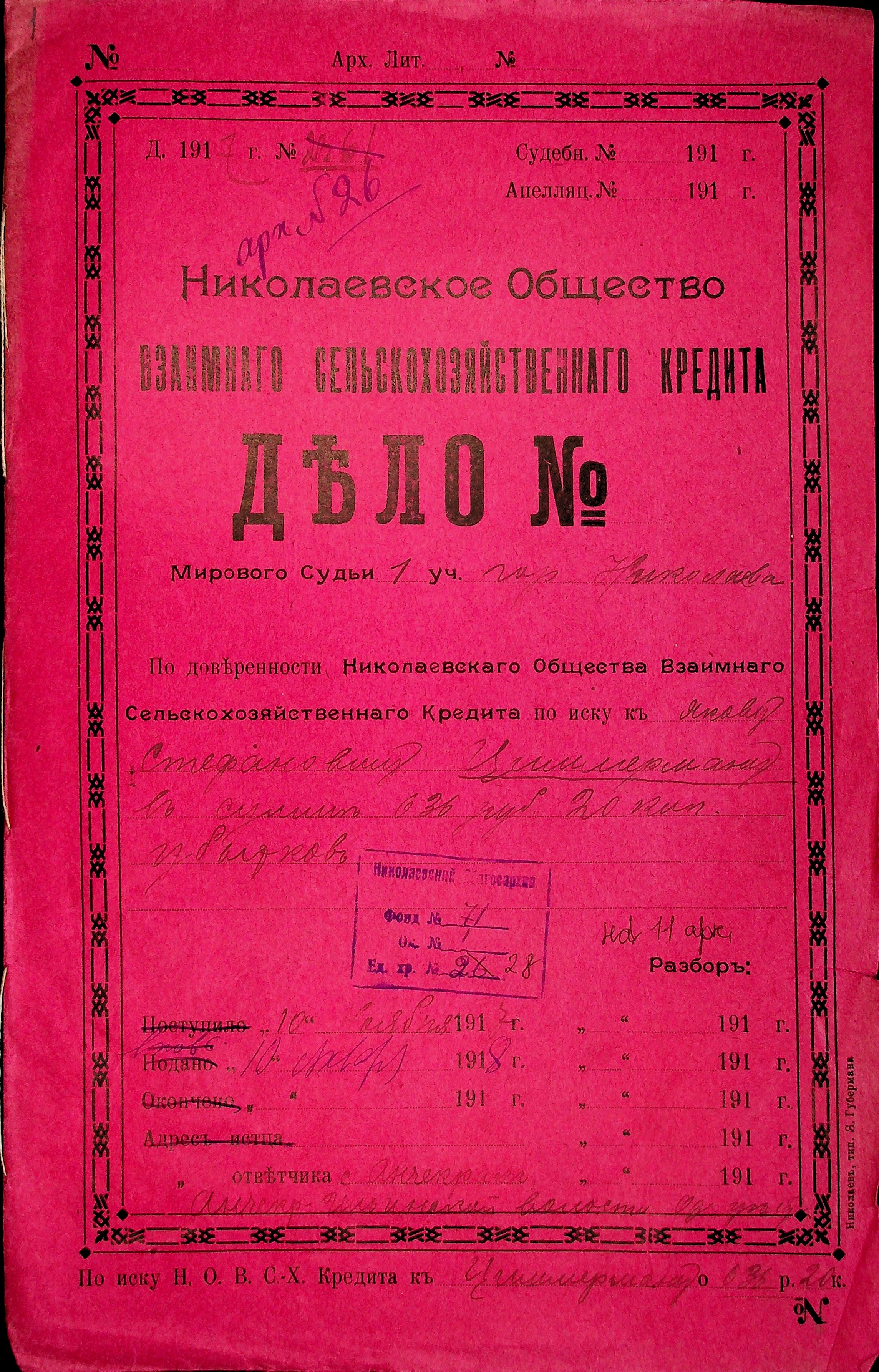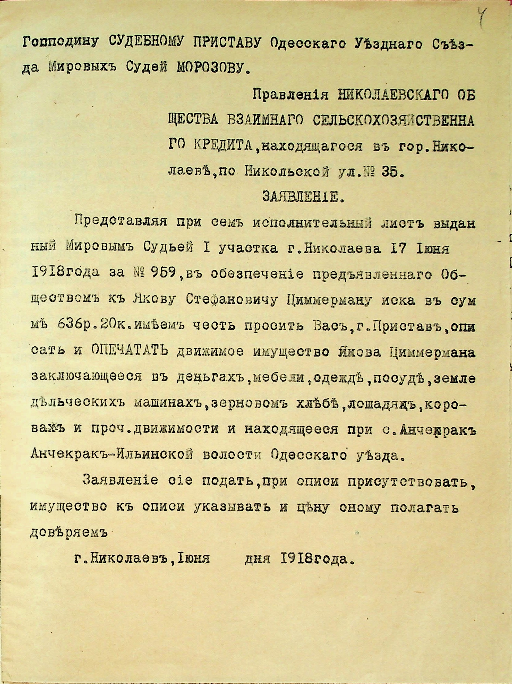 • • • • Справа № 28 “Документи (заява, прохання, квитанція) мирового судді дільниці № 1 м. Миколаїв про стягнення грошей за векселями на користь товариства з Цимермана Я.С.”