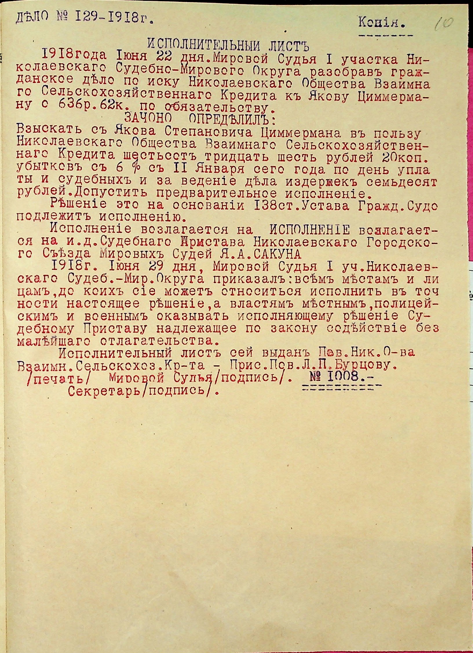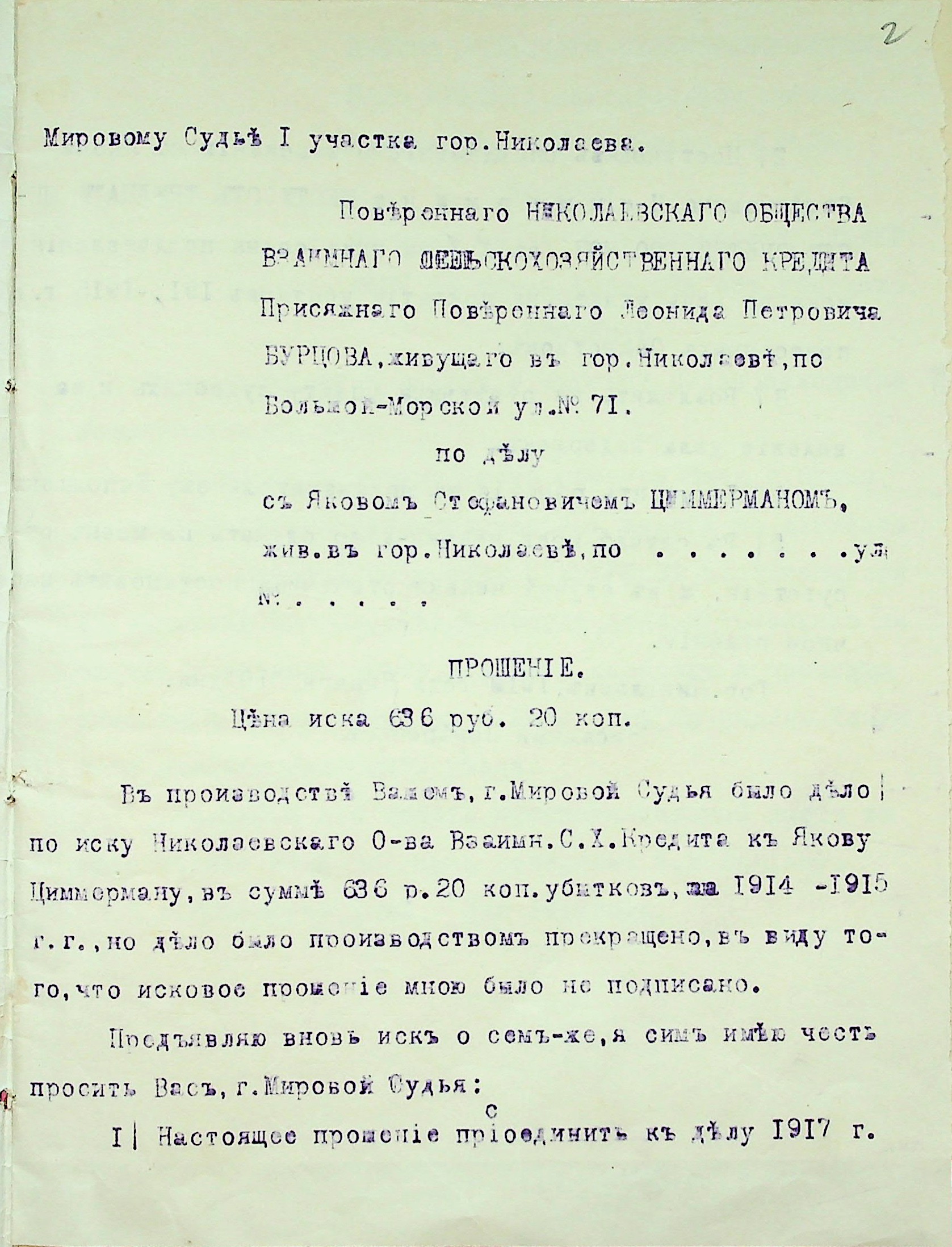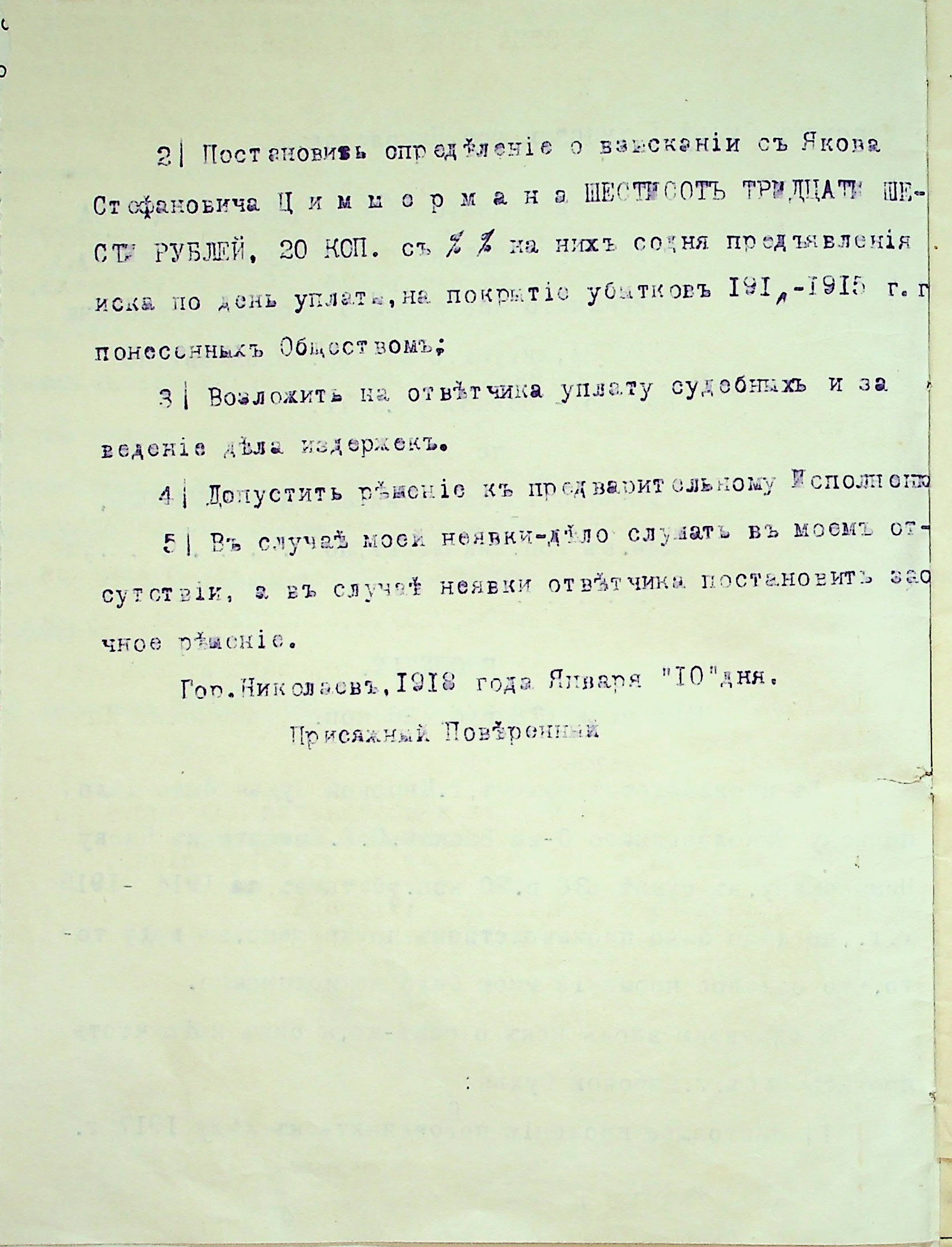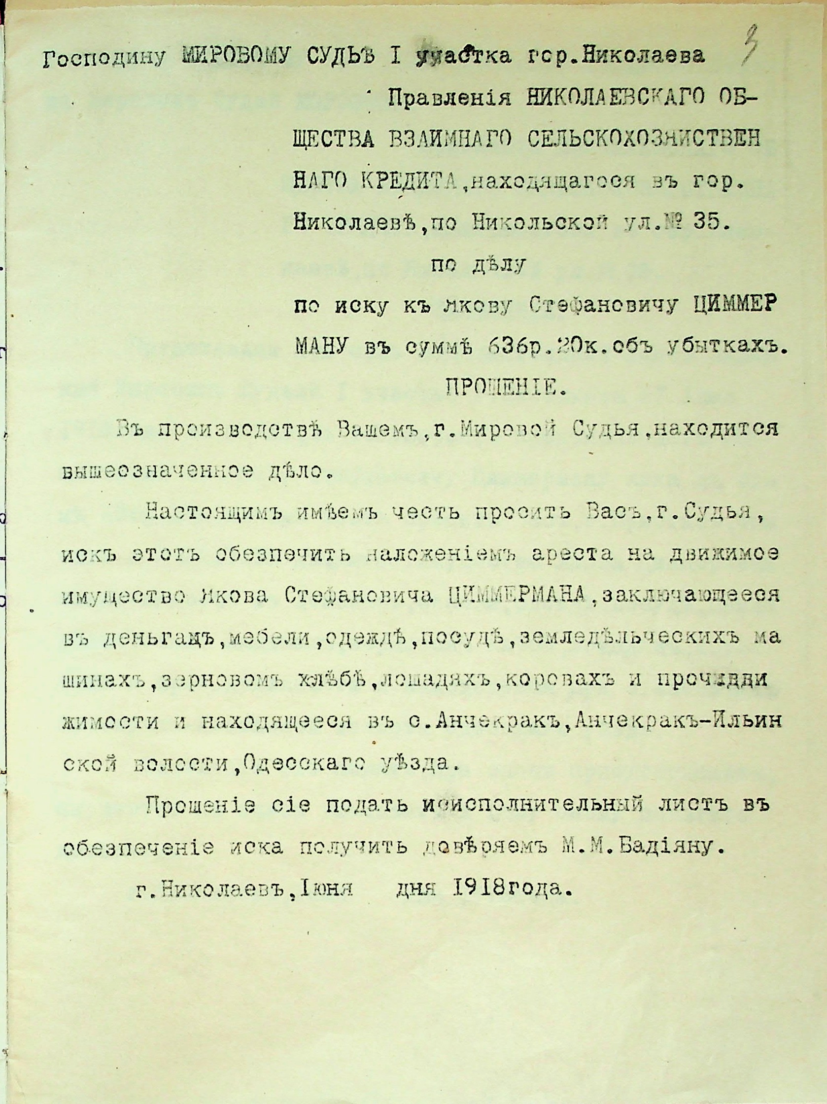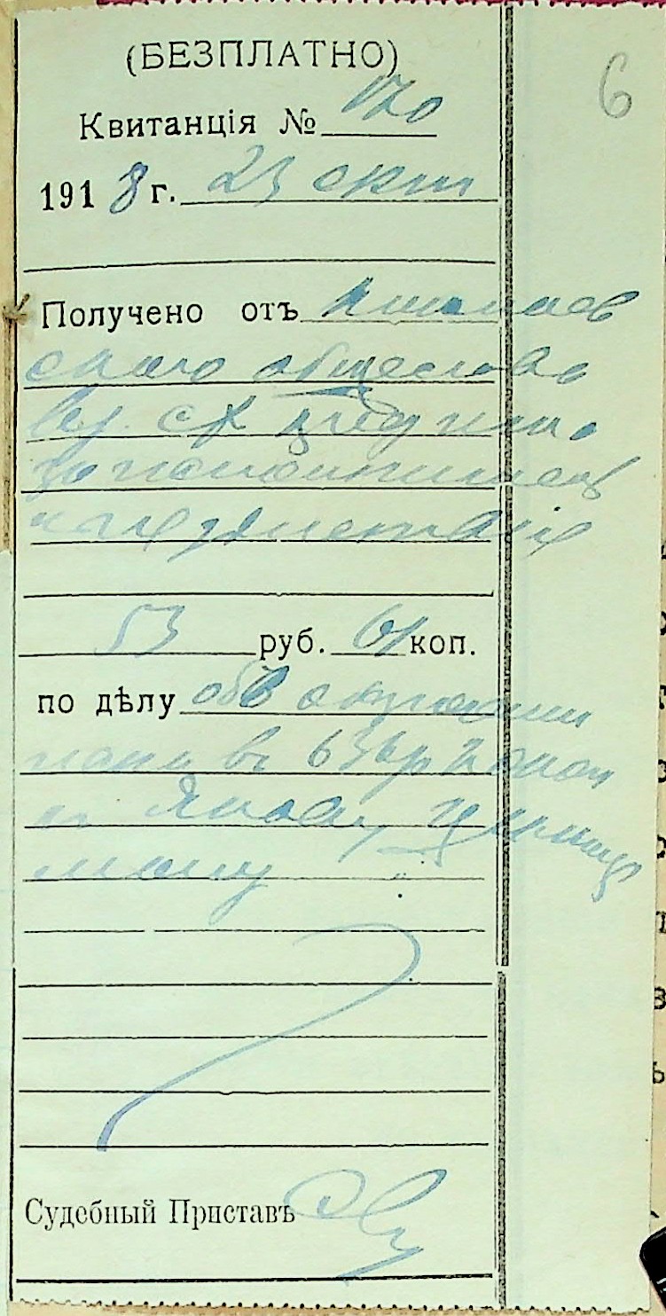 • • • • Справа № 28 “Документи (заява, прохання, квитанція) мирового судді дільниці № 1 м. Миколаїв про стягнення грошей за векселями на користь товариства з Цимермана Я.С.”