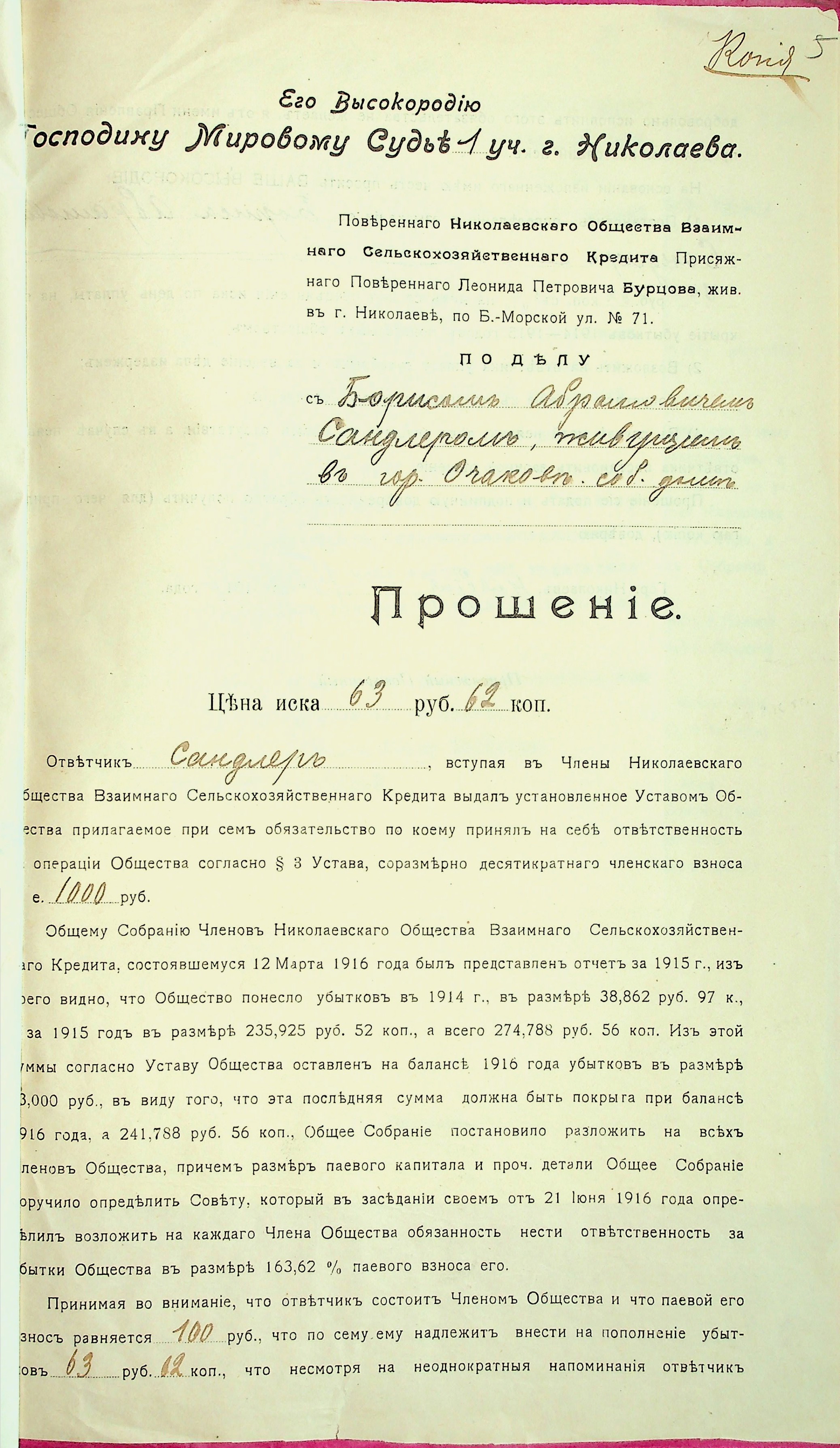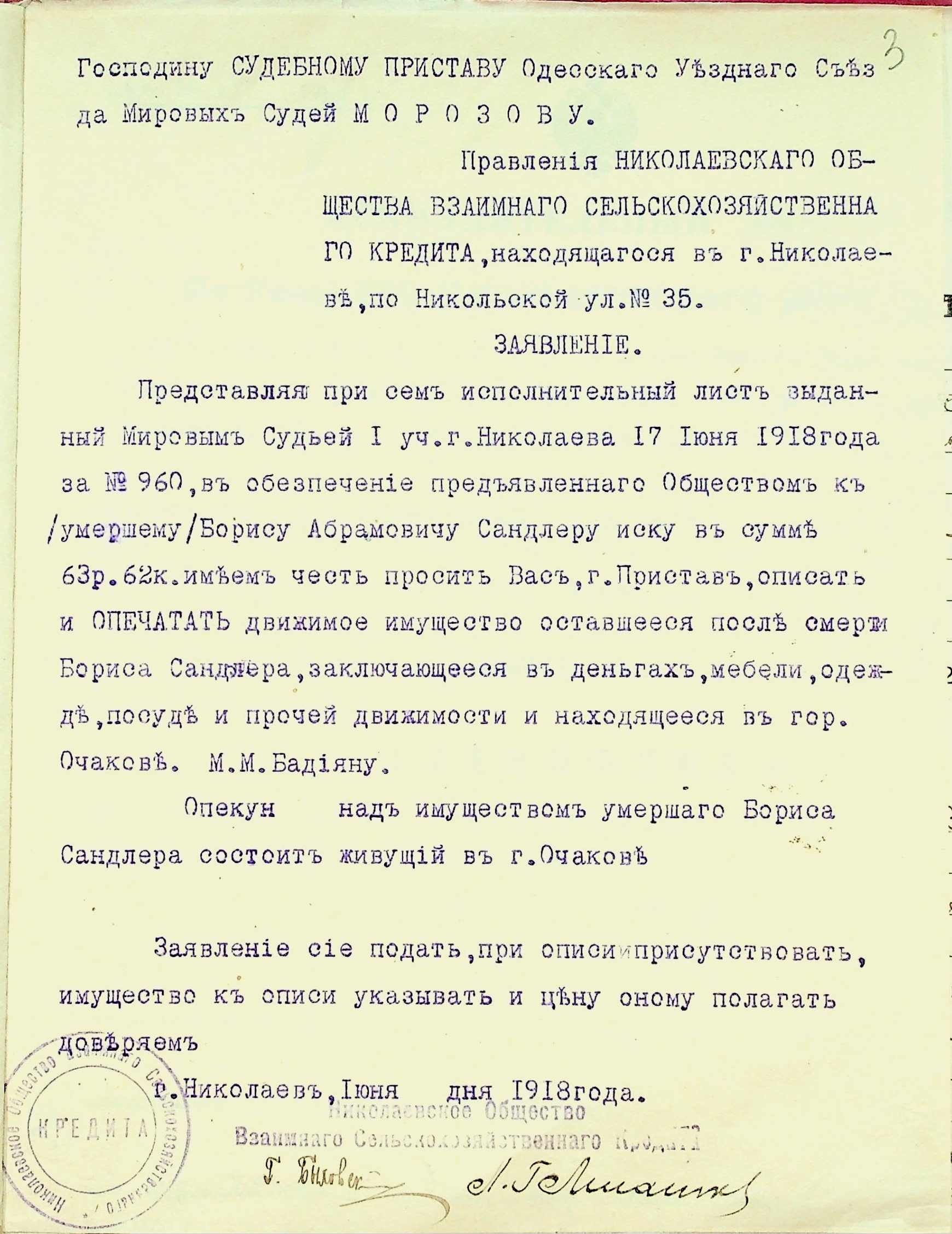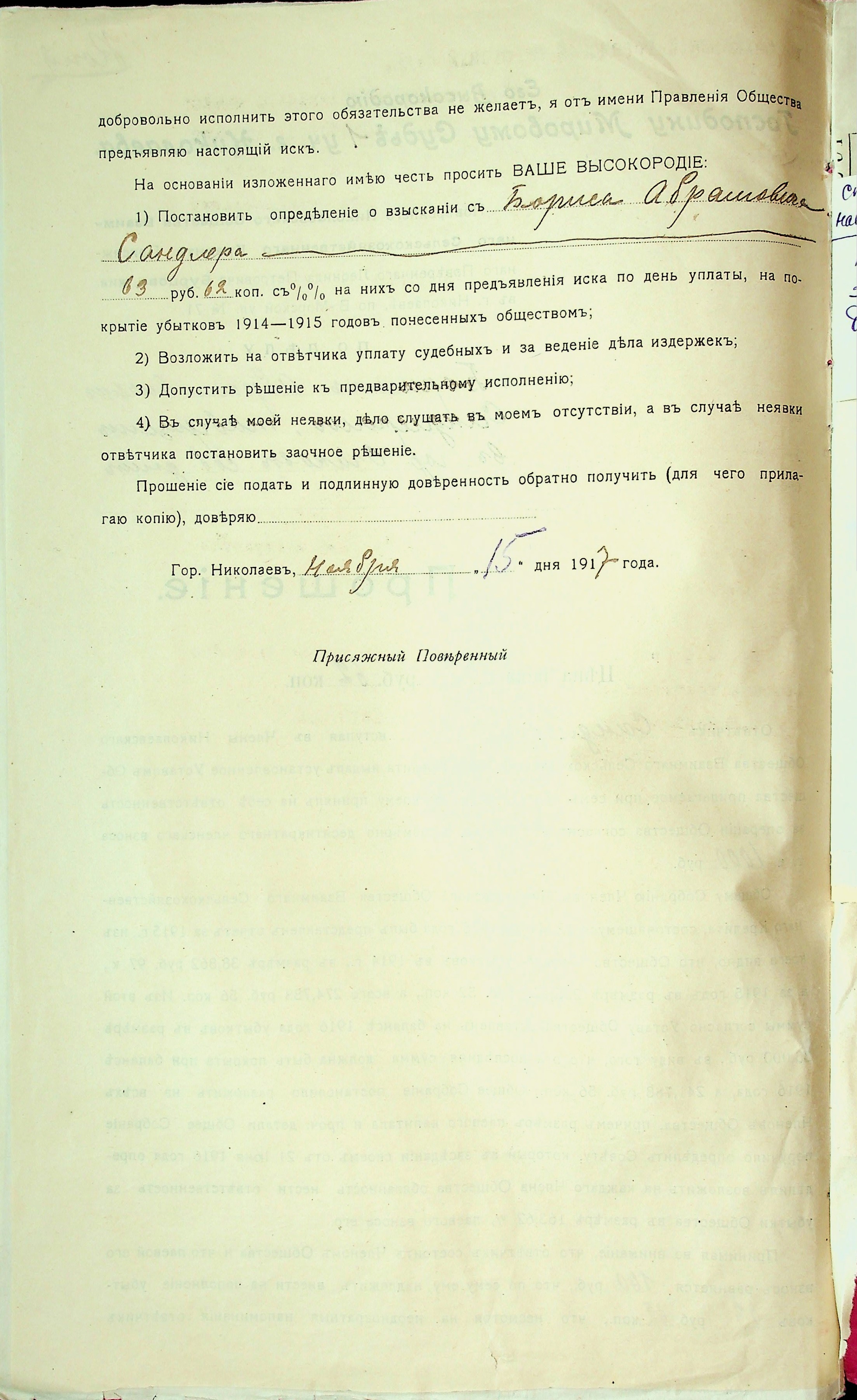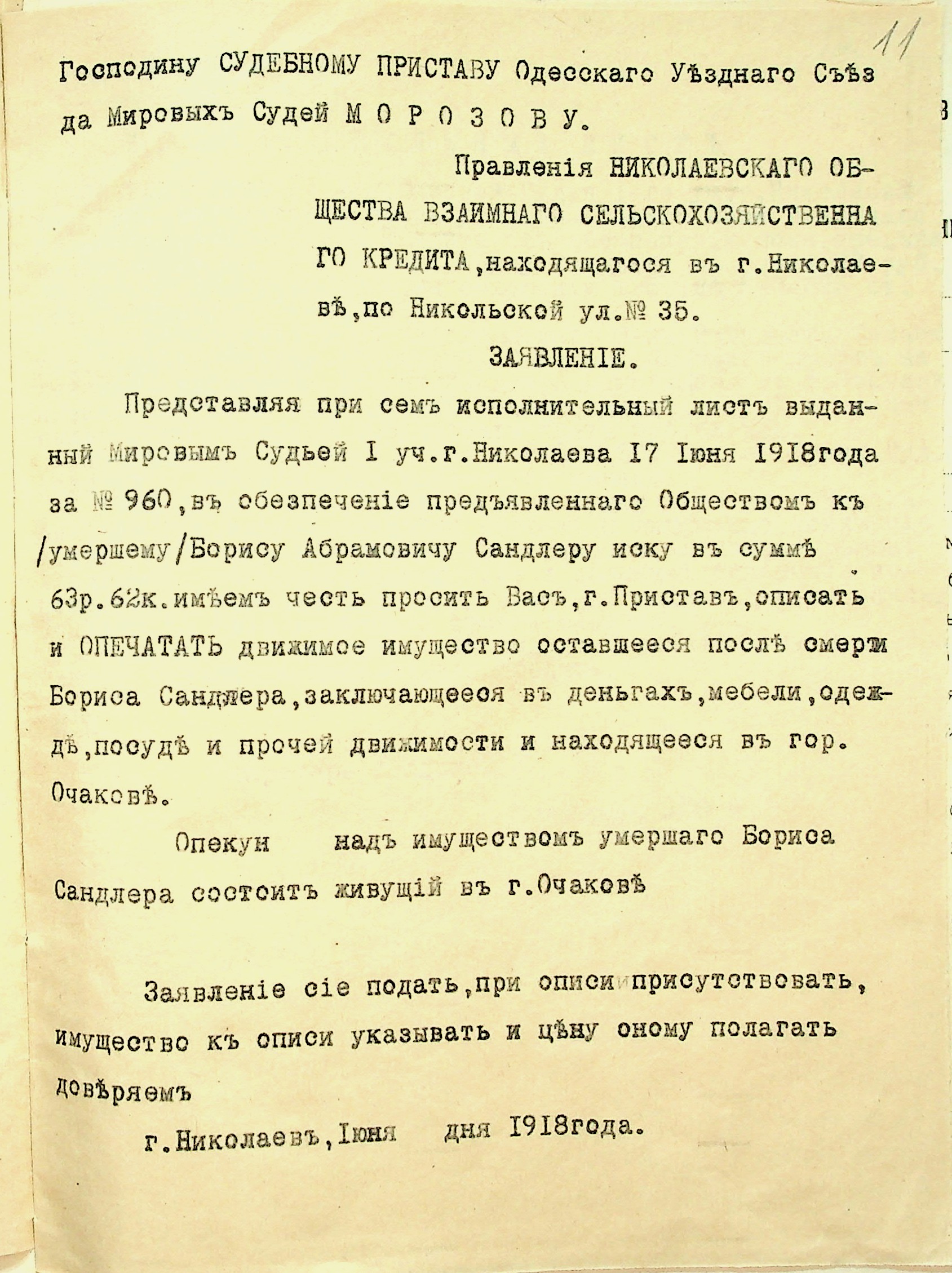• • • • Справа № 29 “Документи (заява, прохання, квитанція) мирового судді дільниці № 1 м. Миколаїв про стягнення грошей за векселями на користь товариства з Сандлера Б.А.”