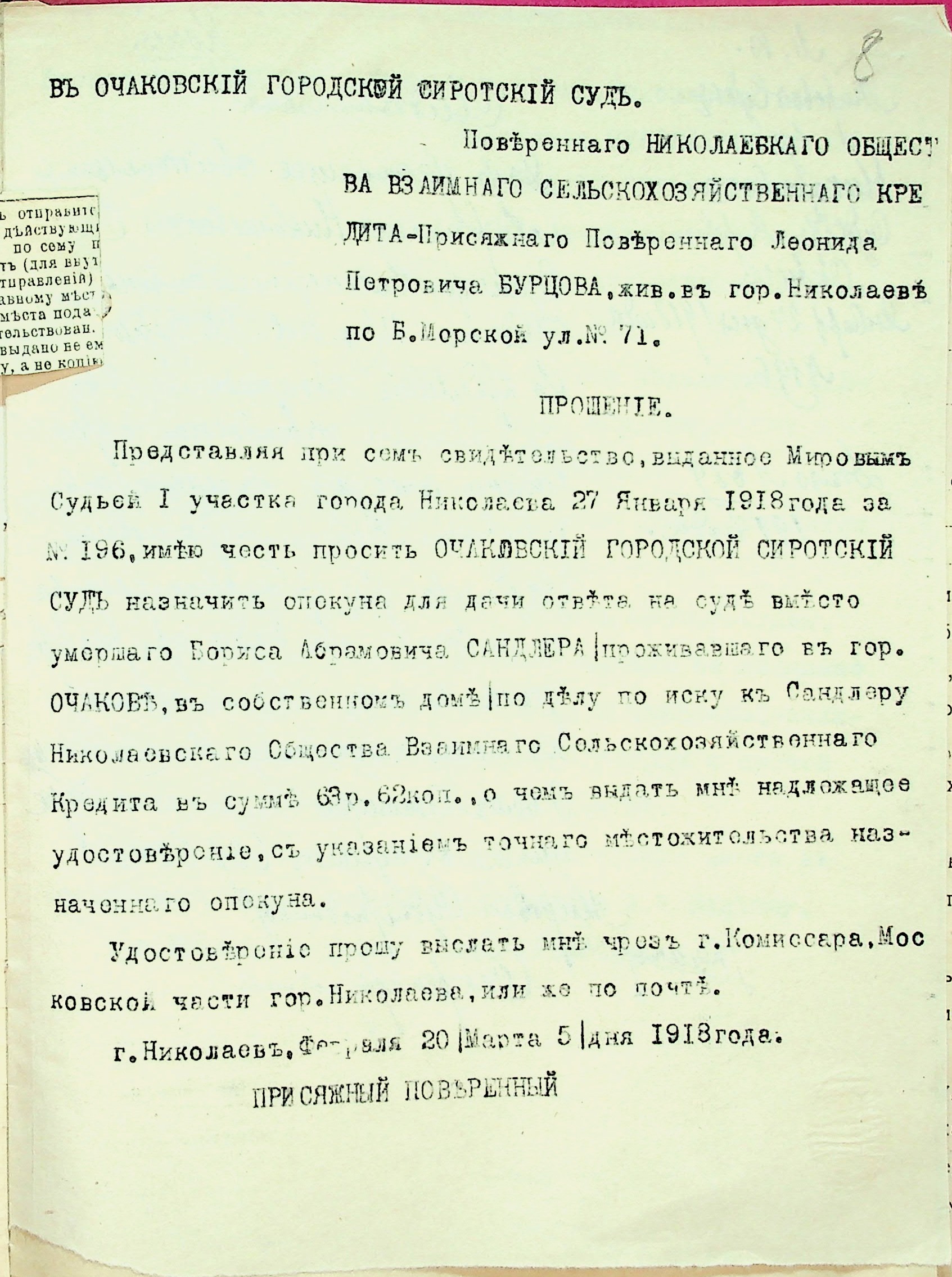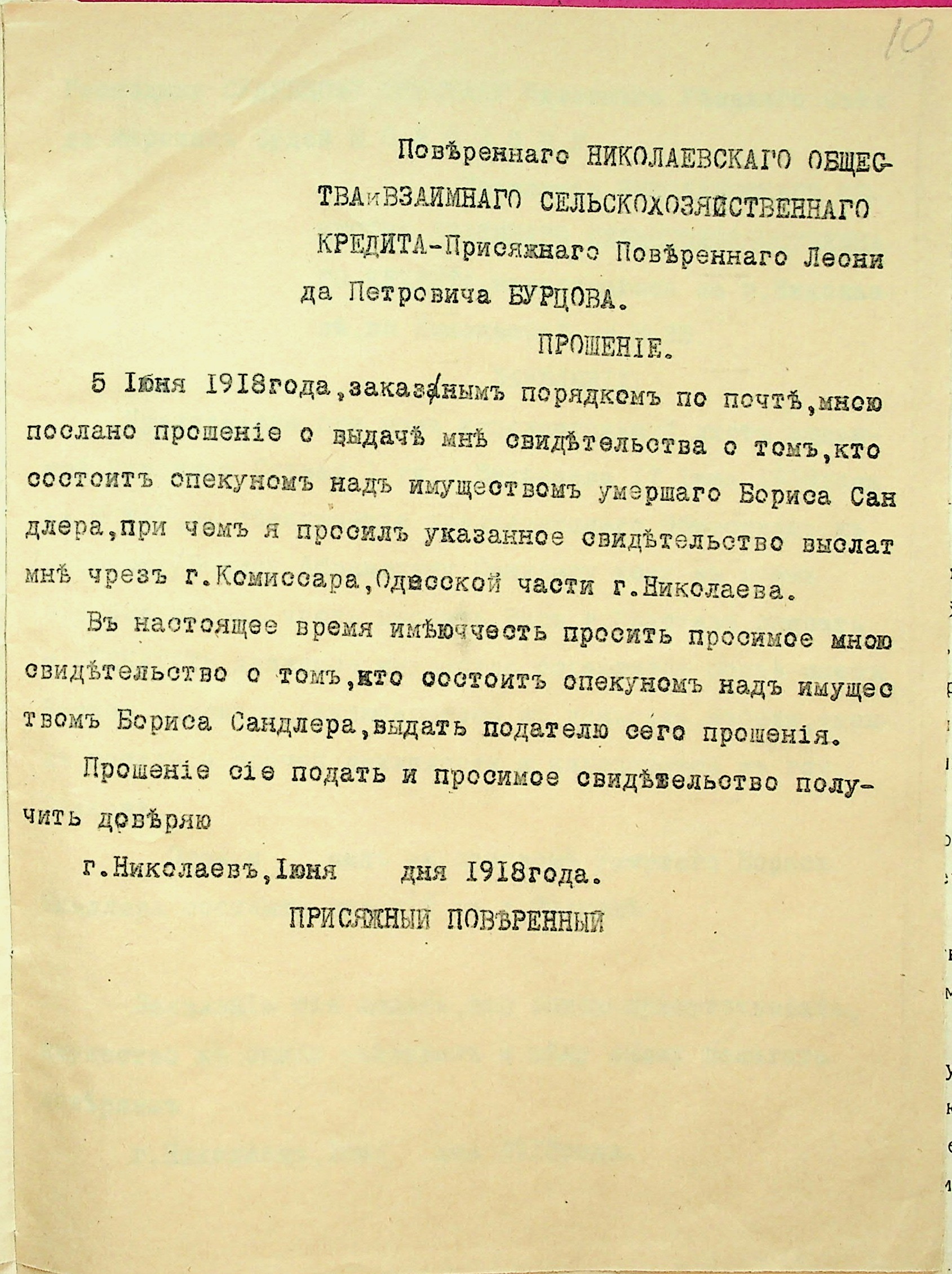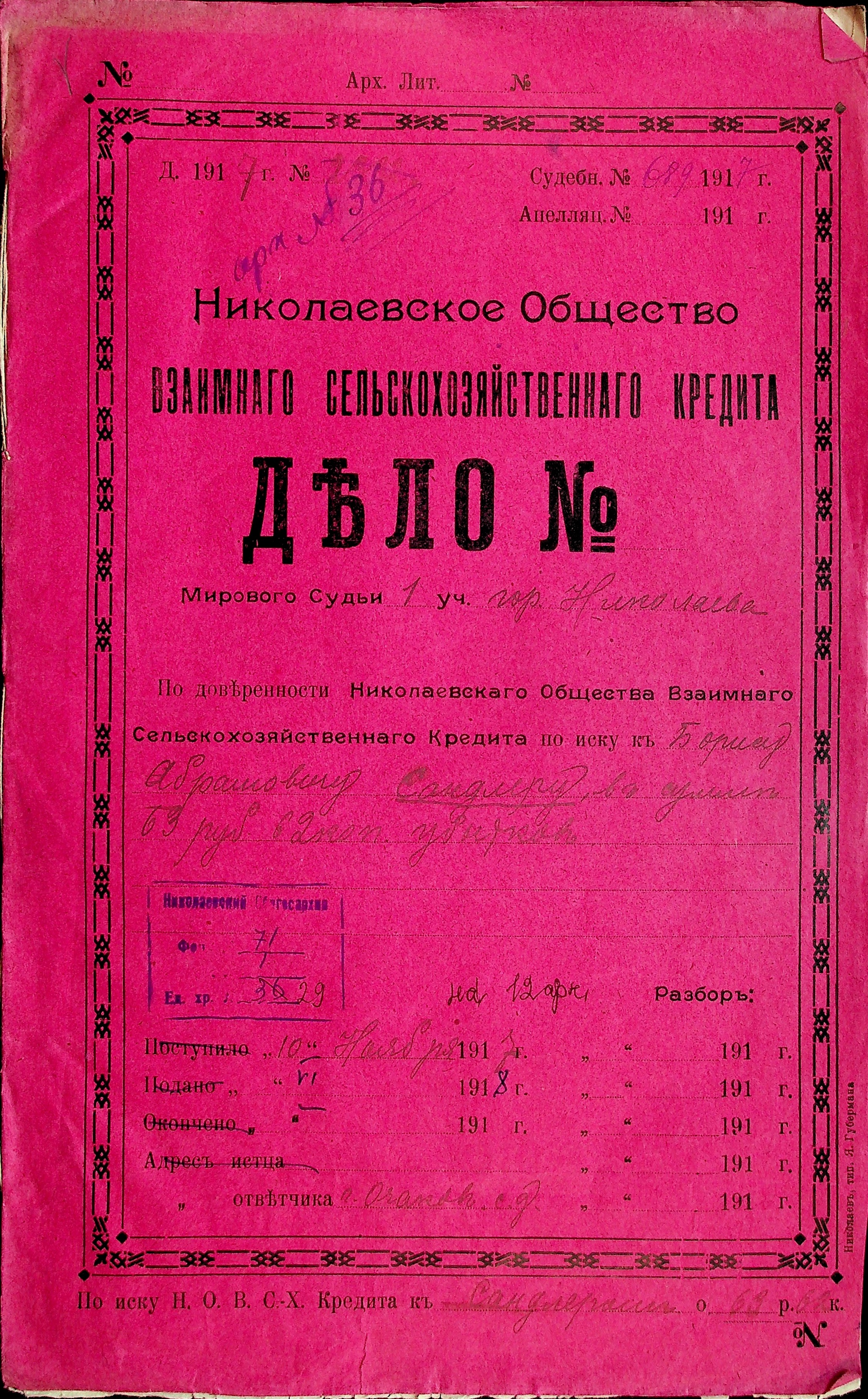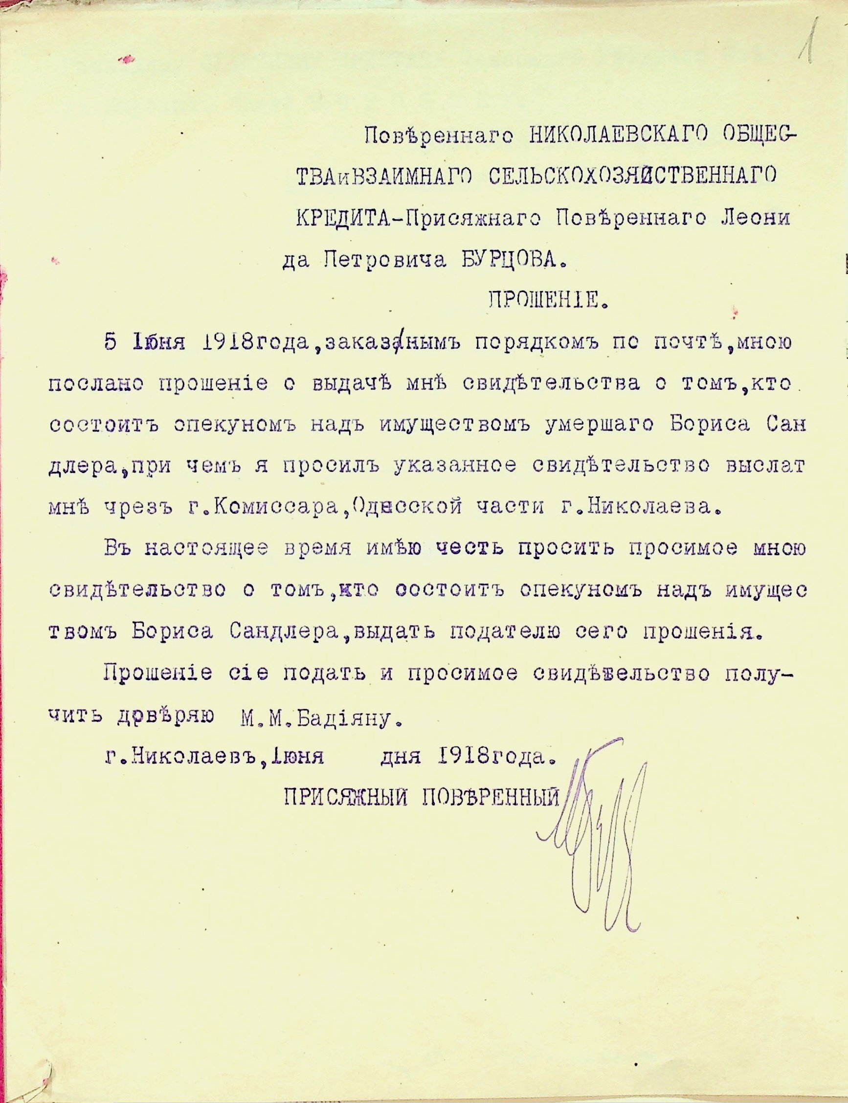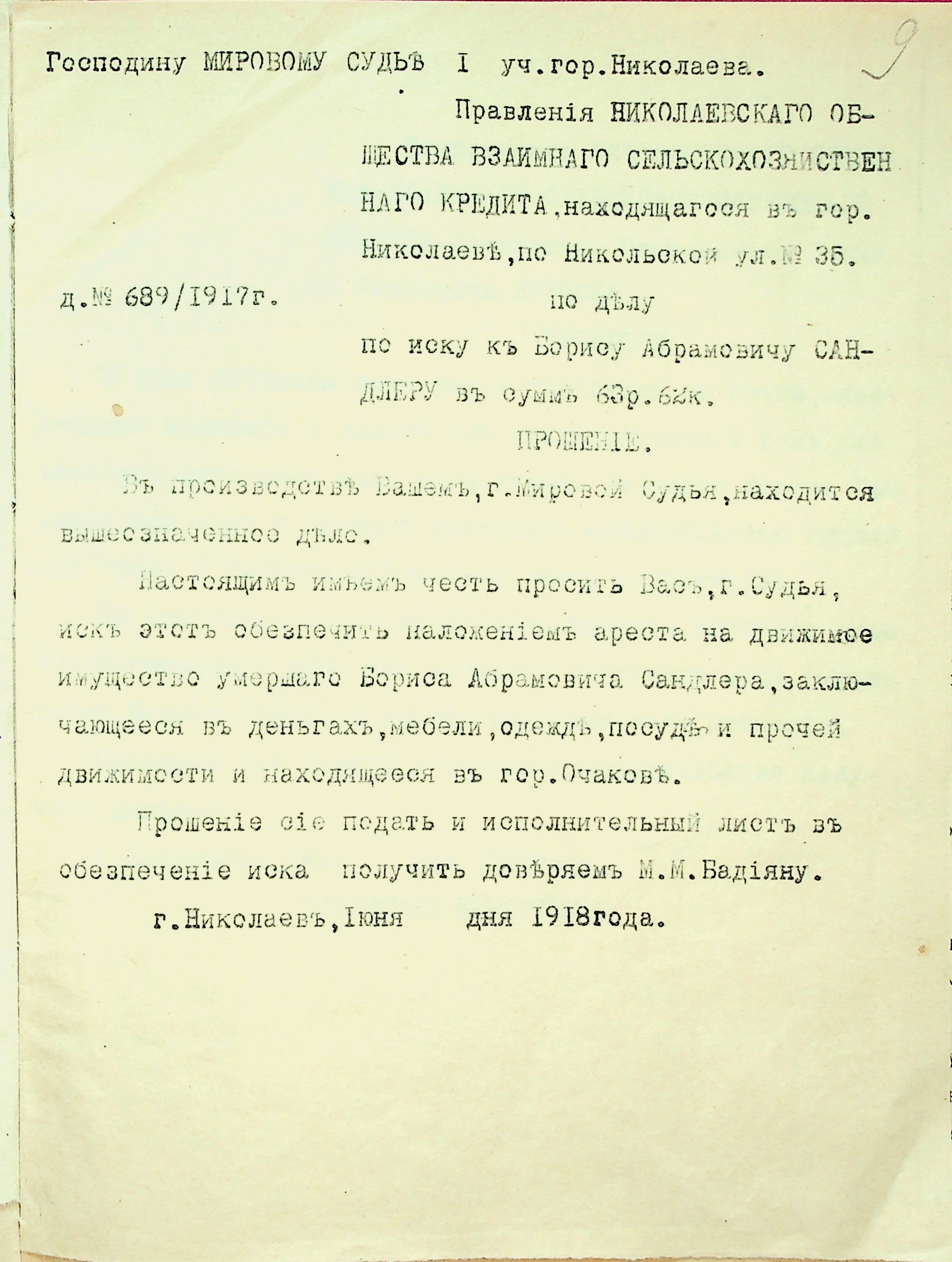 • • • • Справа № 29 “Документи (заява, прохання, квитанція) мирового судді дільниці № 1 м. Миколаїв про стягнення грошей за векселями на користь товариства з Сандлера Б.А.”