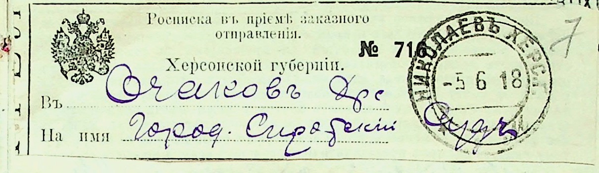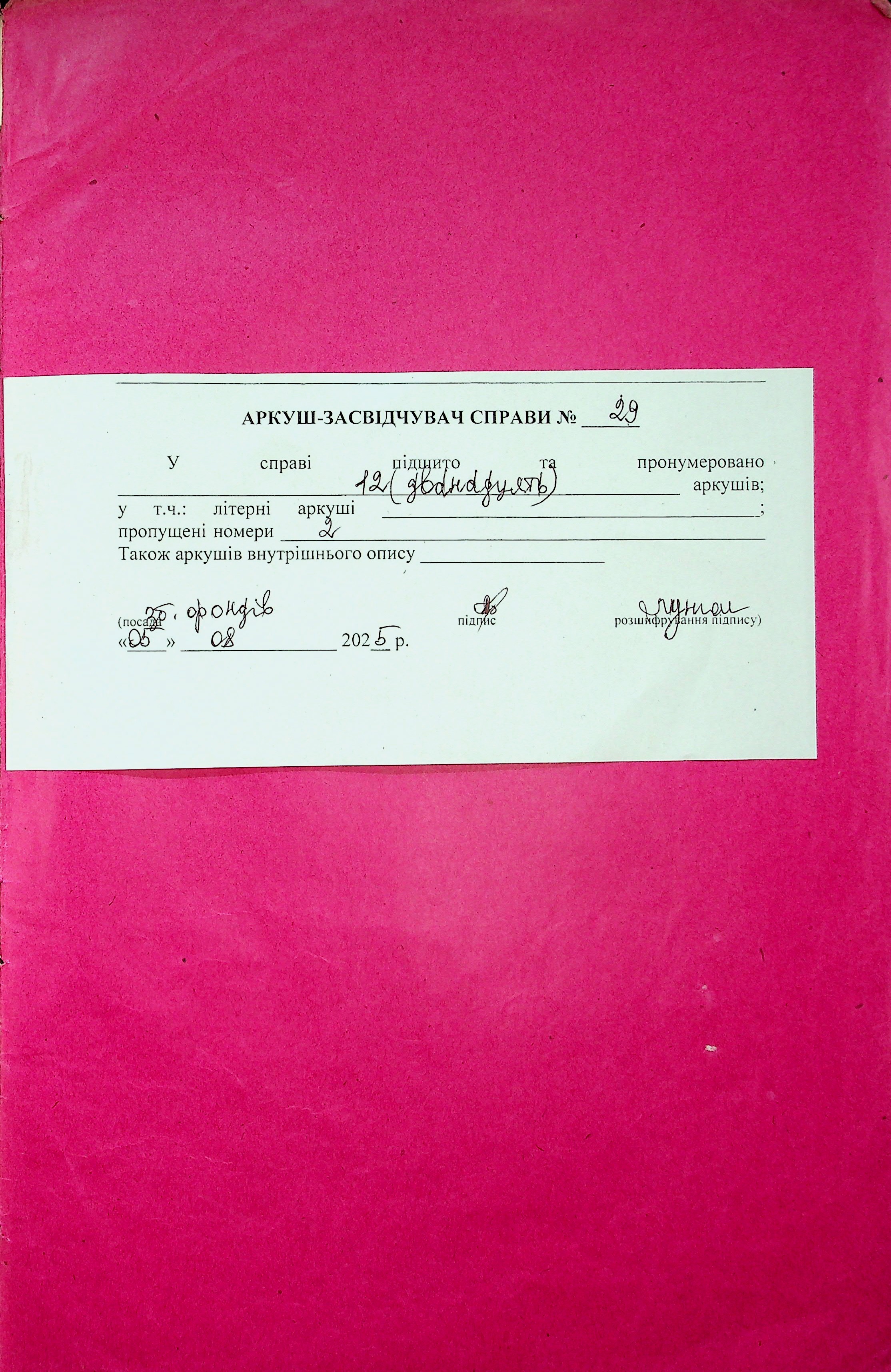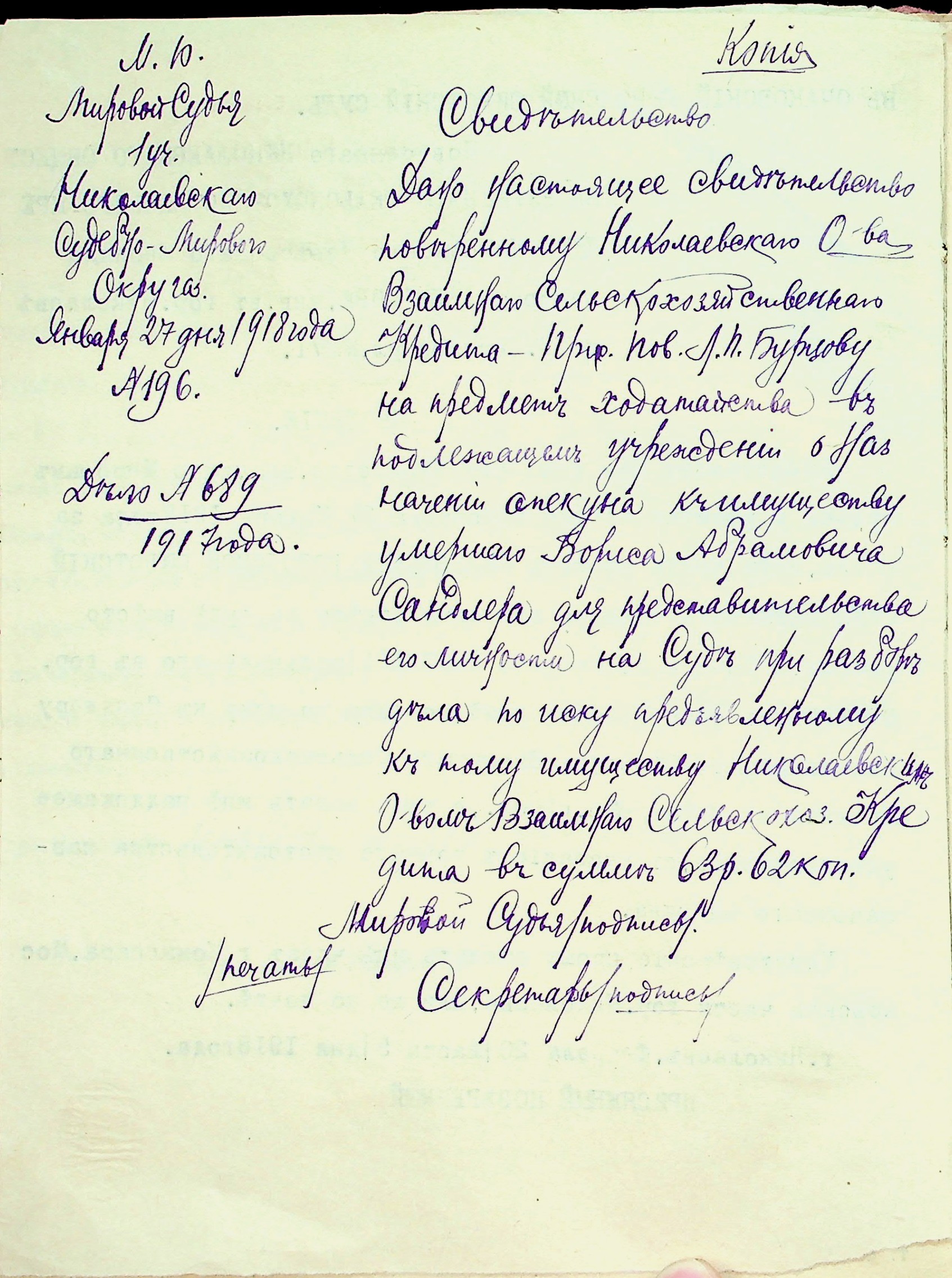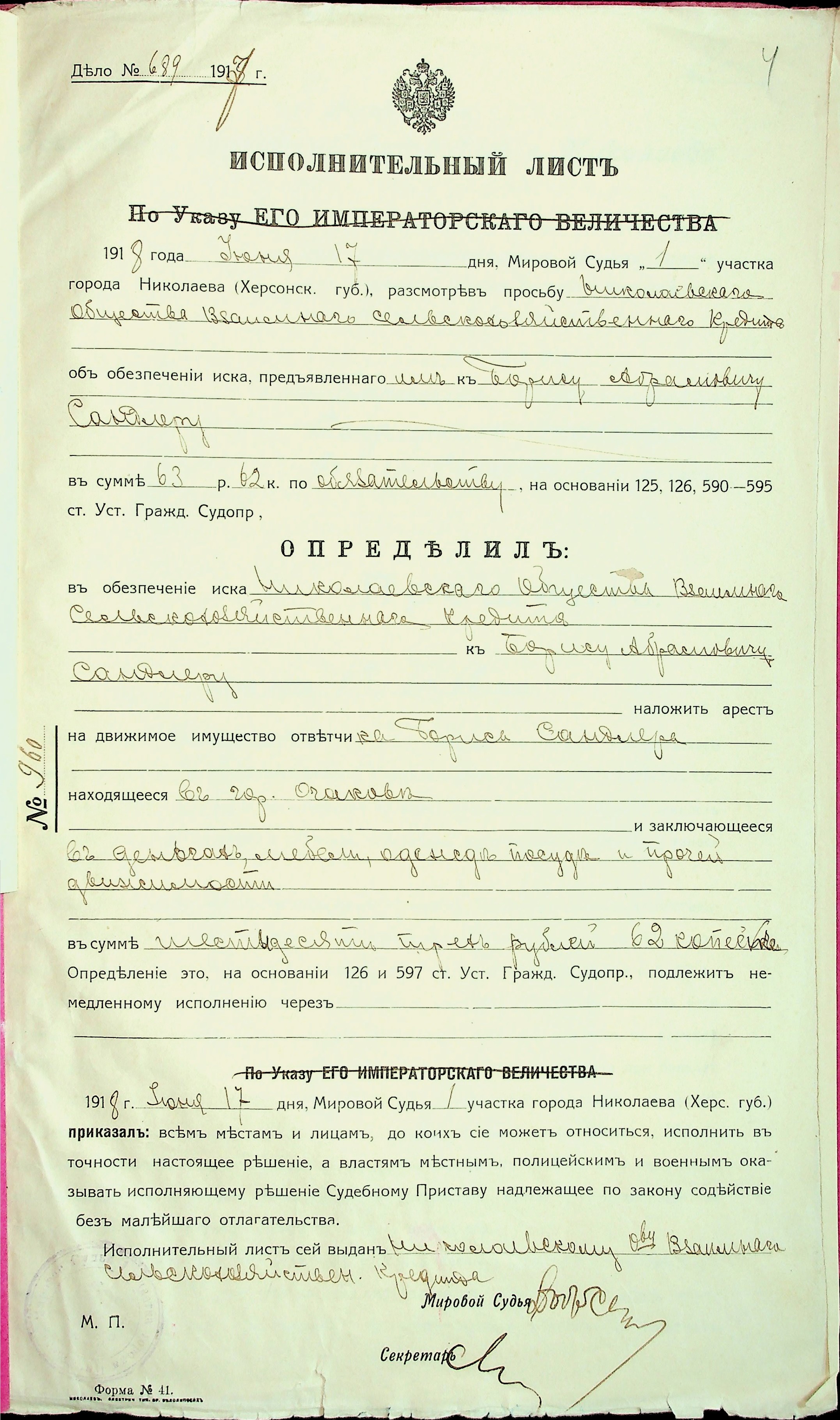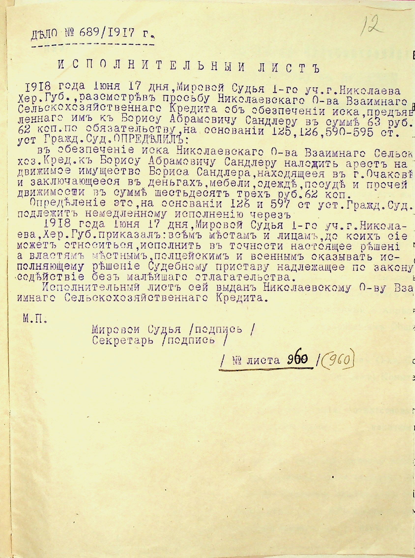 • • • • Справа № 29 “Документи (заява, прохання, квитанція) мирового судді дільниці № 1 м. Миколаїв про стягнення грошей за векселями на користь товариства з Сандлера Б.А.”
