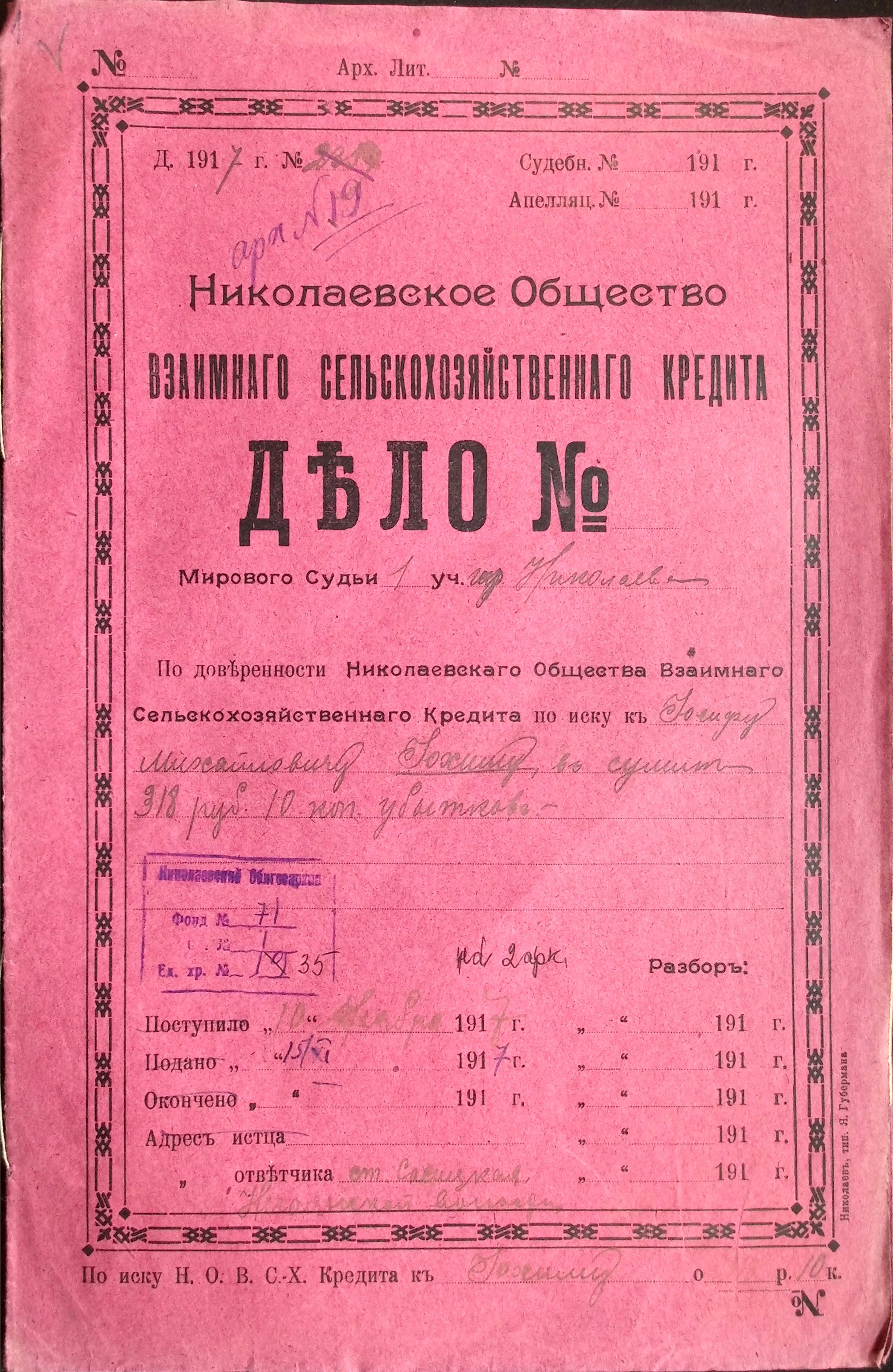 ◦ ◦ Фонд № 71 “Миколаївське товариство взаємного сільськогосподарського кредиту”